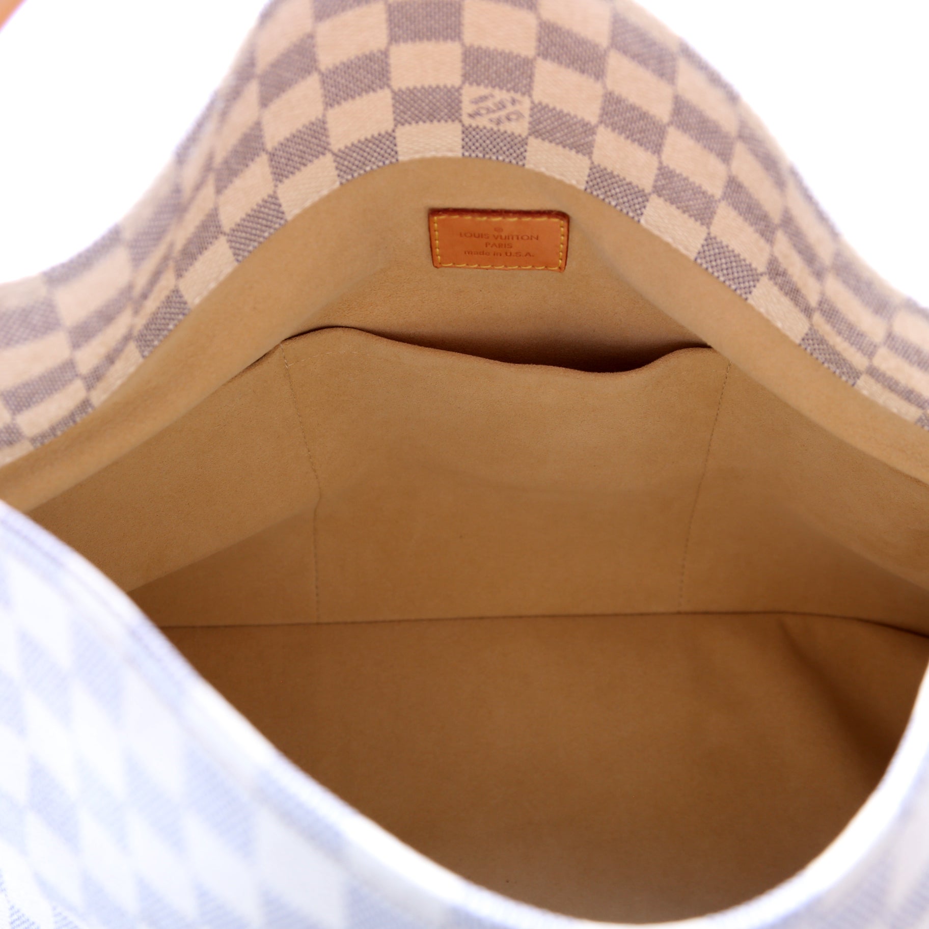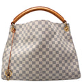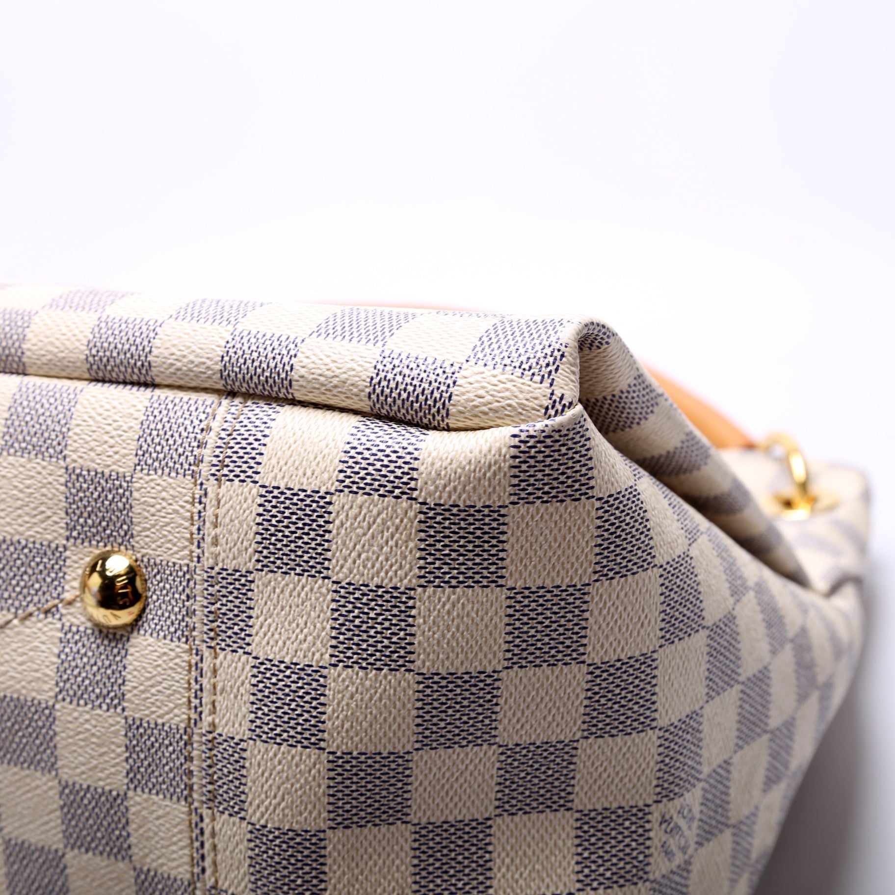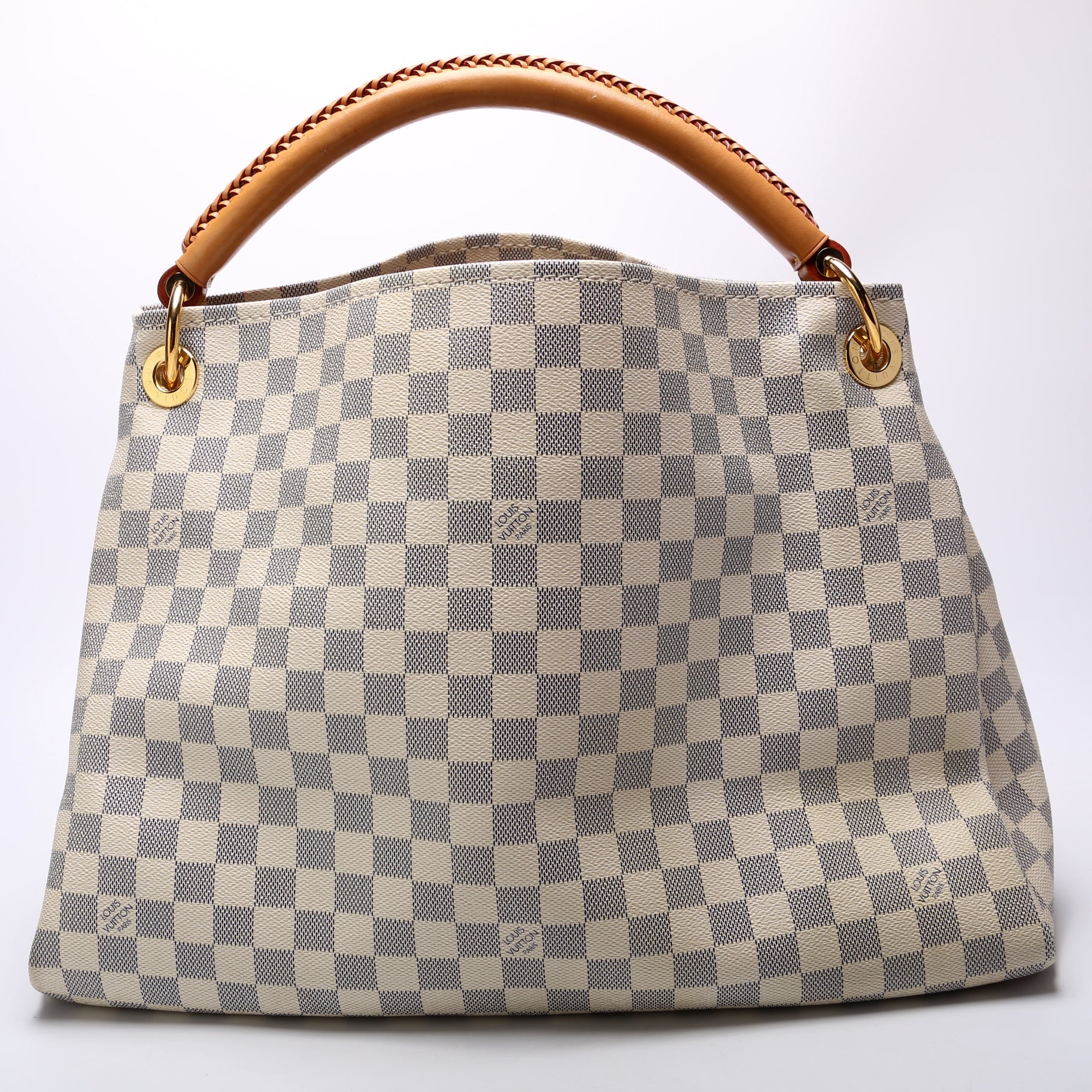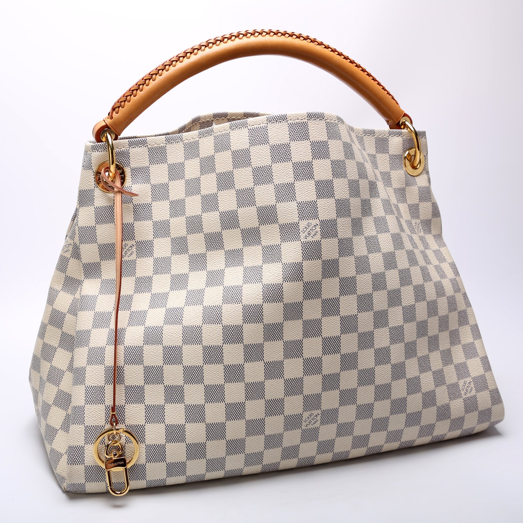 This Louis Vuitton Artsy MMis eye catching bag. The exterior is in the classic Louis Vuitton Damier Azur coated canvas.