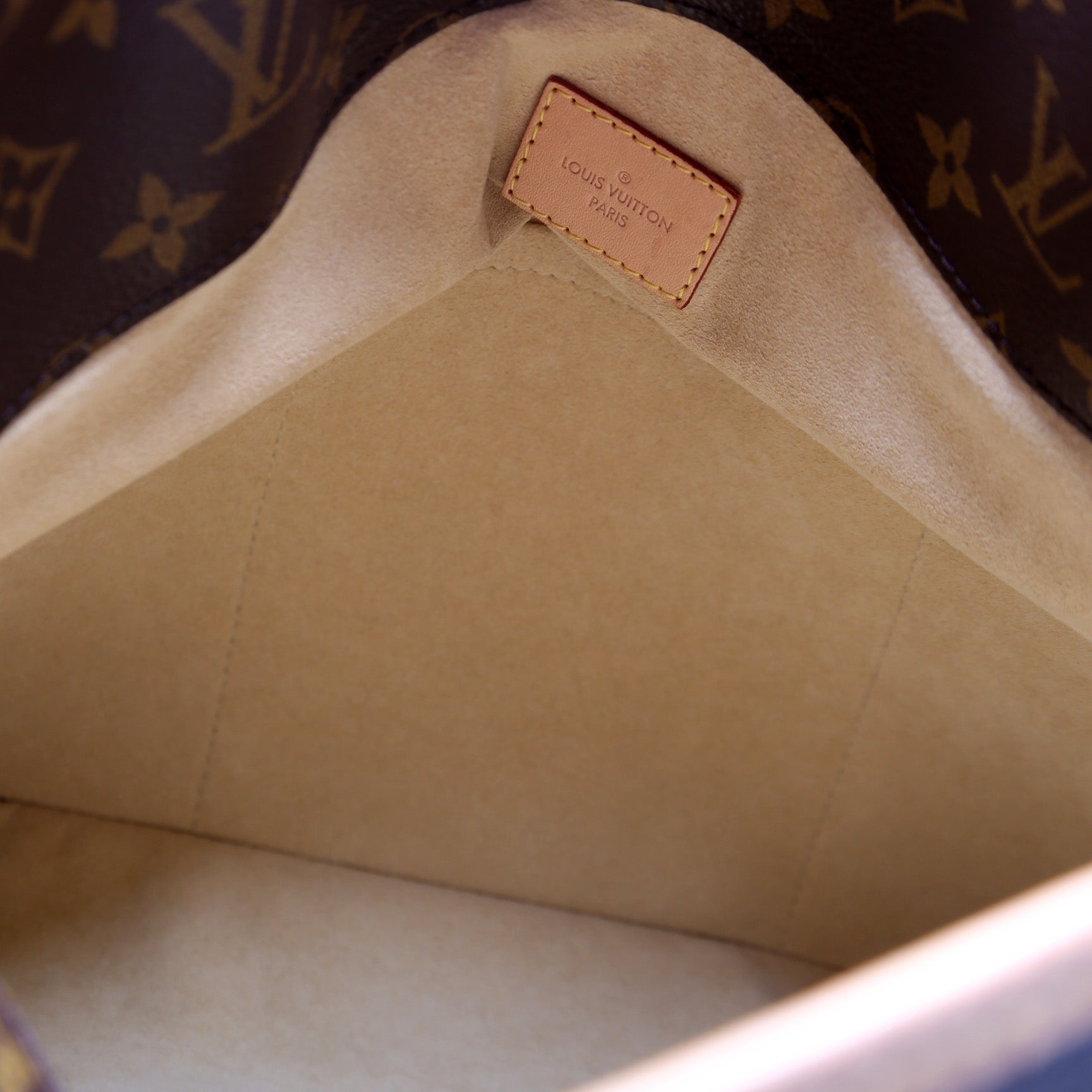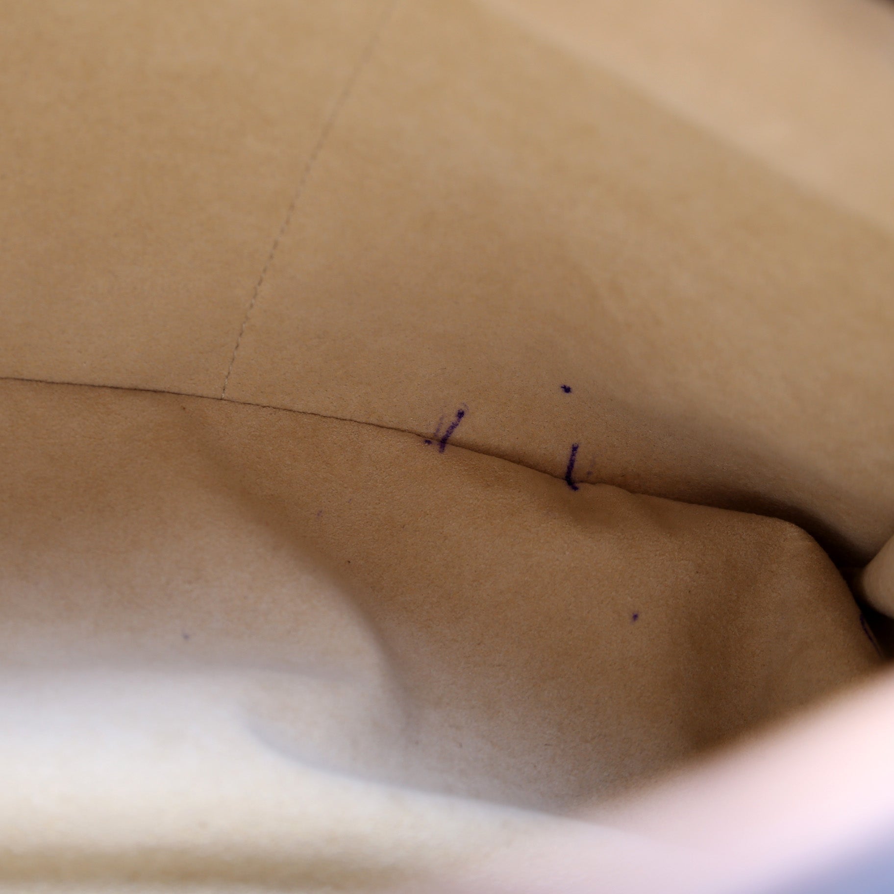 Interior: The interior shows minor staining. The interior features six open pockets and one zip closure pocket.