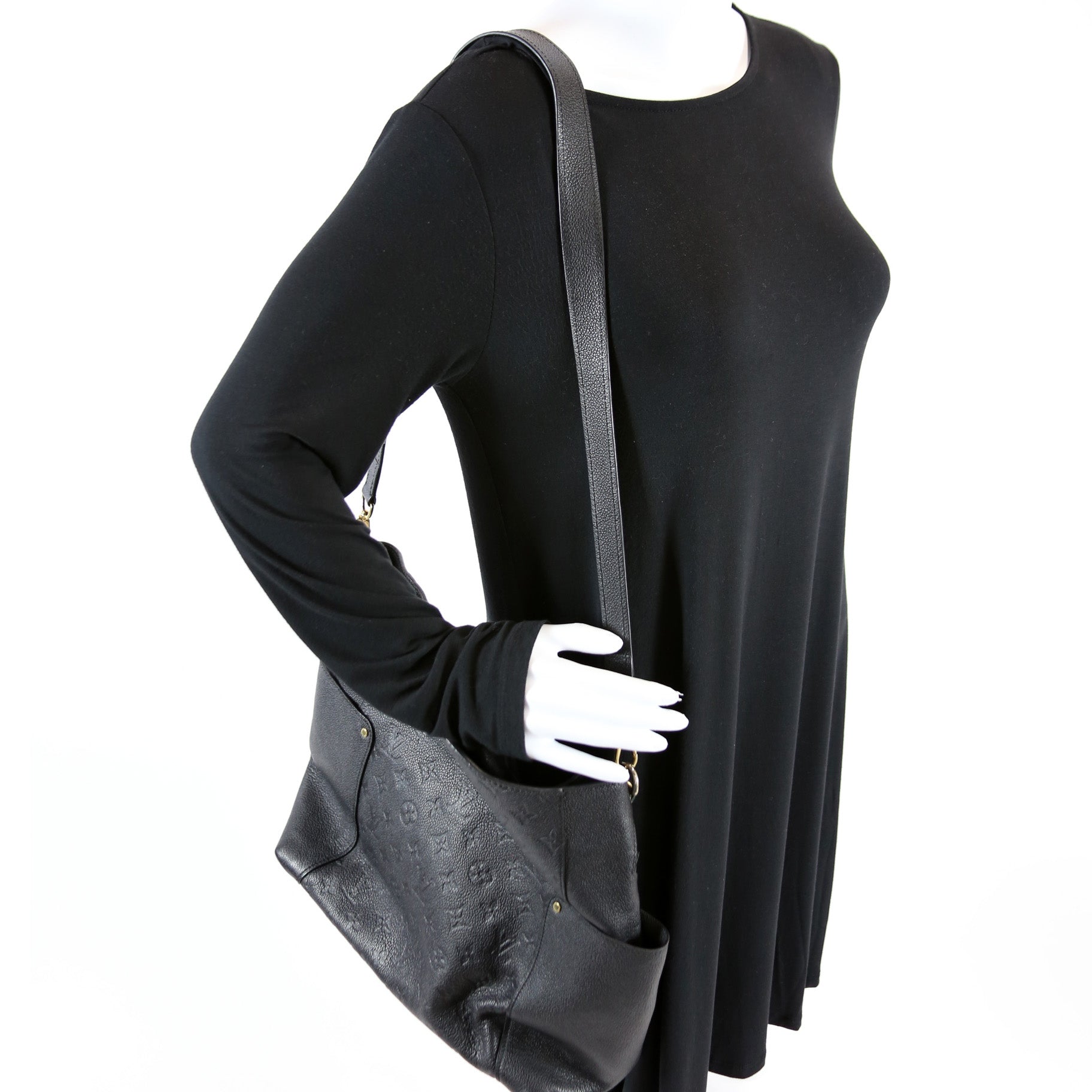 This Louis Vuitton Bagatelle Hobo Empreinteis eye catching bag. The exterior is in the classic Louis Vuitton Empreinte leather.