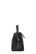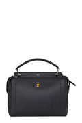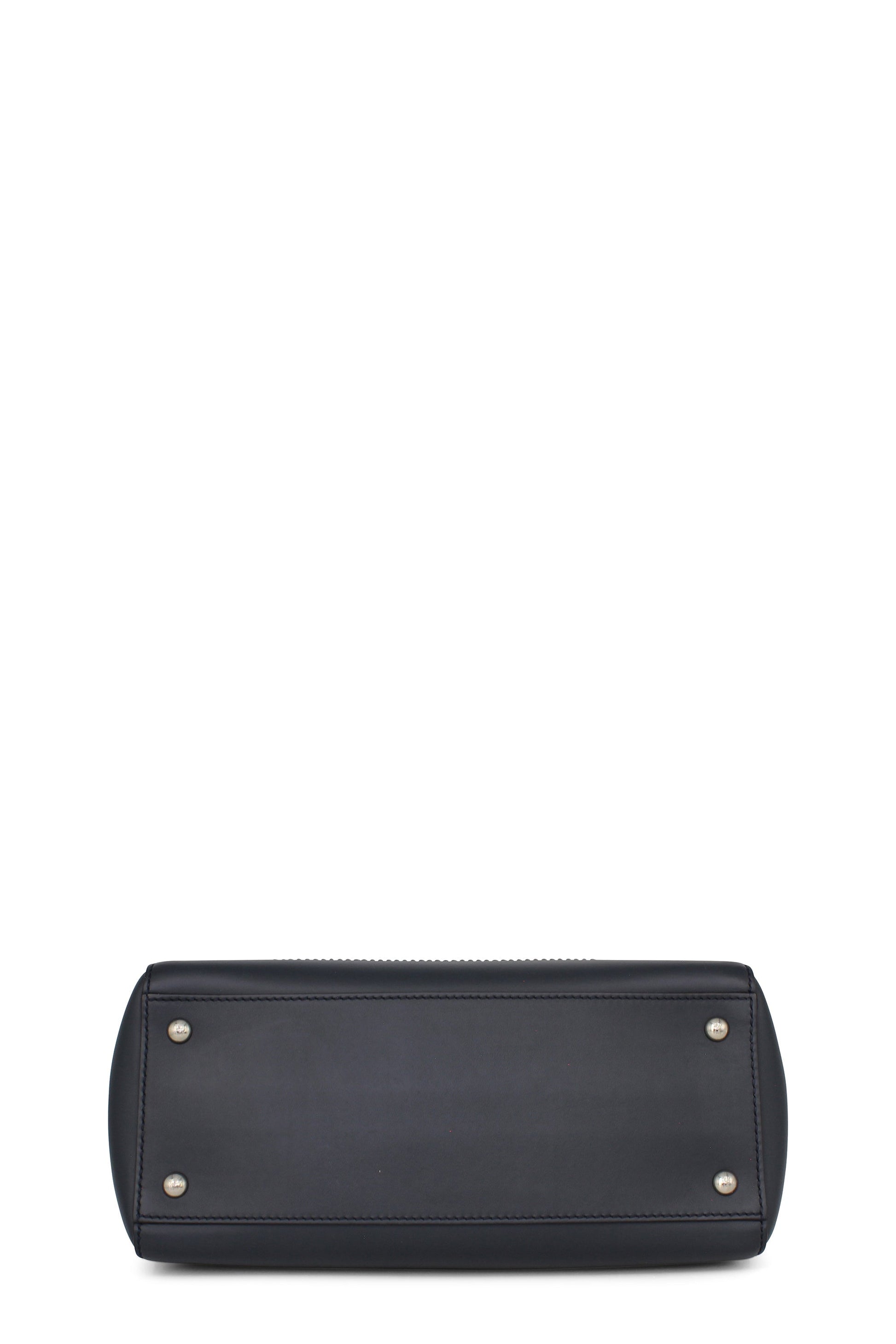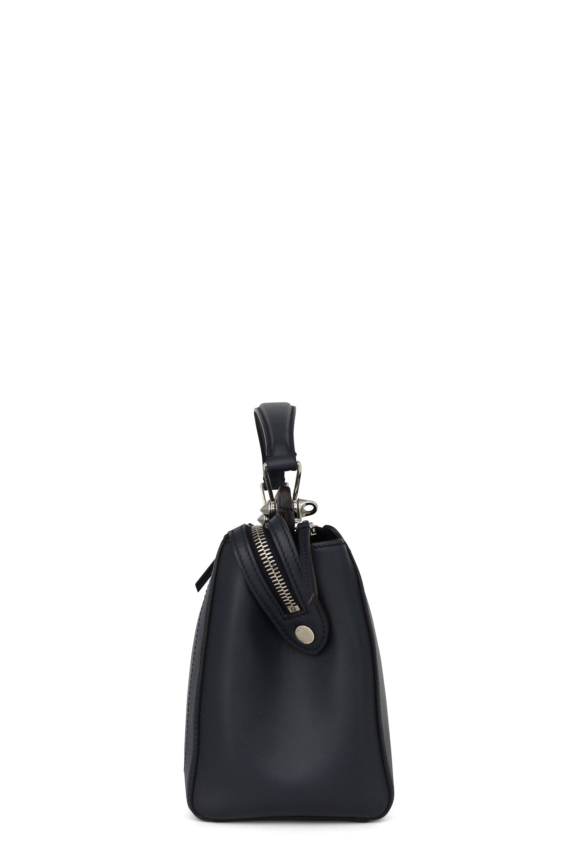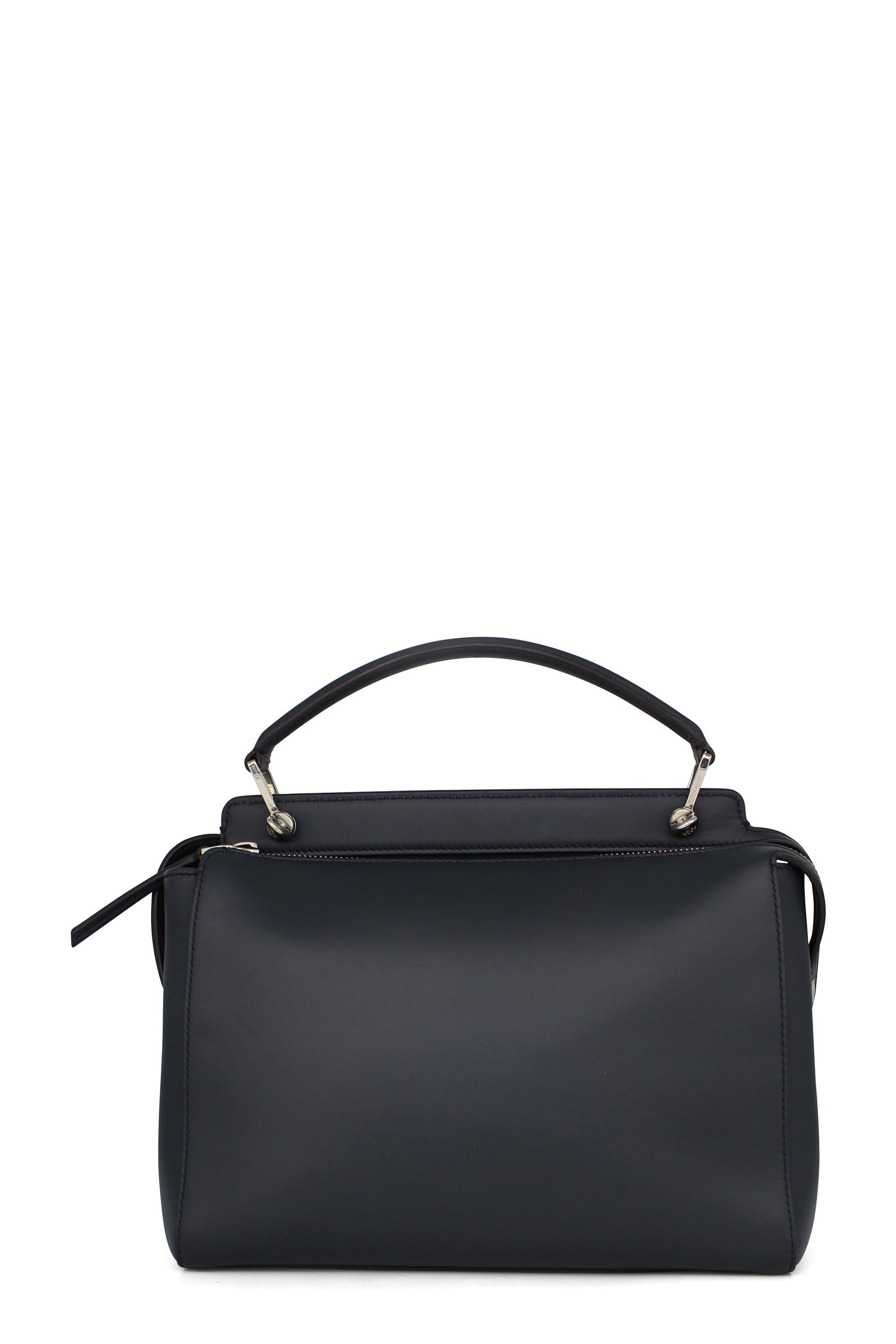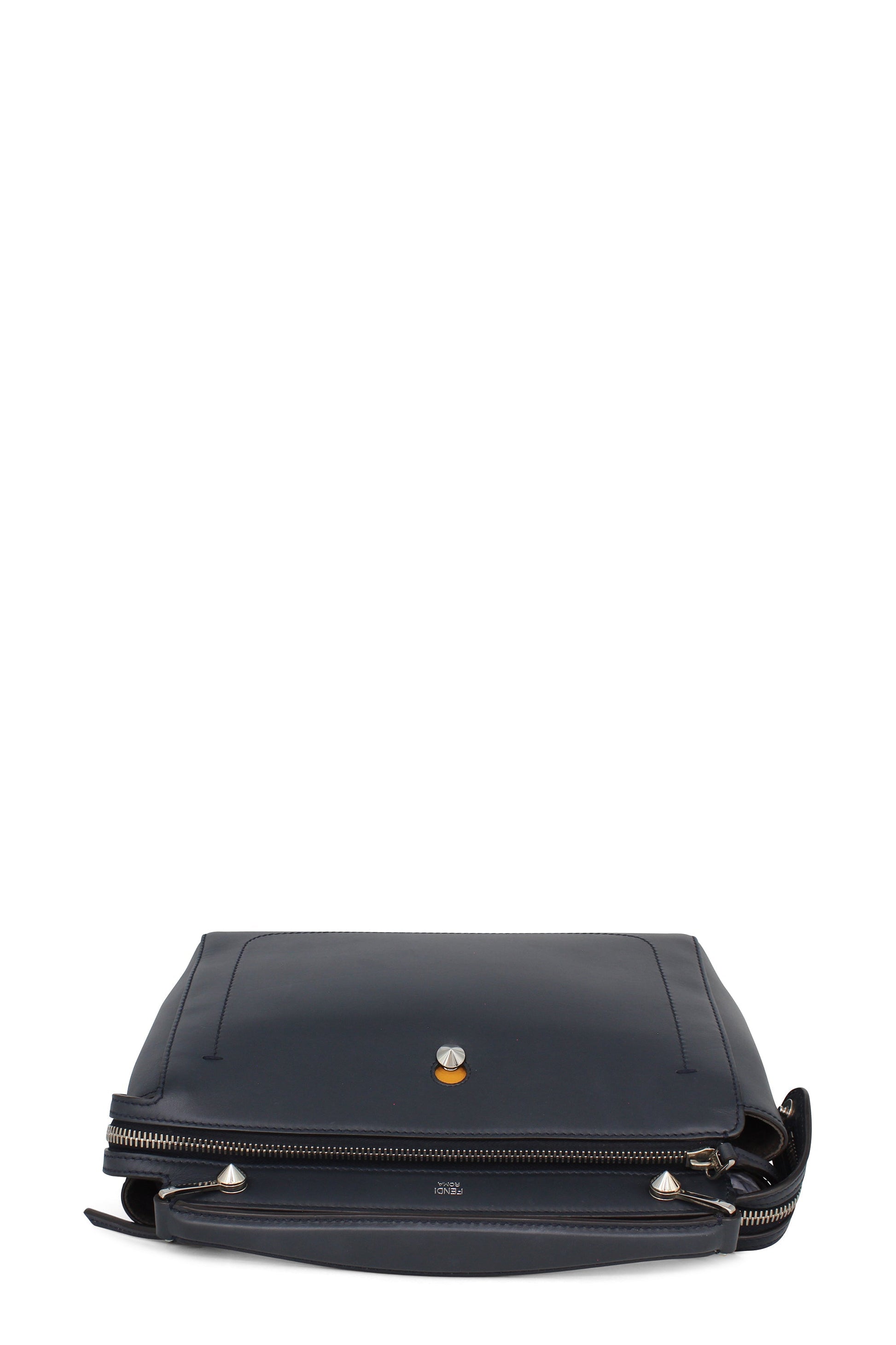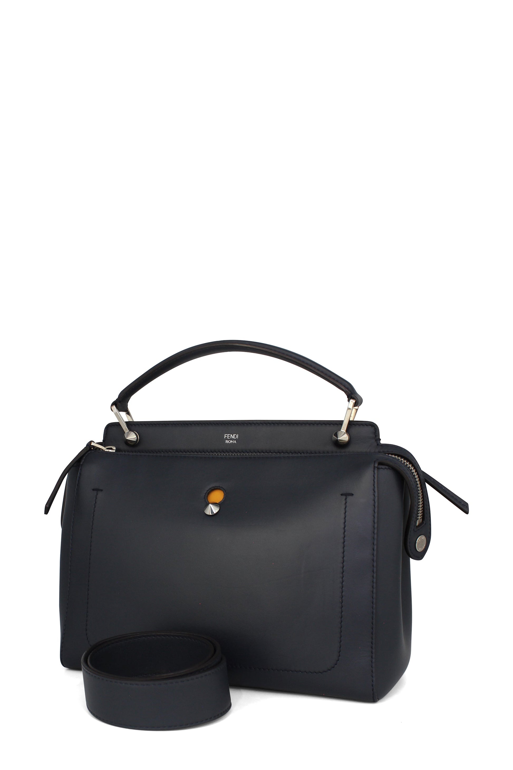 This Fendi DotCom Convertible Satchel Leather Medium is a chic and minimalist bag perfect for your everyday looks. Crafted from navy blue leather, this understated satchel features a flat top handle, removable shoulder strap, distinctive conical stud embellishment, Fendi Roma logo, protective base studs and silver-tone hardware accents.
