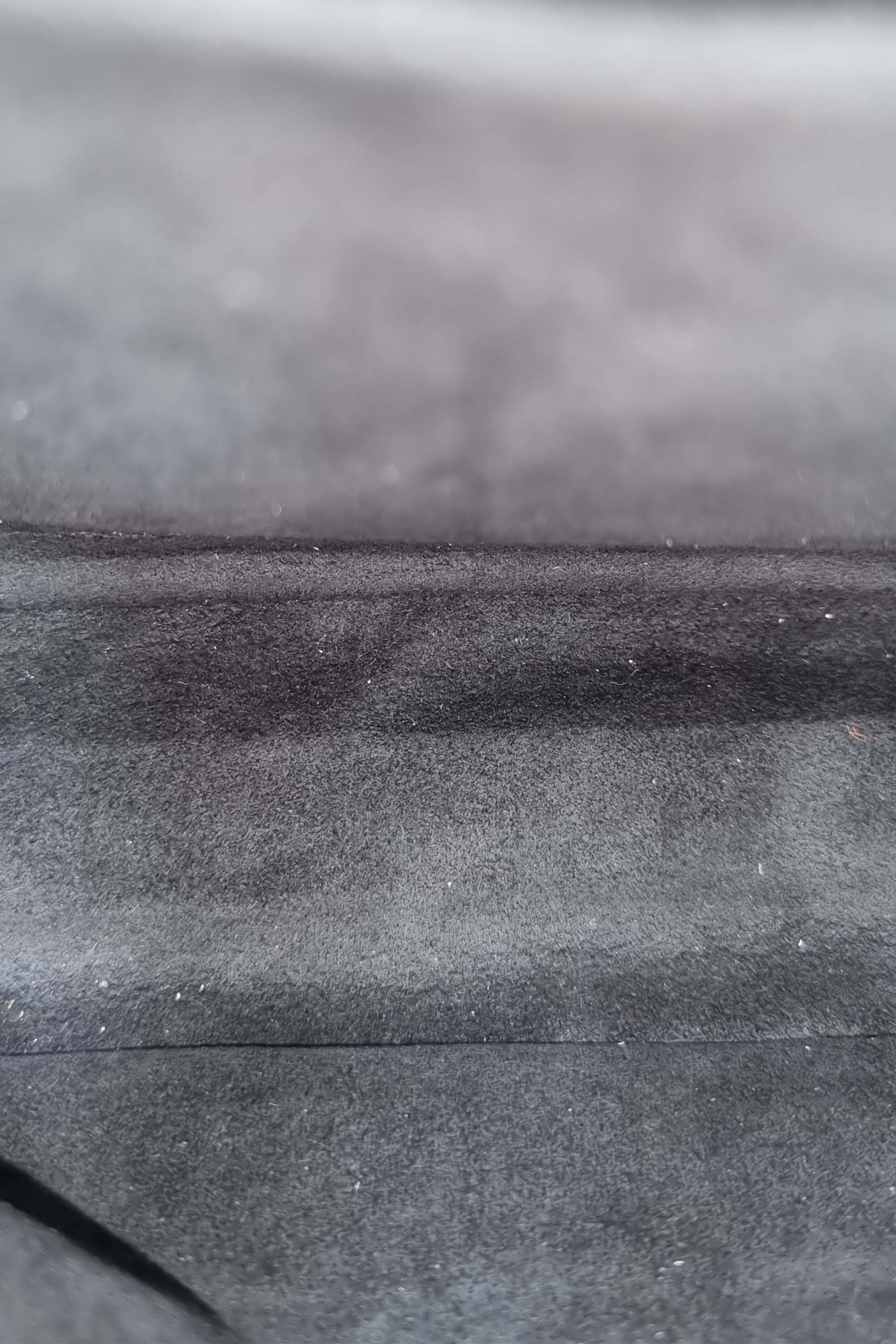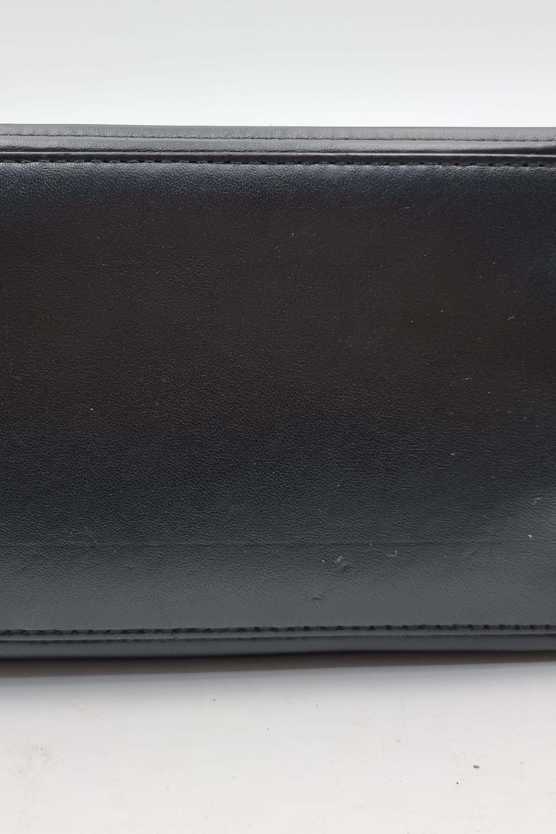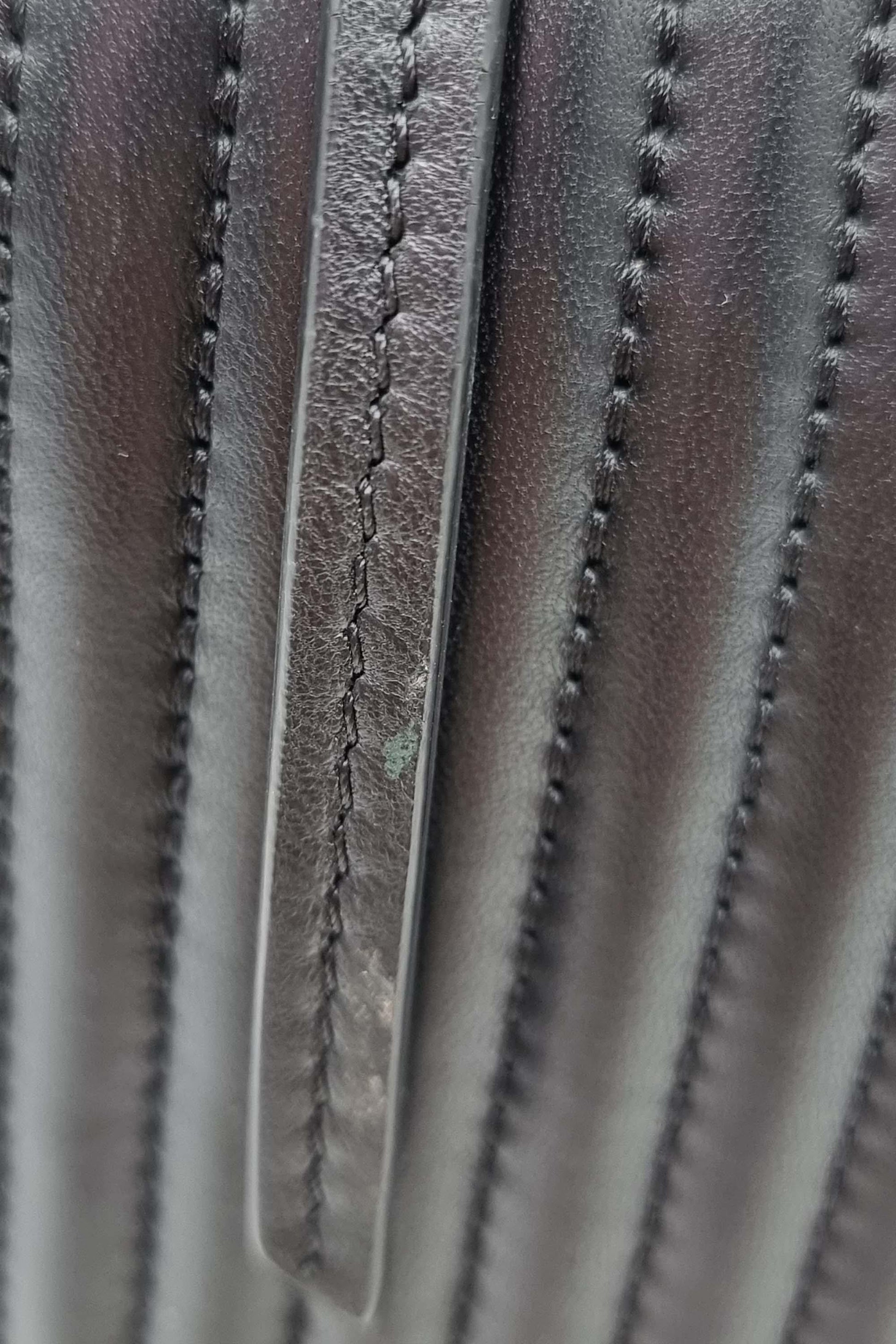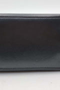 Exterior front, back, and bottom have creases. Interior lining is scratched, has discoloration and has creases. Zipper pull has discoloration.