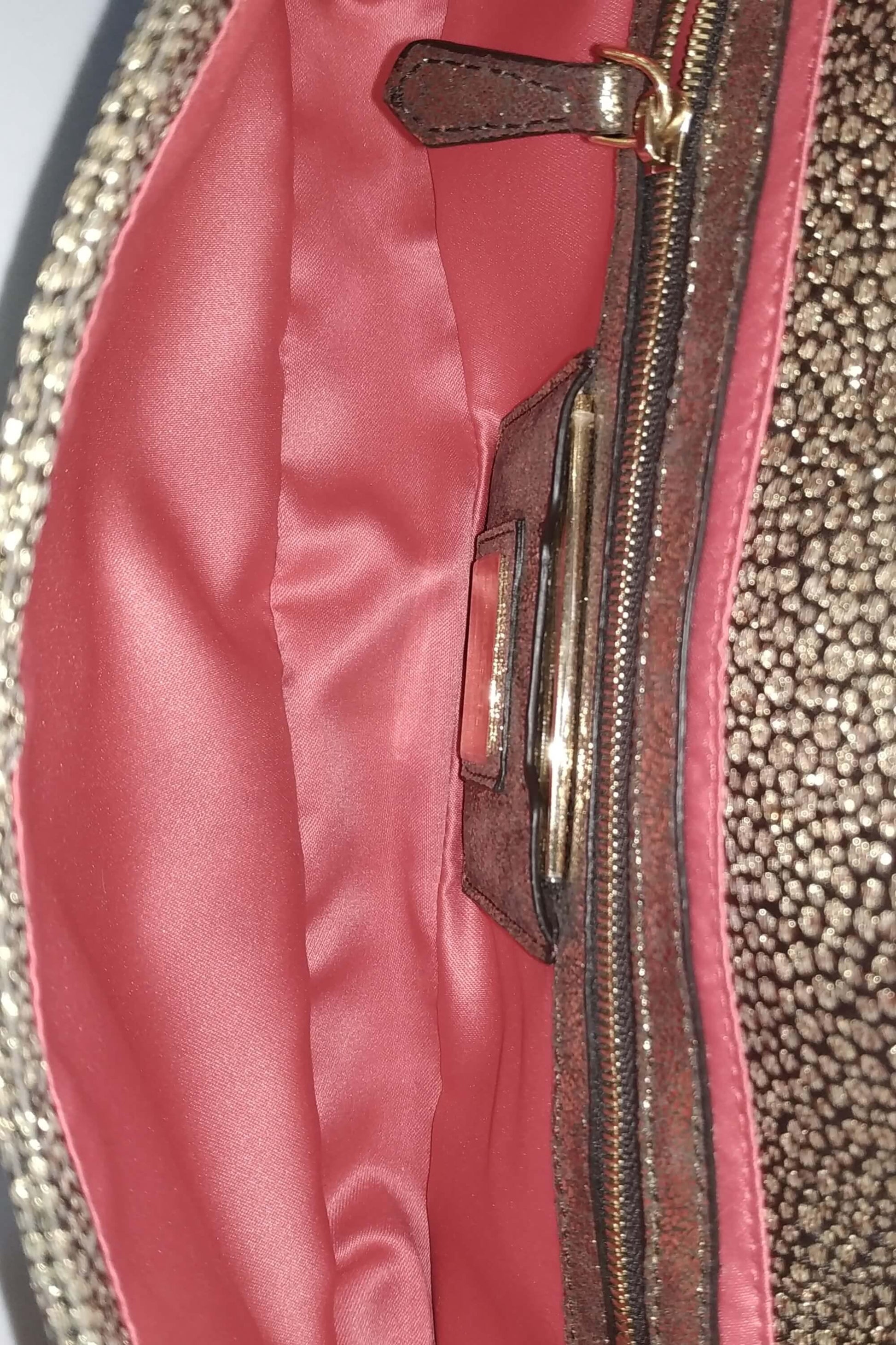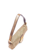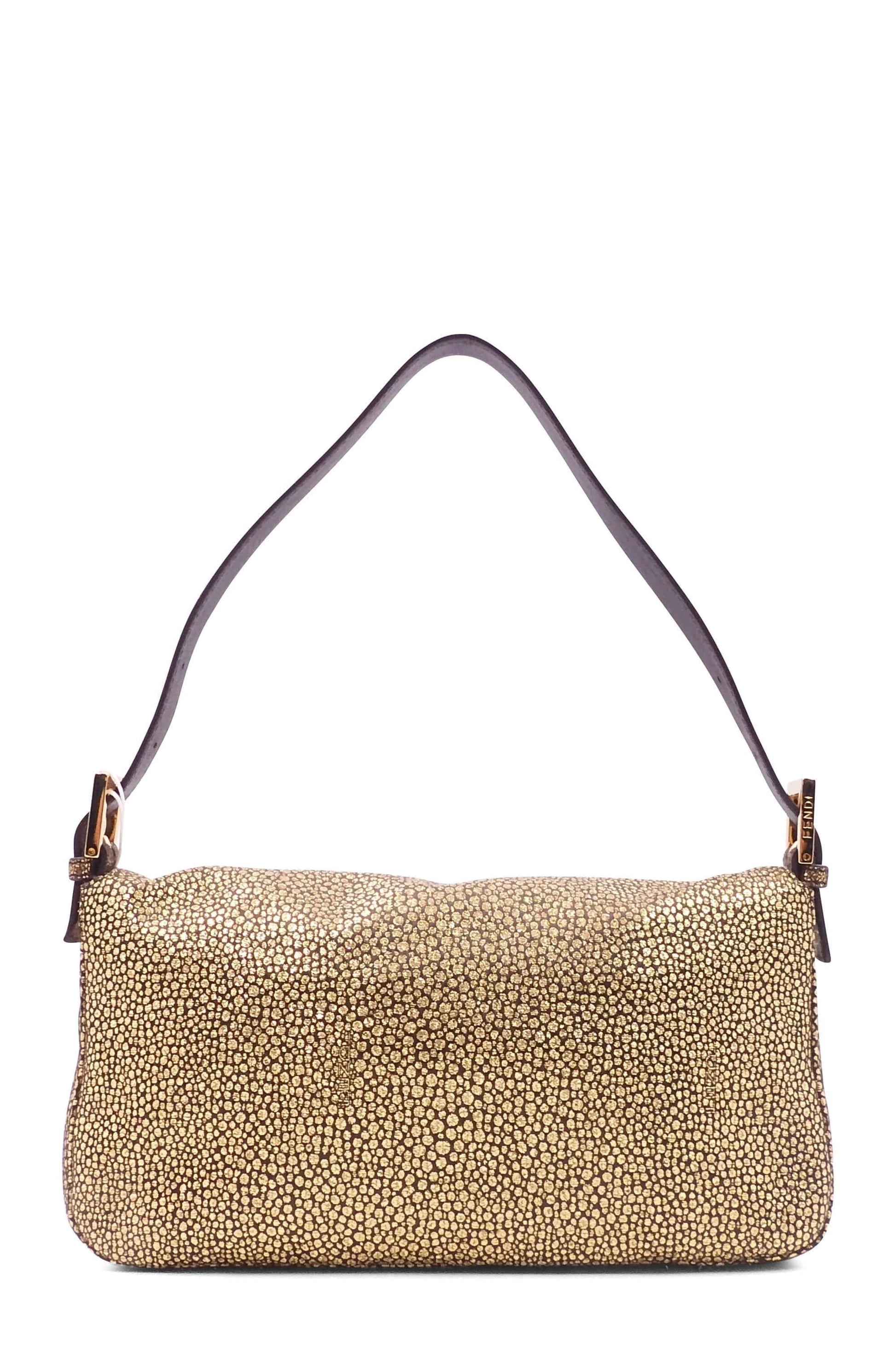 This Fendi Embellished Baguette is crafted of a gold fabric with an animal print. The bag features a shoulder strap, large fendi clasp, detachable mirror and gold-tone hardware. The flap opens to a red fabric lining with a zipper pocket.