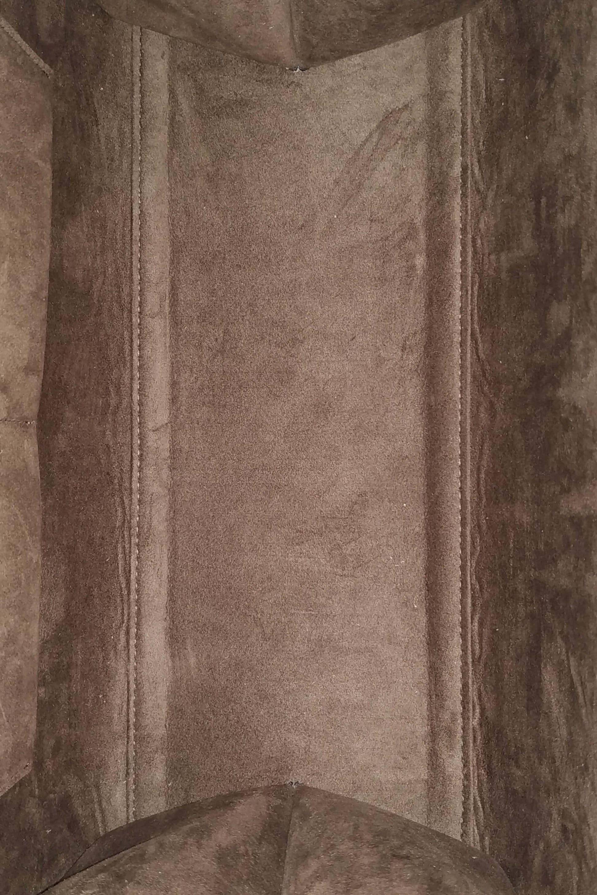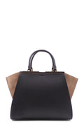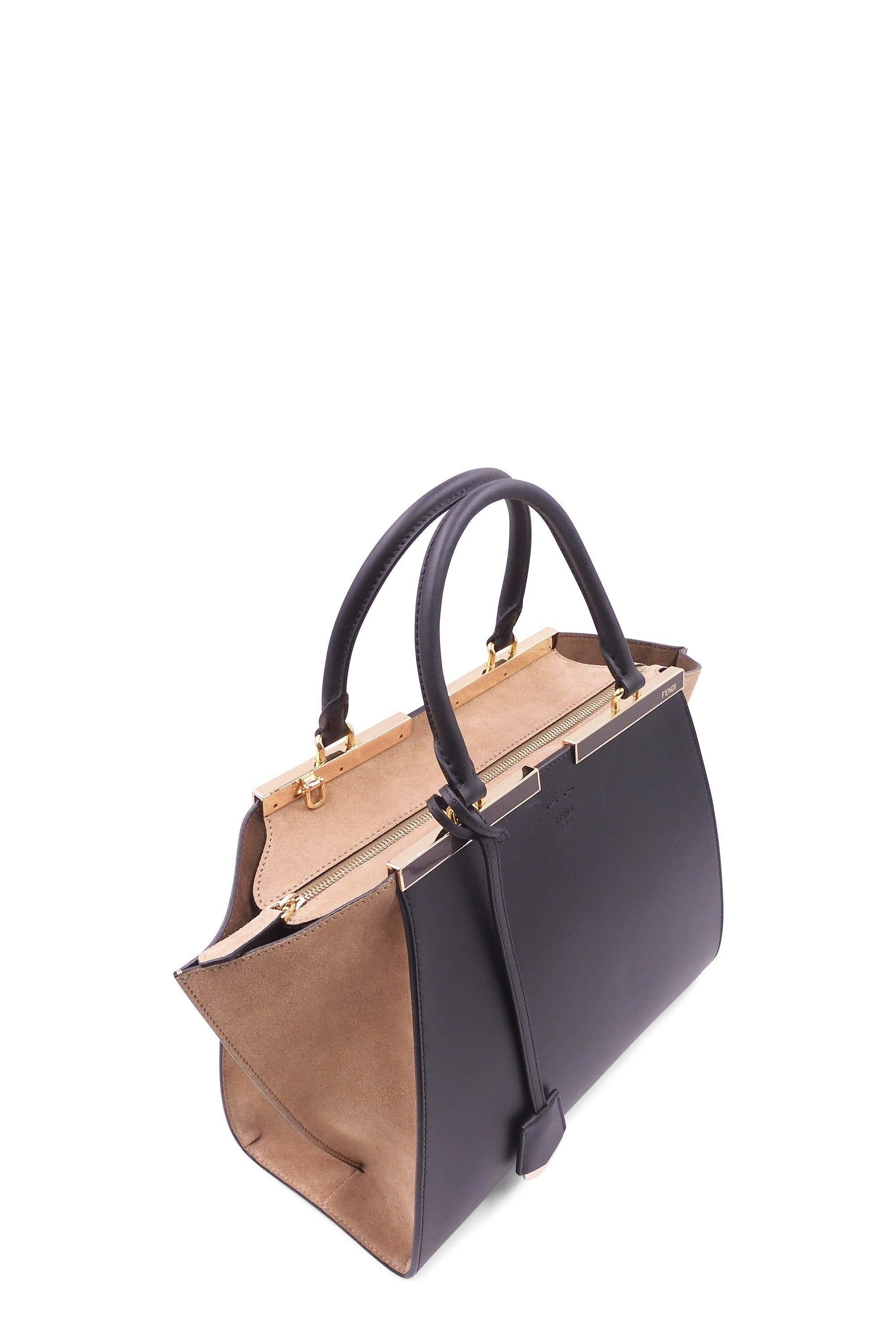 Fendi Small 3Jour tote is crafted of black smooth leather with brown suede. The bag features gold-tone hardware, dual rolled top handles, single optional shoulder strap, protective feet at base and detachable tag. The top zipper opens to a suede lining with patch pockets.
