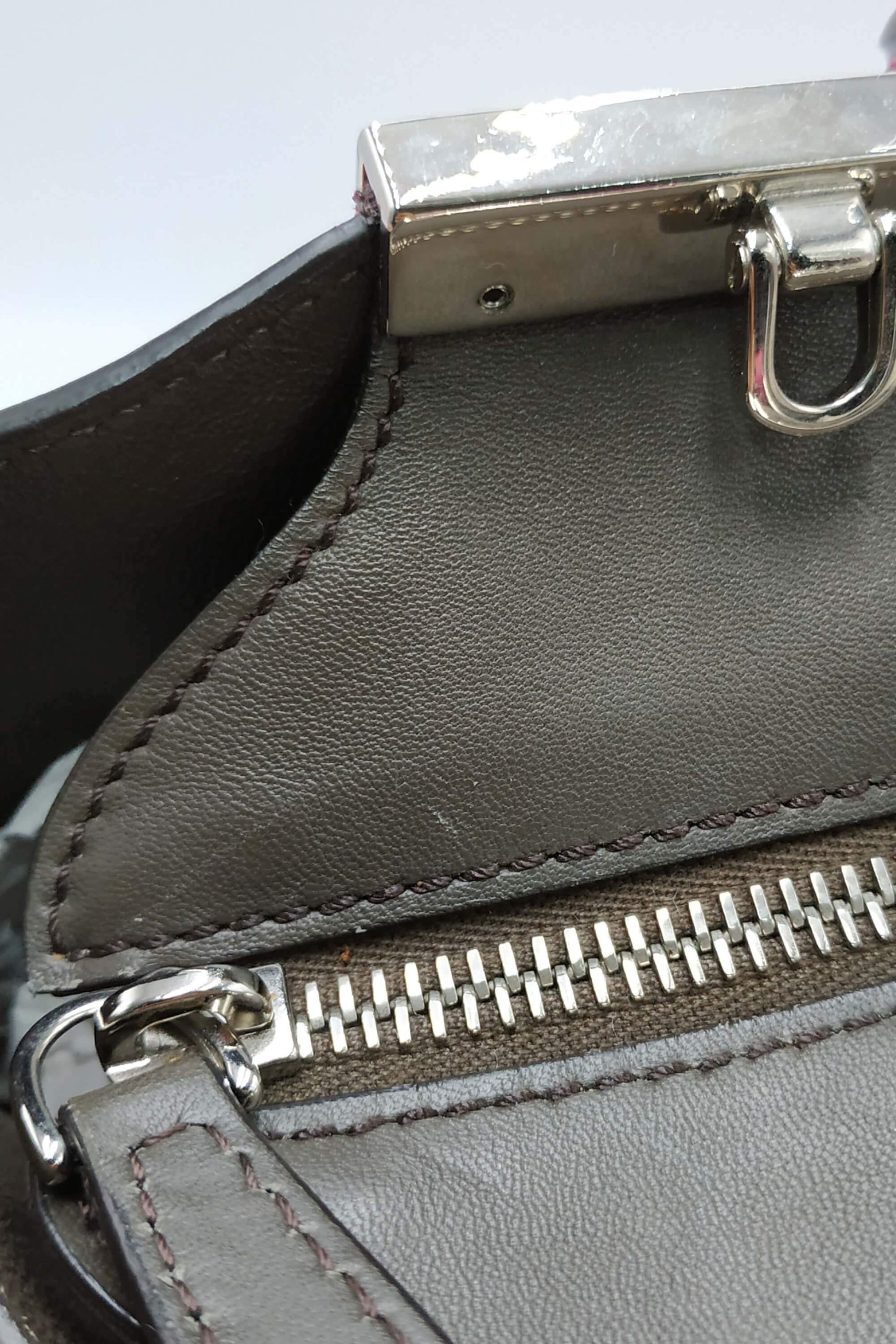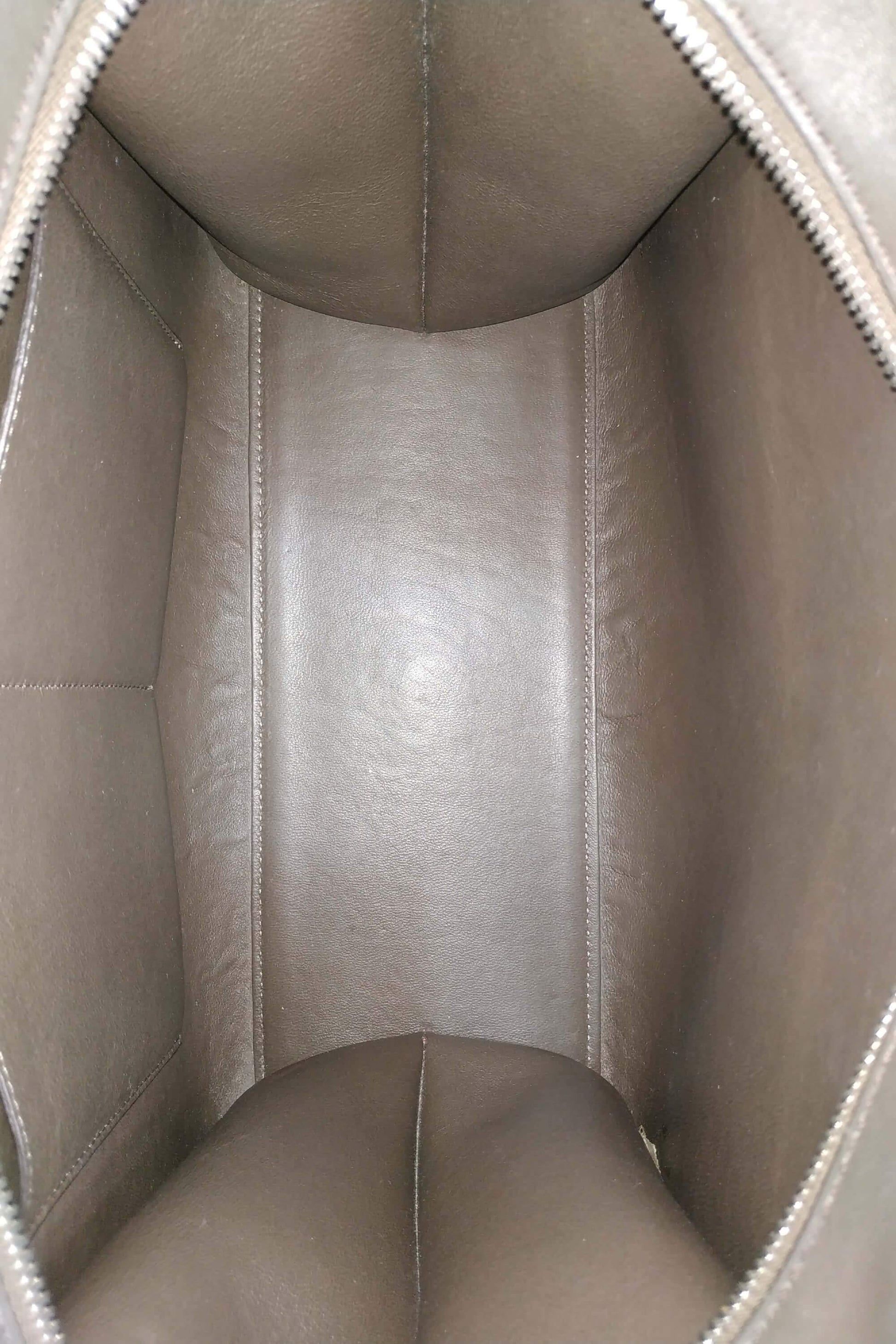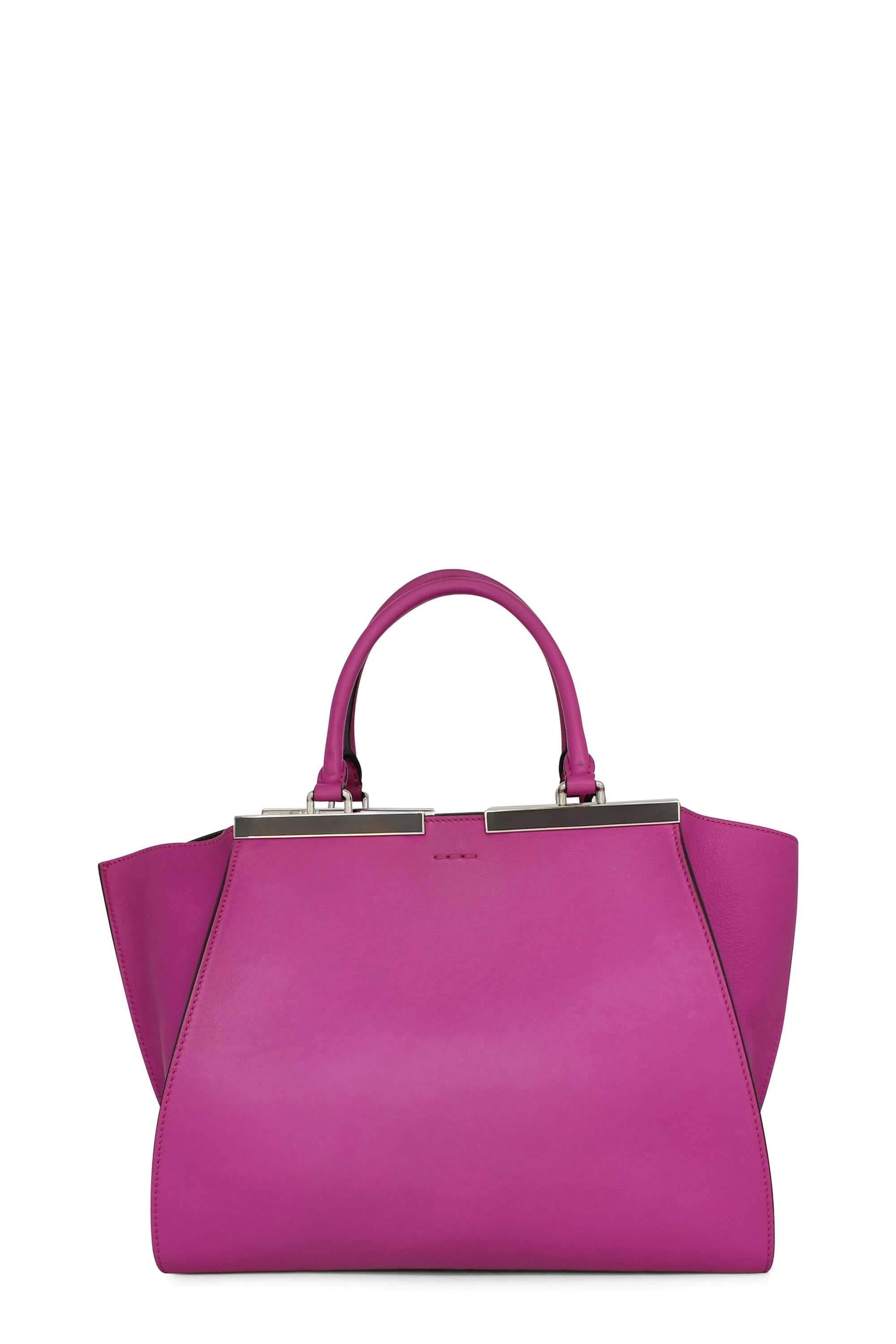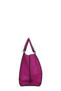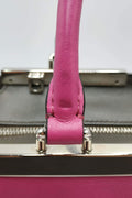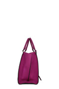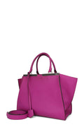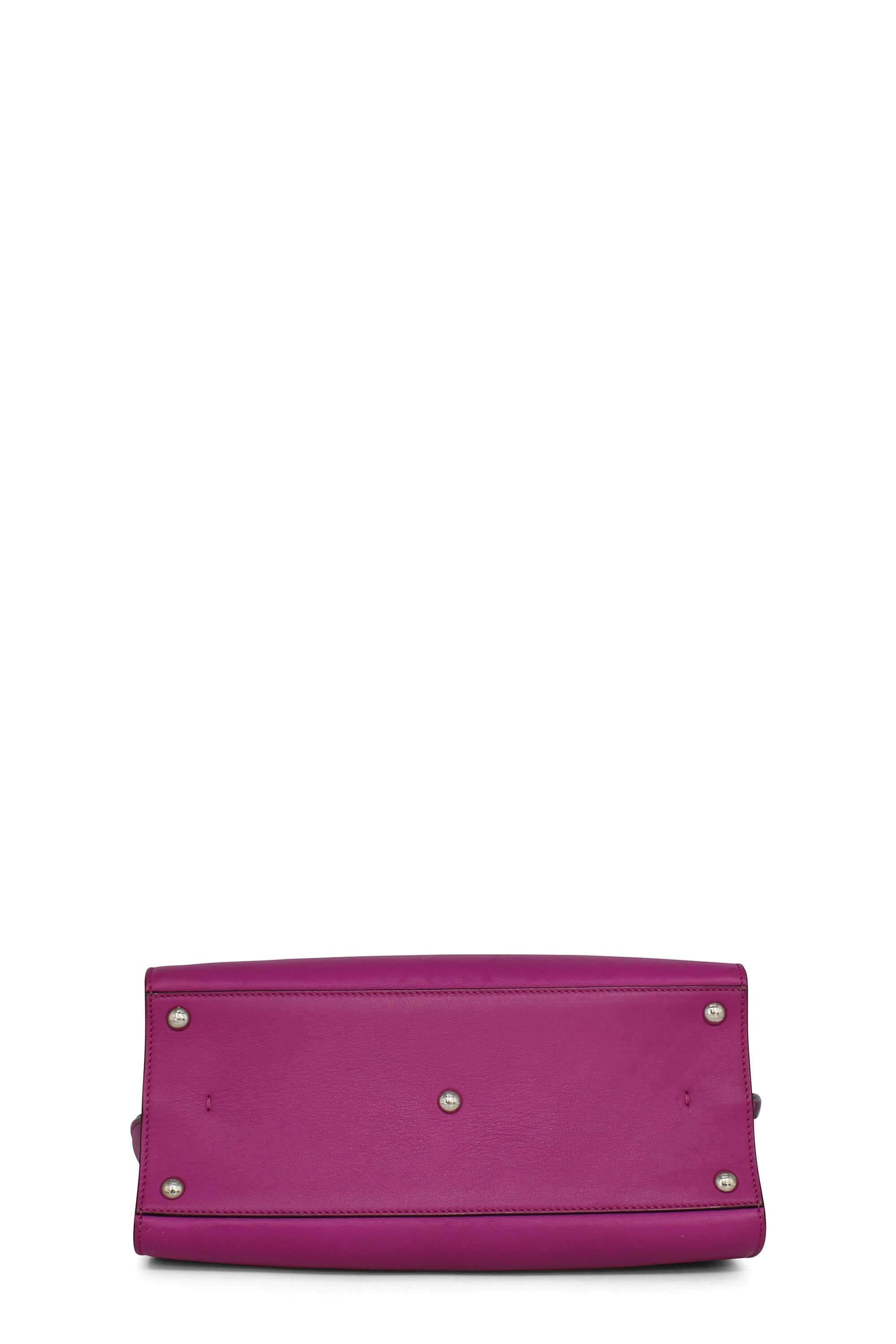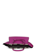 This lovely tote is finely crafted of smooth fuchsia calfskin leather with contrasting black glazing. The bag features leather rolled top handles, an optional shoulder strap, expanded sides, and a top crest polished silver frame. The top zipper opens to a leather interior with hanging patch pockets.