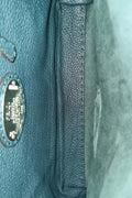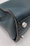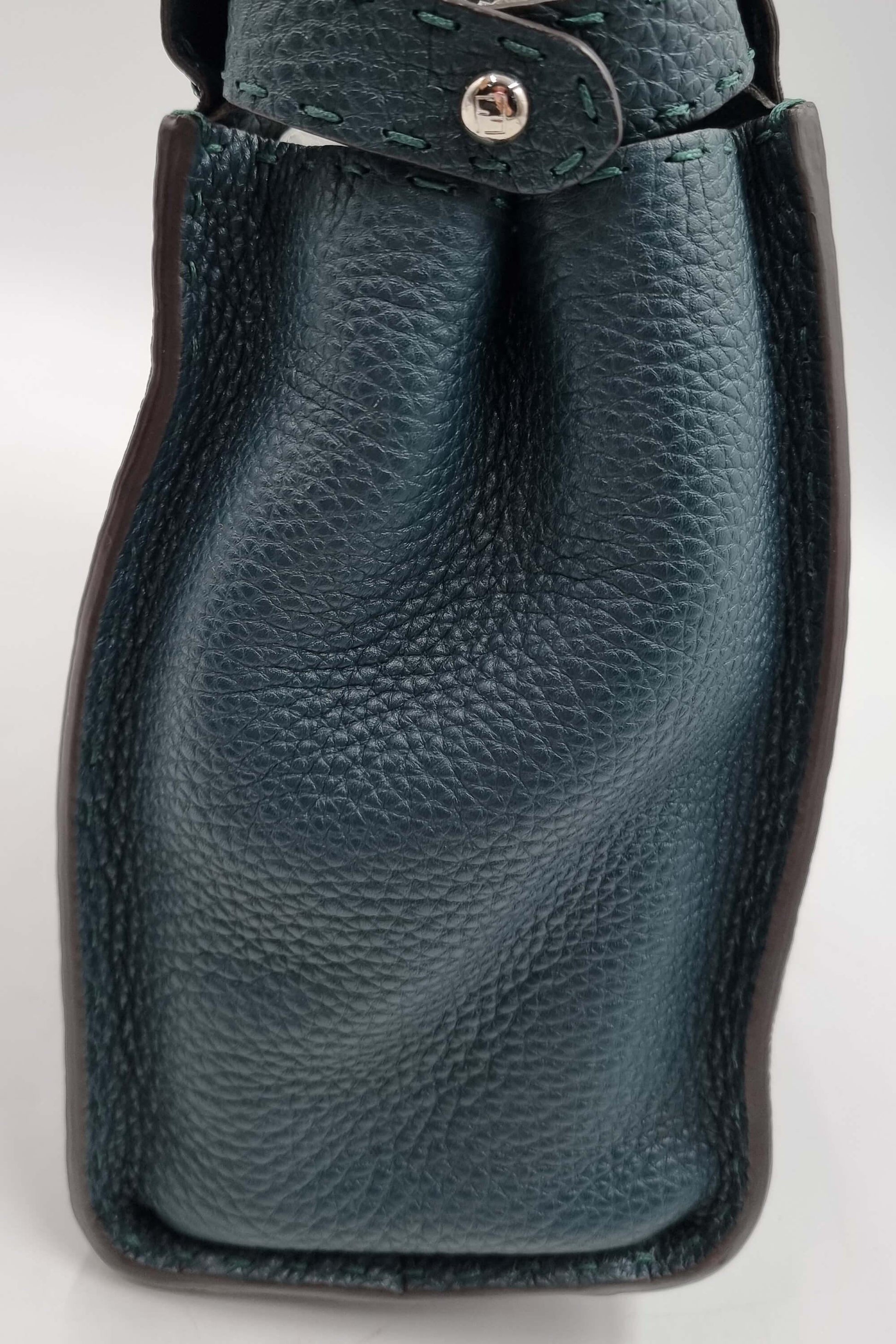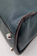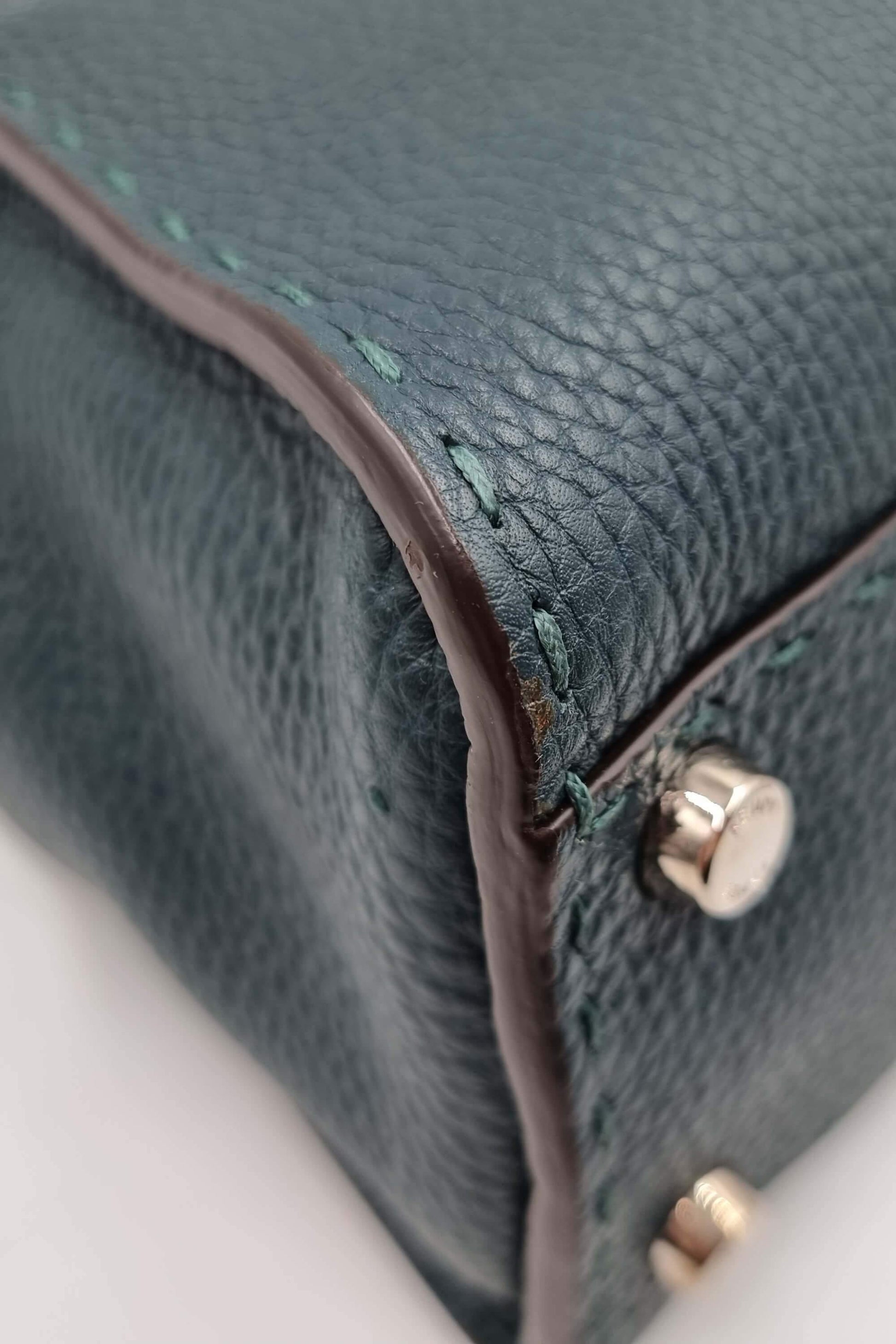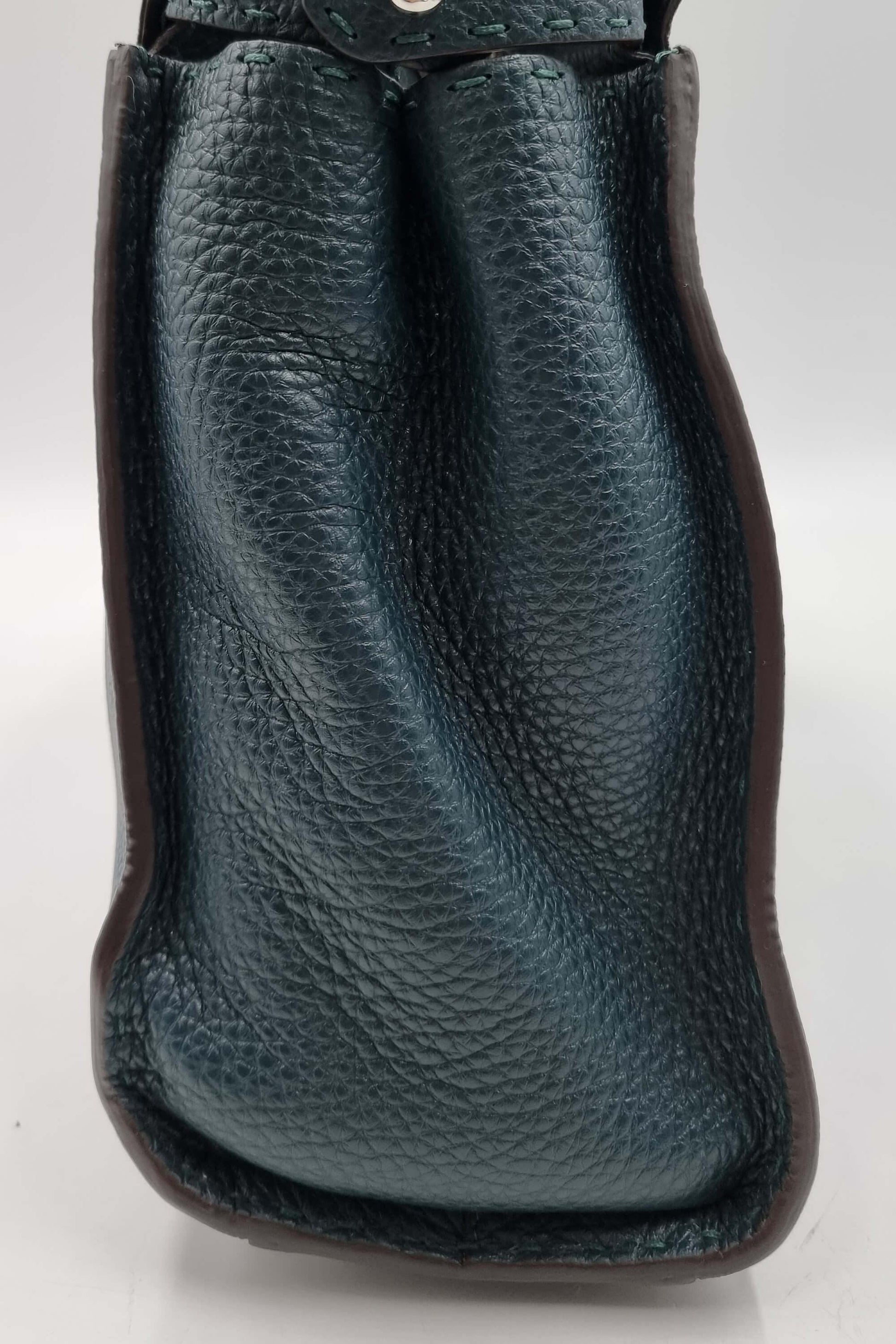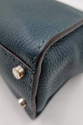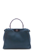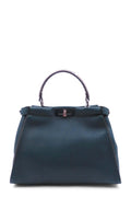 Crafted from calfskin leather in teal, this Regular Selleria Peekaboo iconic satchel features a sturdy python handle, silver hardware including handle links and a top interior structured frame. A silver turn lock on each side opens to a suede lining with a zipper and patch pocket.