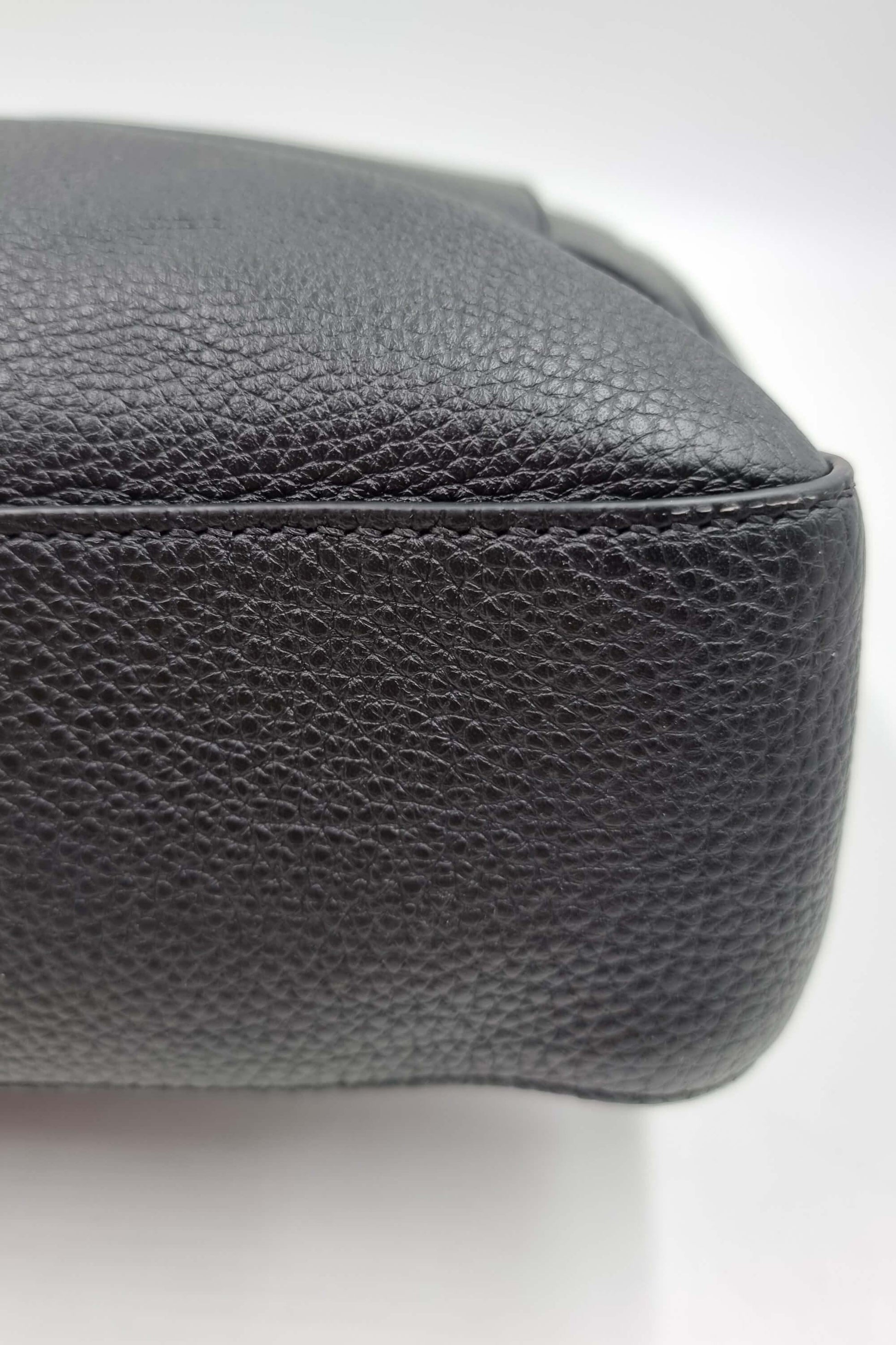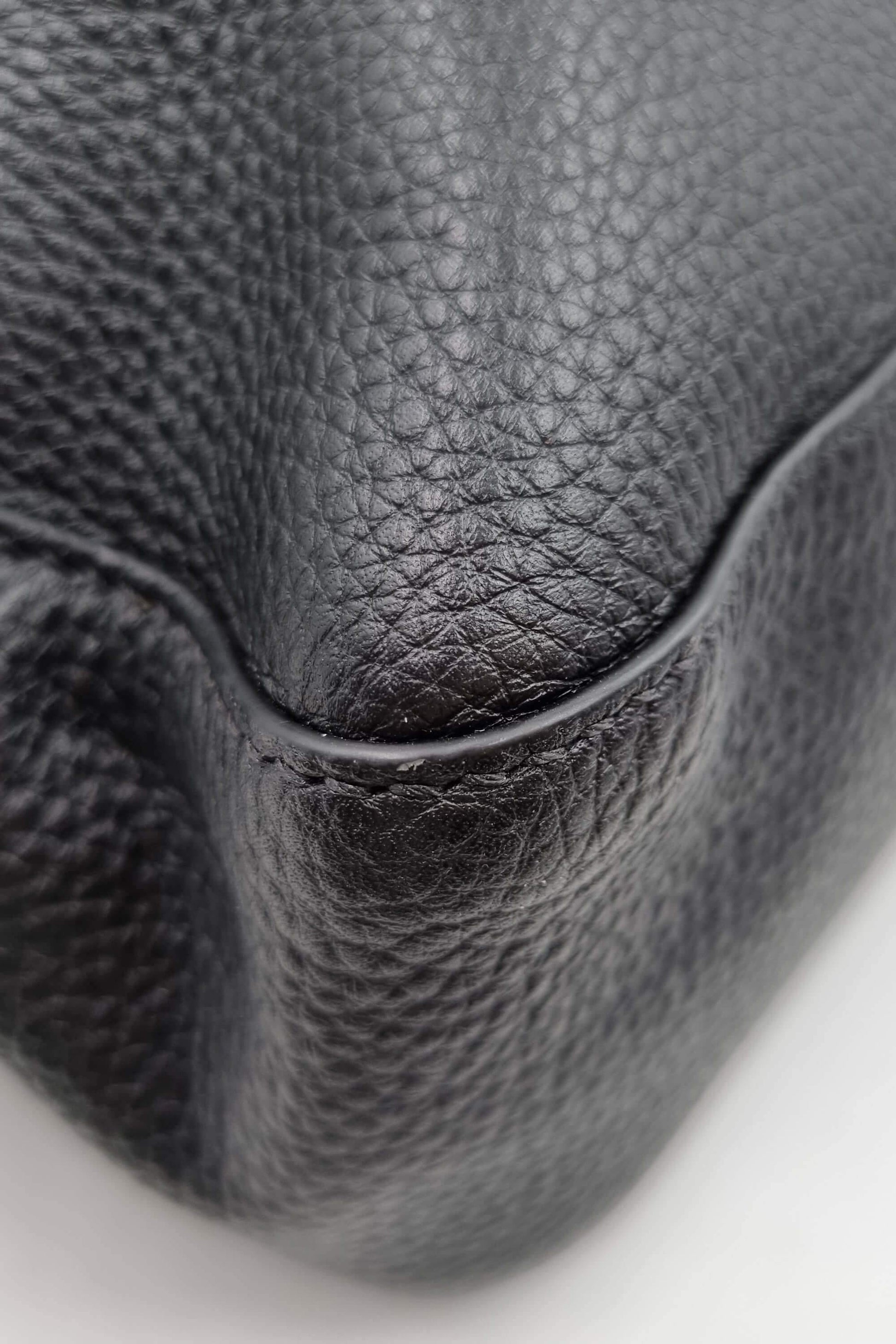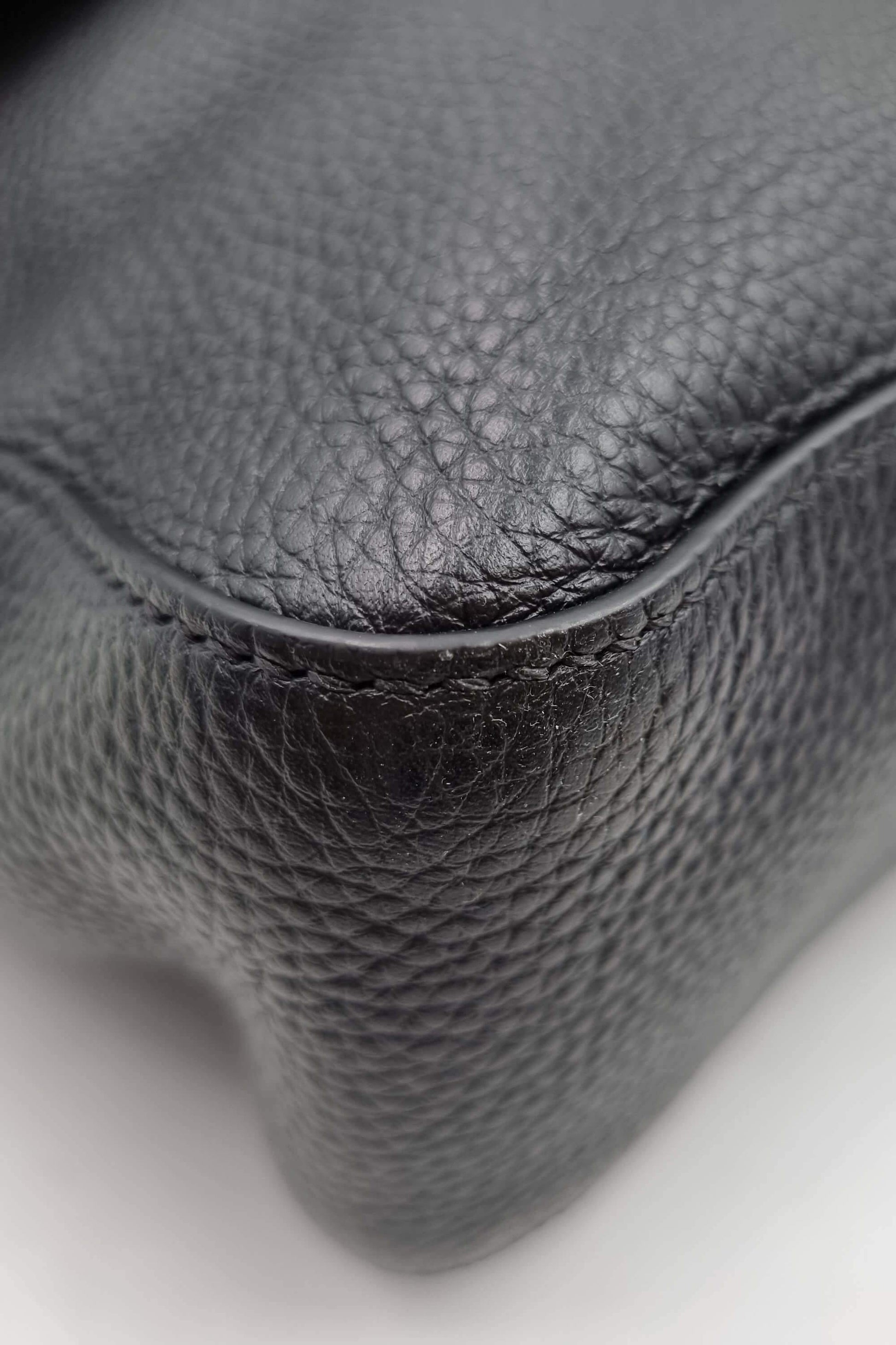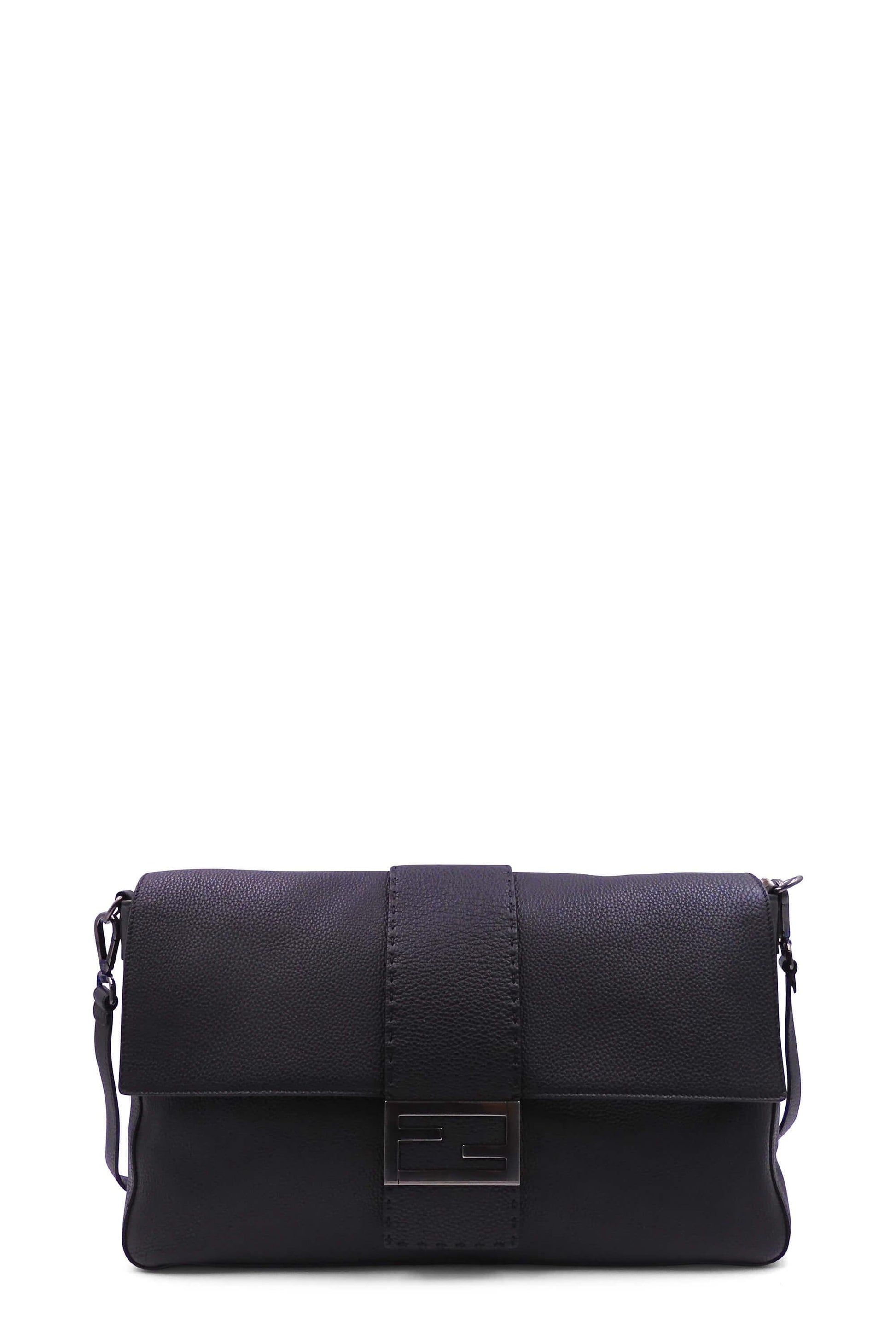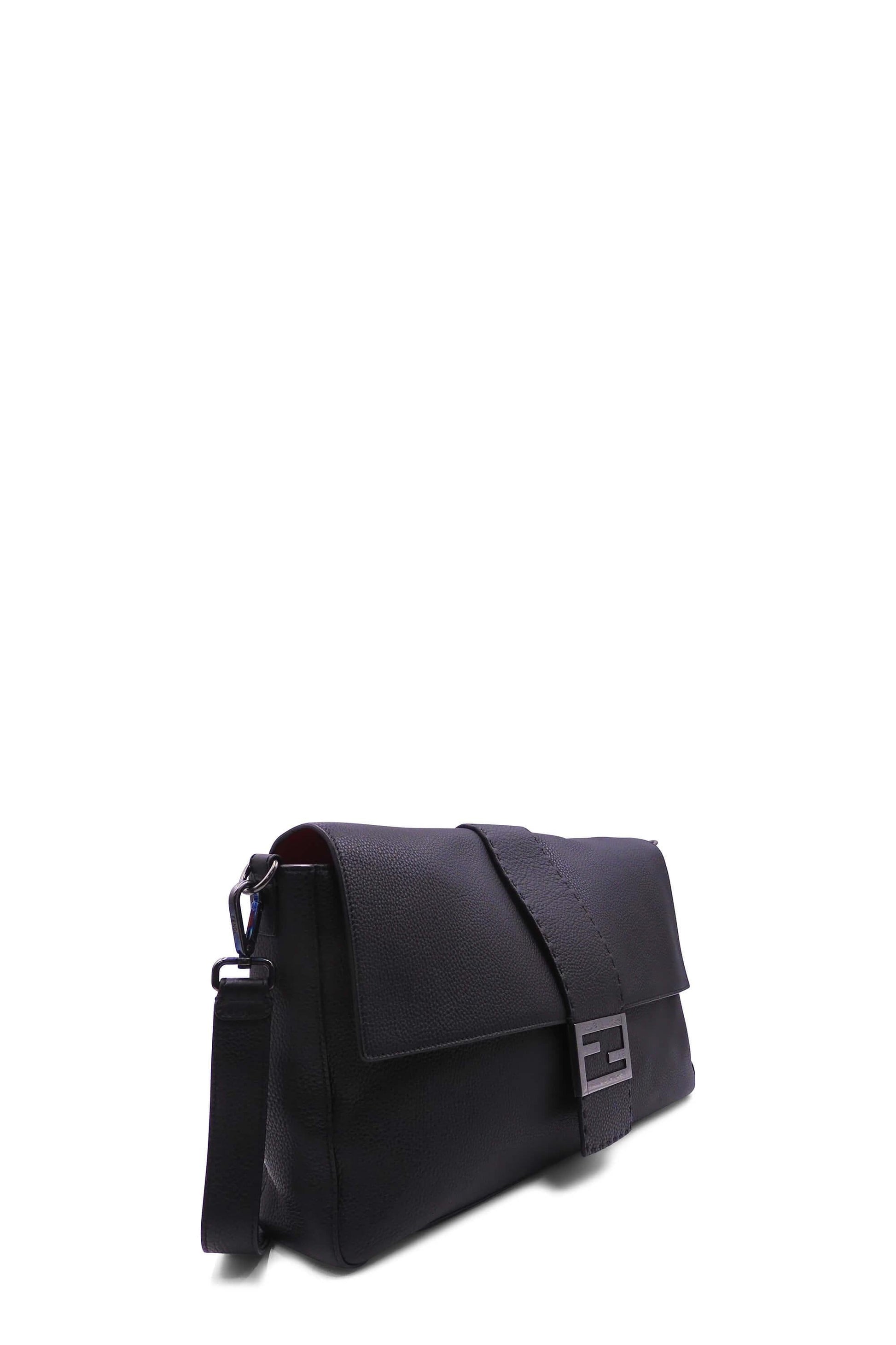 This Fendi Romano Selleria XL Baguatte features a black calfskin leather body with gunmetal hardware, detachable and adjustable shoulder strap, logo hardware on the magnetic closure flap.