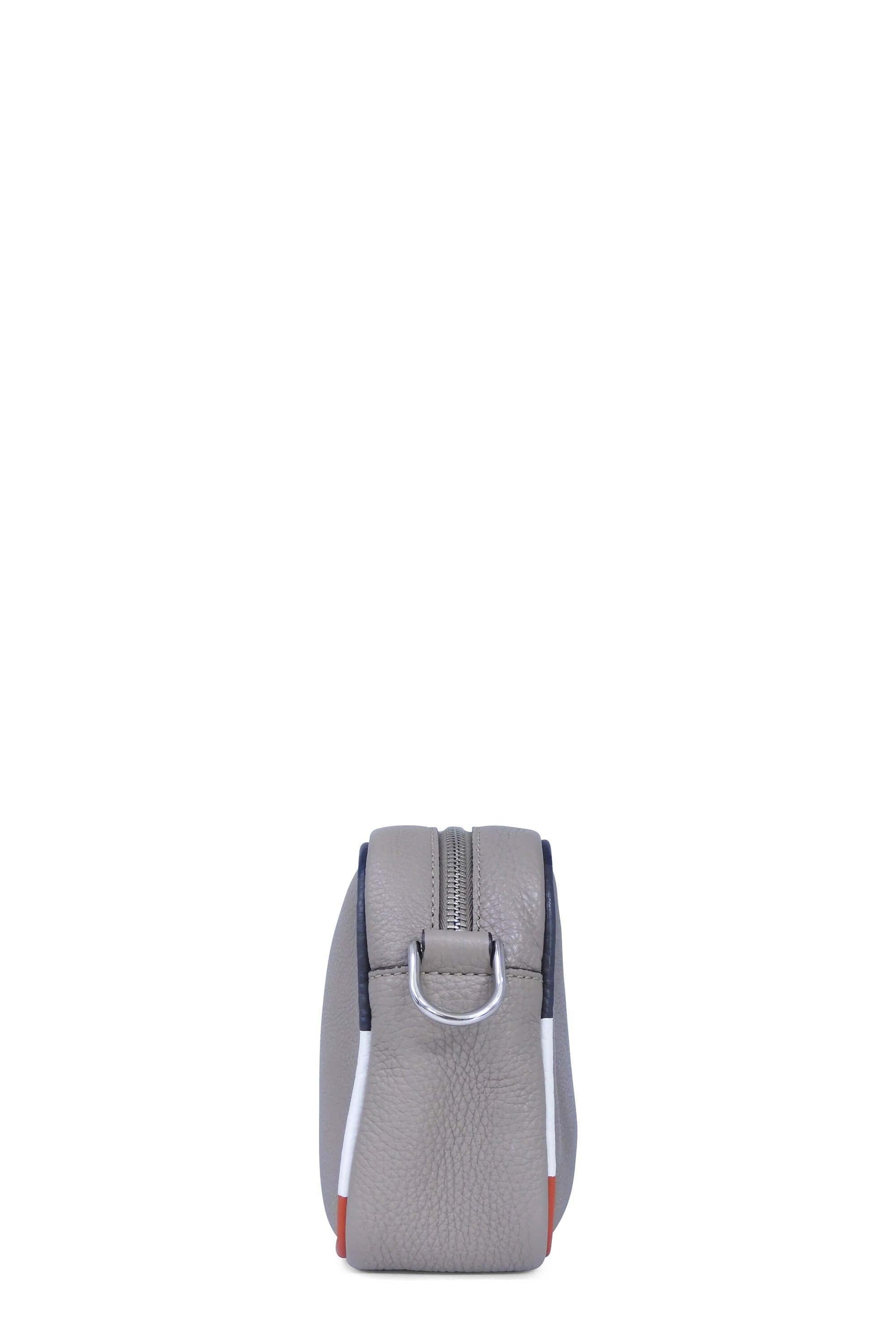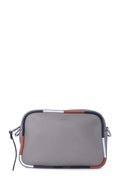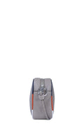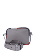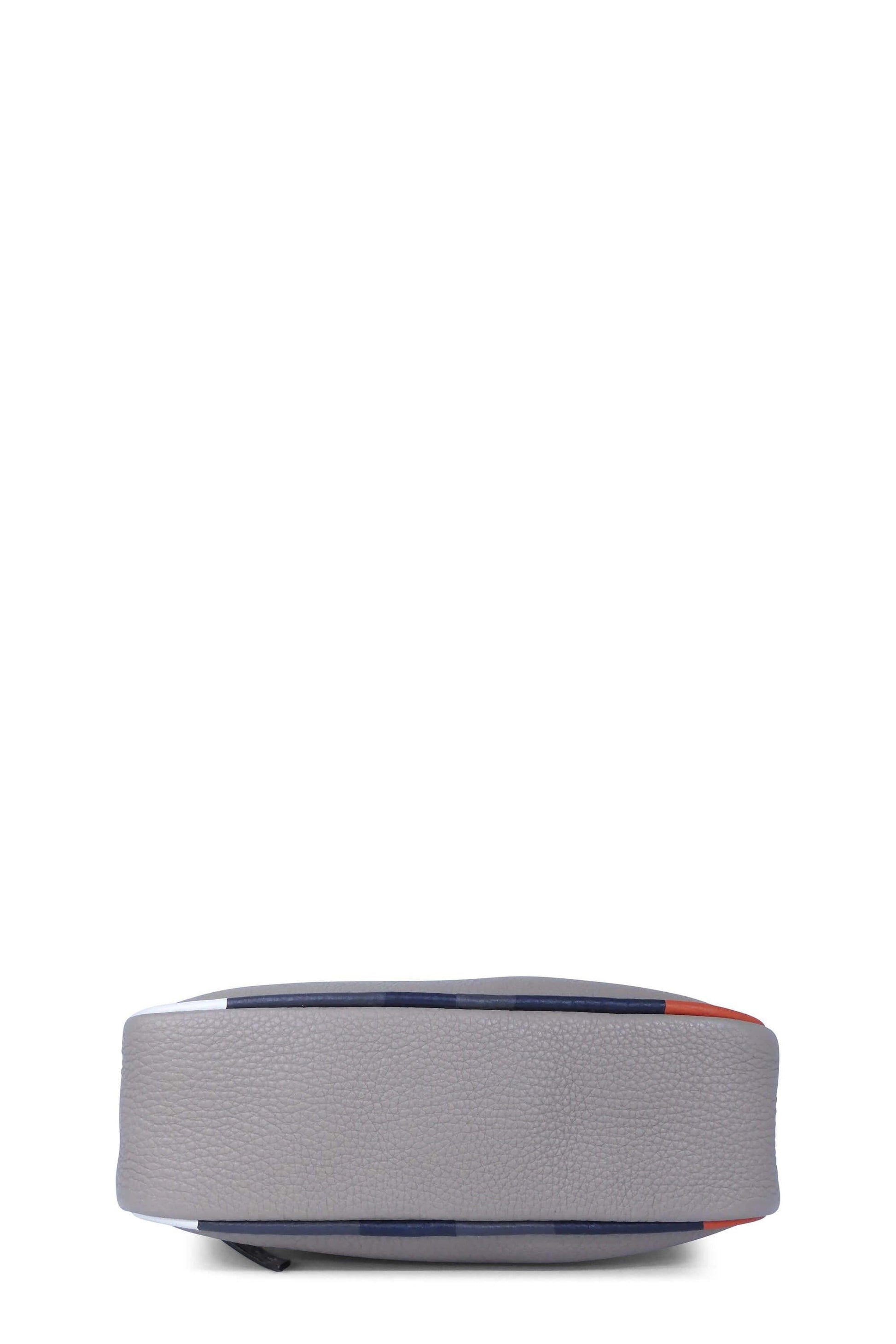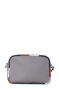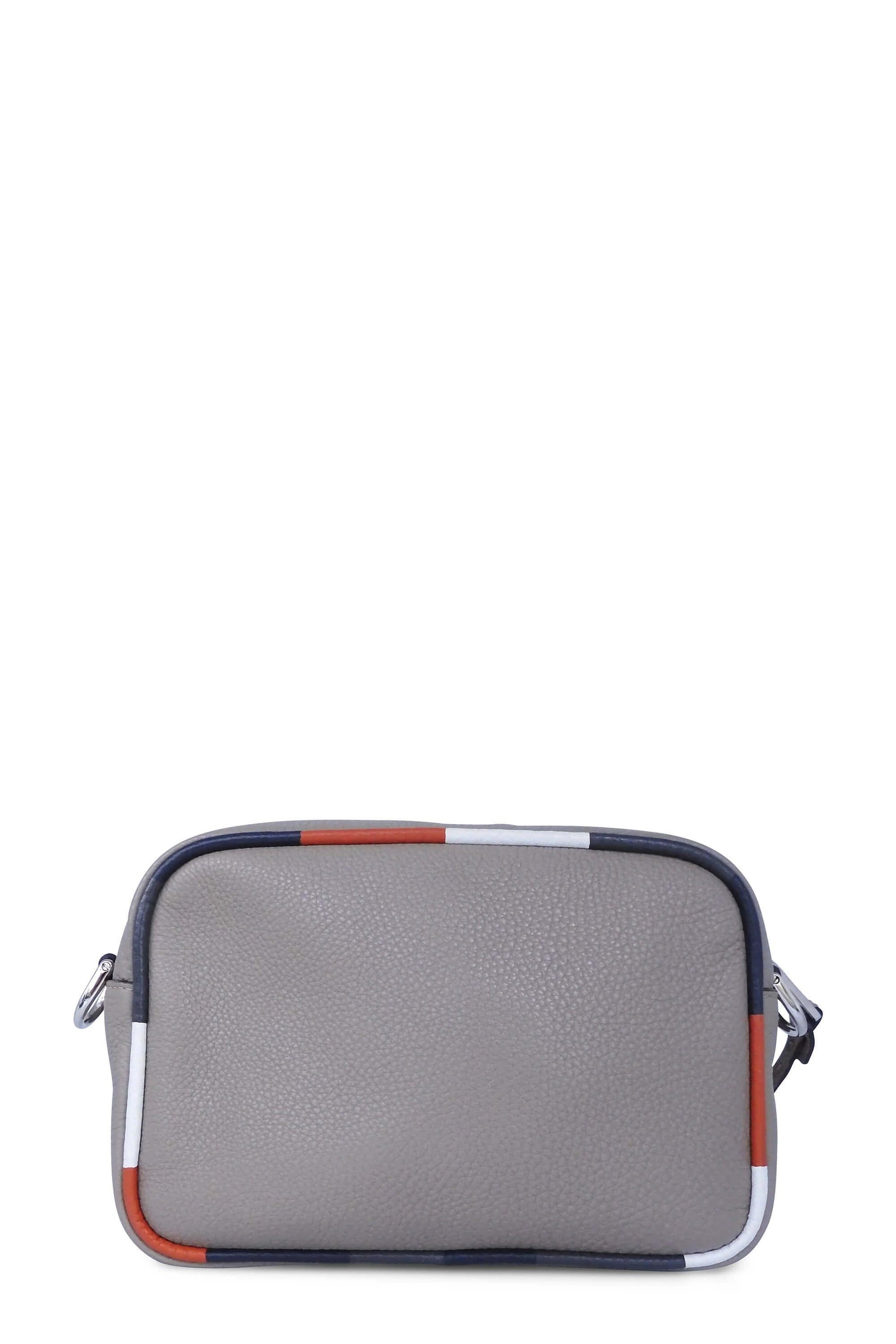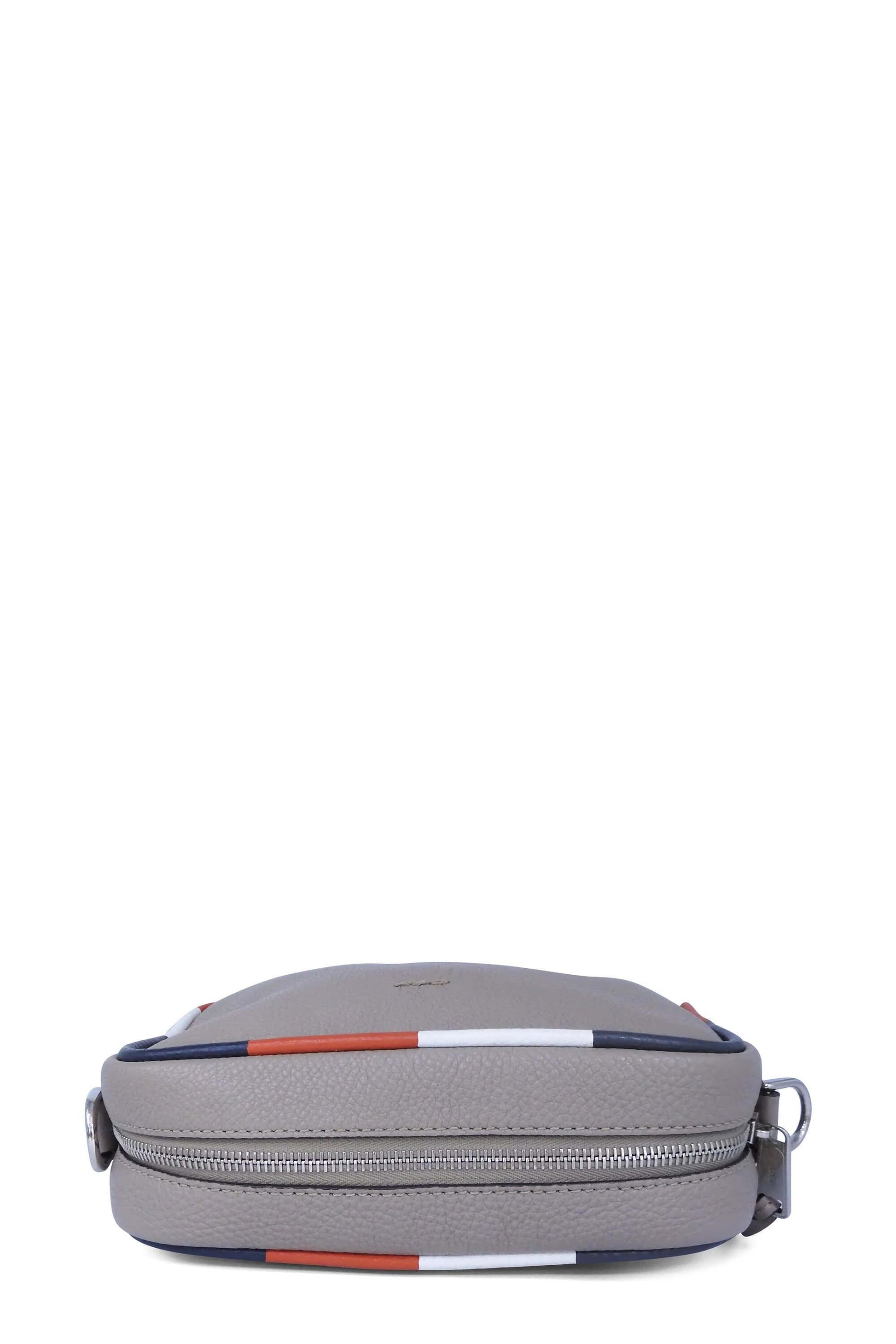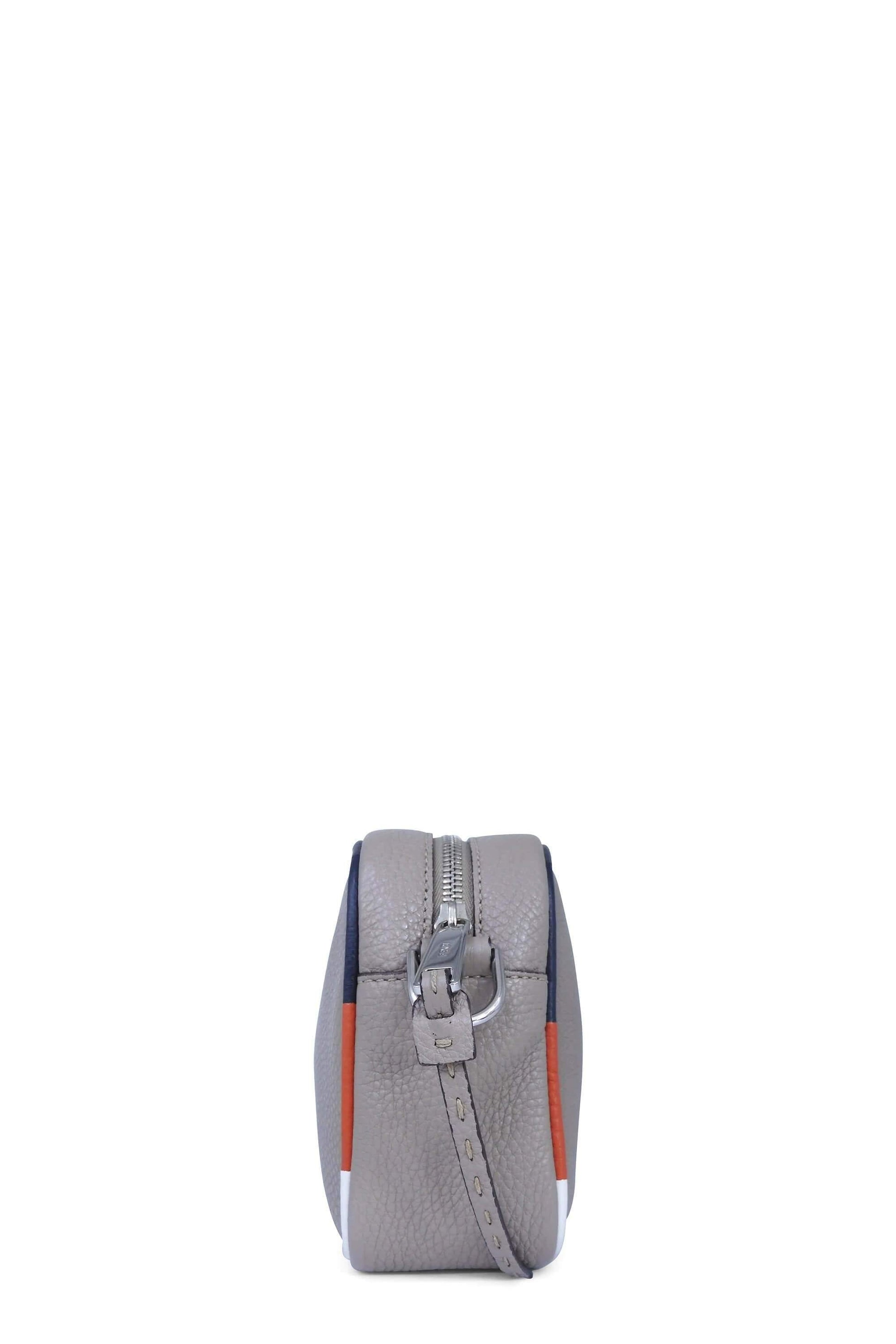 Tawny grained leather Fendi Selleria Camera bag with silver-tone hardware, orange, black and multicolor piping detail at exterior, single detachable flat shoulder strap with buckle adjustment, debossed logo at front, charcoal suede lining, single interior slit pocket and zip closure at top.