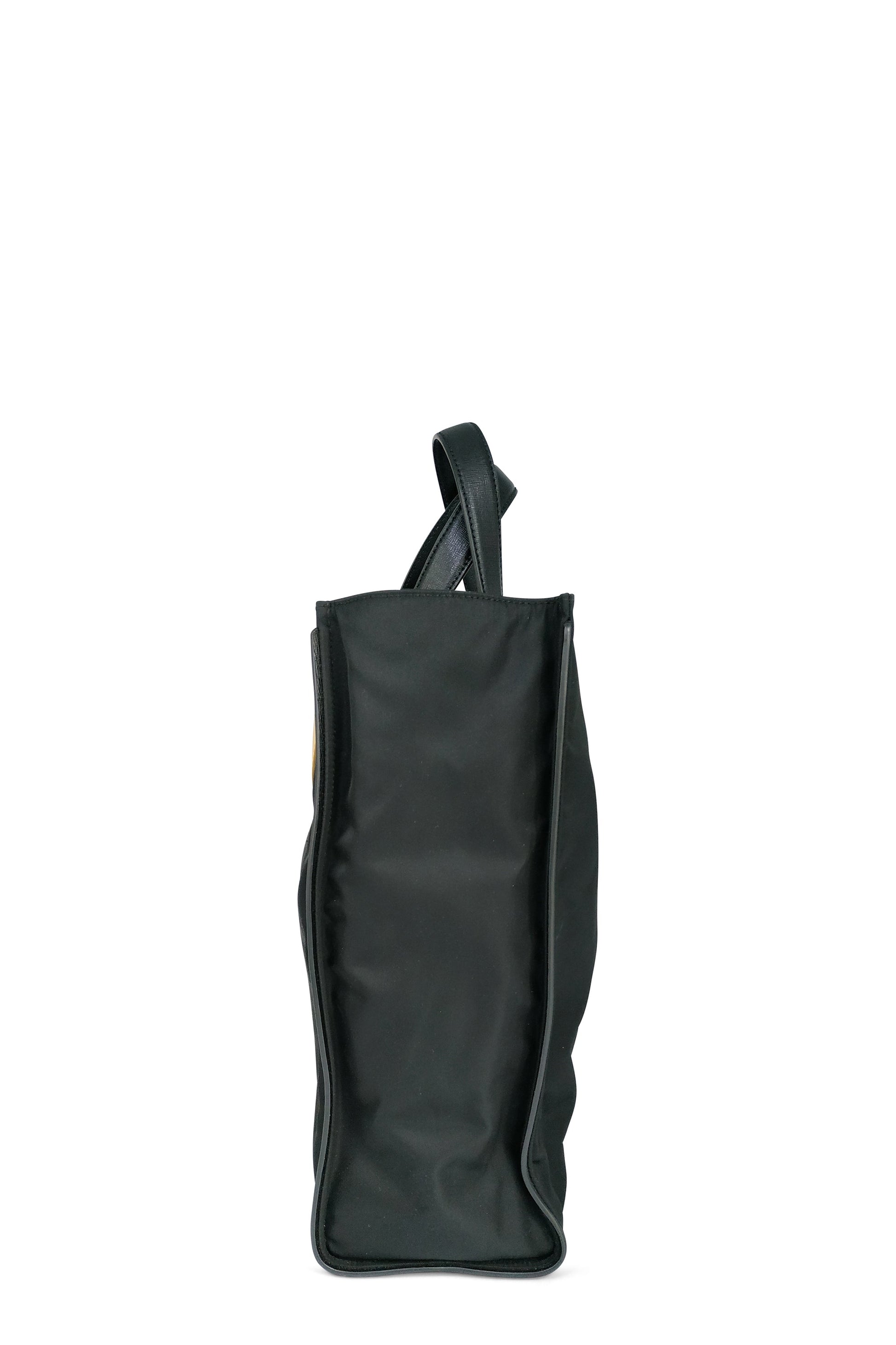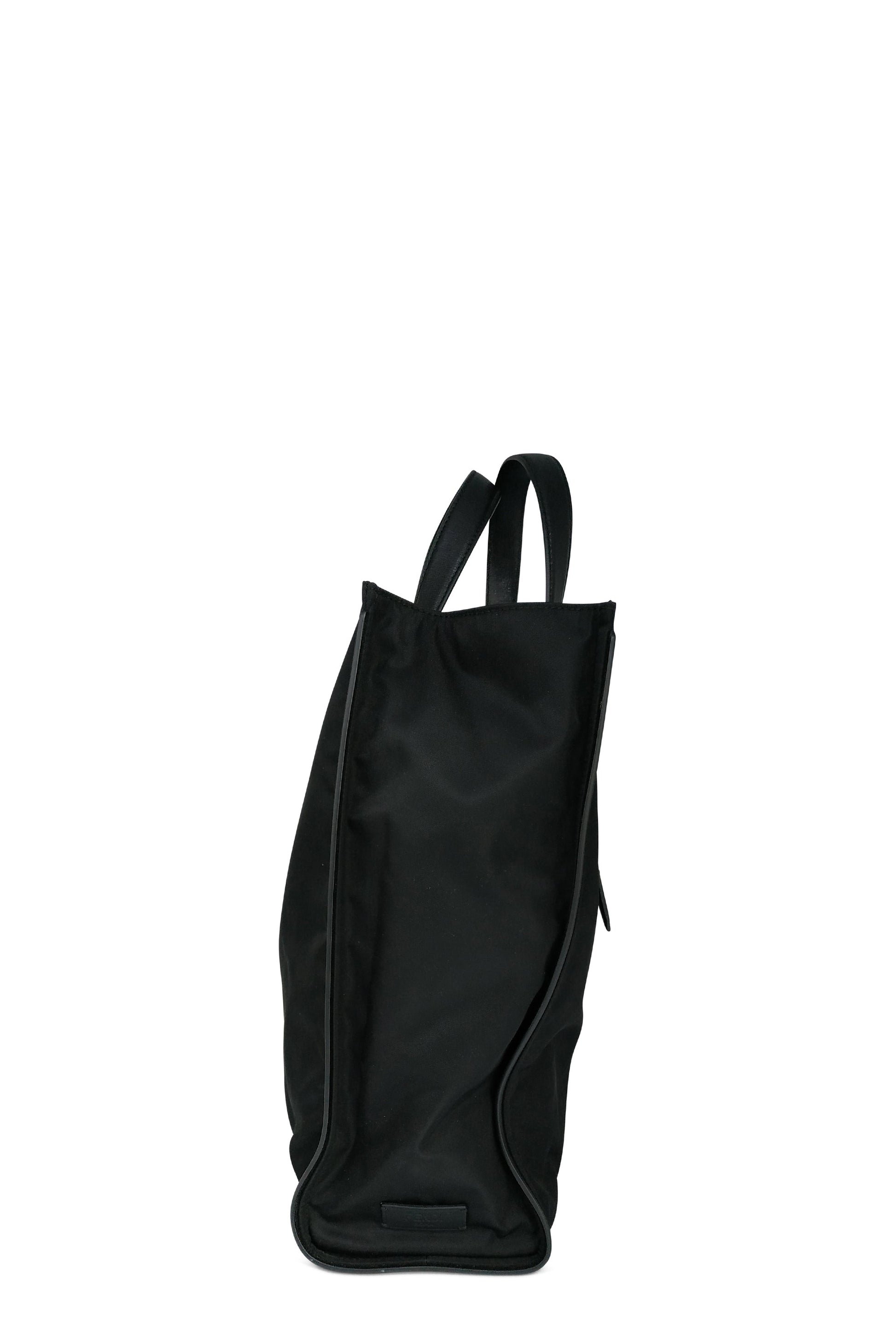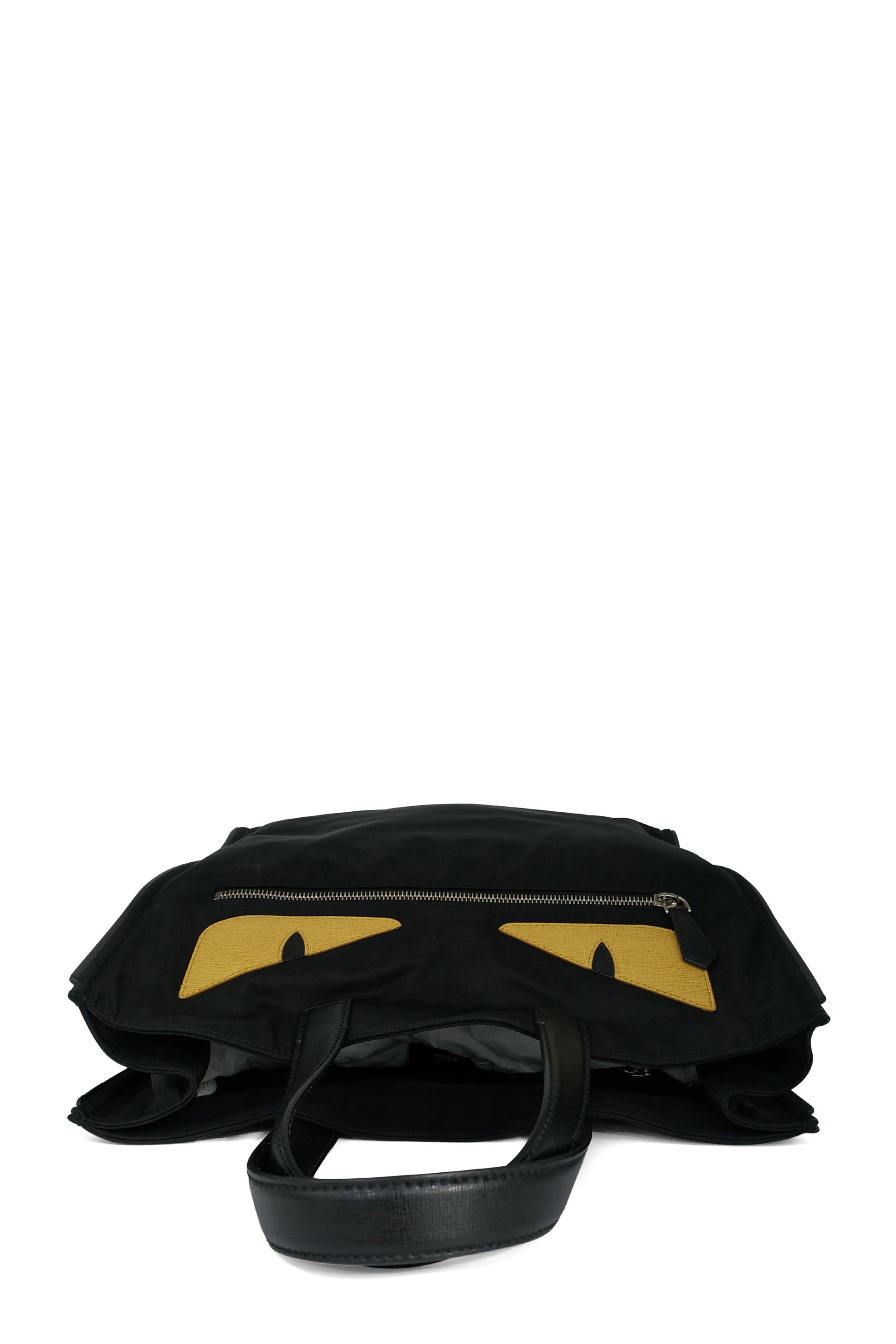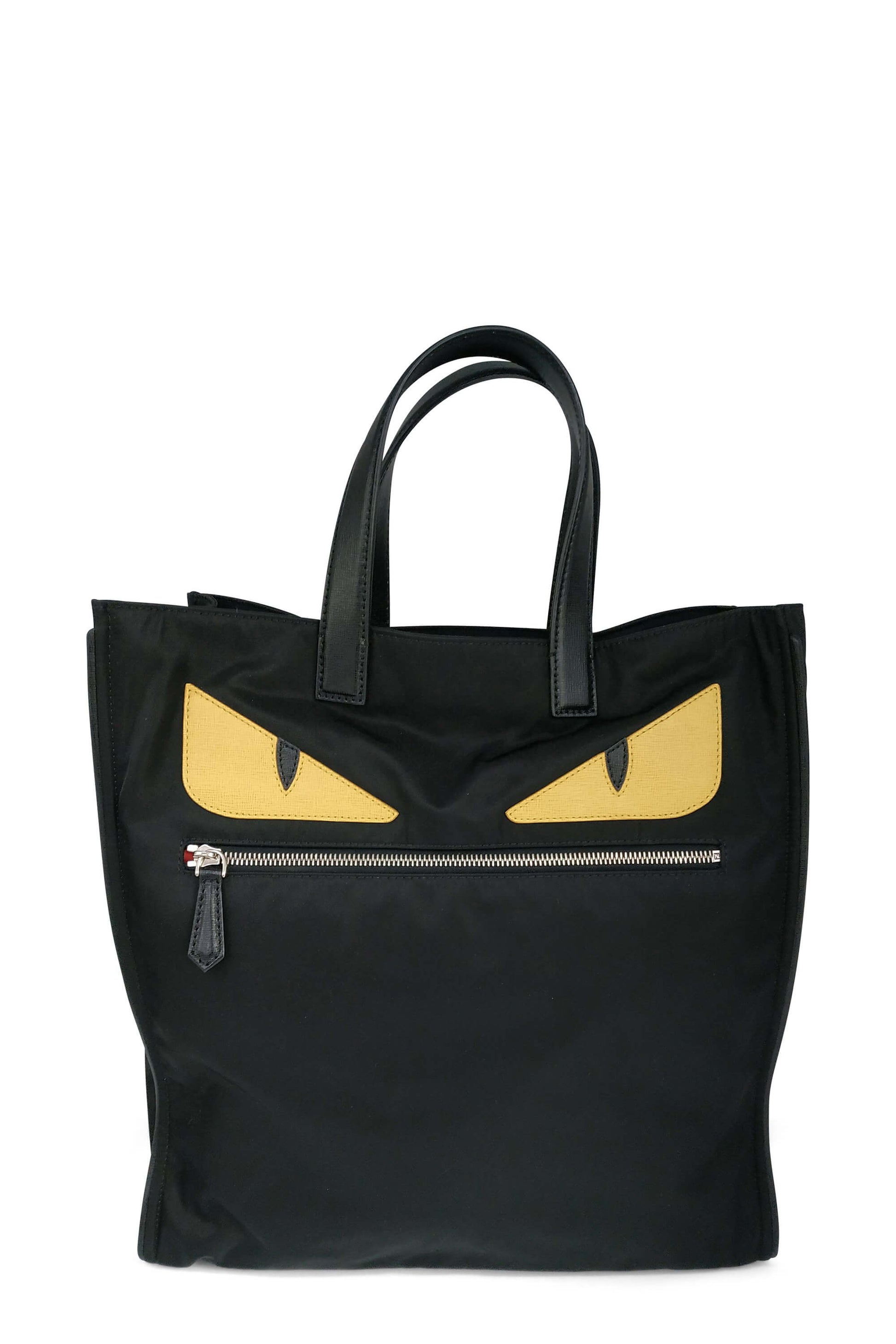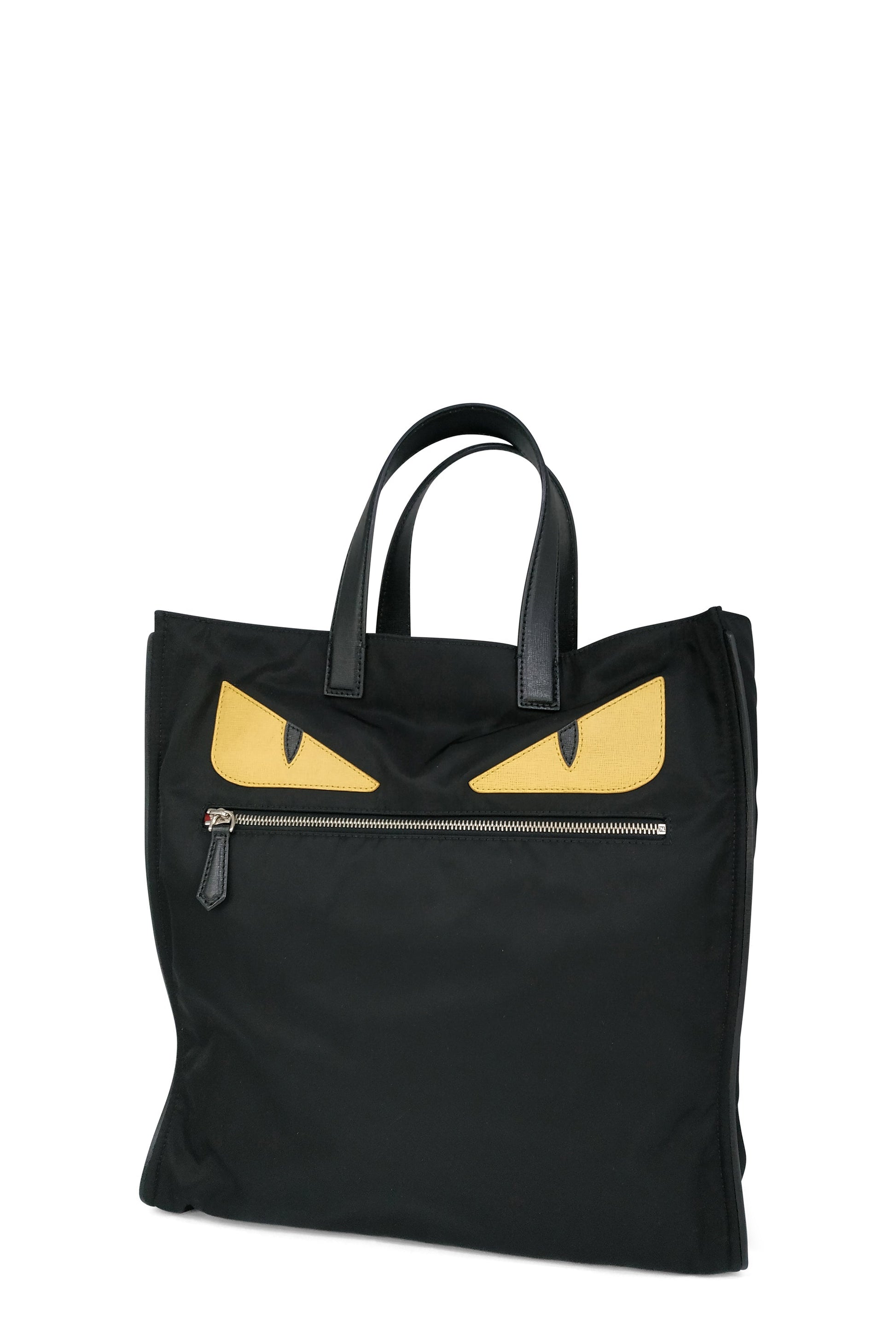 Fendi's black nylon Fendi Slim Monster tote with silver-tone hardware, dual leather top handles, single zip pocket at front, 'Monster' eyes appliques at front, tonal woven lining, single zip pocket at interior wall and open top.