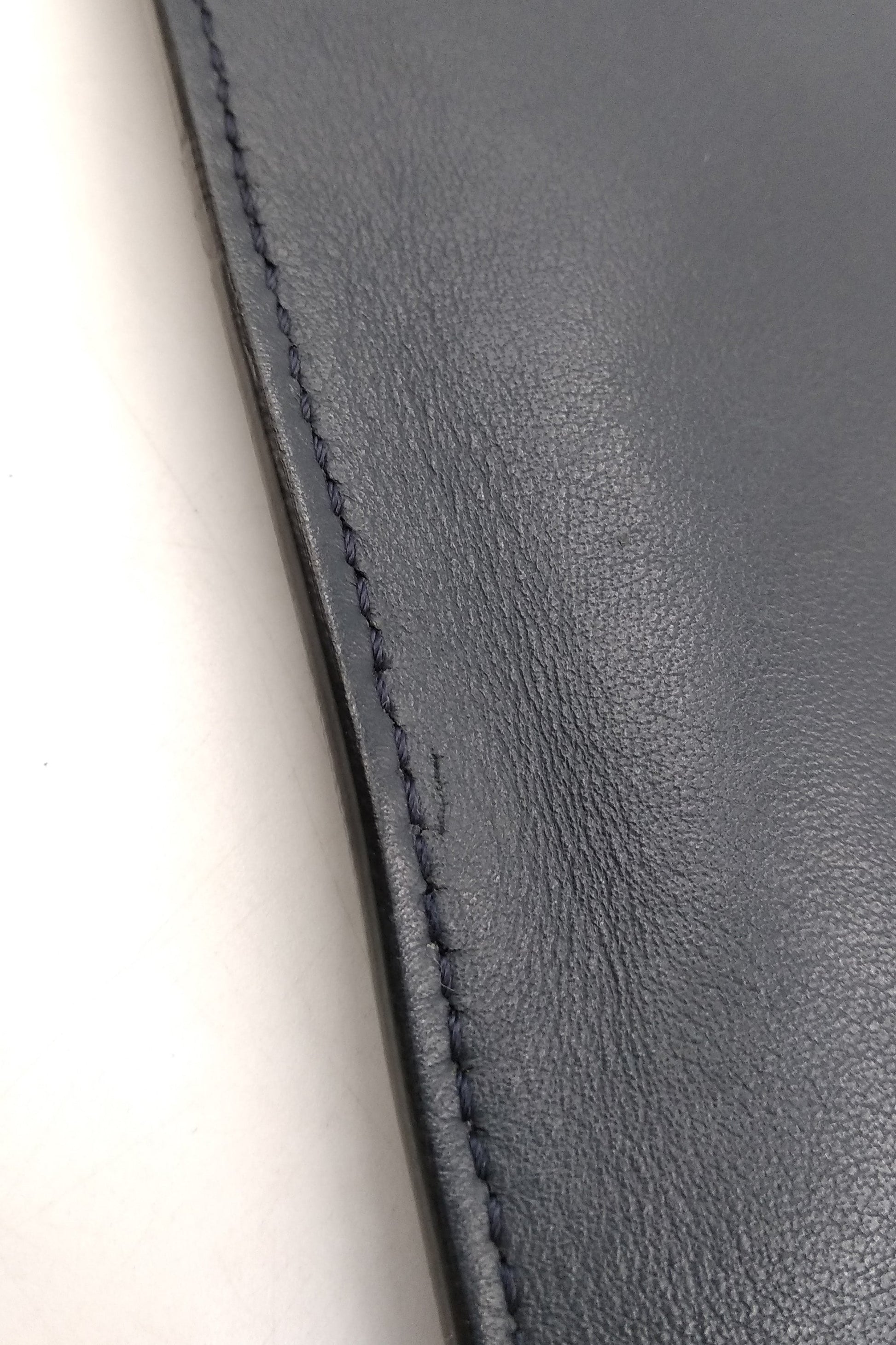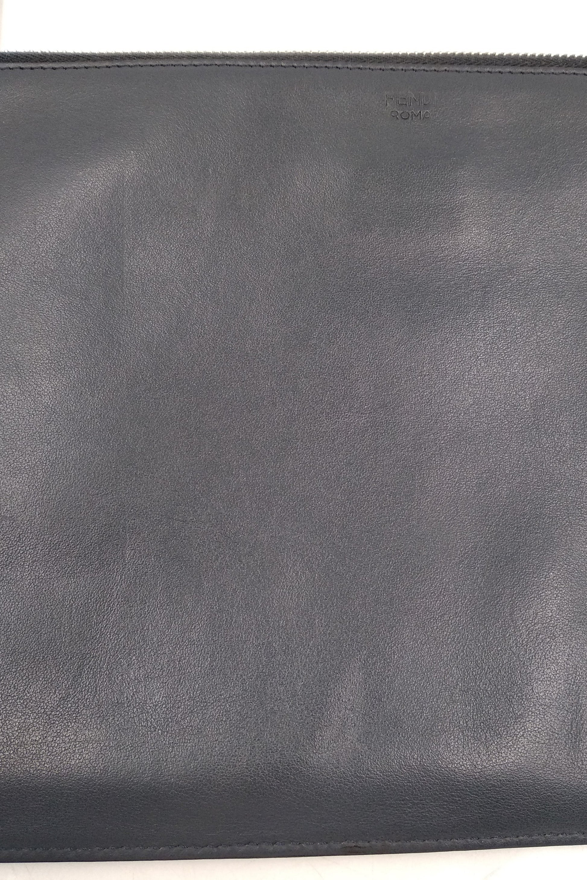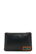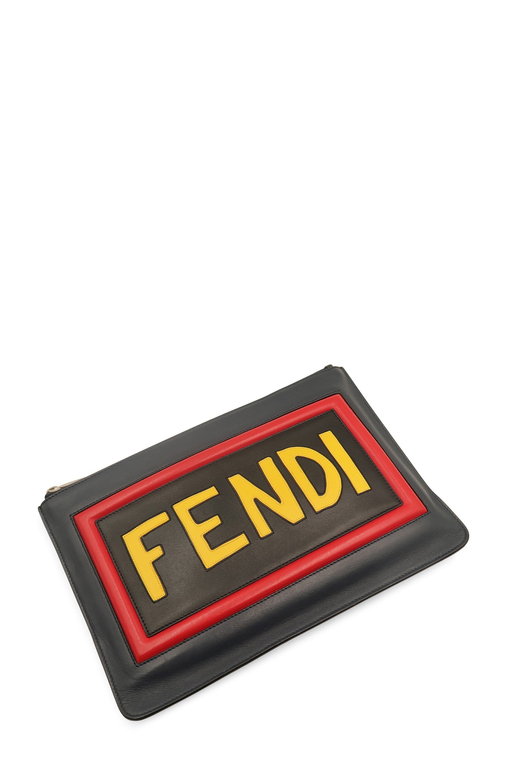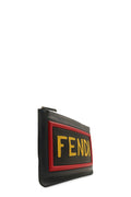 Crafted from leather, this navy blue pouch from Fendi is decorated with a red and yellow logo patch to the front for an extra cool touch. The perfect accessory to carry your essentials around in style. Featuring a top zip fastening, a main internal compartment and a "Think" patch to the rear.