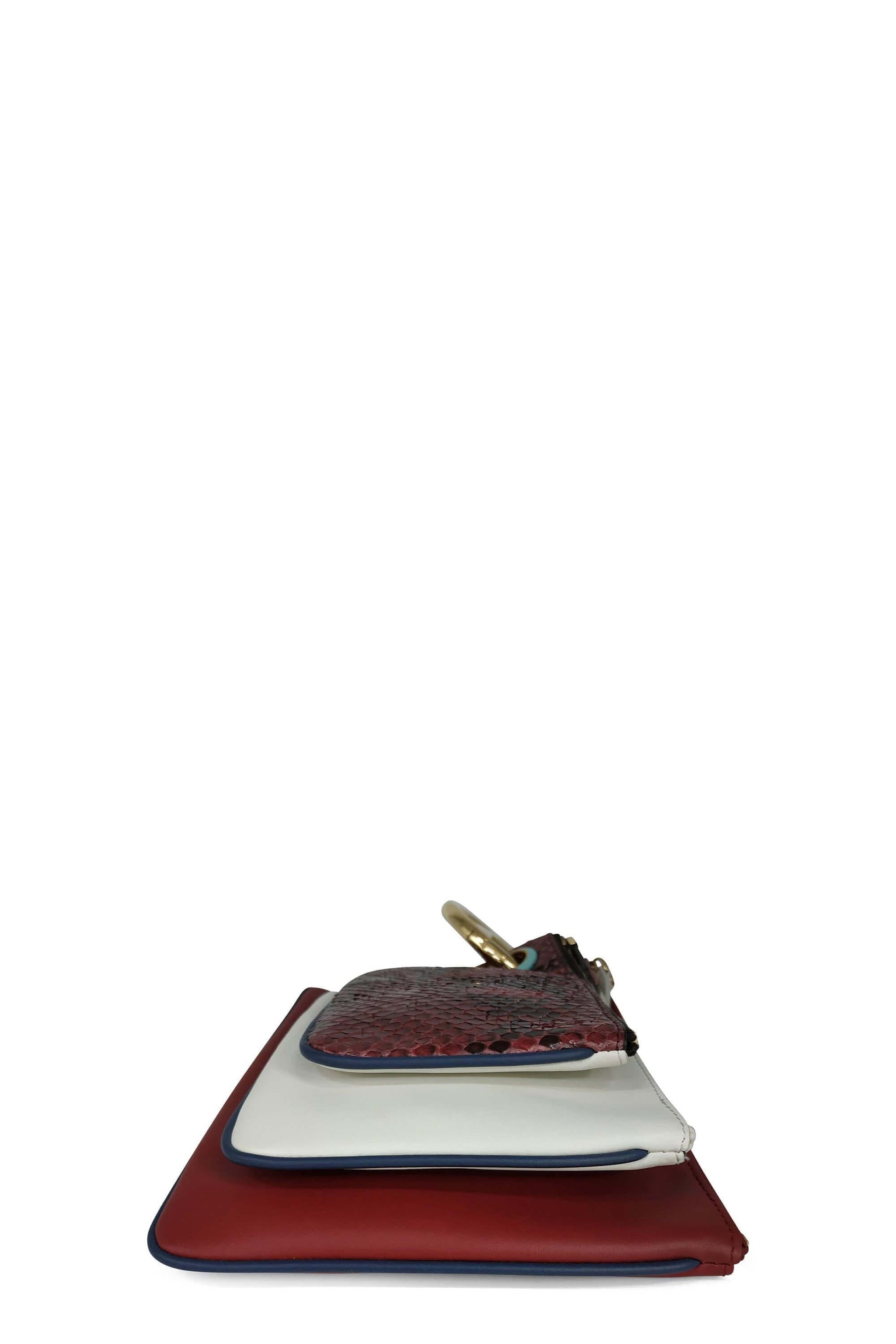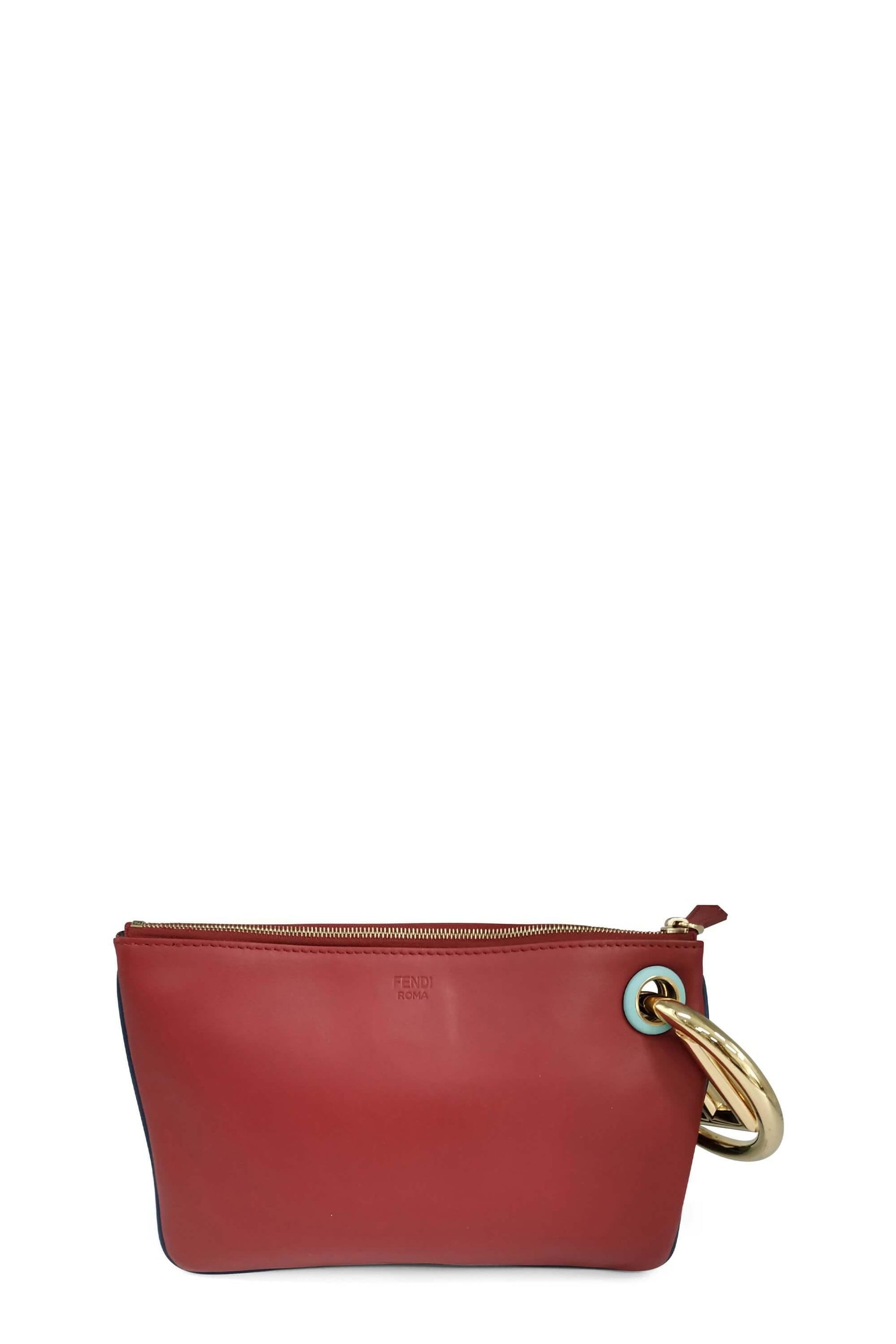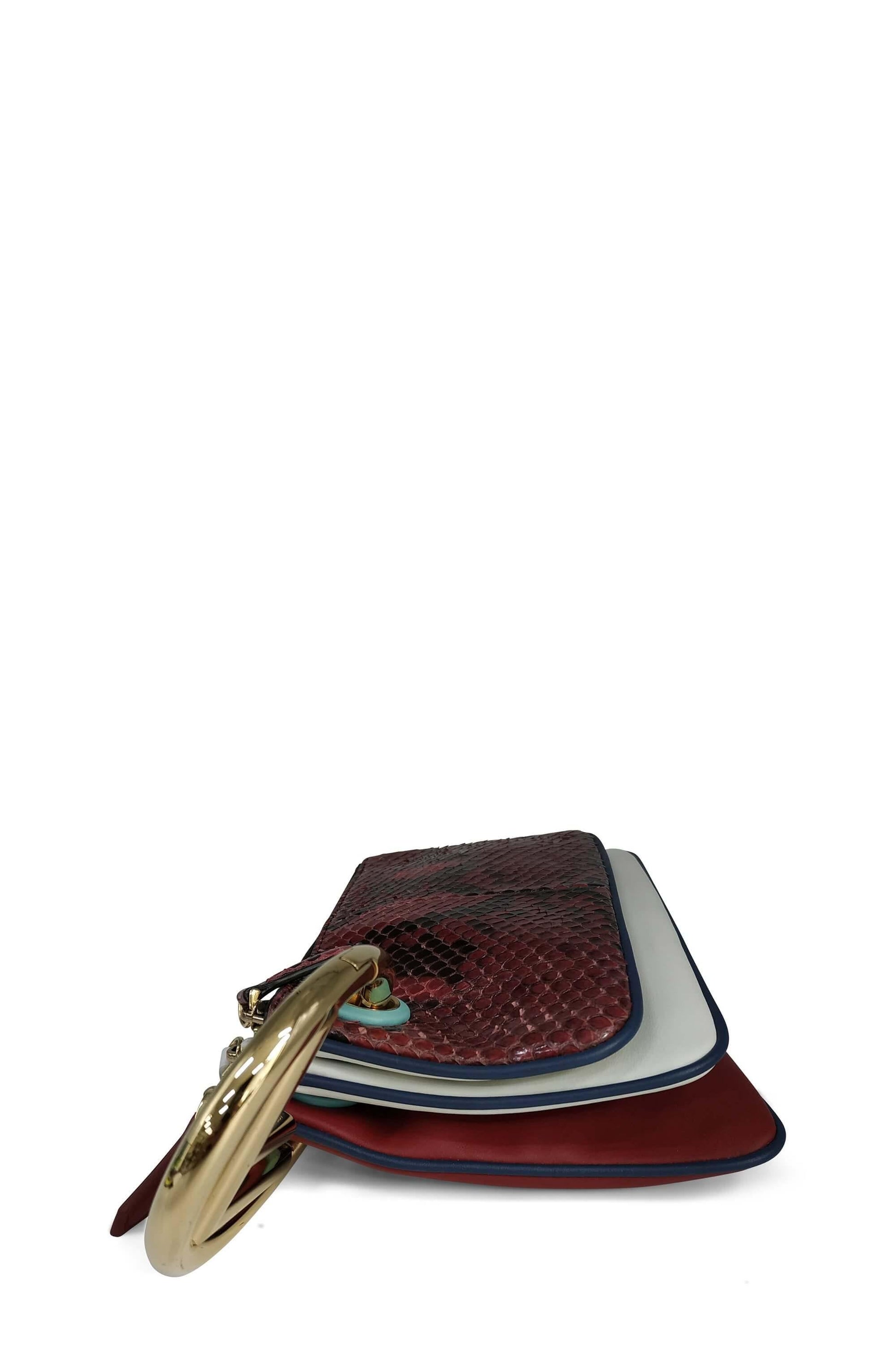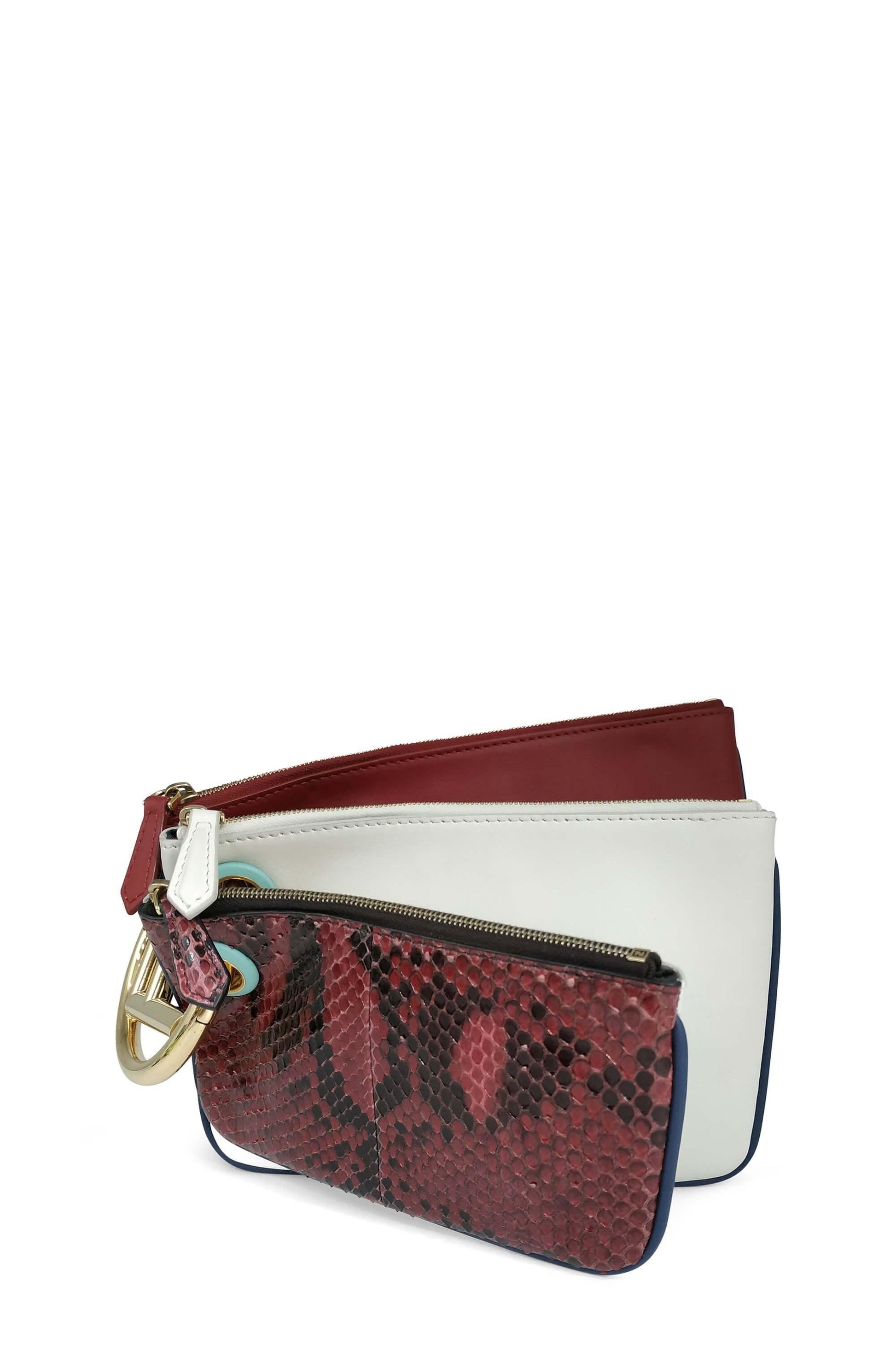 This Fendi python and leather with grommets Triplette Clutch features a leather body, gold Fendi ring and top zip closures.