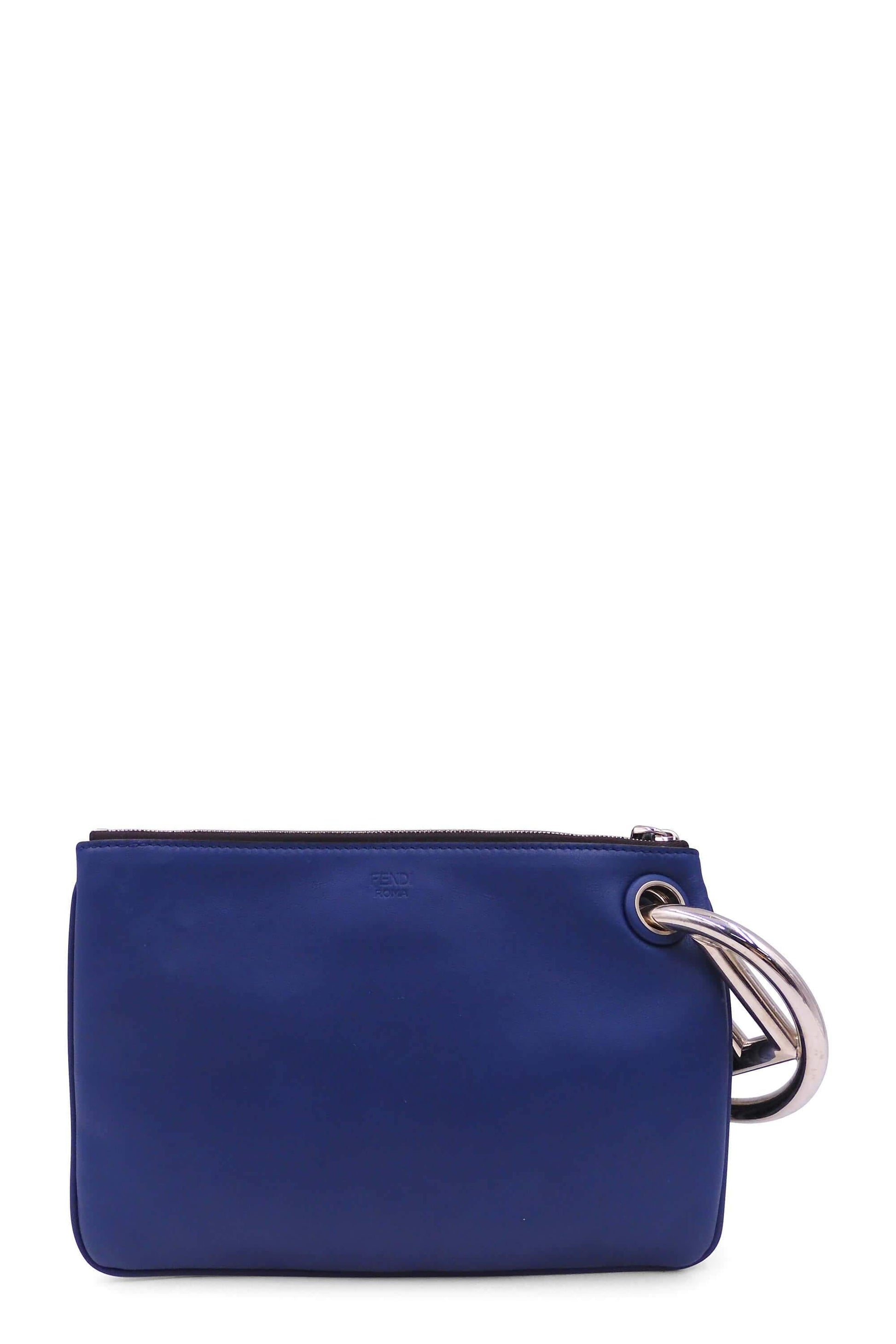 This Fendi python and leather with grommets Triplette Clutch features a navy leather and multicolour snakeskin body, silver Fendi ring and top zip closures.