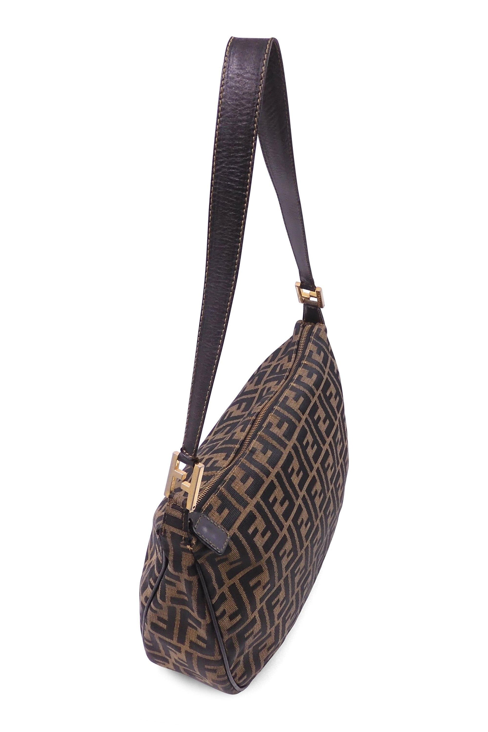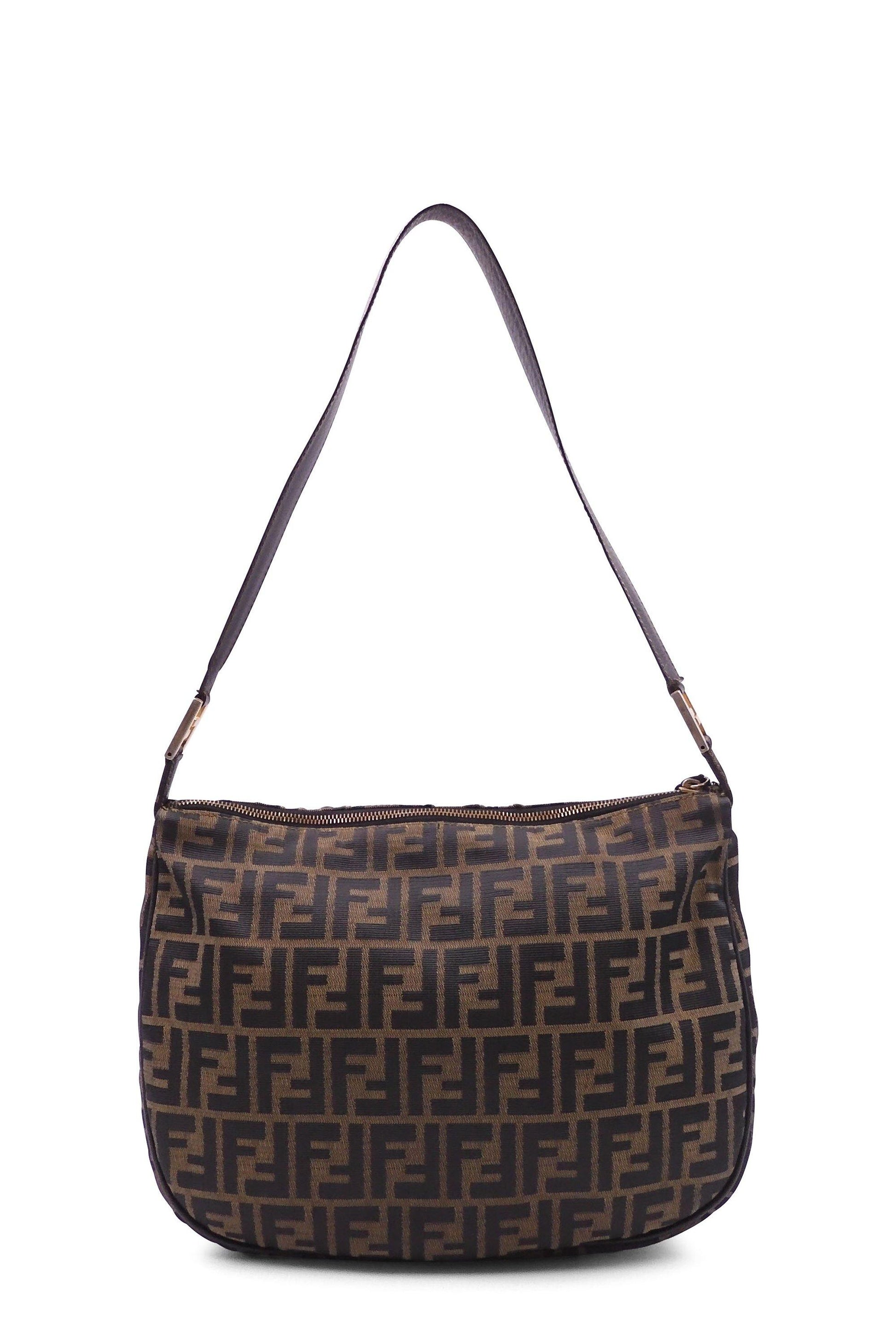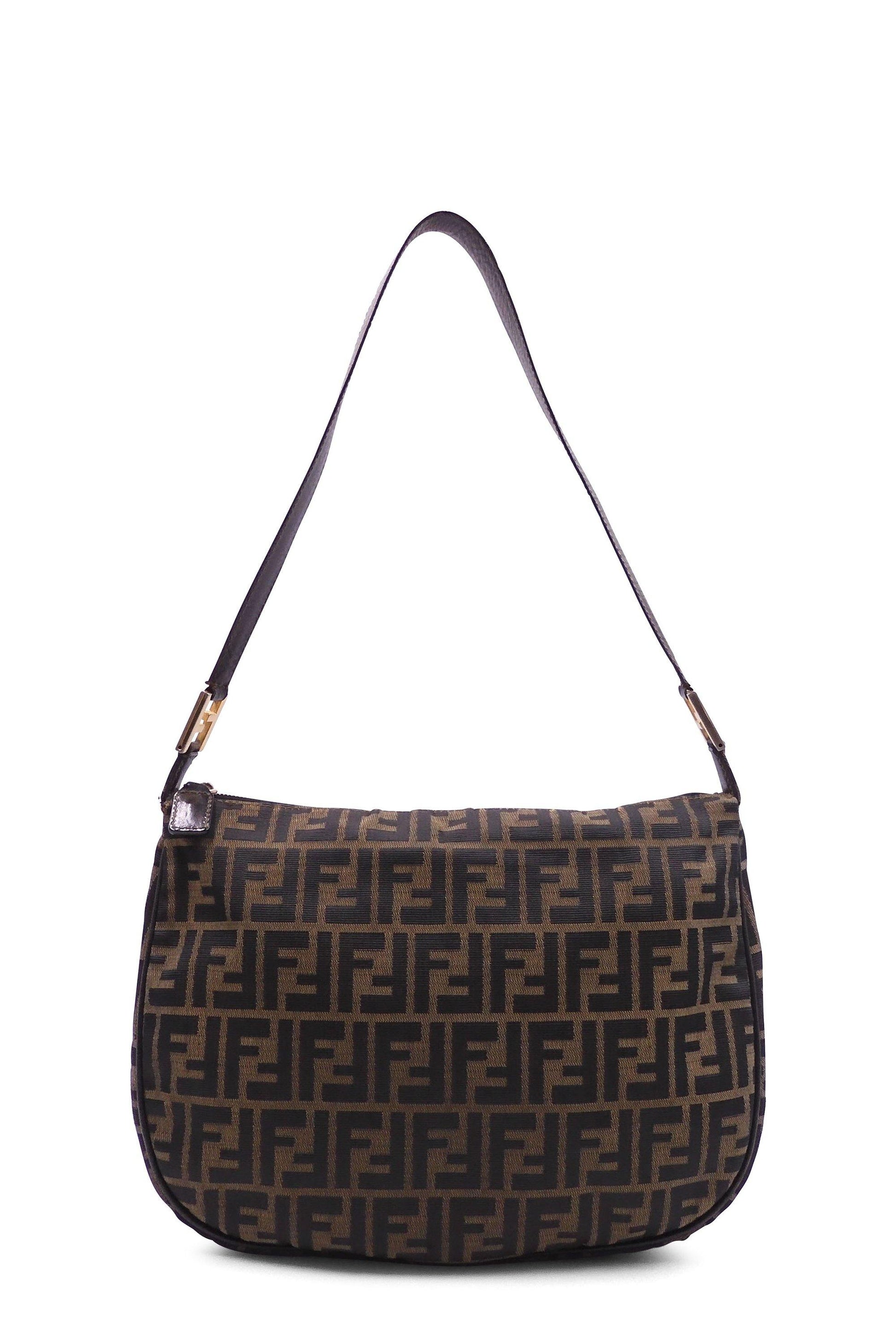 This Fendi Zucchino Canvas Shoulder Bag is crafted of brown on khaki Zucchino monogram canvas with brown leather top handle. This top zipper opens to a brown fabric lining with a zipper pocket.