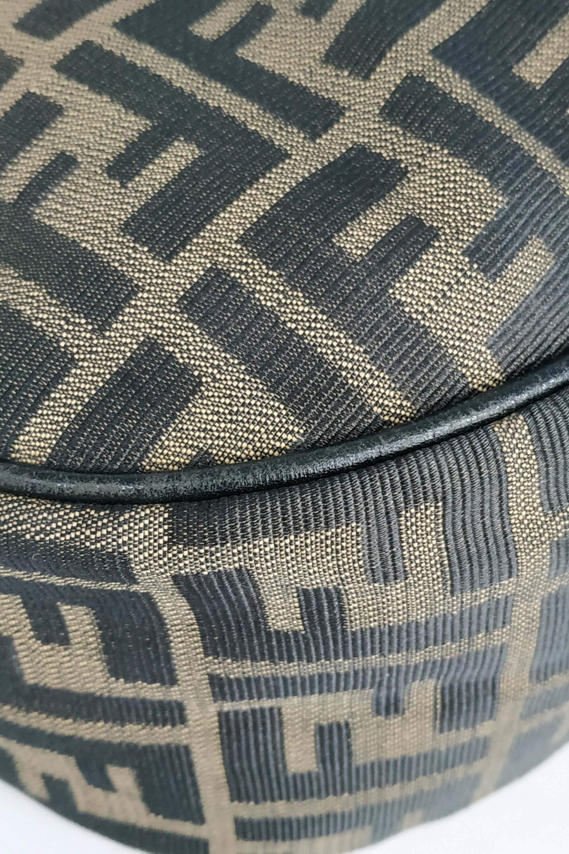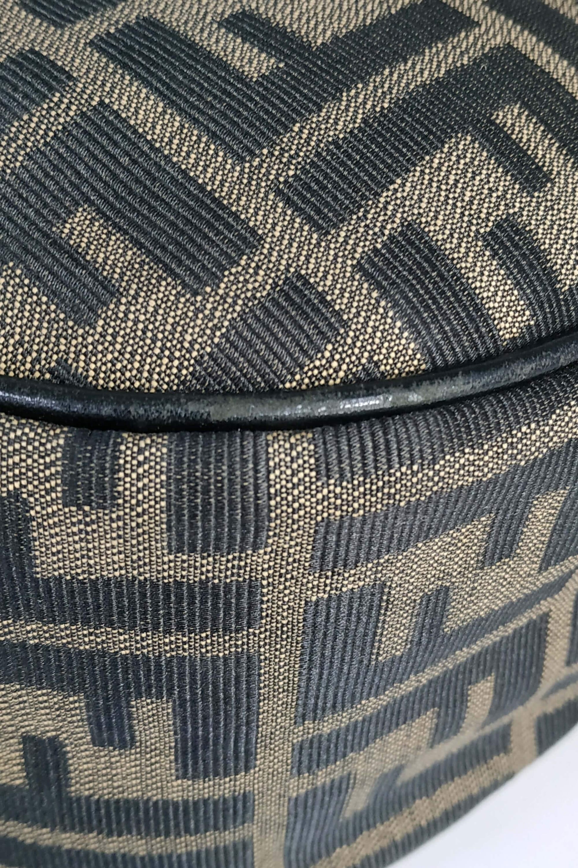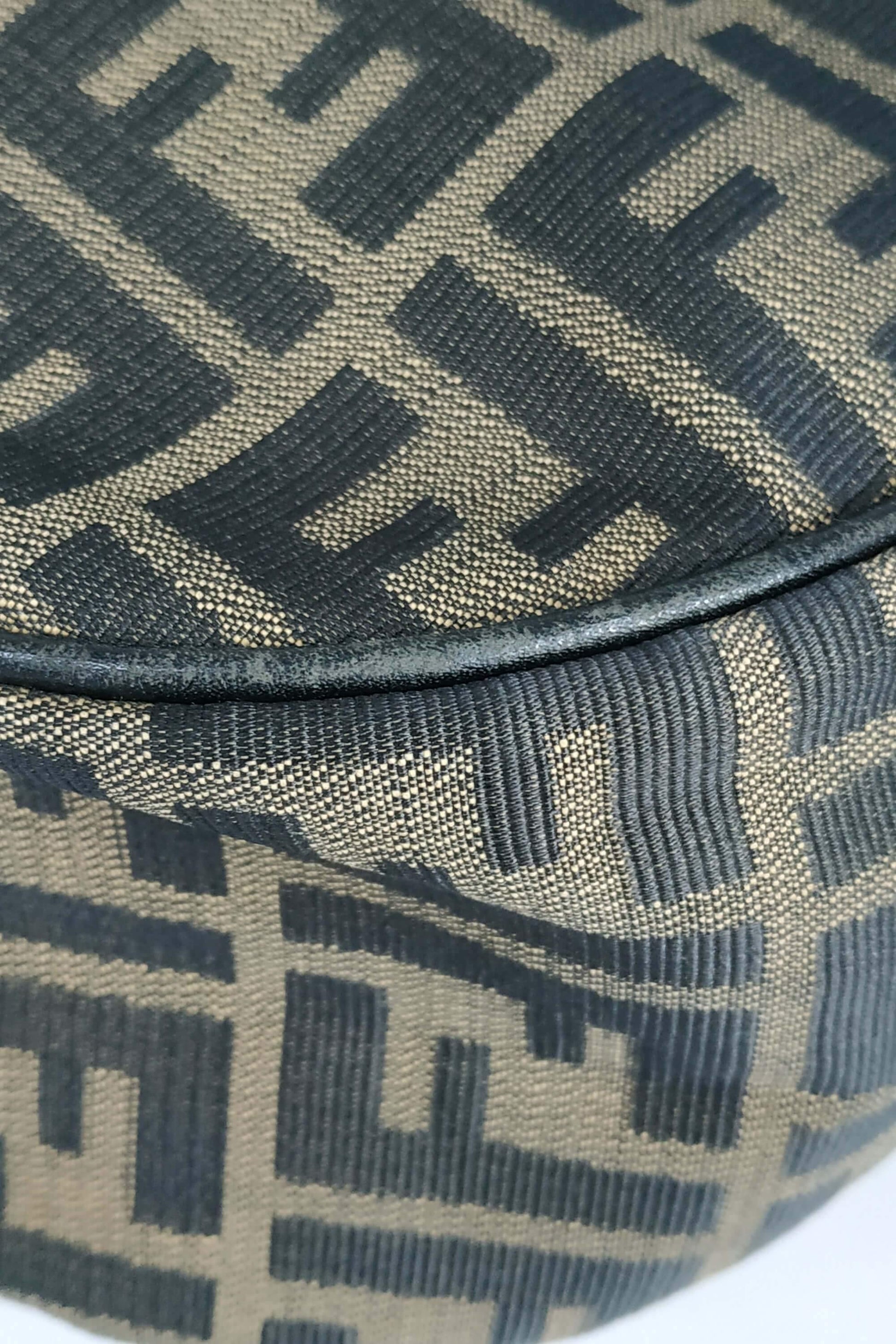 This Fendi Zucchino Canvas Shoulder Bag is crafted of brown on khaki Zucchino monogram canvas with brown leather top handle. This top zipper opens to a brown fabric lining with a zipper pocket.