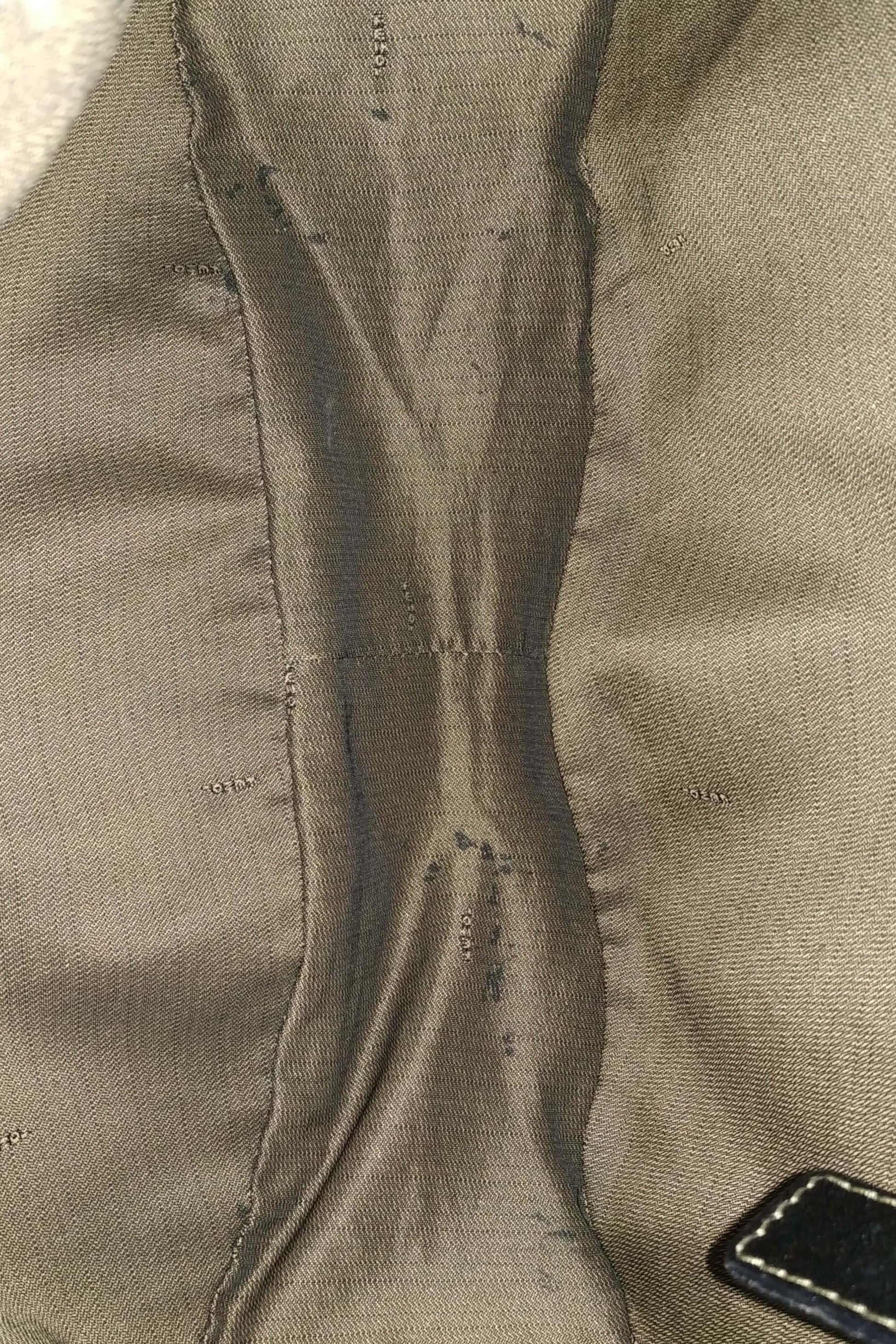 Slight worn stitches on top exterior. Discoloration on corners, strap and hardware. Minor stains on interior.