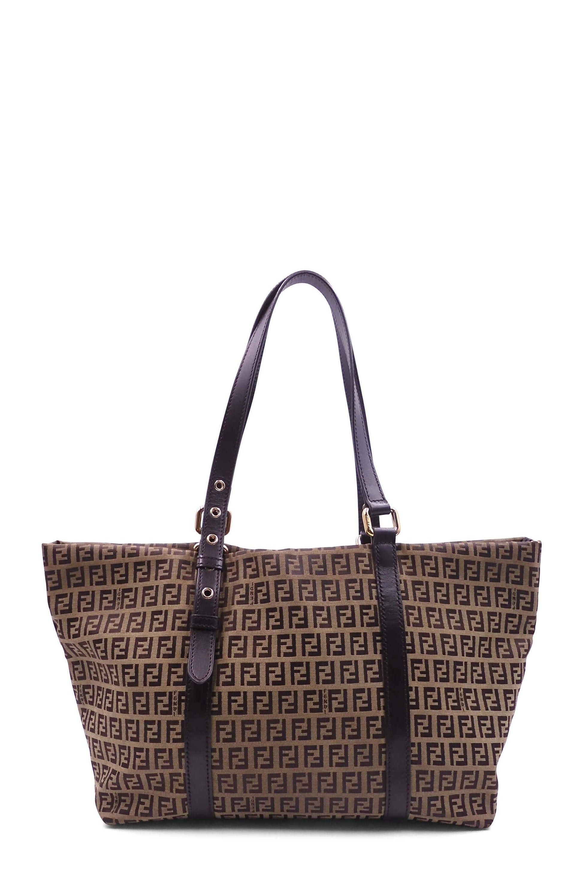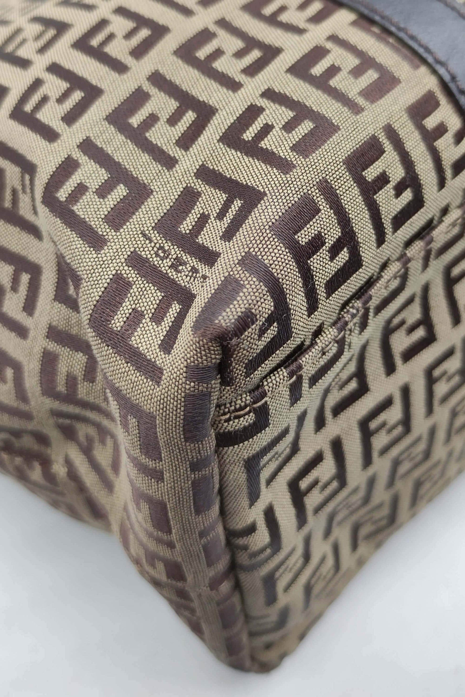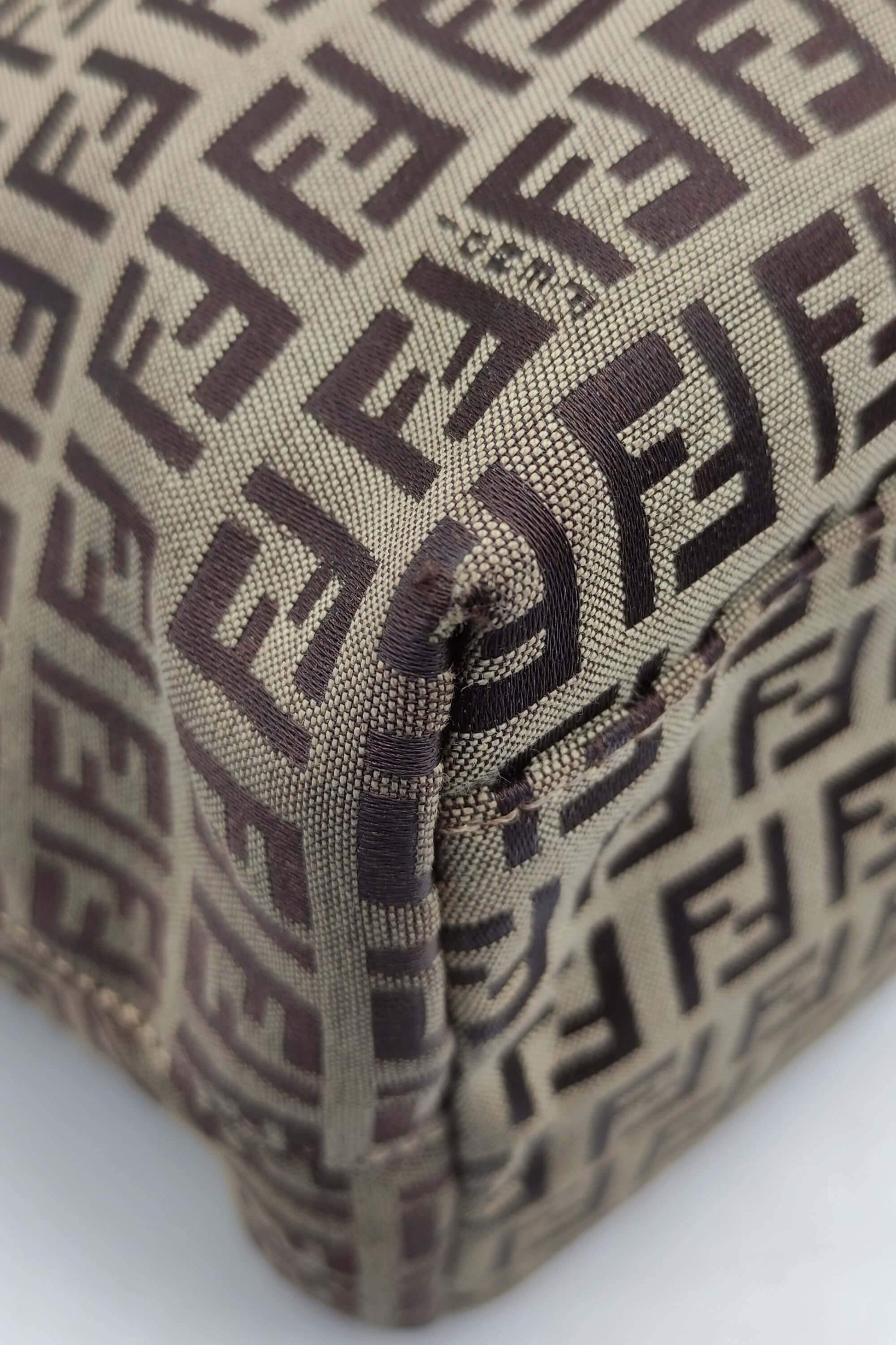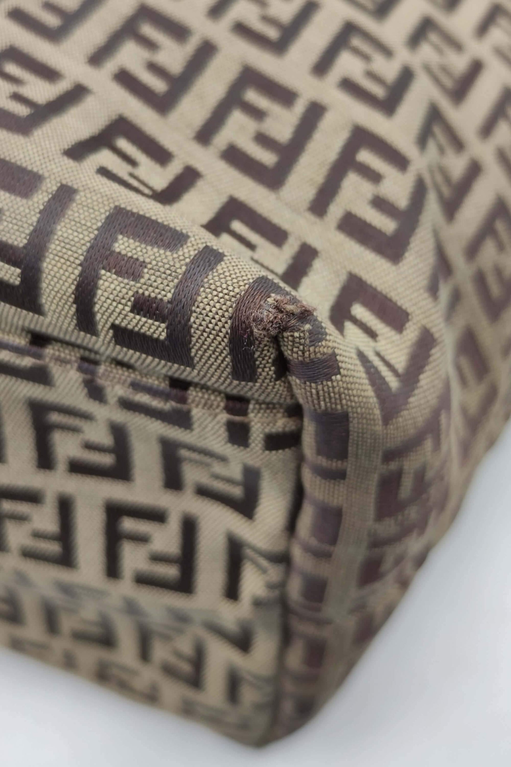 This Fendi Zucchino Shopping Tote is made of brown on khaki Zucchino monogram canvas with brown leather top handles. The top zipper opens to a brown fabric lining with patch pockets