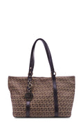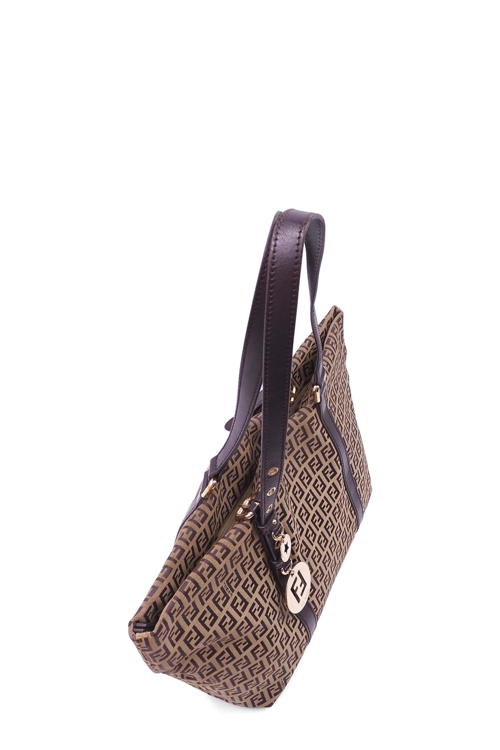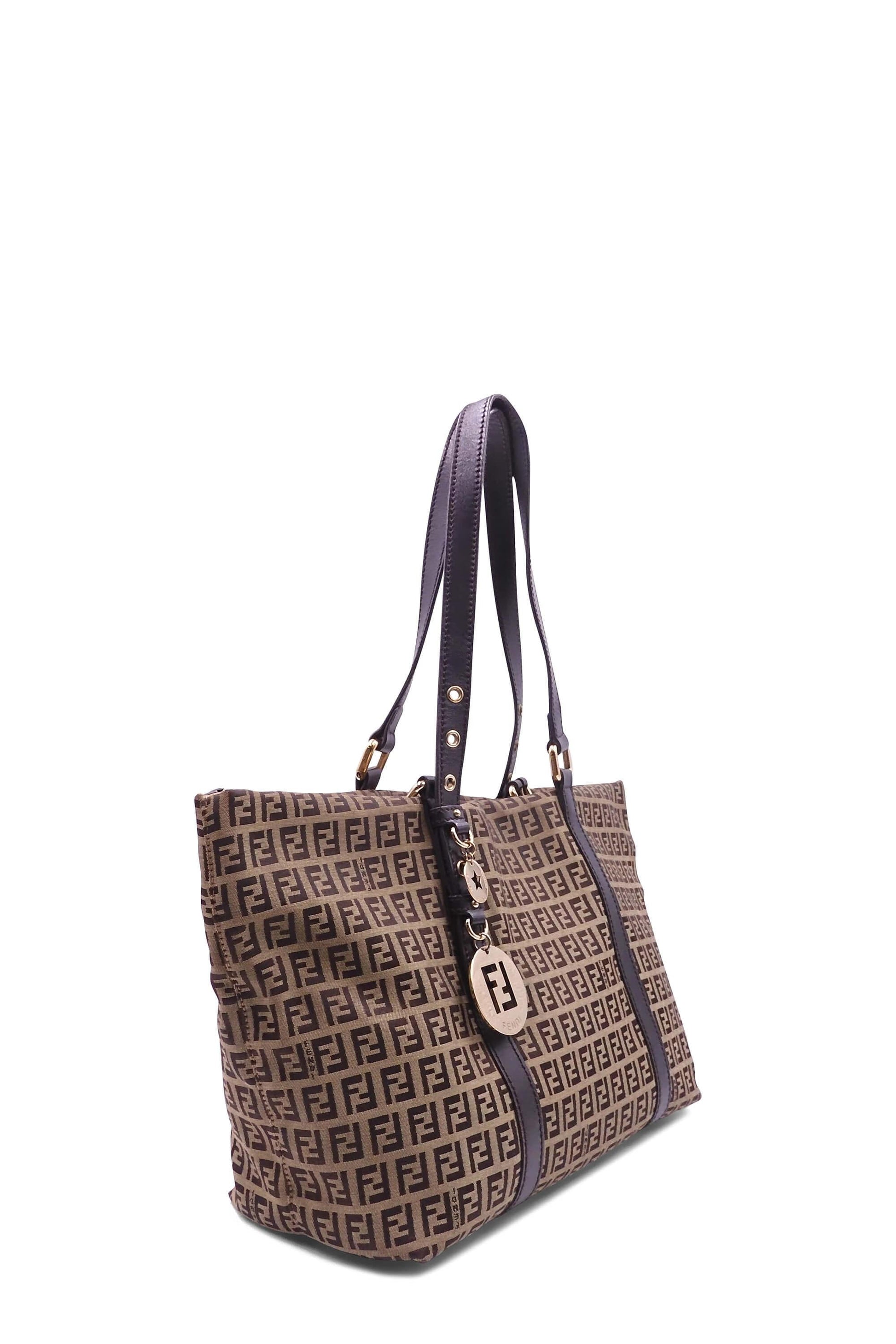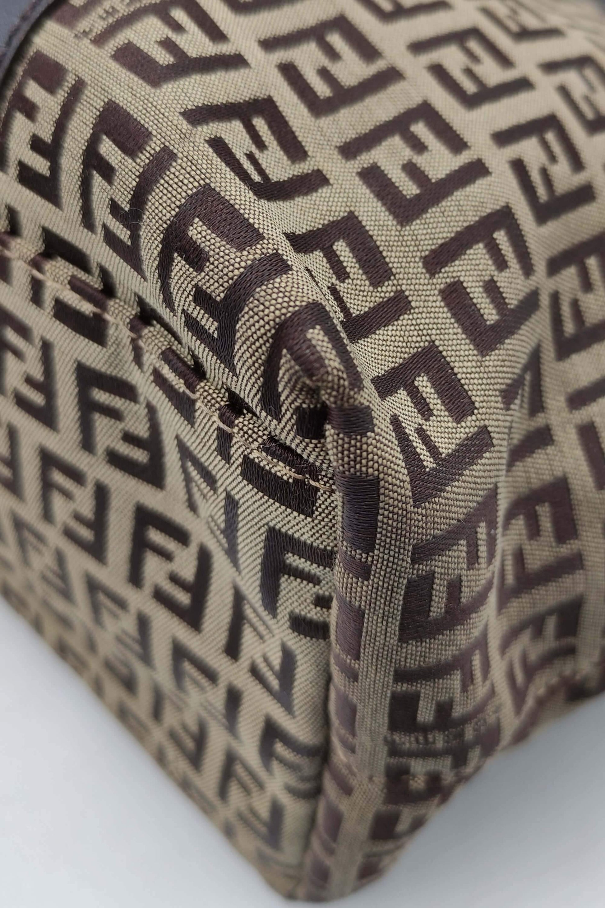 This Fendi Zucchino Shopping Tote is made of brown on khaki Zucchino monogram canvas with brown leather top handles. The top zipper opens to a brown fabric lining with patch pockets