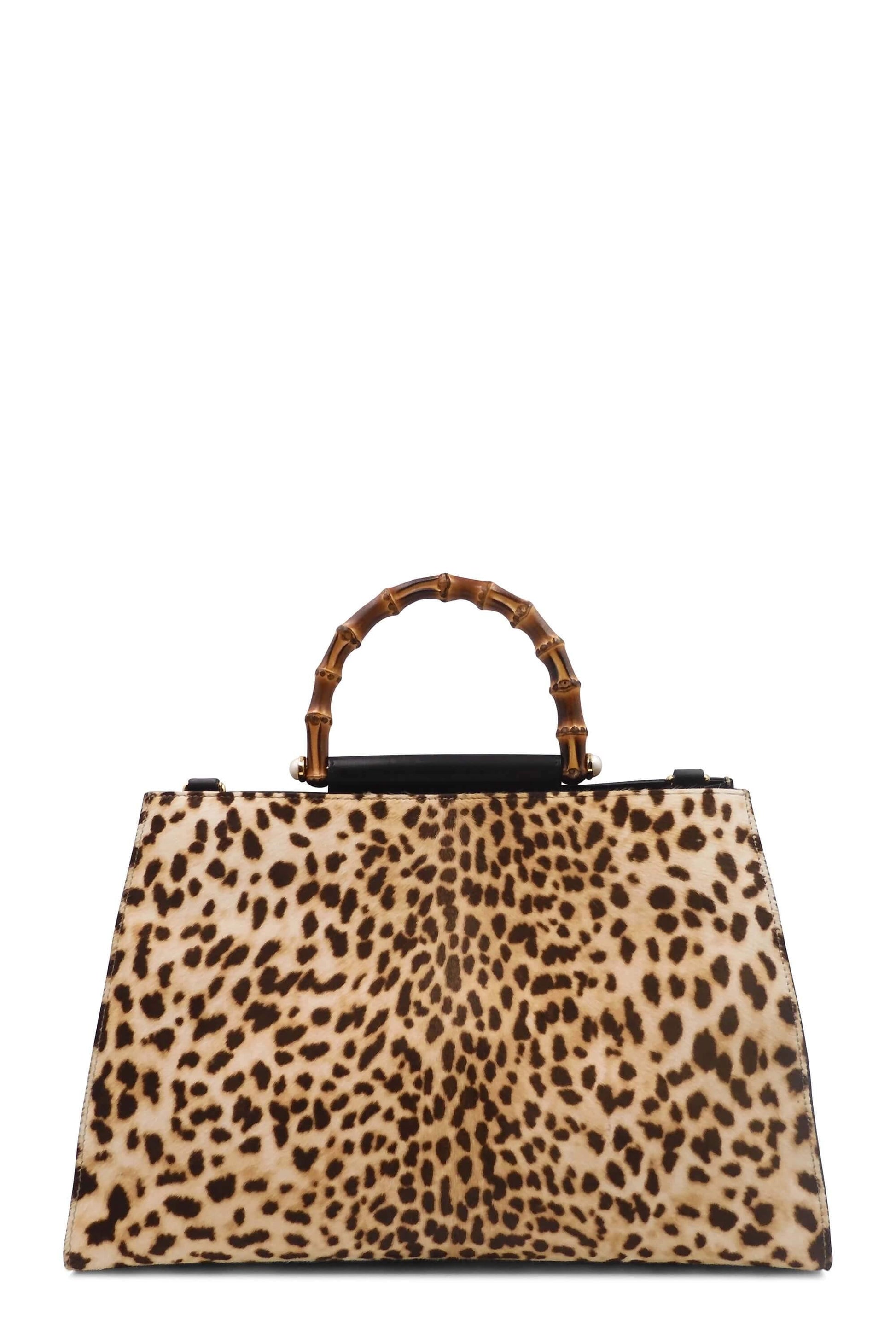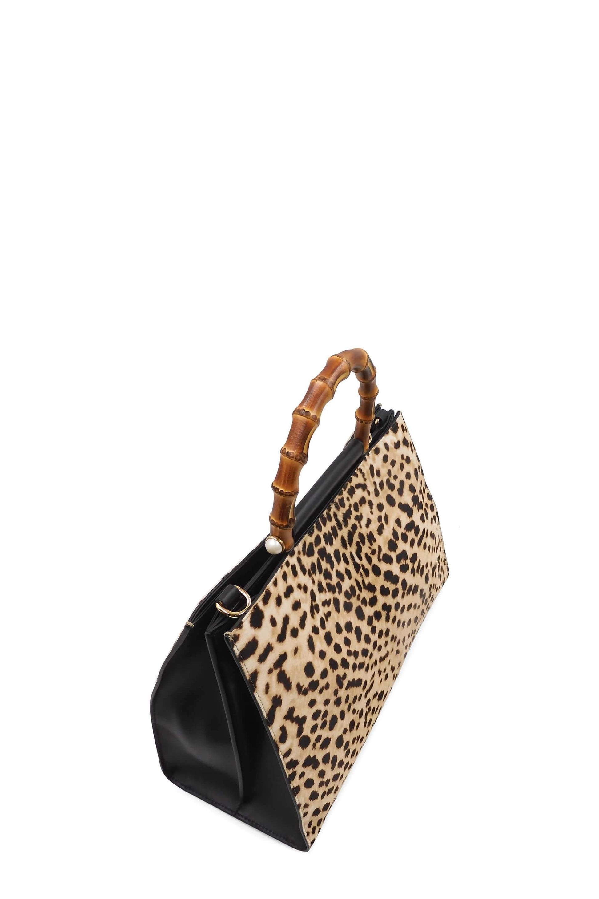 Calf Hair Leopard Nymphae Bamboo Top Handle Bag Black Beige