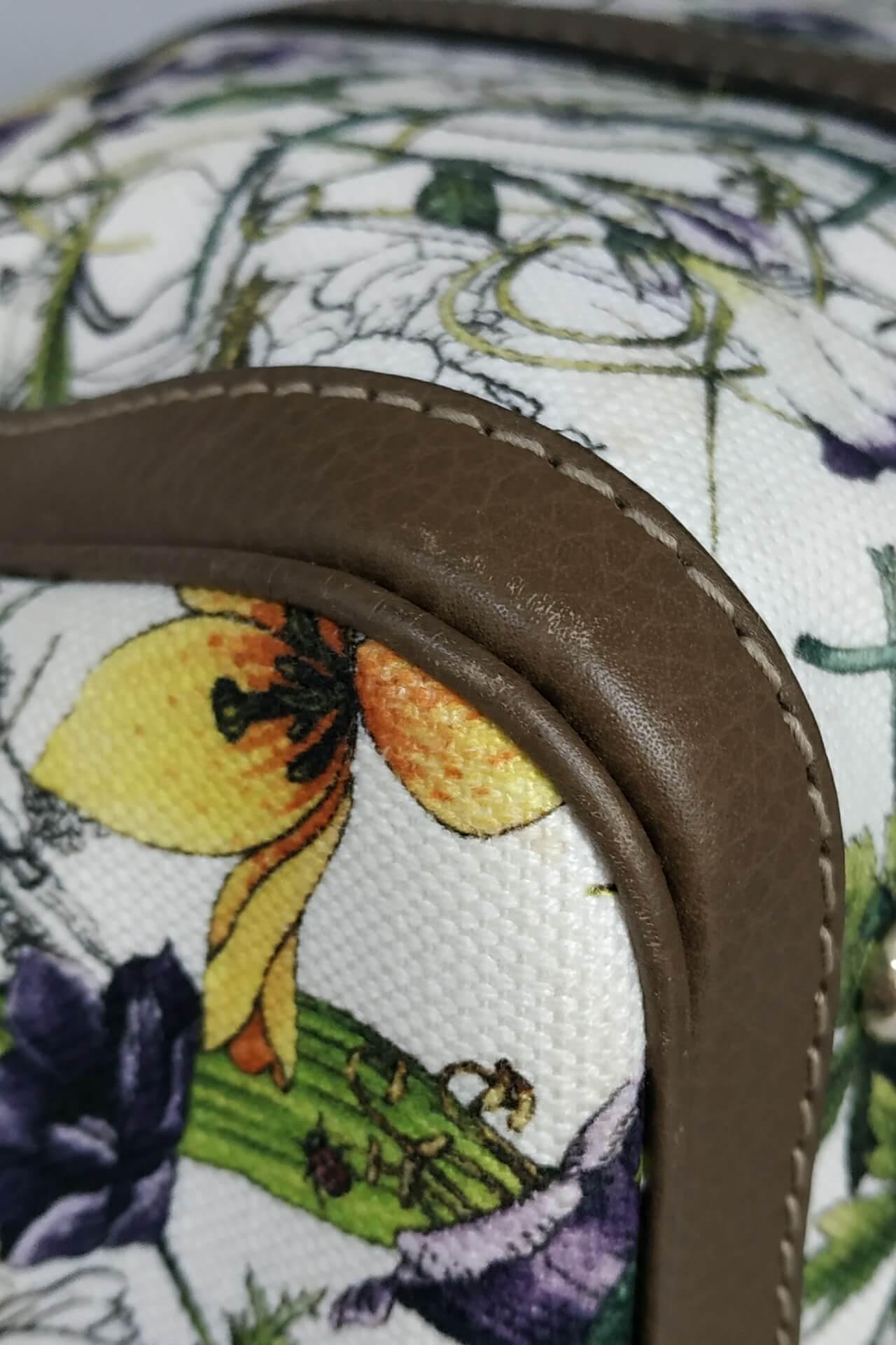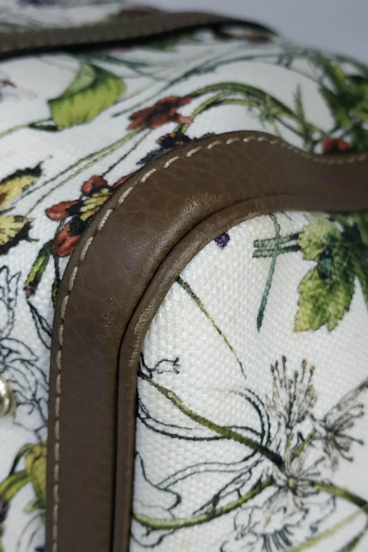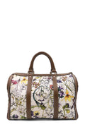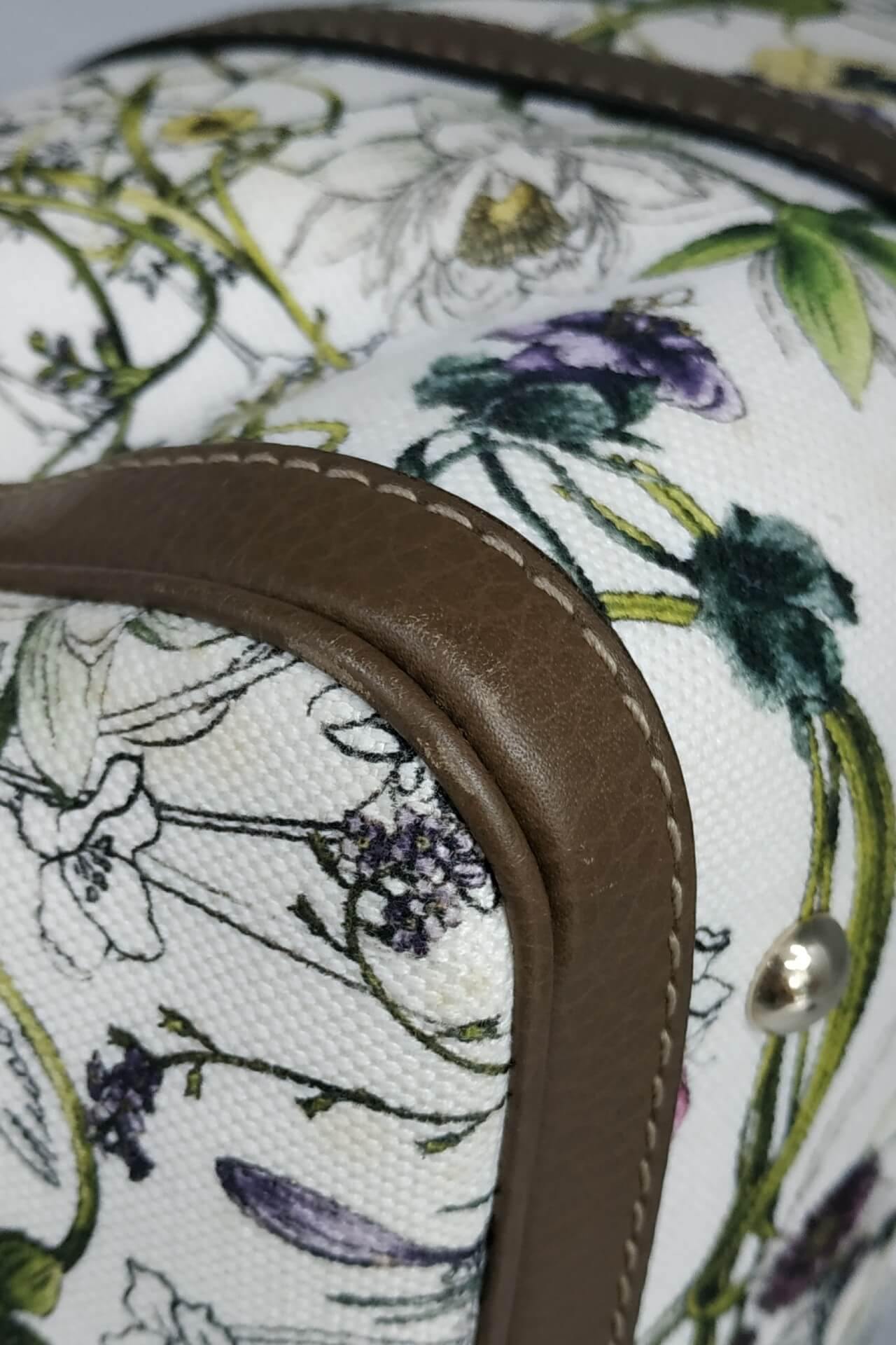 This stylish tote is crafted of off white canvas with a delicate floral print. It features brown leather trim including rolled top handles, an optional shoulder strap, borders and piping with light gold hardware. The top zipper opens to a natural fabric interior with a zipper and patch pocket.