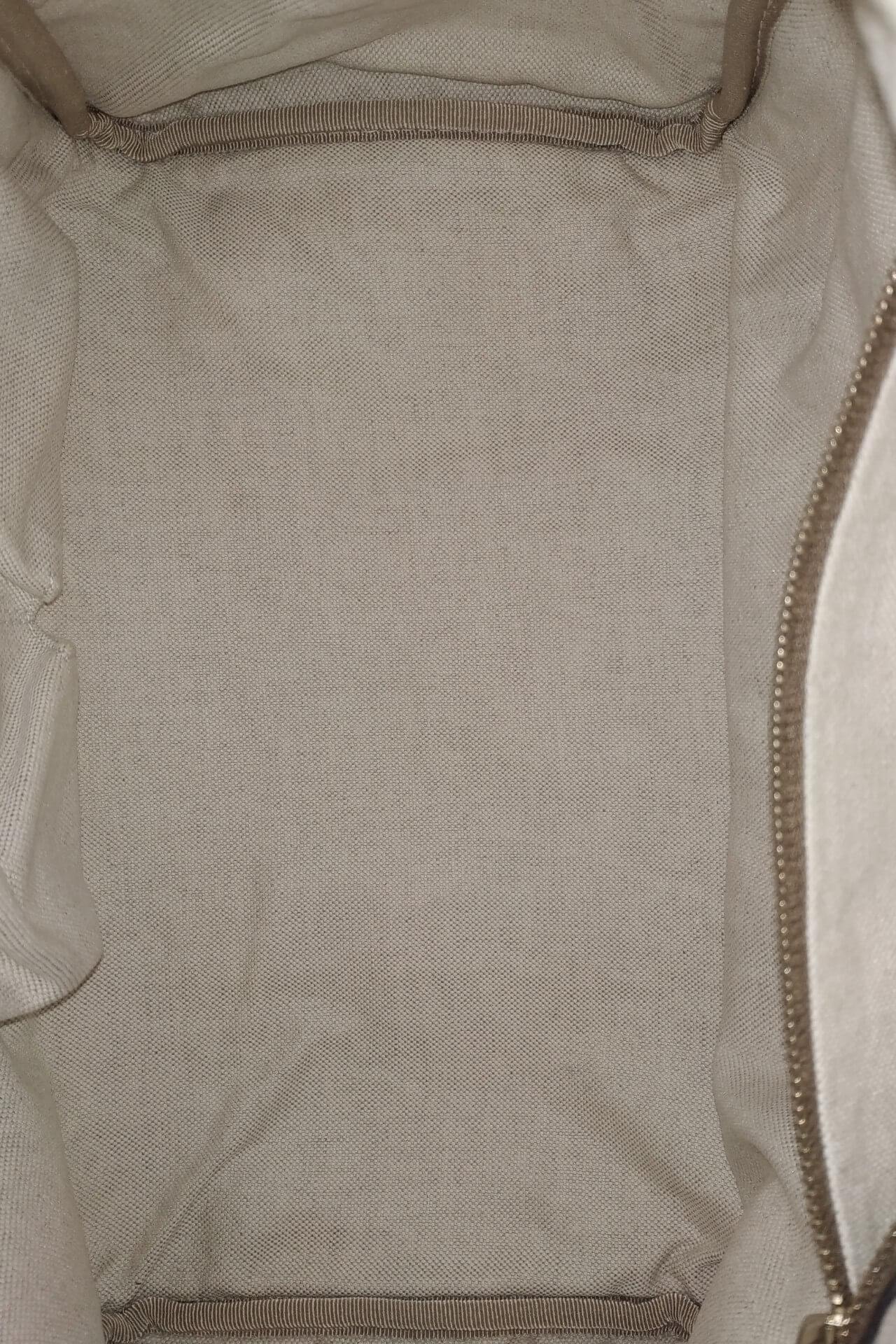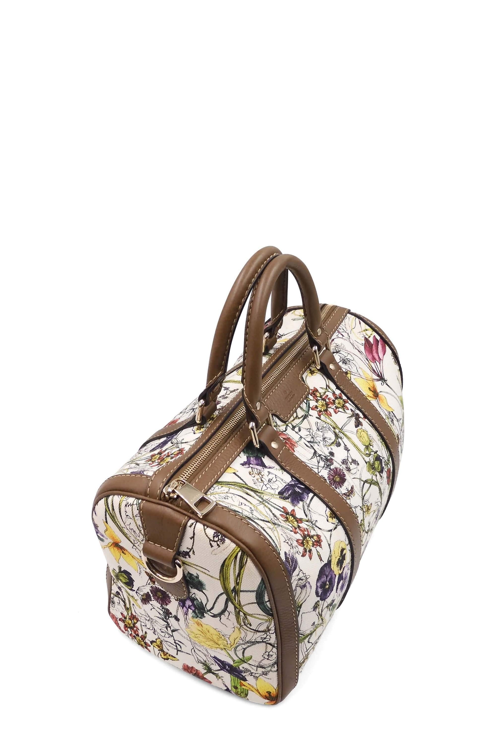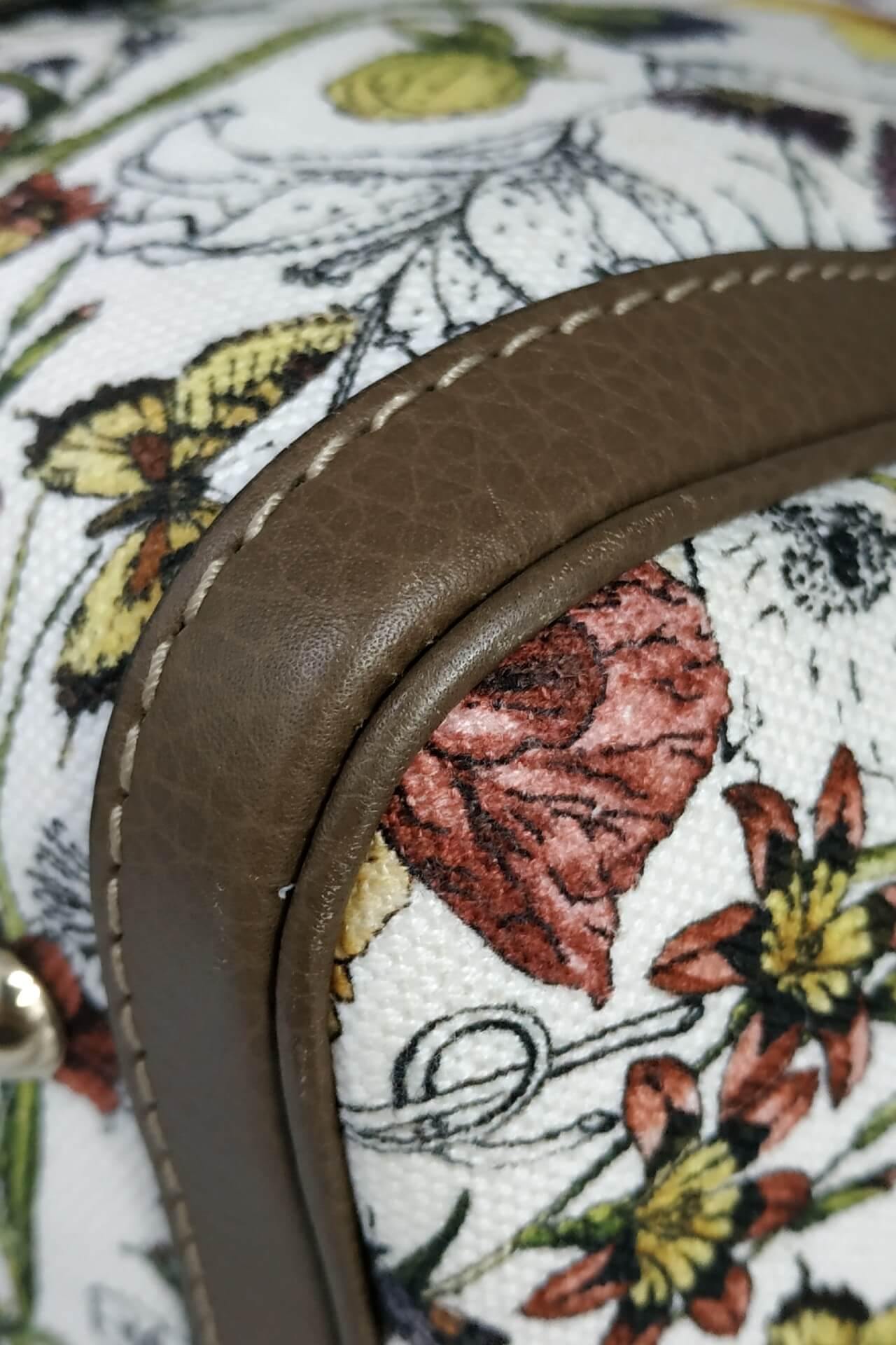 This stylish tote is crafted of off white canvas with a delicate floral print. It features brown leather trim including rolled top handles, an optional shoulder strap, borders and piping with light gold hardware. The top zipper opens to a natural fabric interior with a zipper and patch pocket.