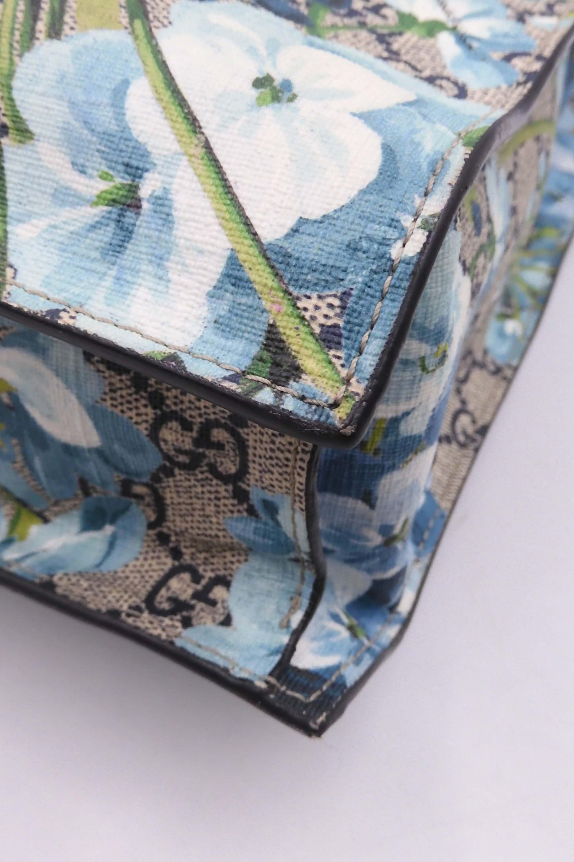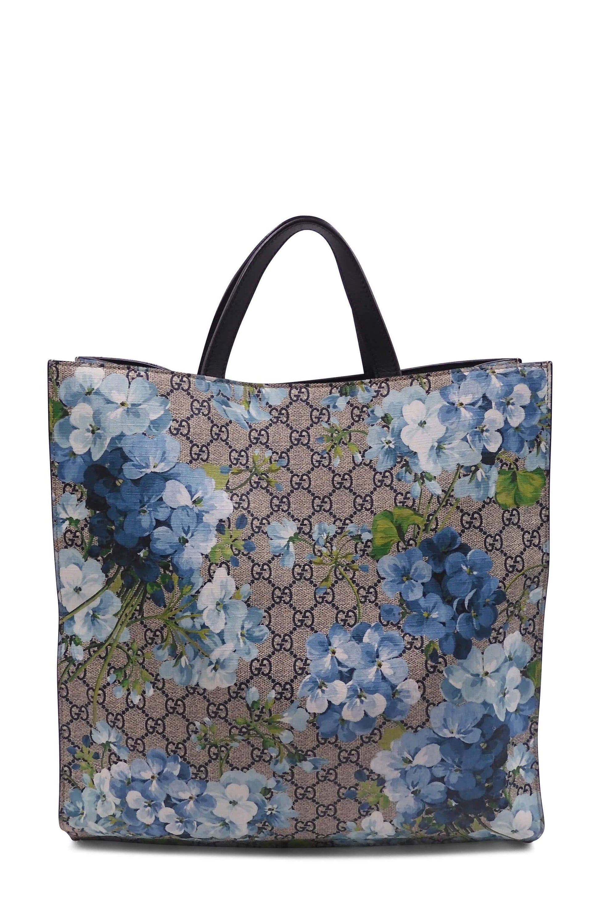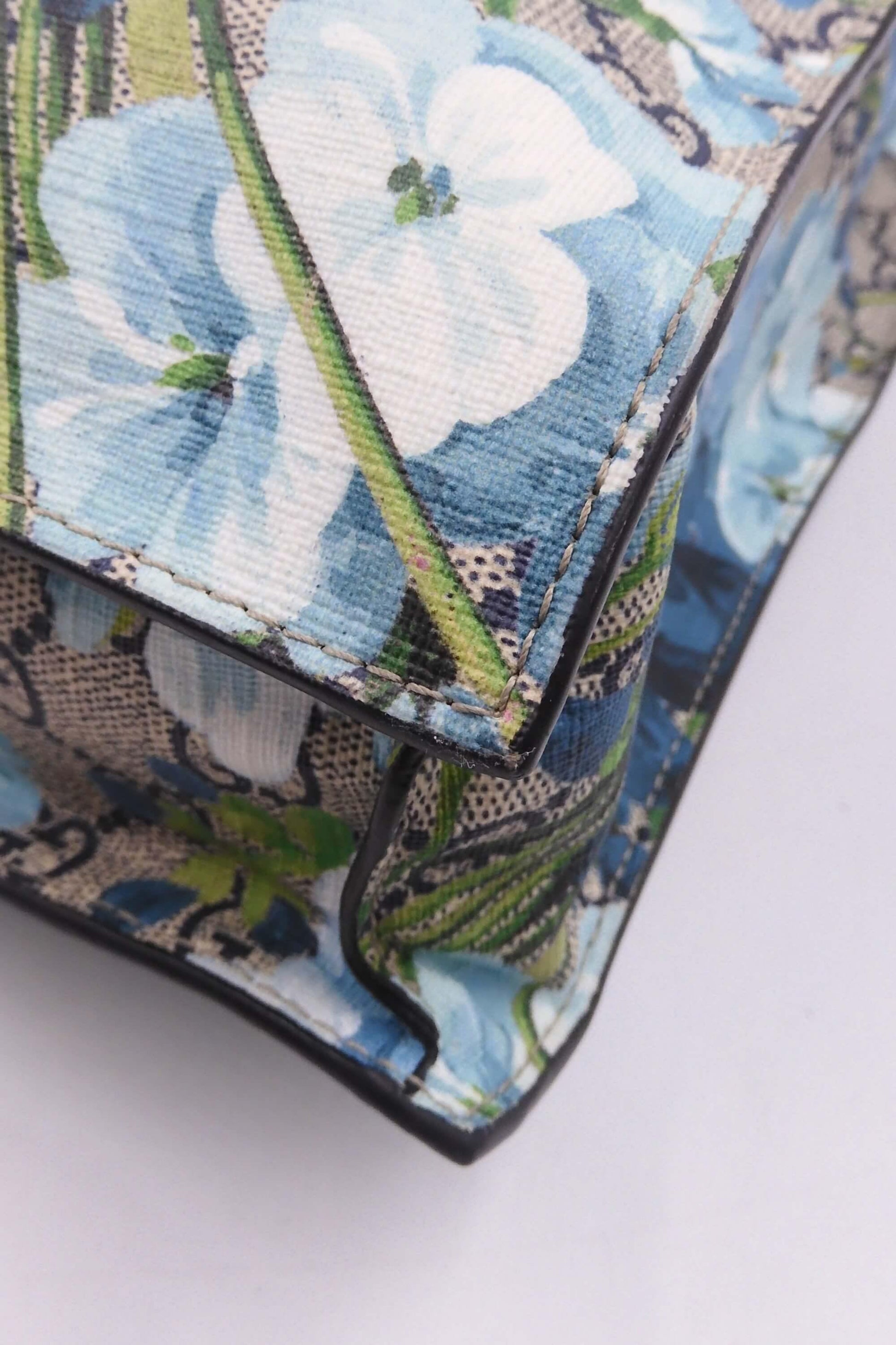 This Gucci Soft Blooms tote is made from GG Soft Blooms printed coated canvas with antique leather and antique hardware. Details include two flat handles, magnetic snap closure, and fully lined interior with two open pockets and one zippered pocket. Carry this style on the forearm, over the shoulder with detachable strap, or folded in half as a clutch. The size guide is approximate and may vary.