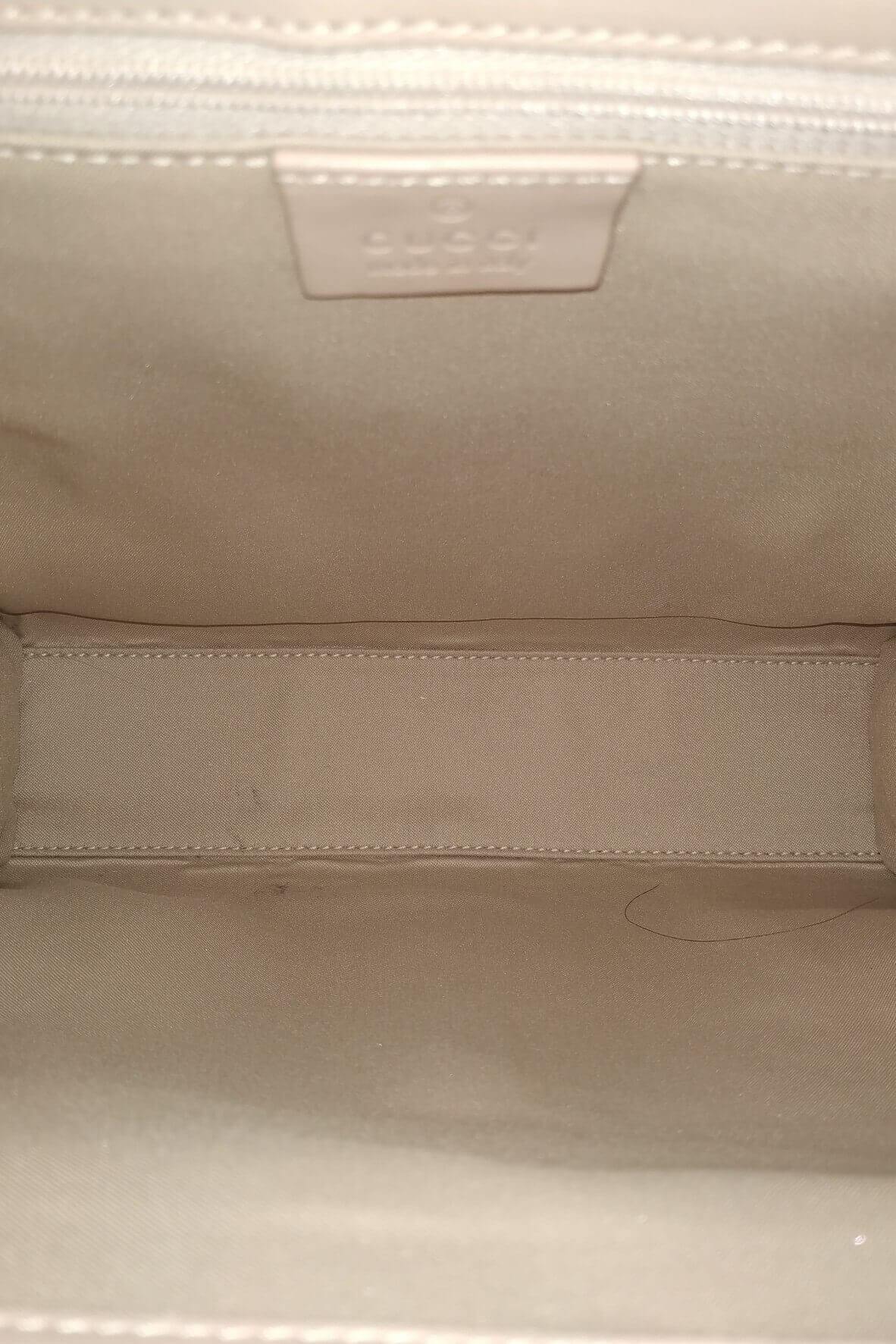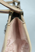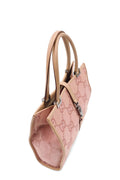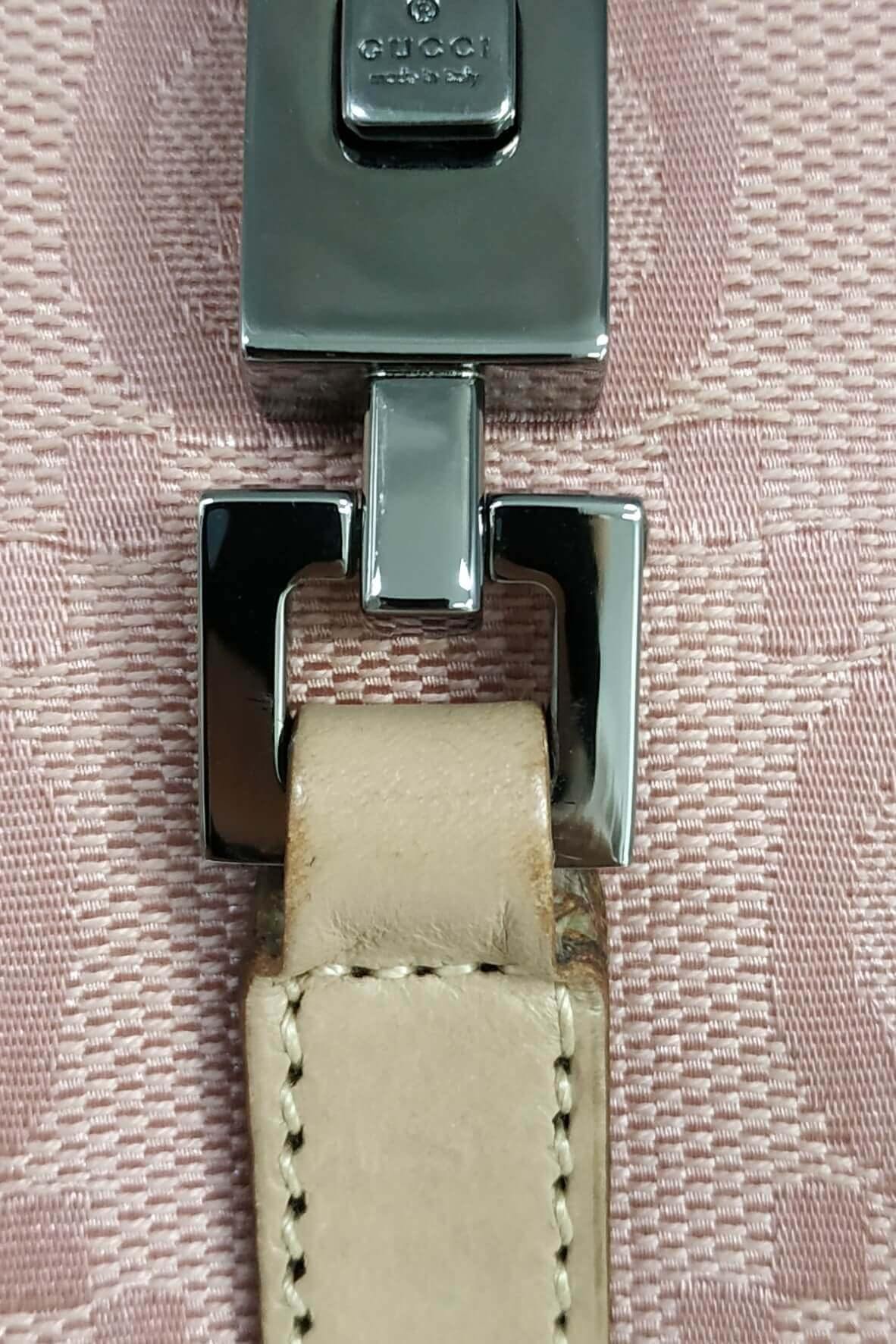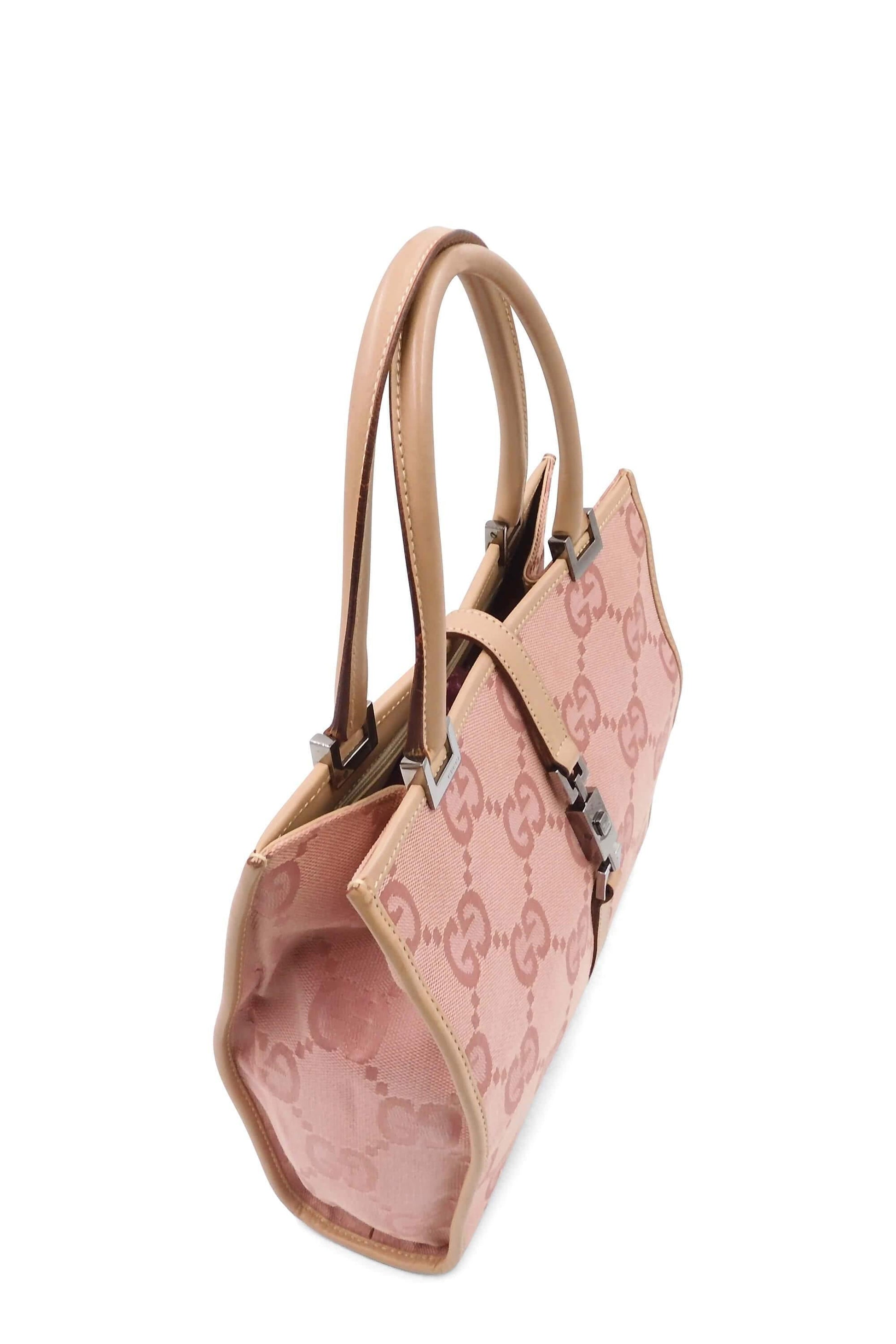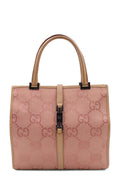 Well-structured and lovely to look at, this mini Jackie tote will perfectly complement your feminine attires. Flaunting a soft pink hue, the bag is crafted with GG canvas and detailed with beige leather trims. It features a lock that unfastens to a fabric interior with a side zip pocket. Held by dual top handles, carry this Gucci creation to your Sunday brunches and leisure outings.