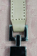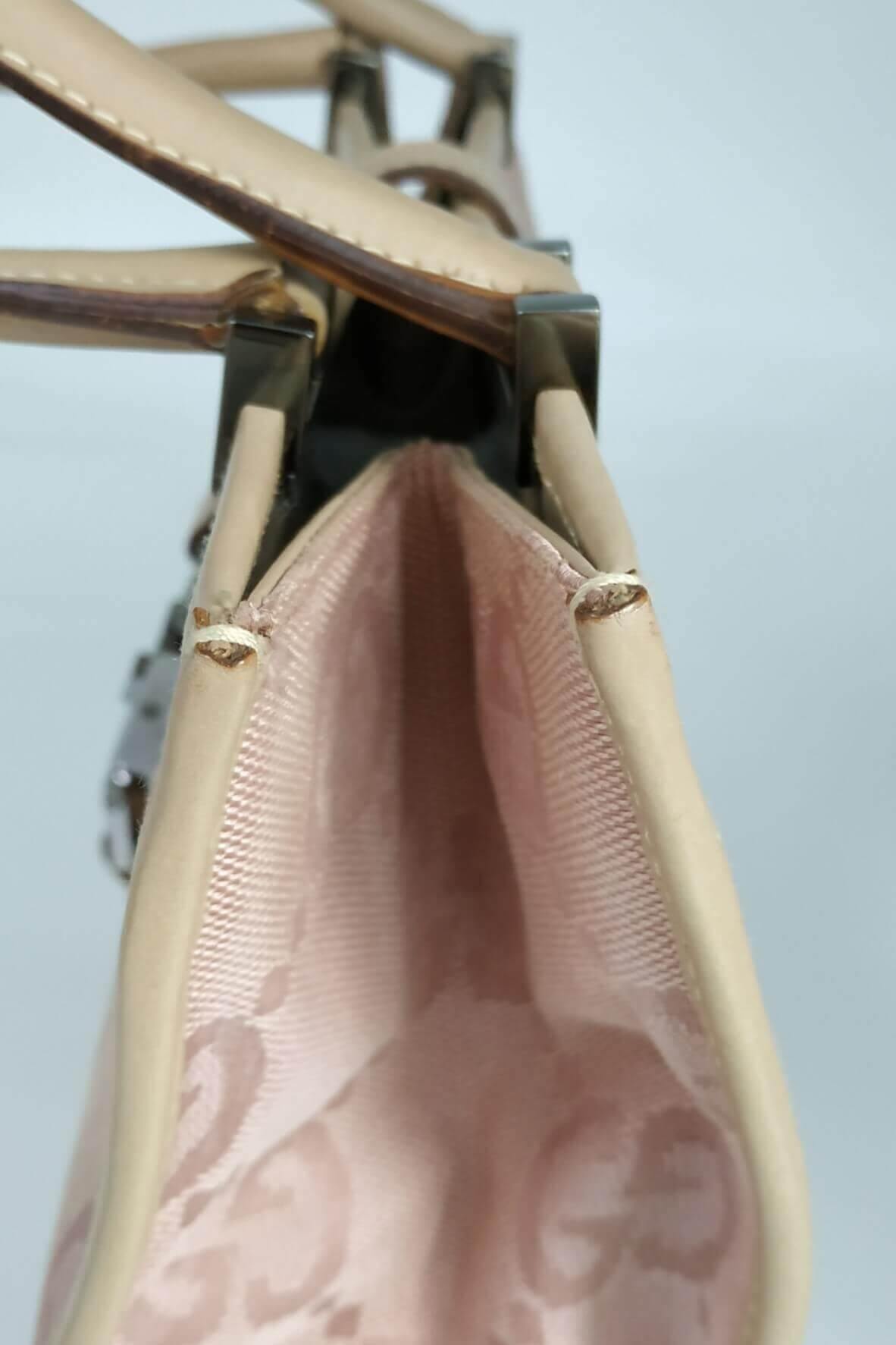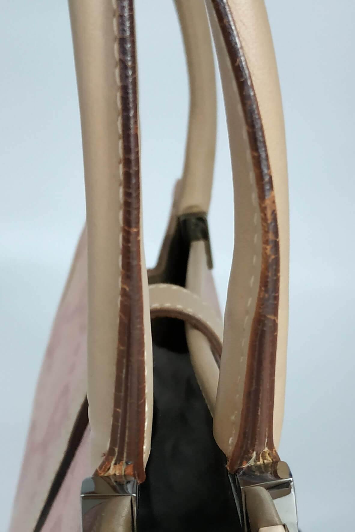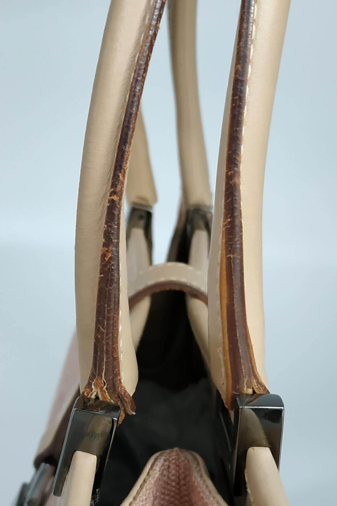 This item has visible stains on both the exterior and interior. Small patch of yellow stain and the leather of the strap has a small part that is peeling. Handle edging look worn.