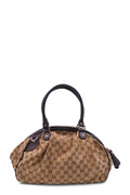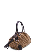 This Gucci GG Canvas Sukey Boston Bag is made of classic brown on beige GG monogram canvas. It’s exterior is designed with an optional shoulder strap, rolled leather handles and polished gold-tone hardware. The top zipper opens to a brown fabric interior with a zipper pocket.