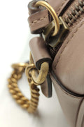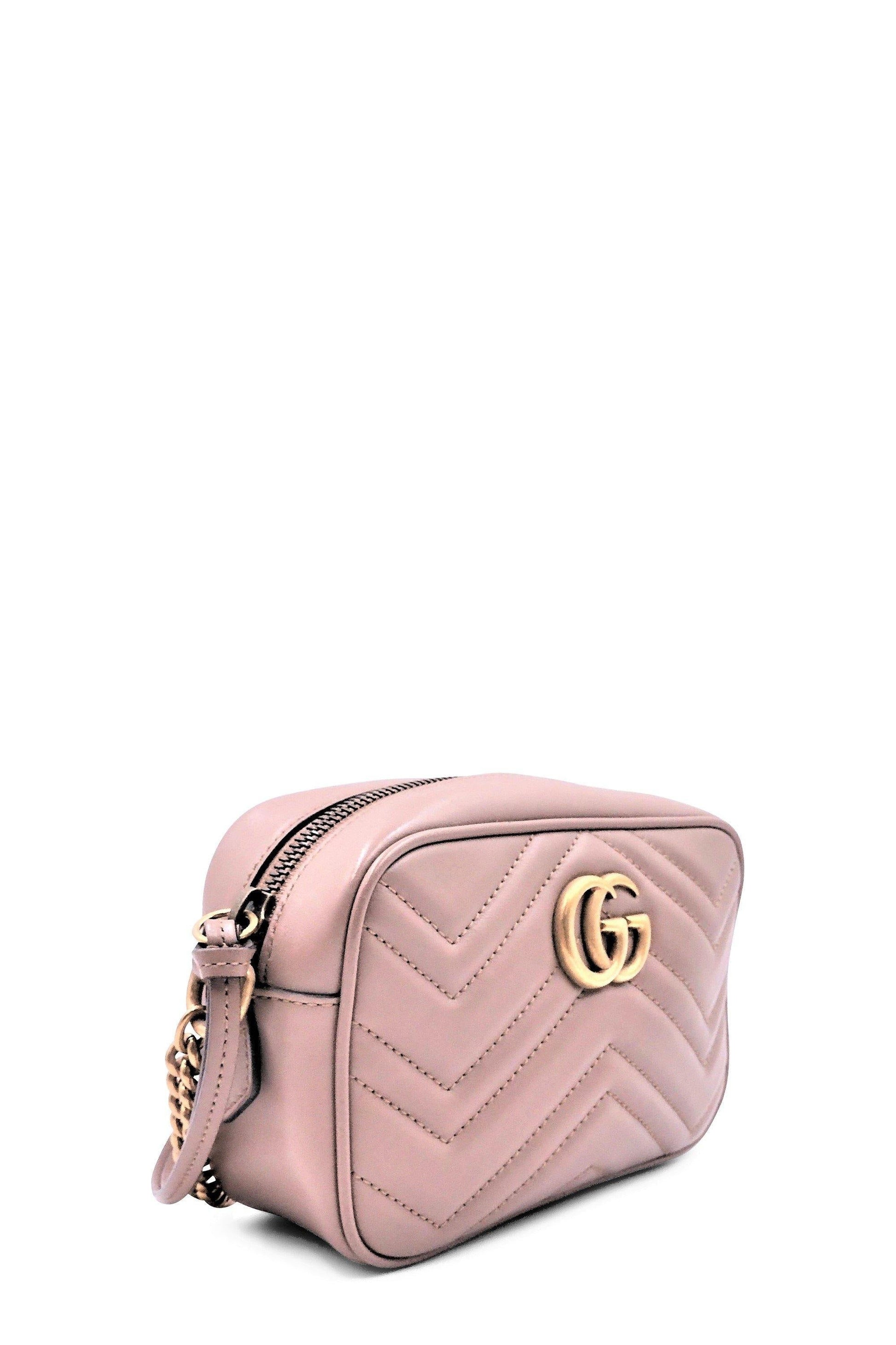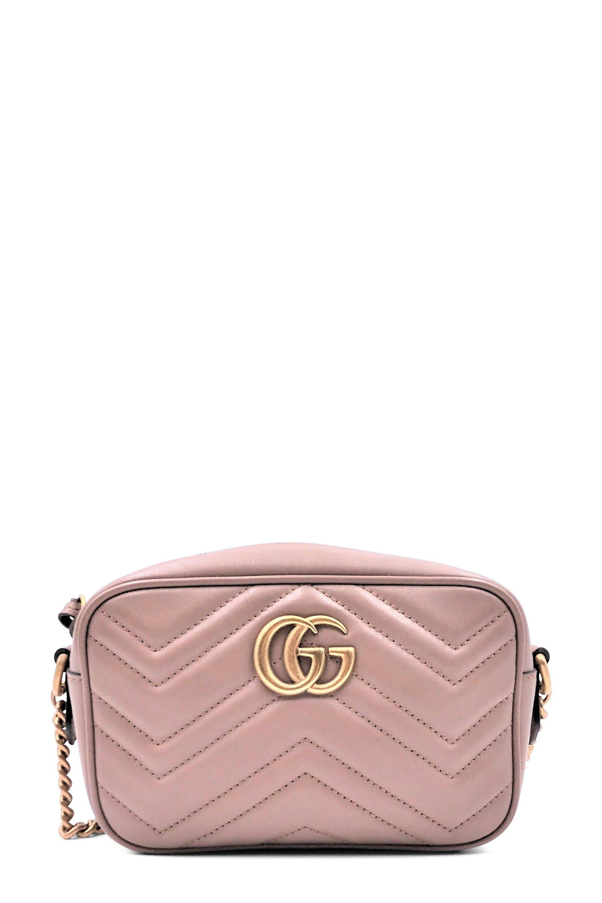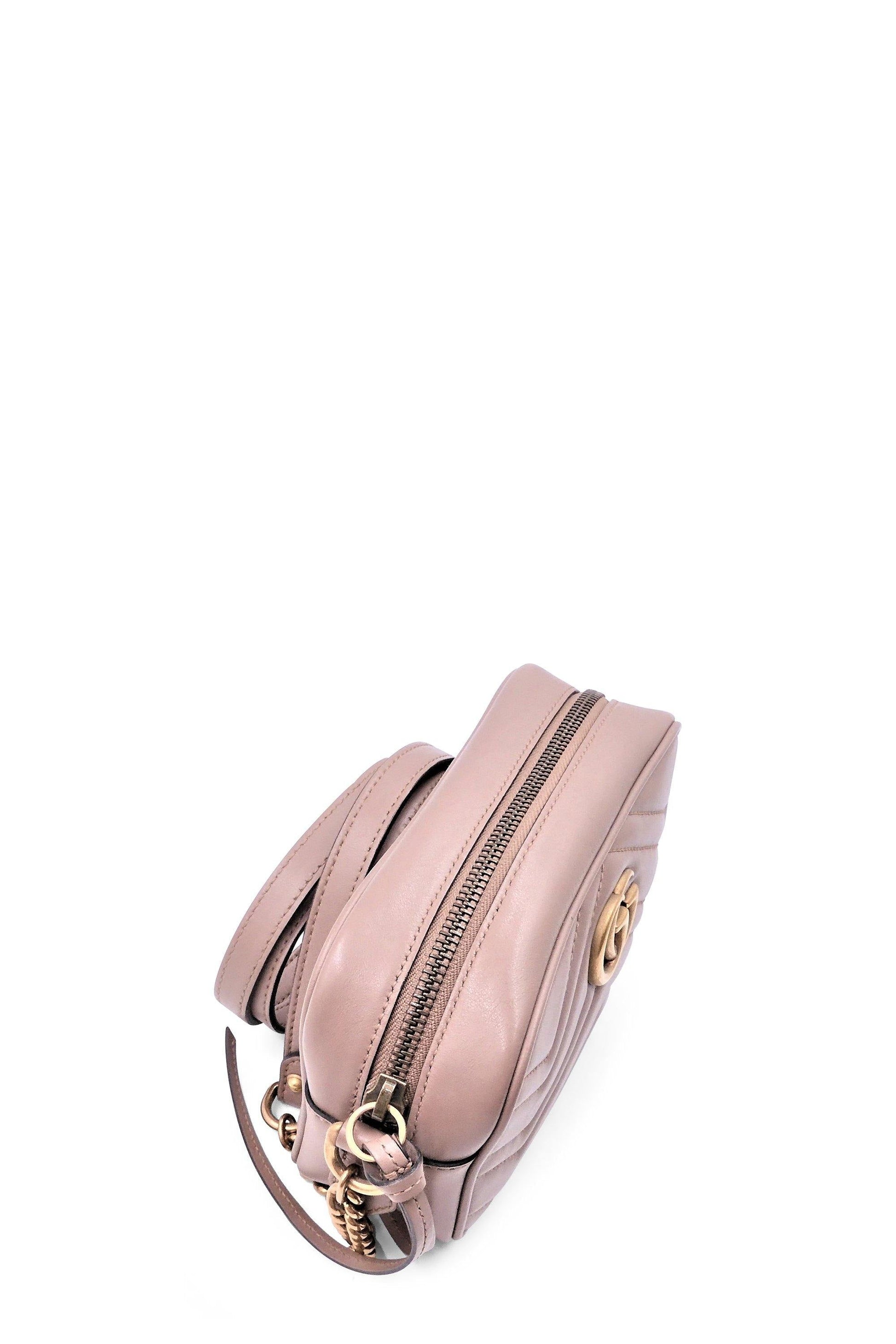 The mini GG Marmont chain shoulder bag has a softly structured shape and a zip top closure with Double G hardware. The chain strap has a leather shoulder detail. Made in matelassé leather with a chevron design and GG on the back. Nude matelassé chevron leather with GG on the back. Antique gold-toned hardware. Double G. Interior open pocket. Chain shoulder strap with 24" drop. Zip top closure. The size guide is approximate and may vary.