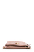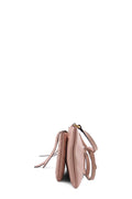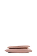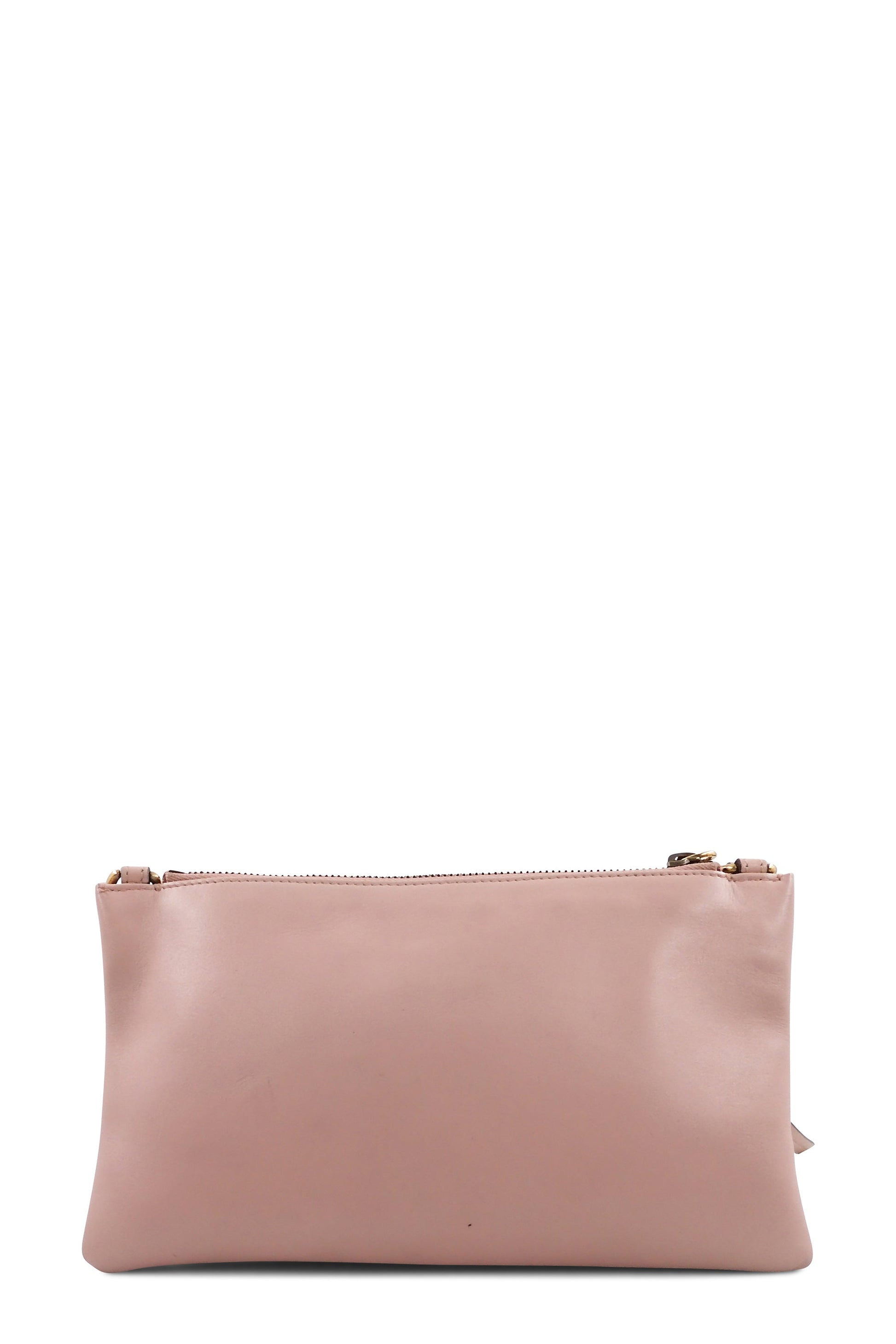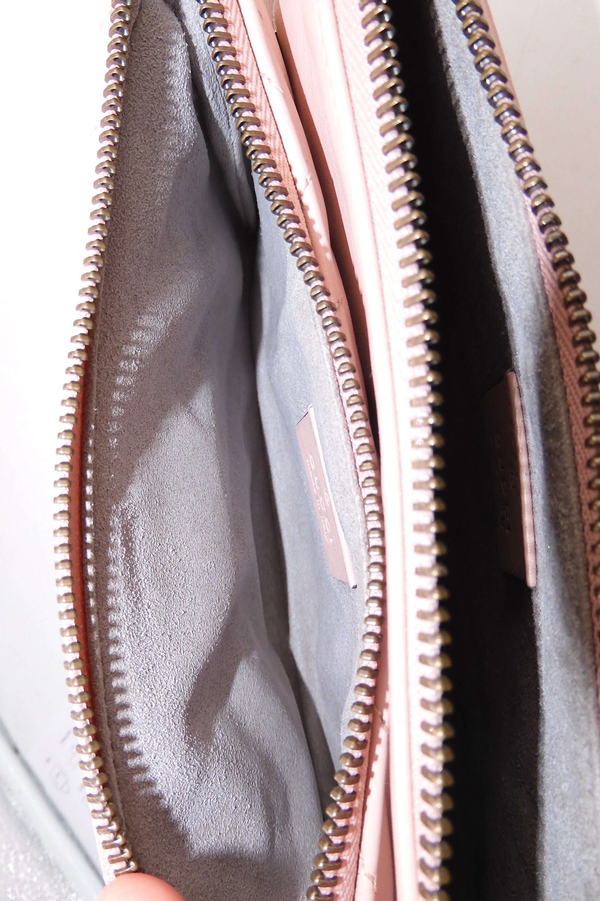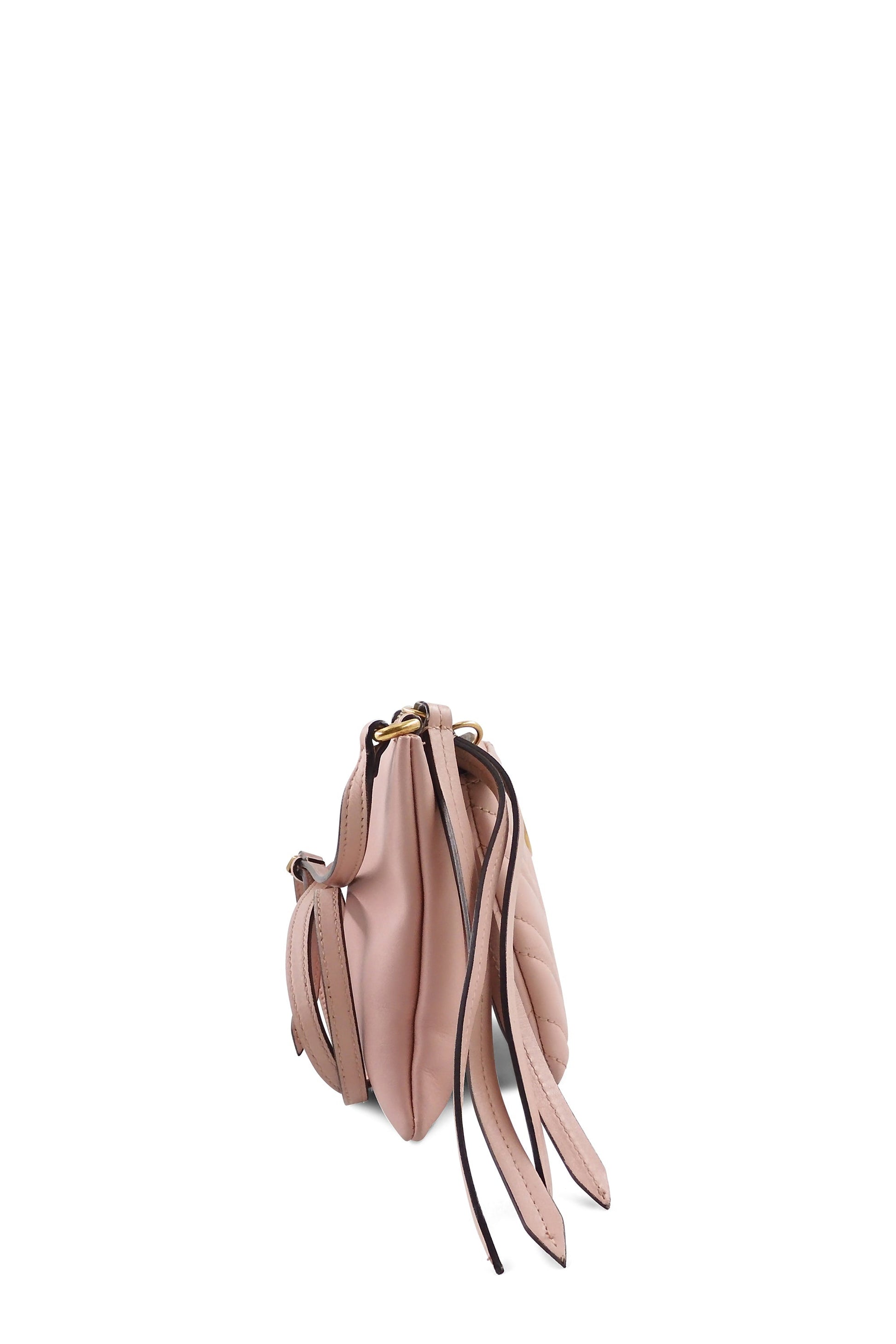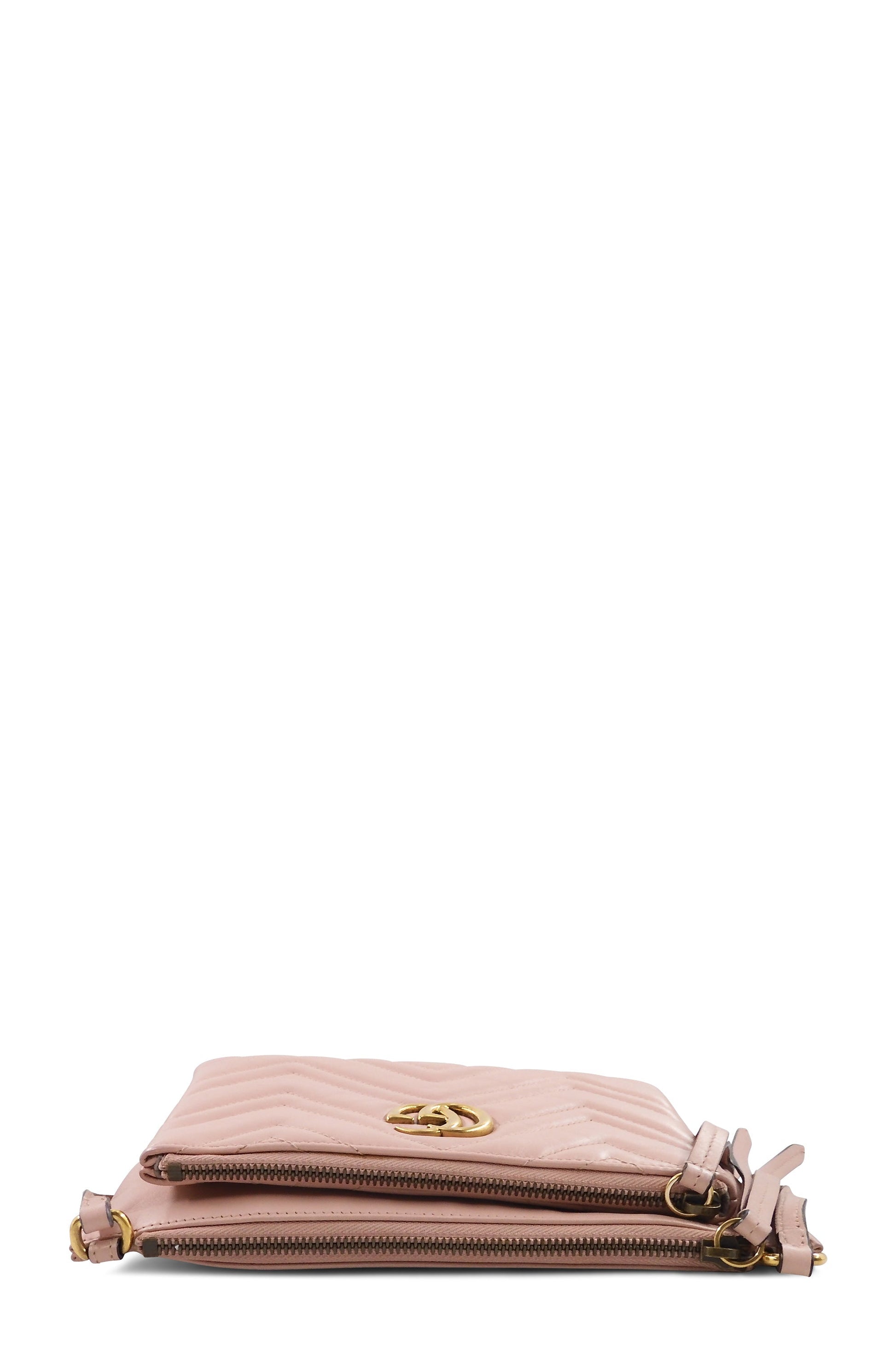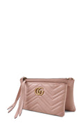 Pink leather Gucci GG Marmont Matelassé Pouch with gold-tone hardware, single flat adjustable shoulder strap, detachable pouch with GG logo embellishment at front face, grey suede lining and zip closures at top. The size guide is approximate and may vary.