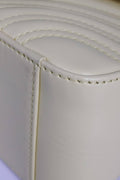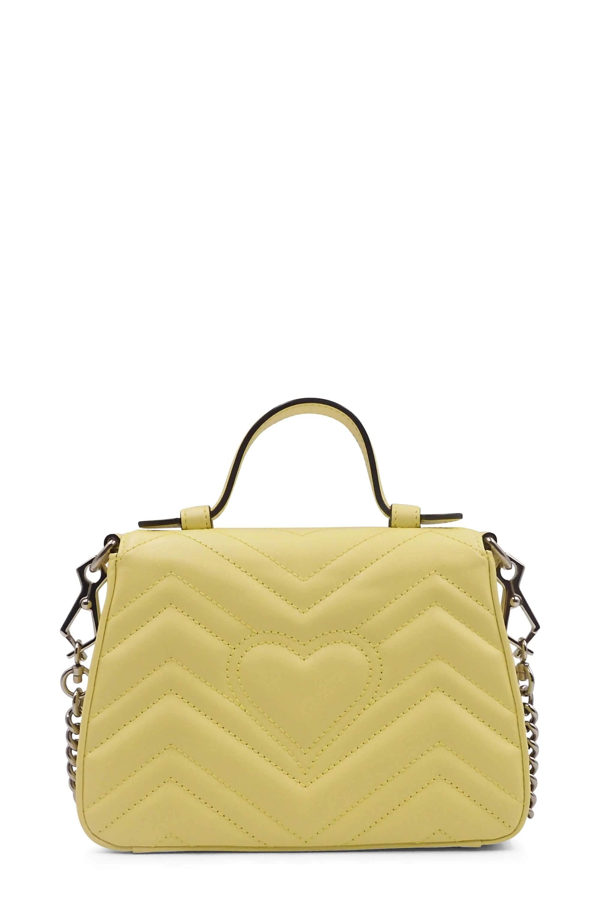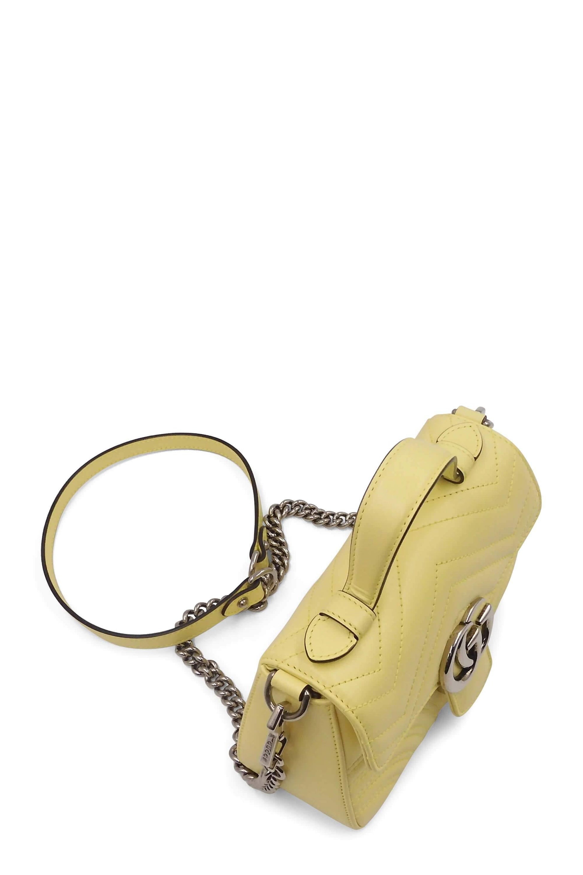 The mini GG Marmont top handle bag has a softly structured shape and an oversized flap closure with Double G hardware. Equipped with a leather top handle and chain shoulder strap, made in matelassé chevron leather with a heart on the back. The exterior is crafted with calfskin leather in pastel yellow and suede for the interior.