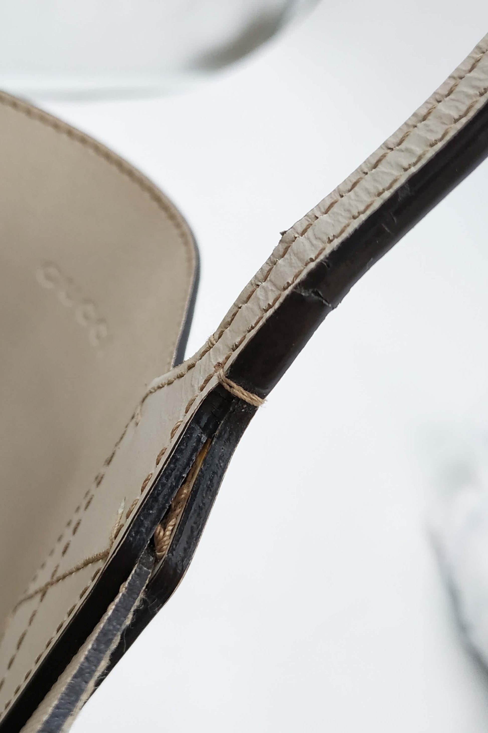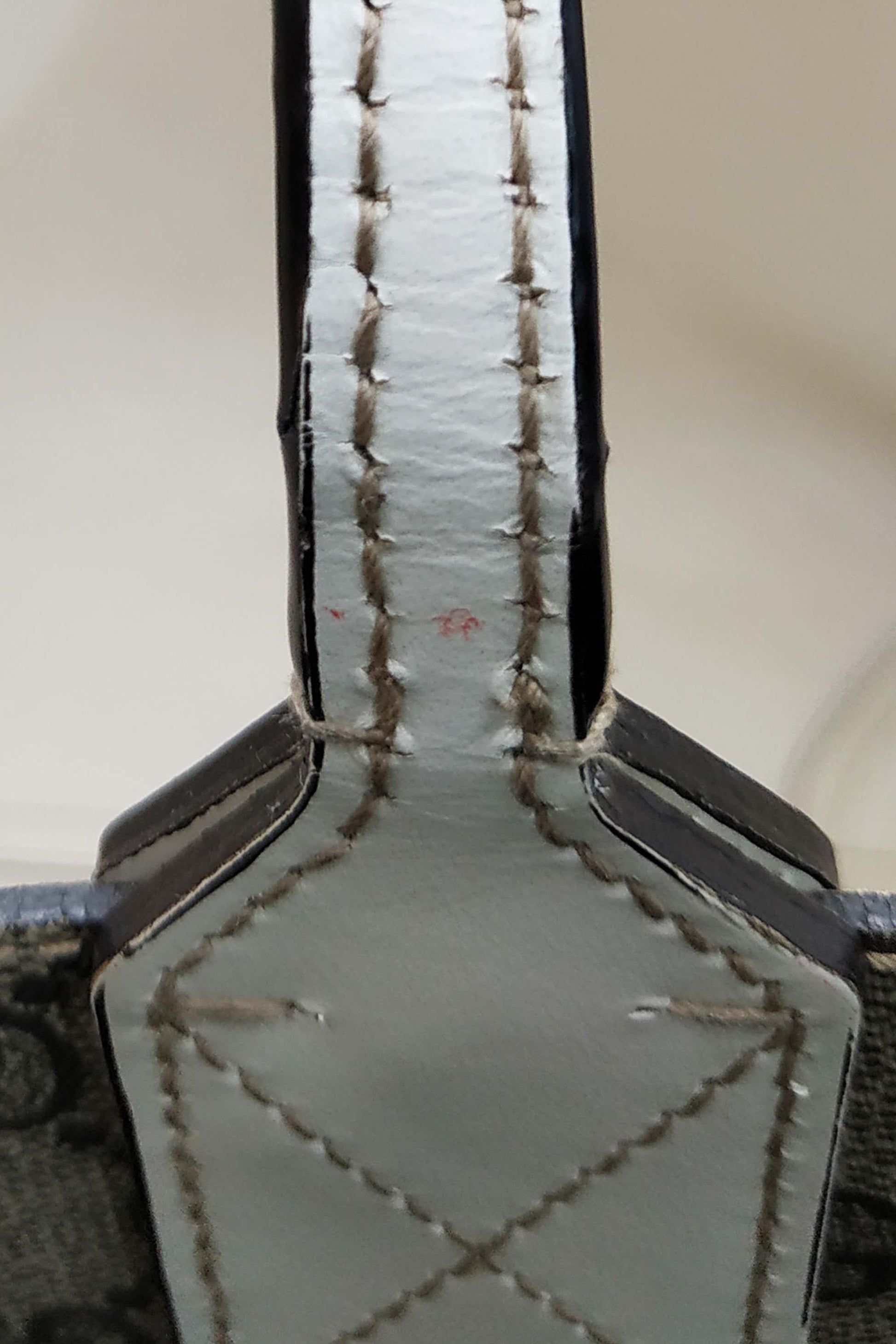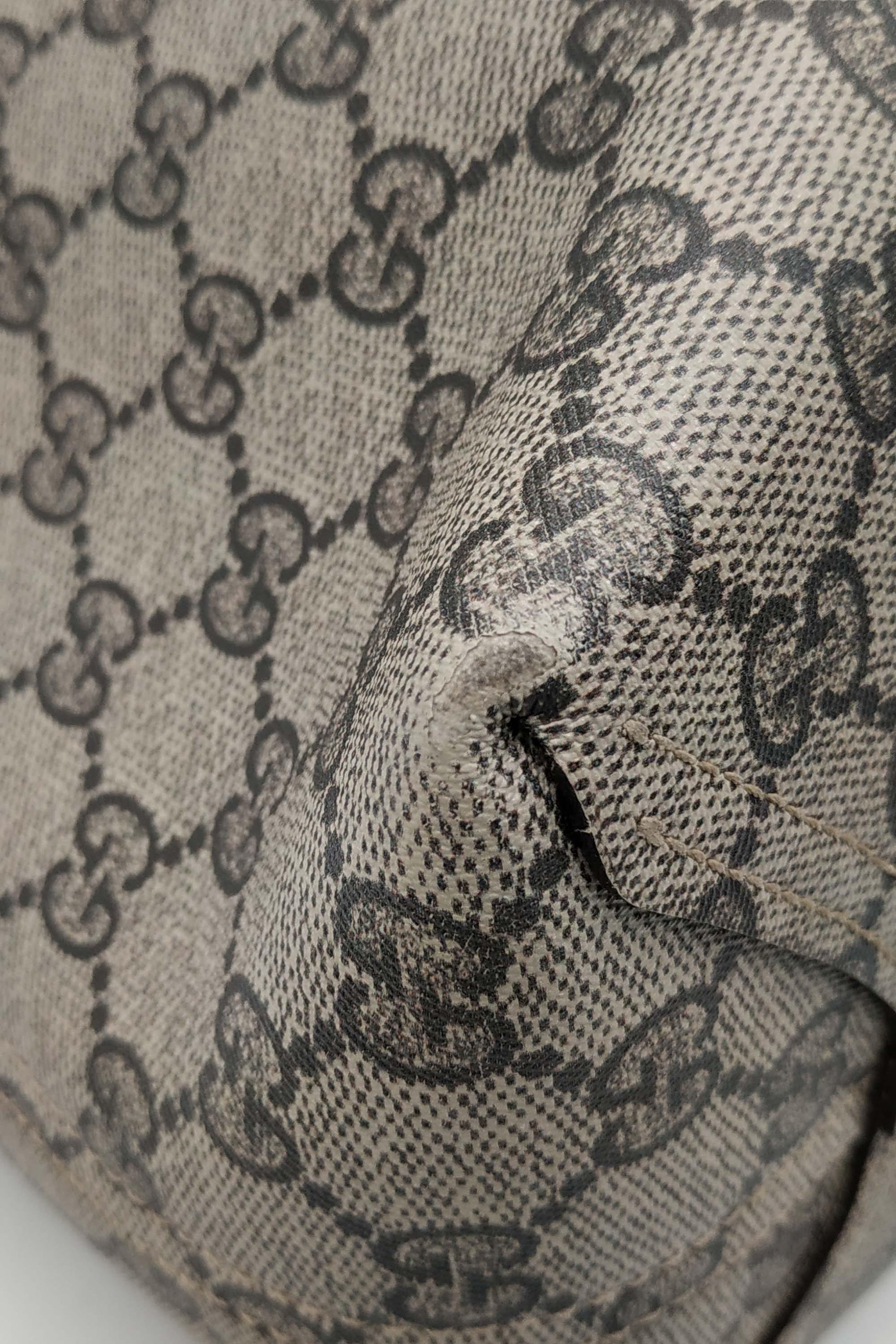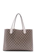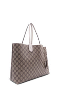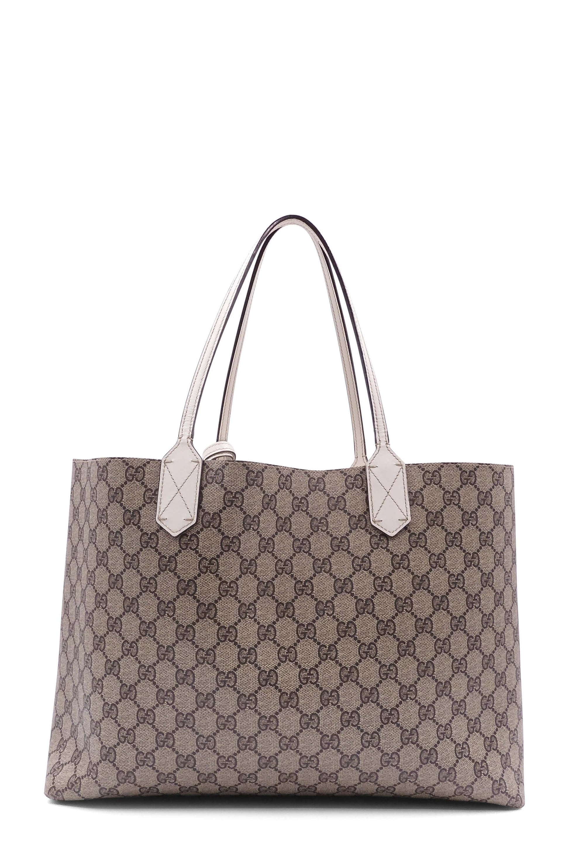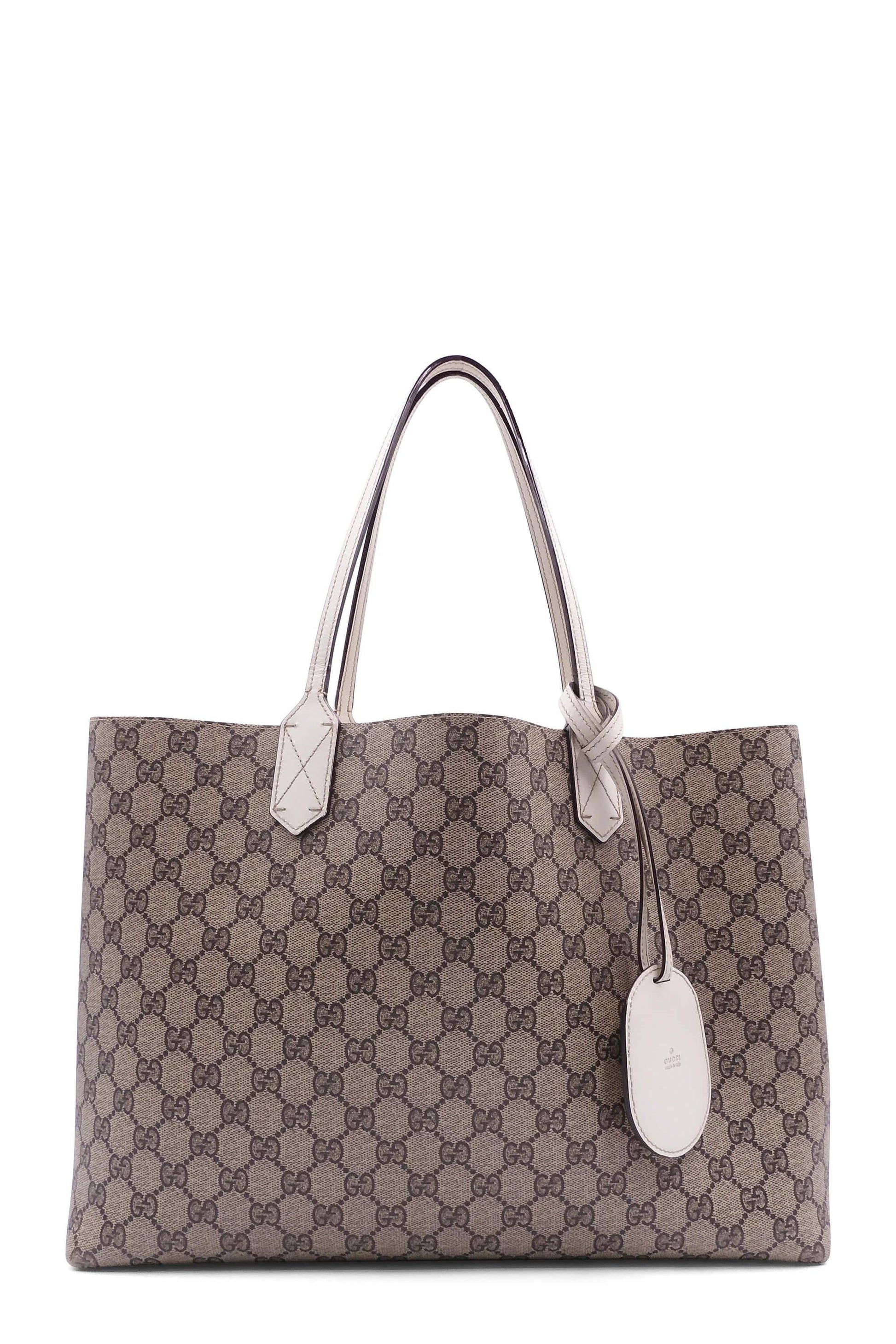 This stylish tote is crafted of classic Gucci GG monogram coated canvas. The shoulder bag features white leather strap top handles. The broad top opens to a reversible white textured calfskin interior that is spacious enough for your daytime essentials with the sophisticated style of Gucci.