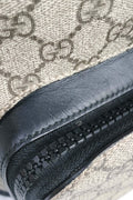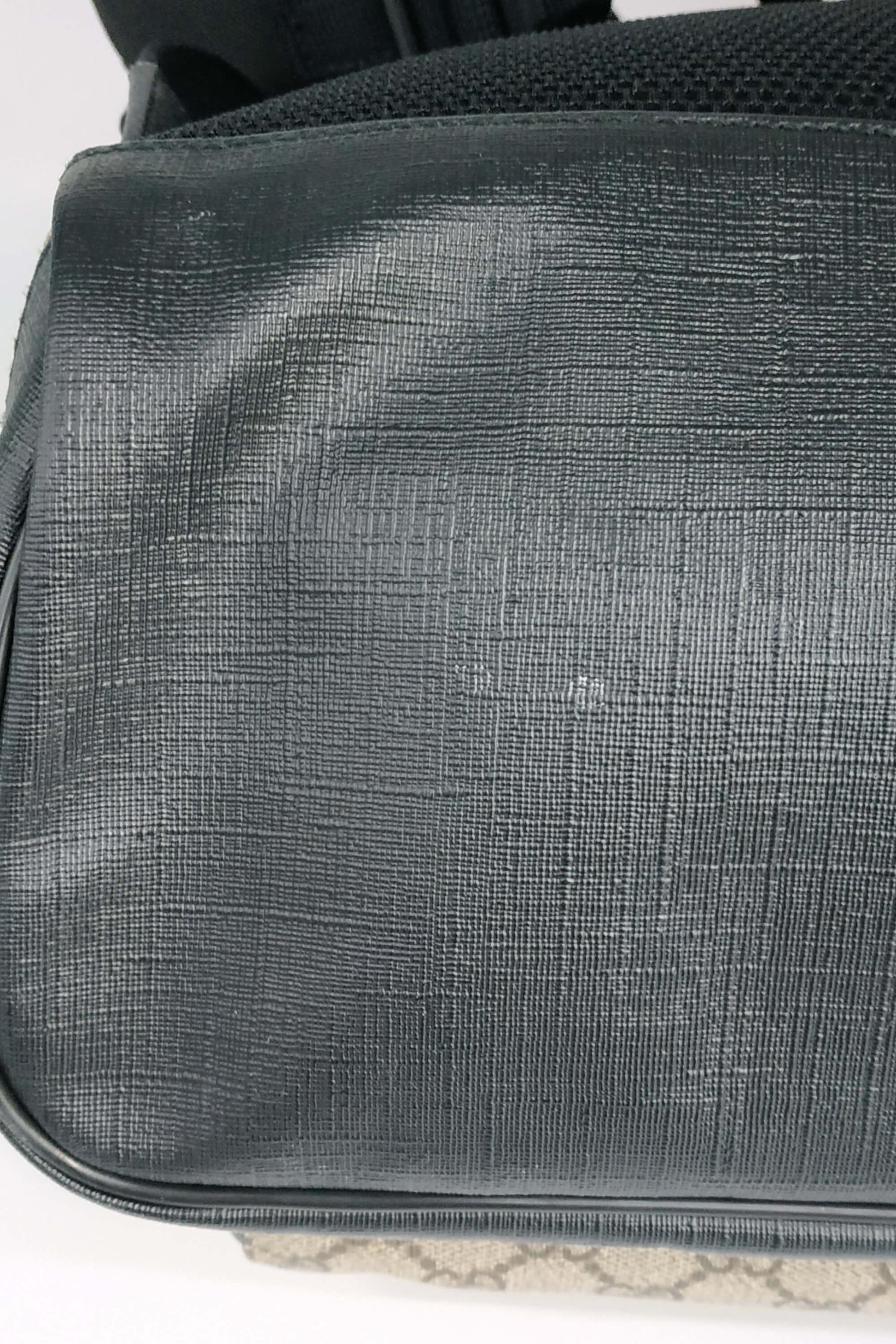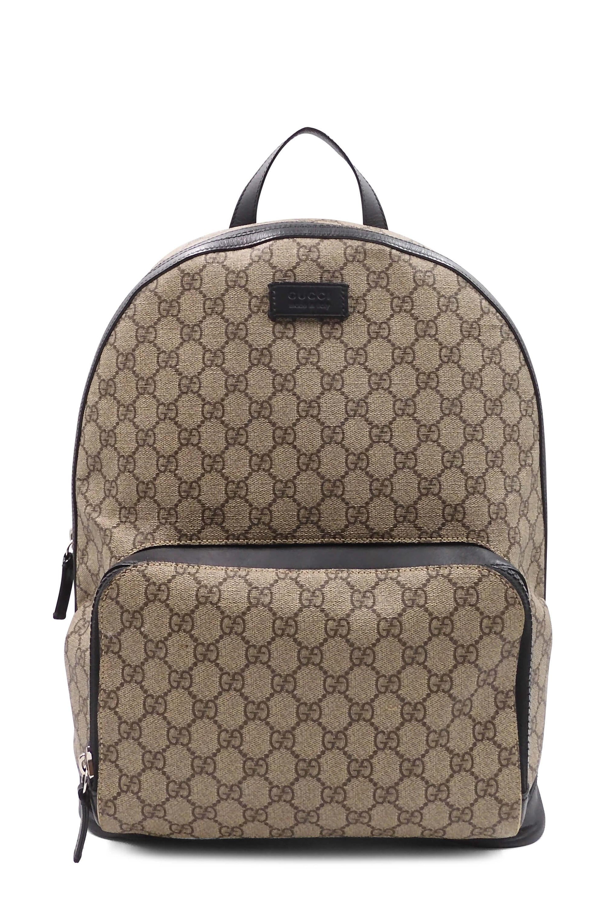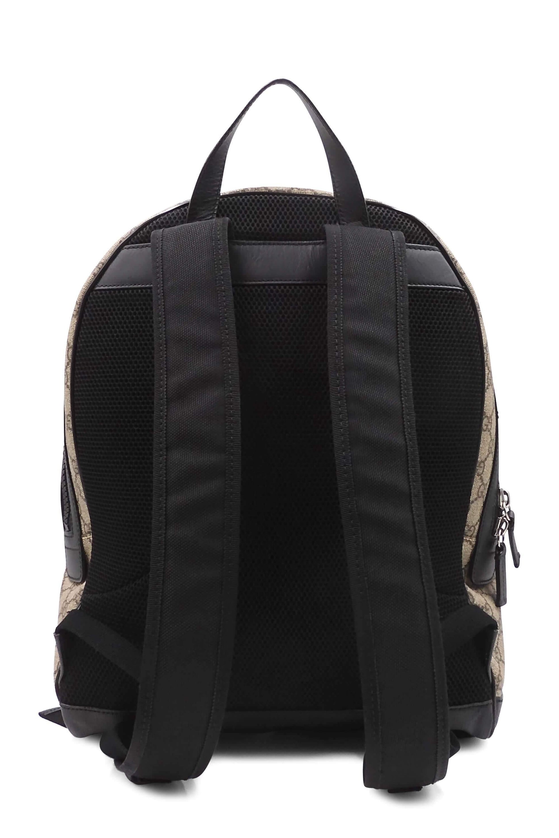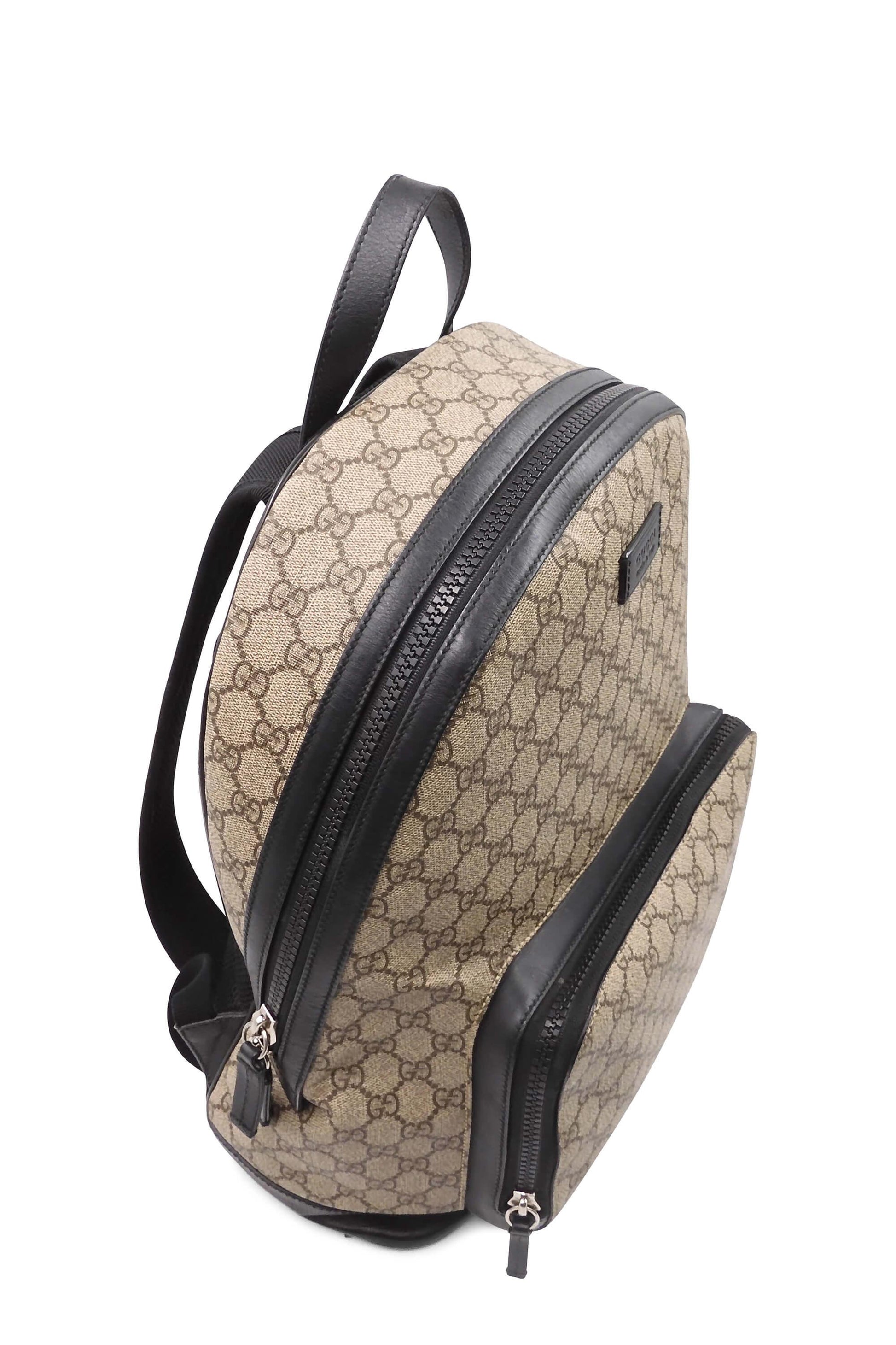 GG Supreme canvas backpack, finished with black leather details. Beige/ebony GG Supreme canvas, a material with low environmental impact. Gucci trademark leather tag detail. Black mesh back. Front zipper pocket. Interior smartphone pockets. Leather handle. Black nylon padded and adjustable shoulder straps. Zipper closure.