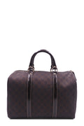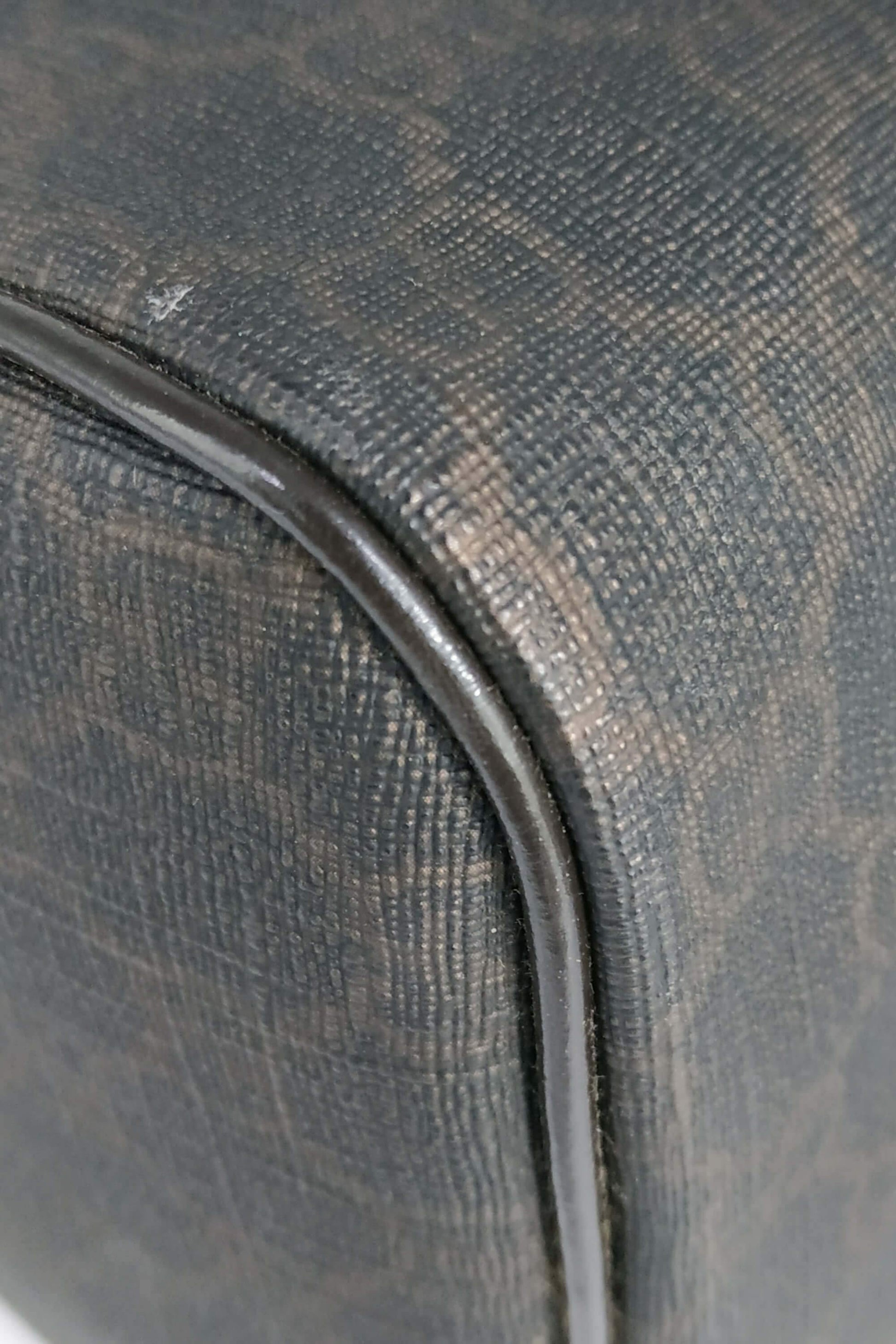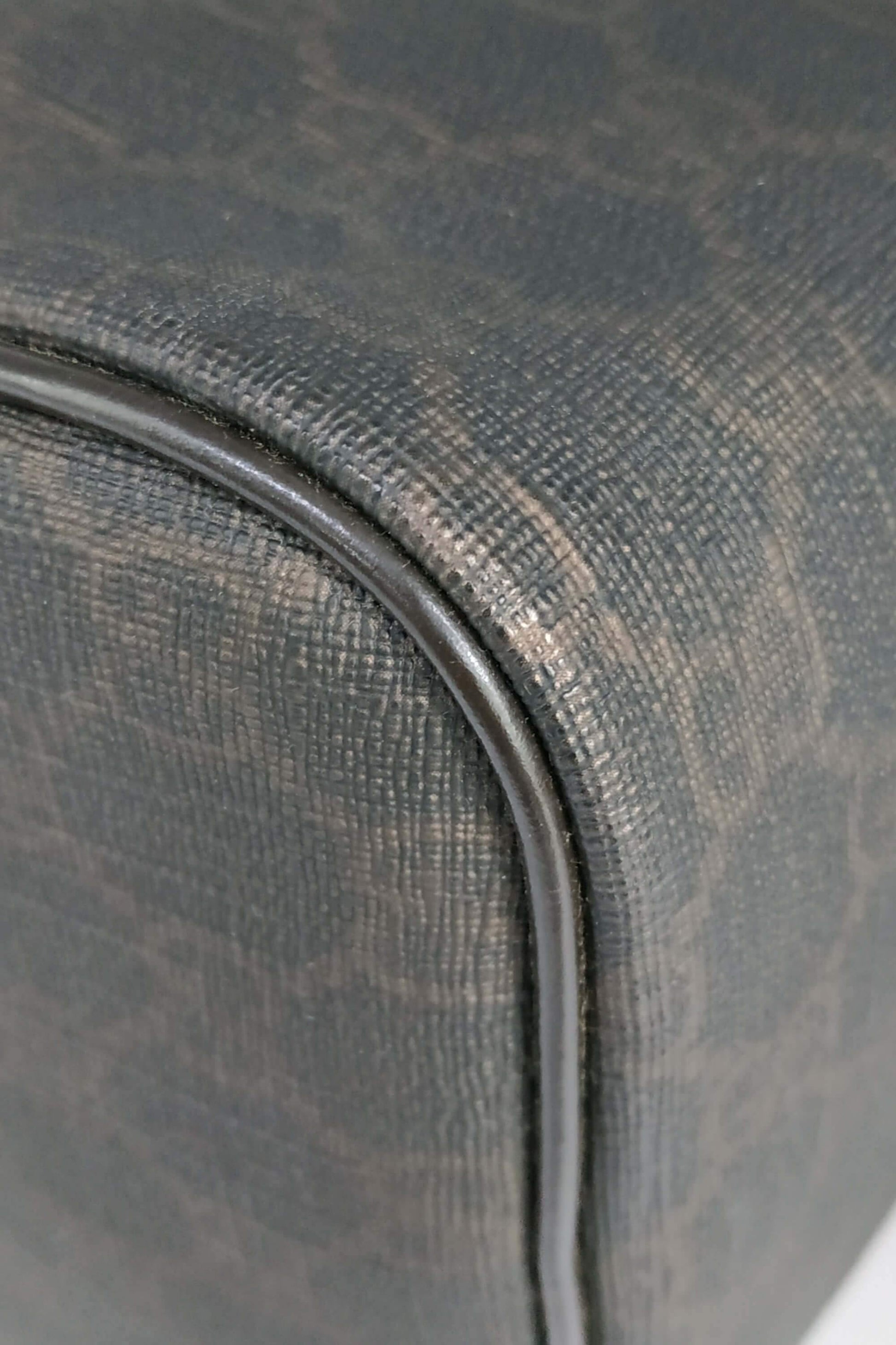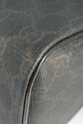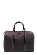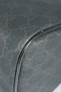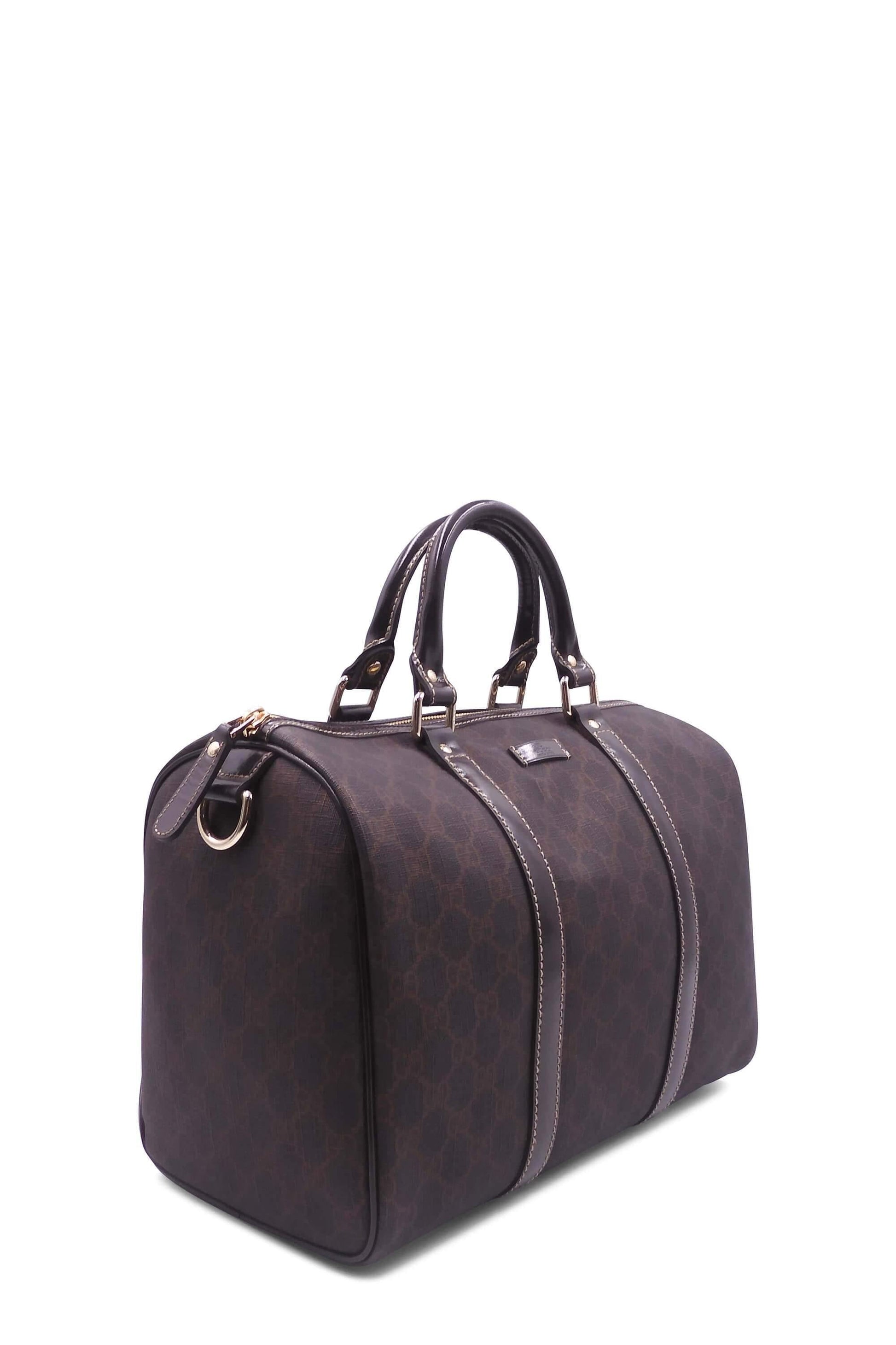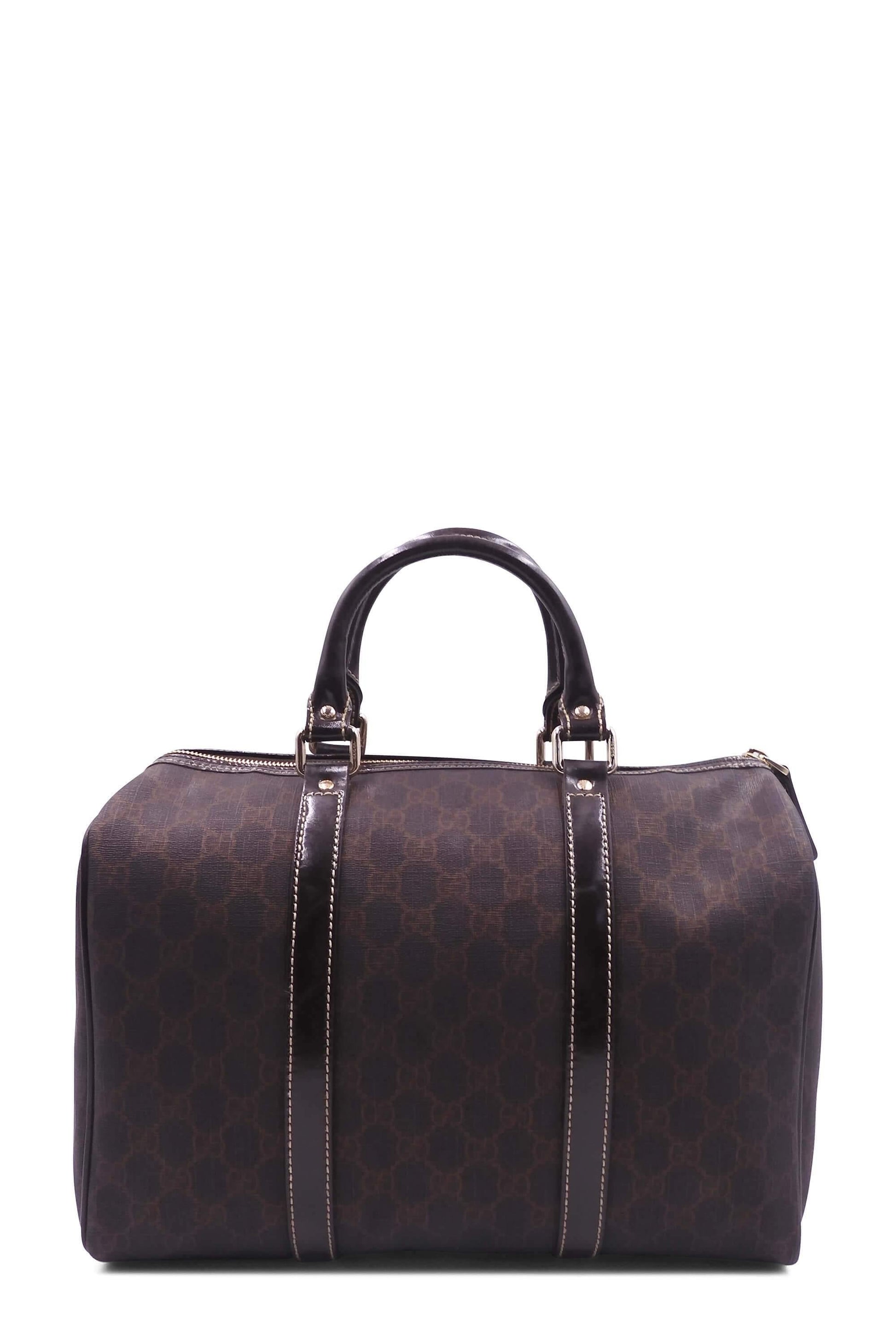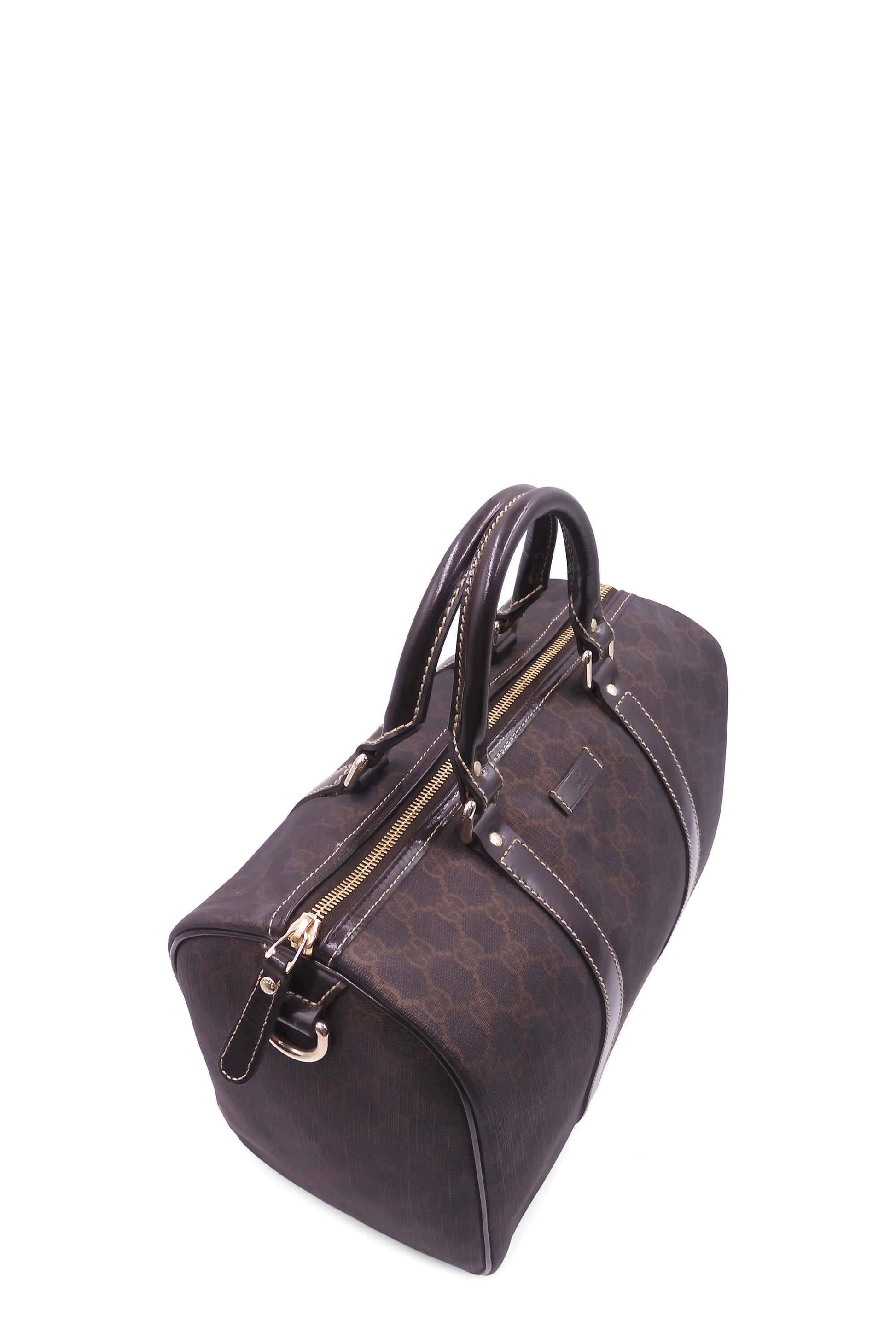 This chic Boston style tote is finely crafted of Gucci GG monogram coated canvas in brown. The bag features dark brown leather trim, piping, and rolled top handles. The top zipper opens to a fabric interior.