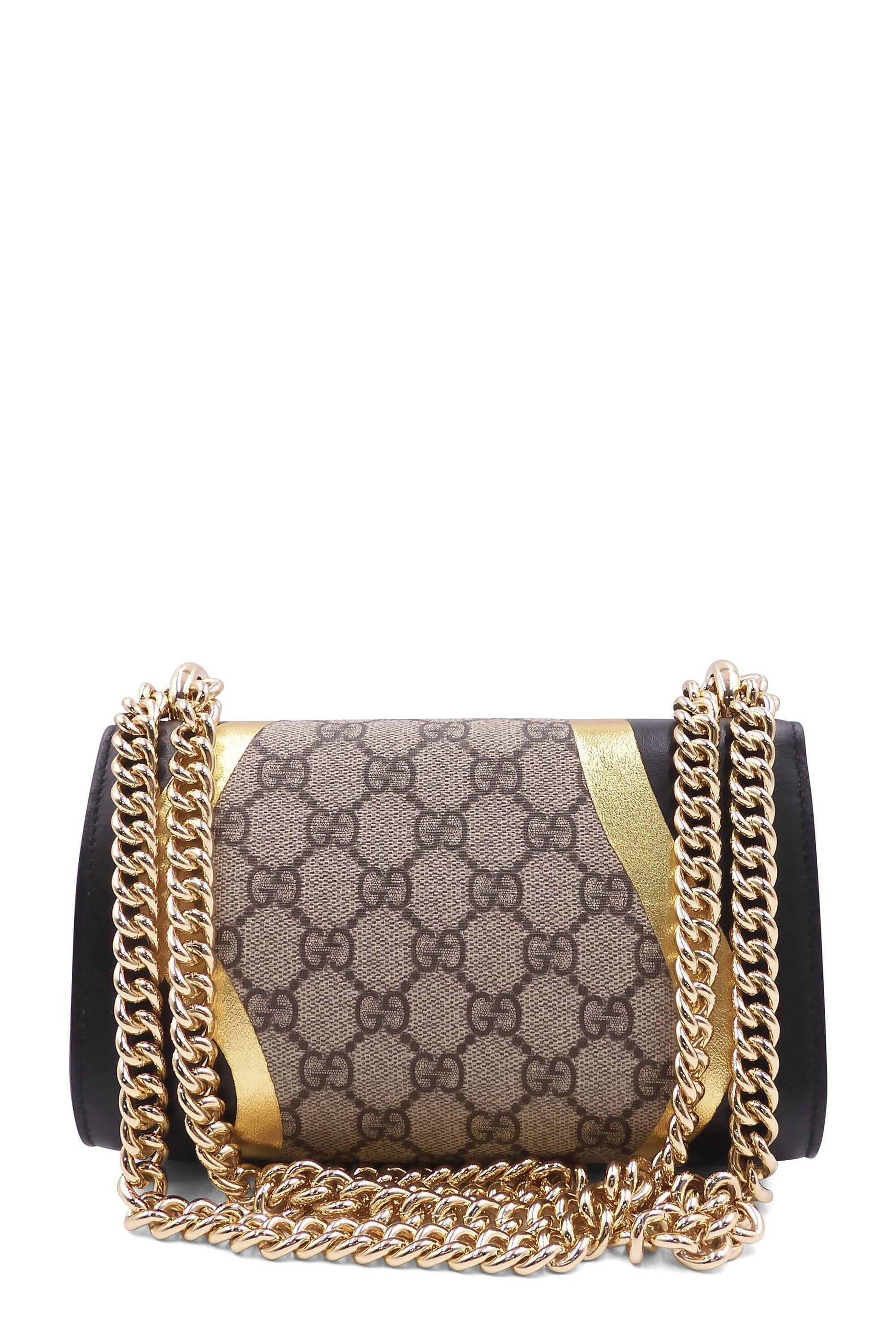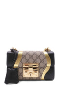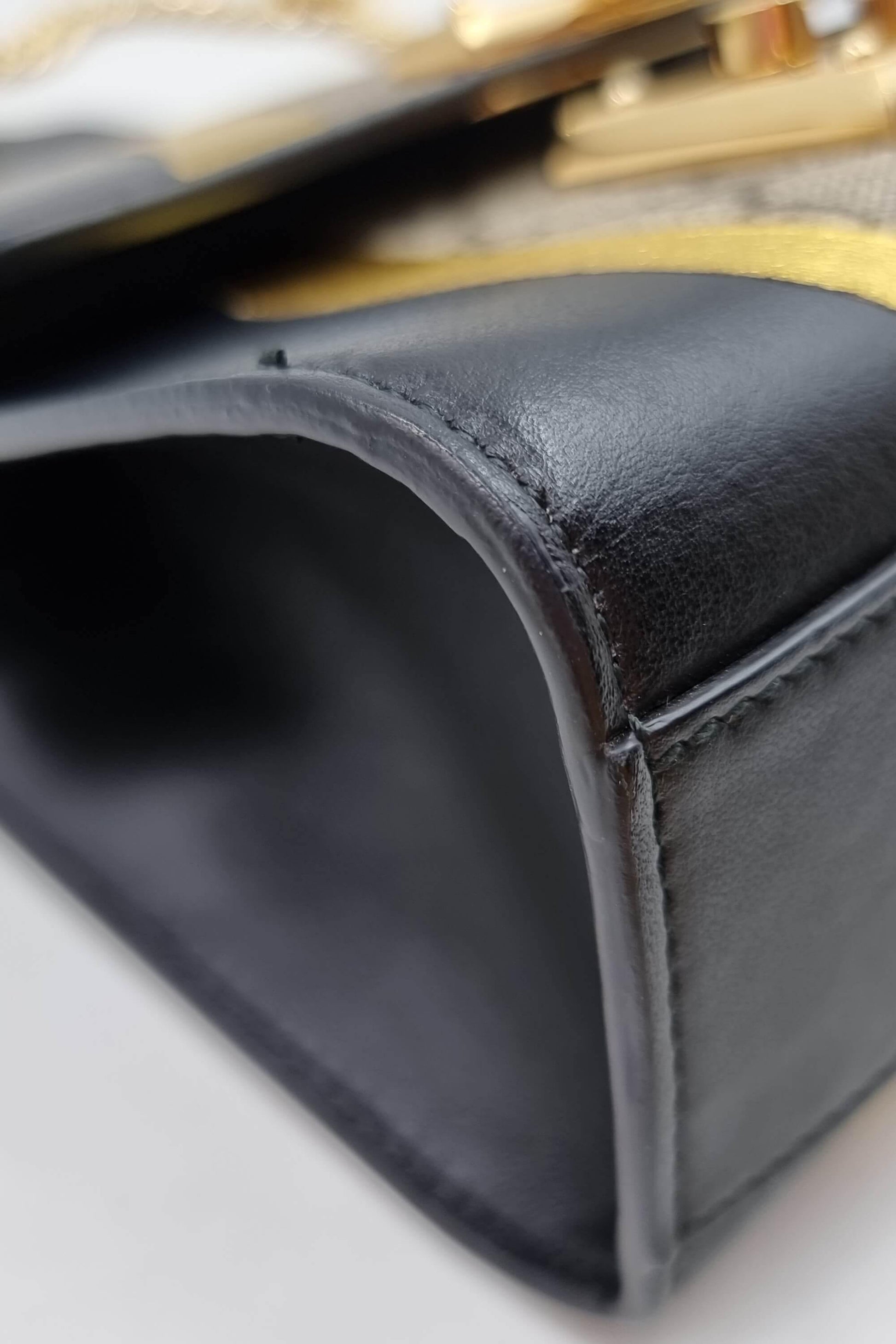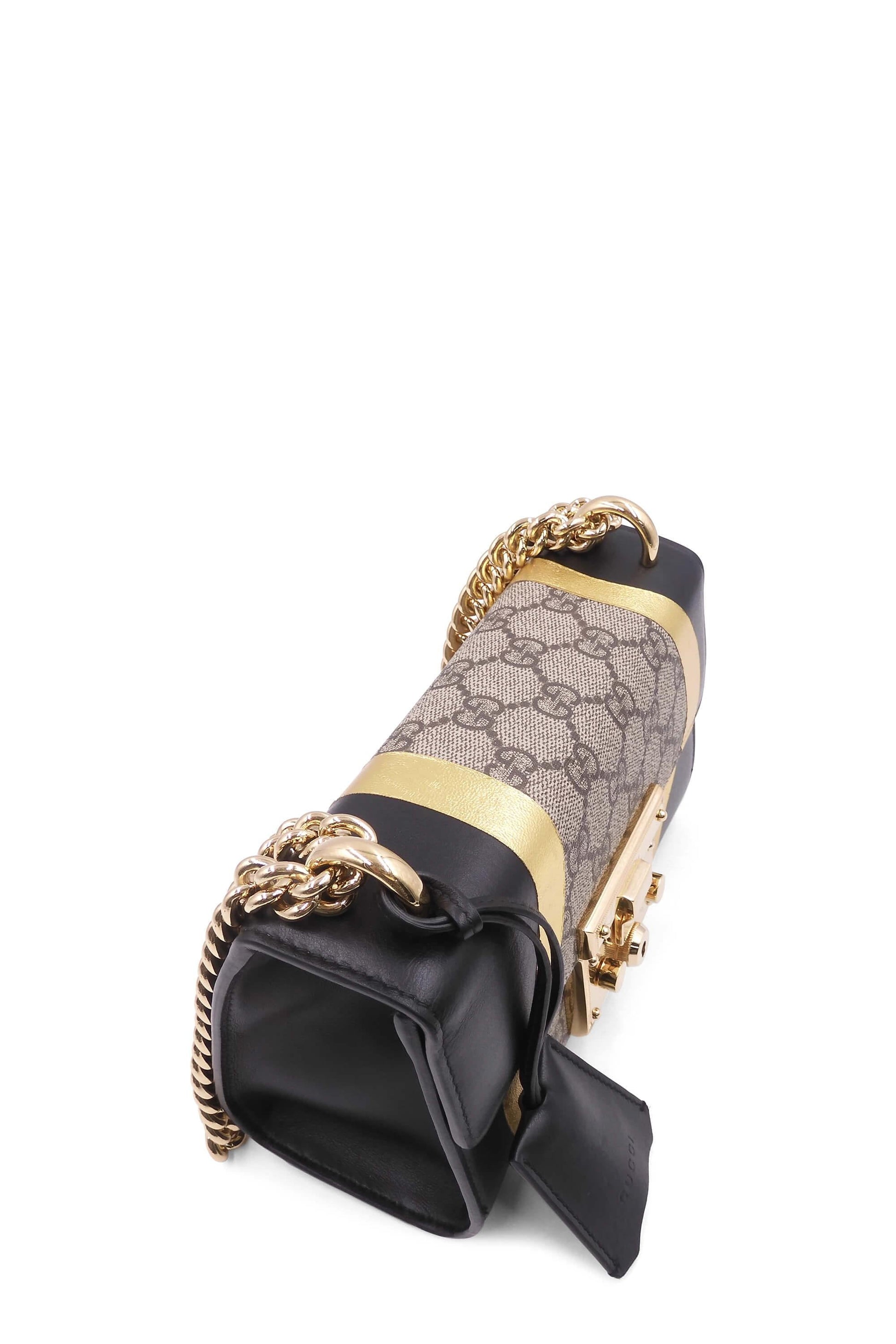 This Gucci GG Supreme Small Padlock Bag features a GG monogram coated canvas with black and gold calfskin leather body and a gold chain leather. The flap opens to a suede interior with a patch pocket.