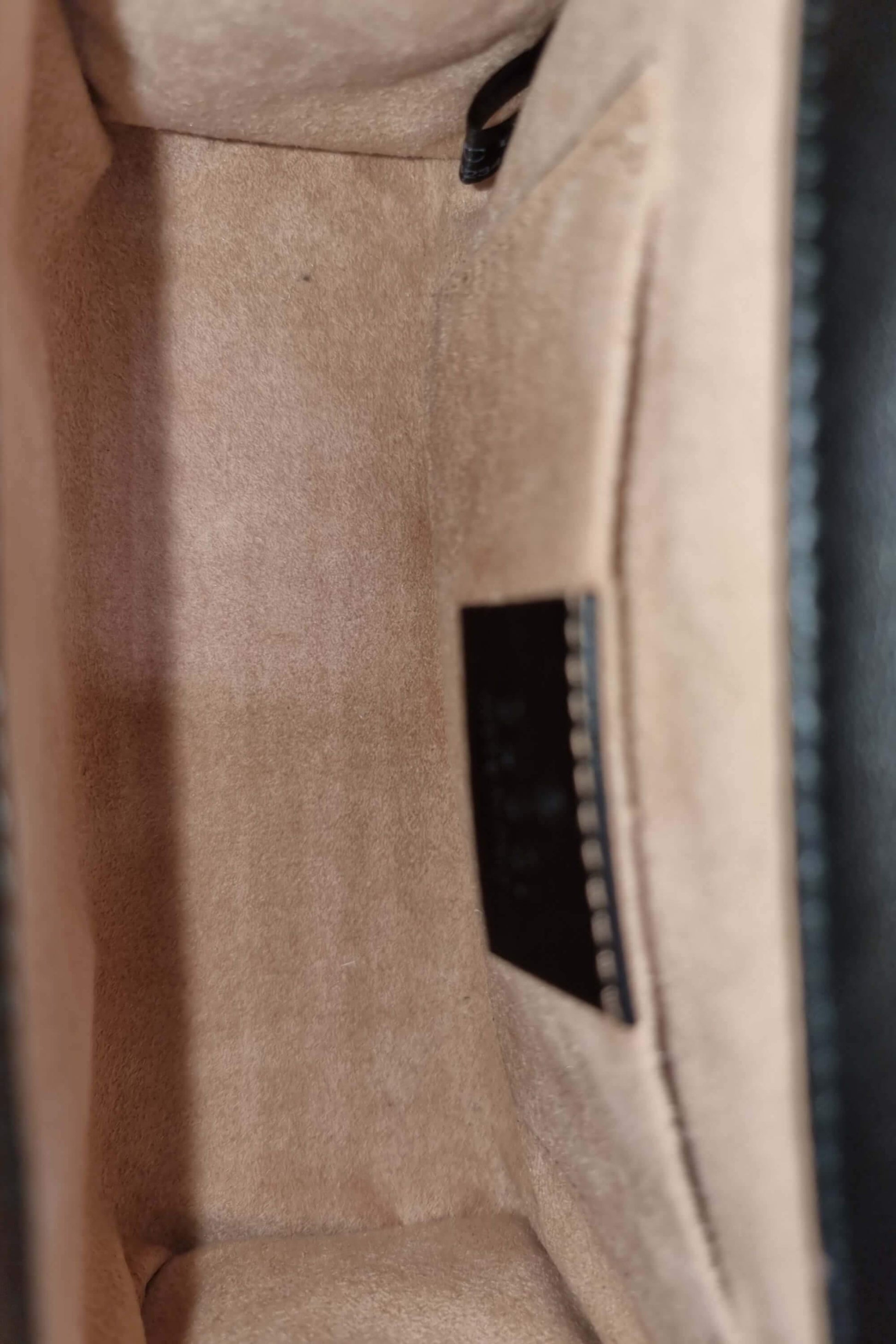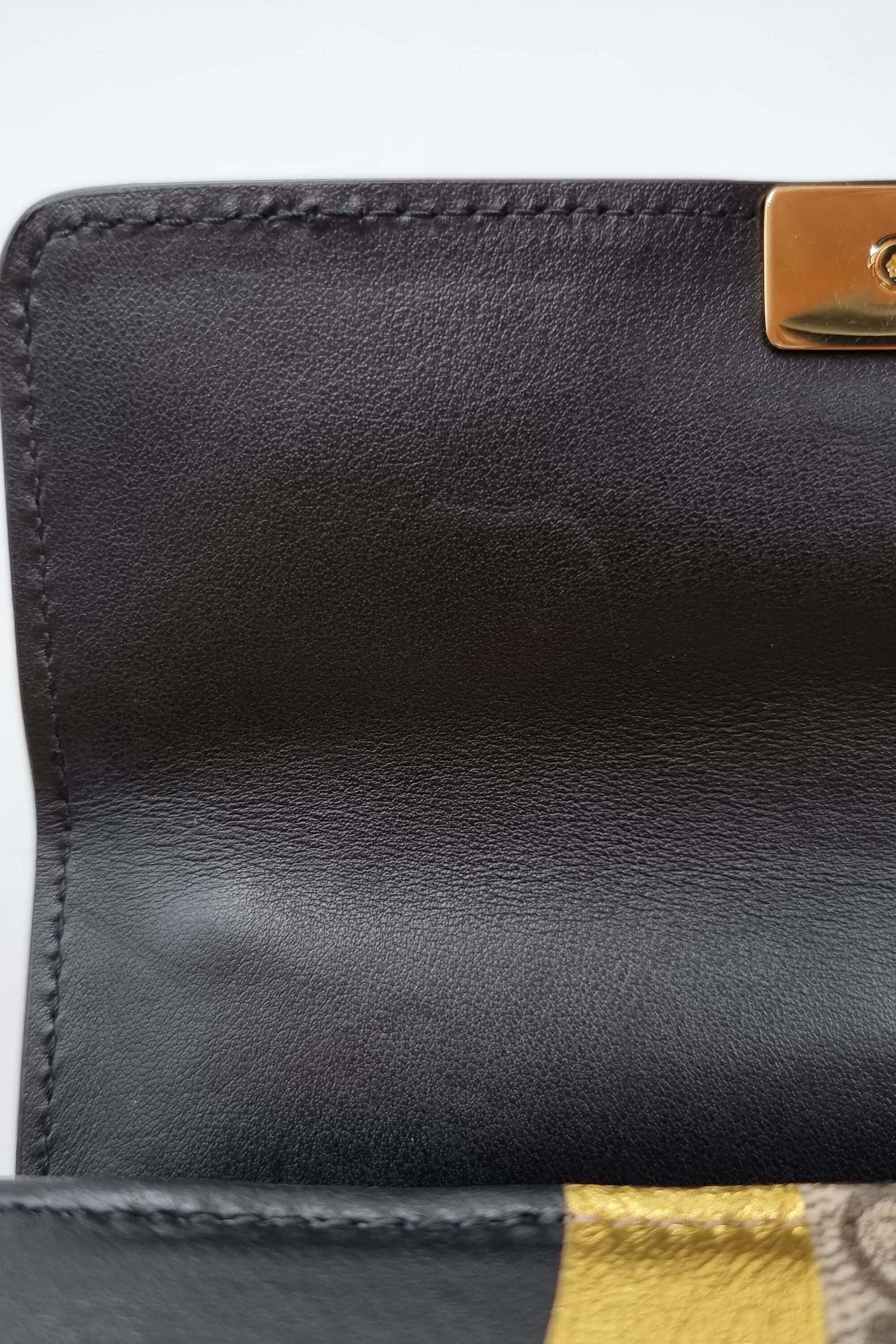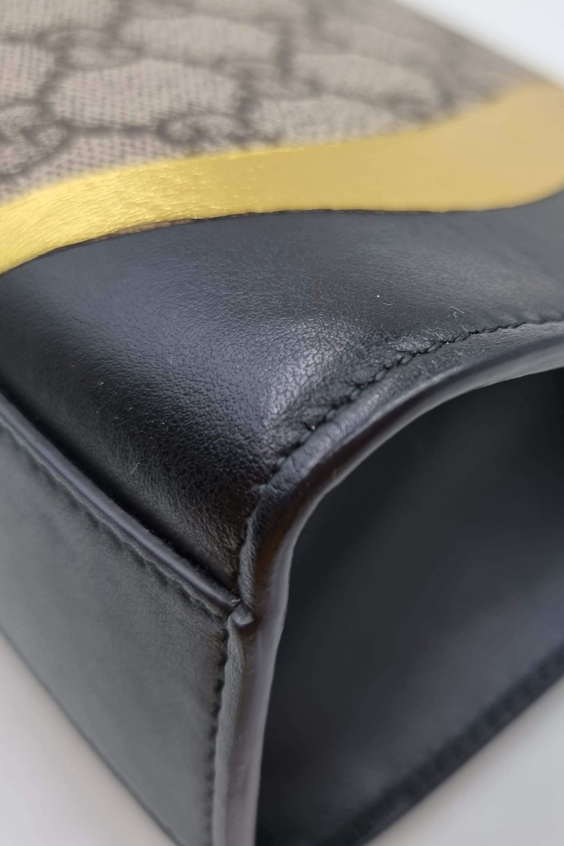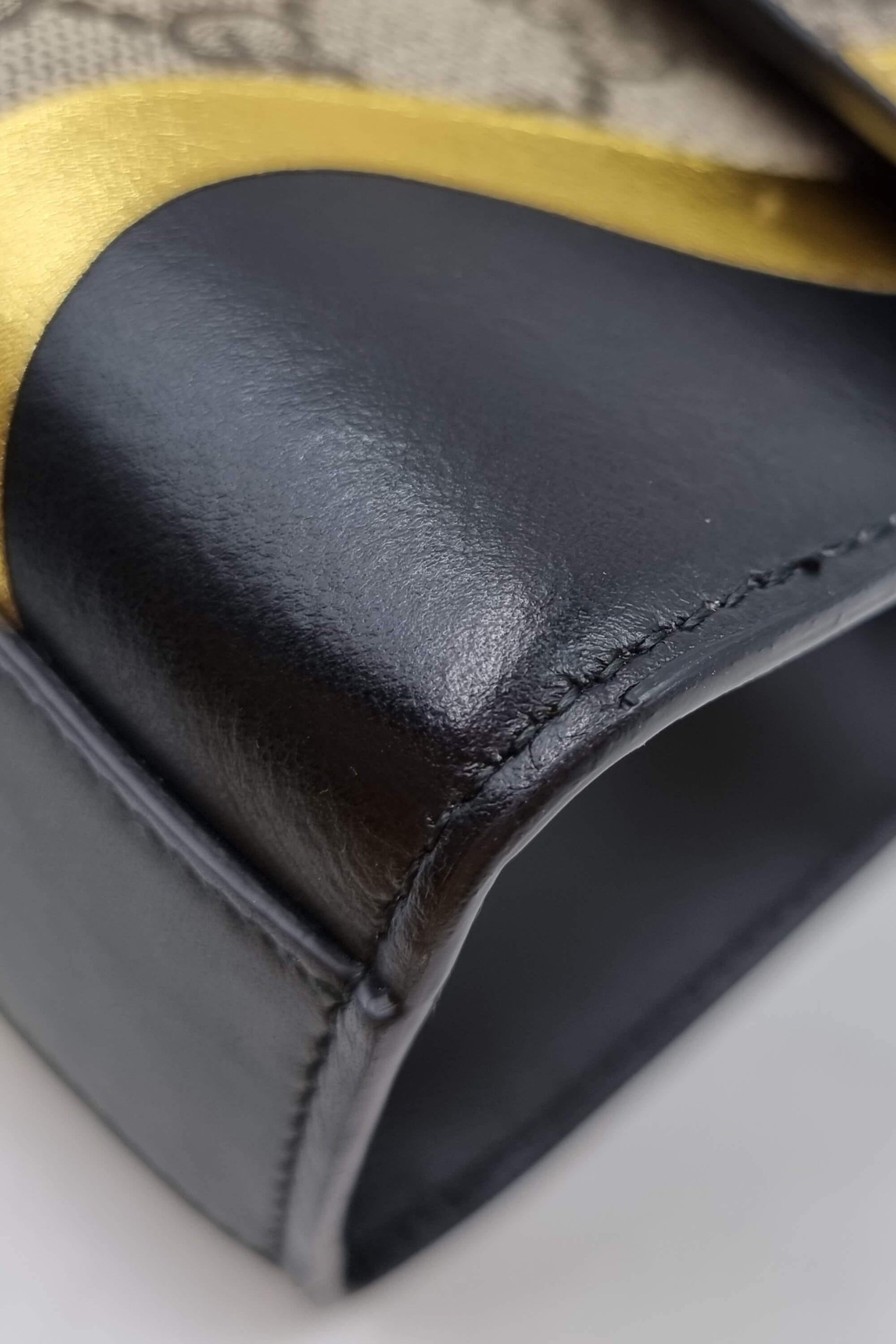 This Gucci GG Supreme Small Padlock Bag features a GG monogram coated canvas with black and gold calfskin leather body and a gold chain leather. The flap opens to a suede interior with a patch pocket.