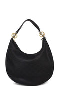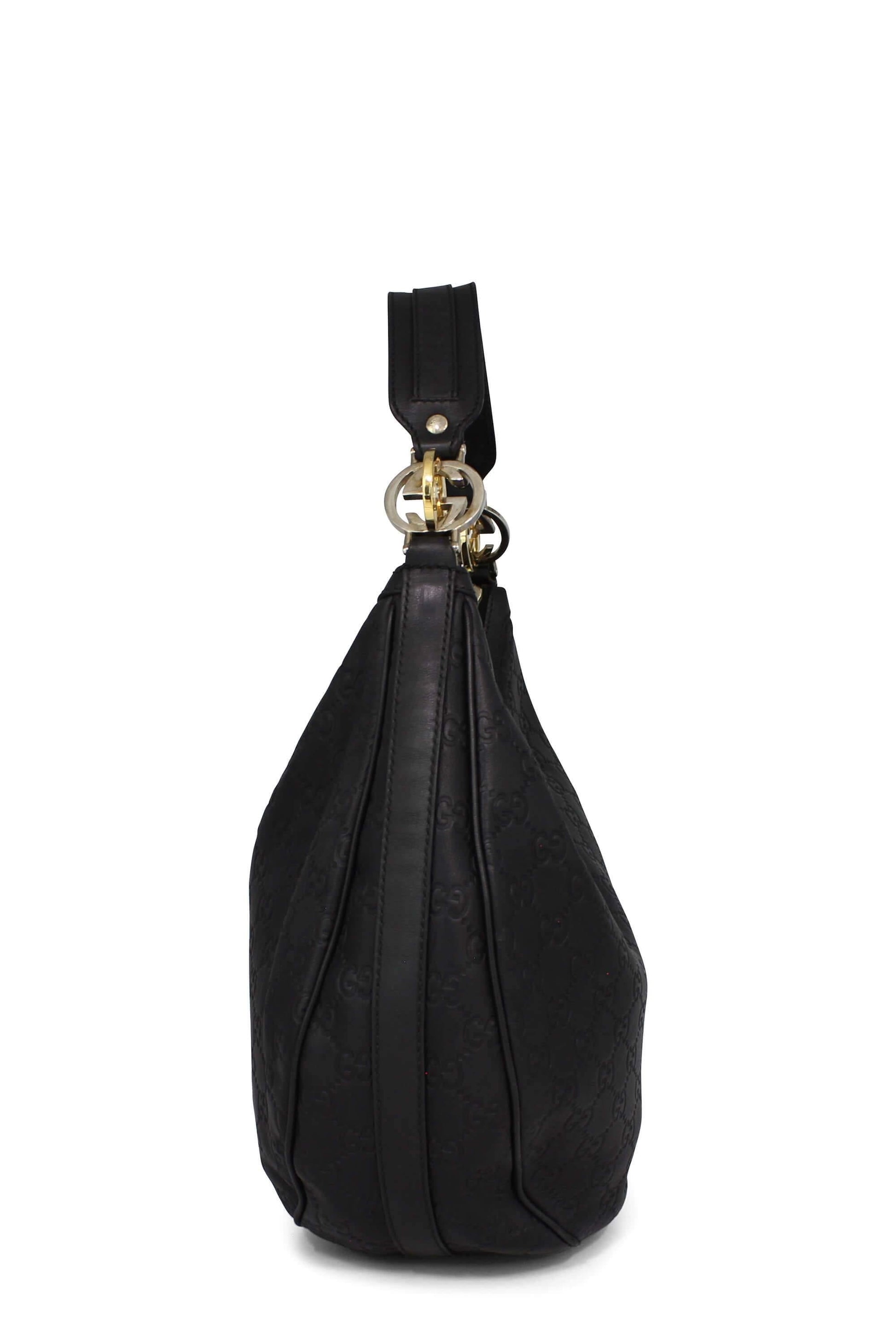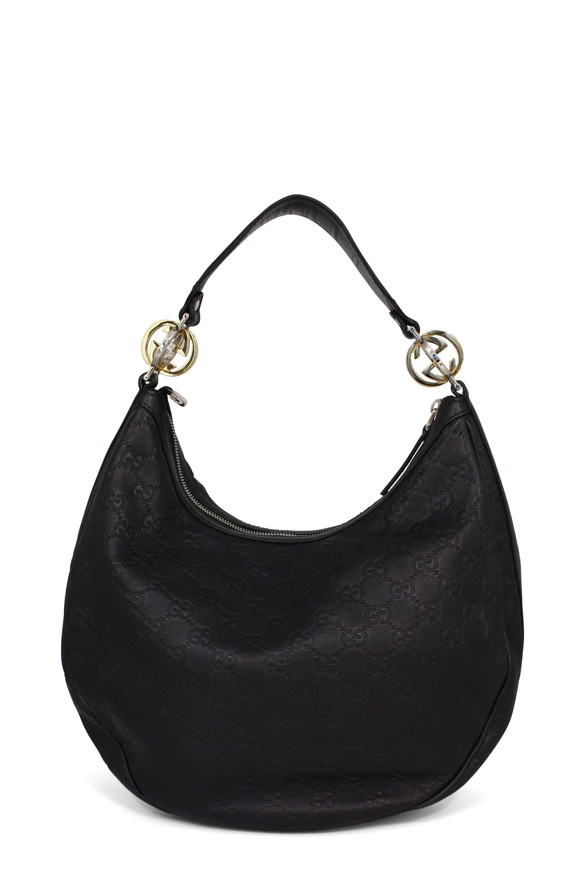 This chic hobo is crafted of Guccissima Gucci GG monogram embossed leather. The bag features an end to end looping leather shoulder strap with decorative interlocking GG gold links. The top zipper opens to a spacious fabric interior.