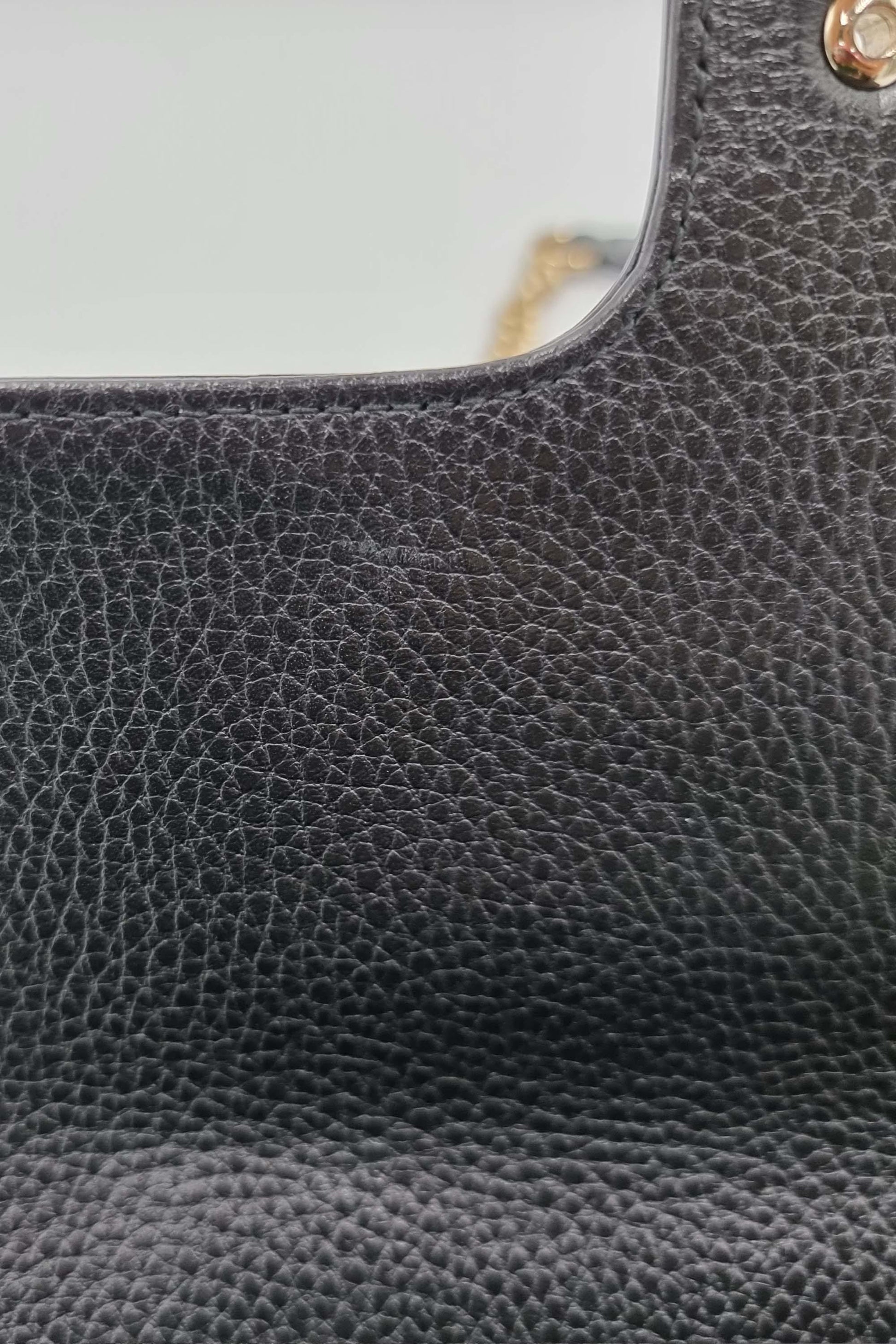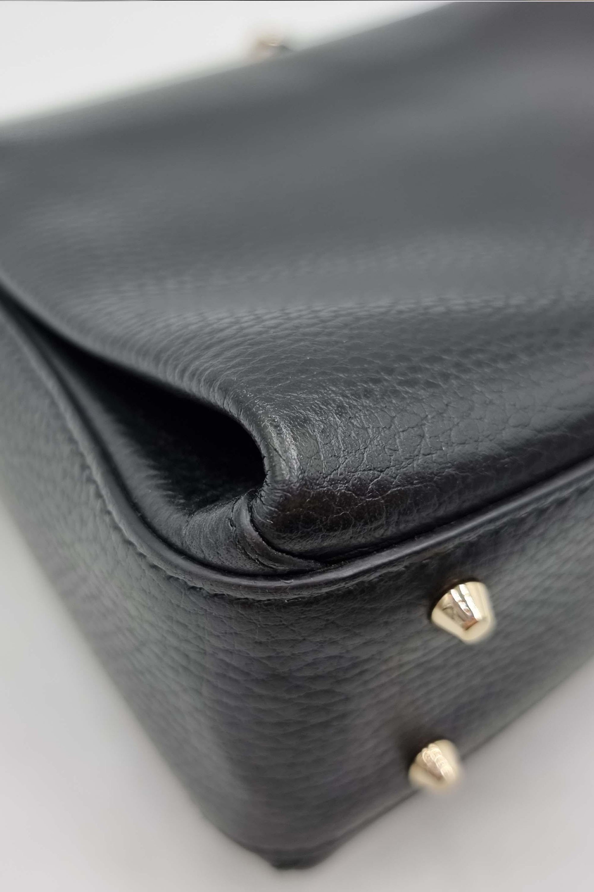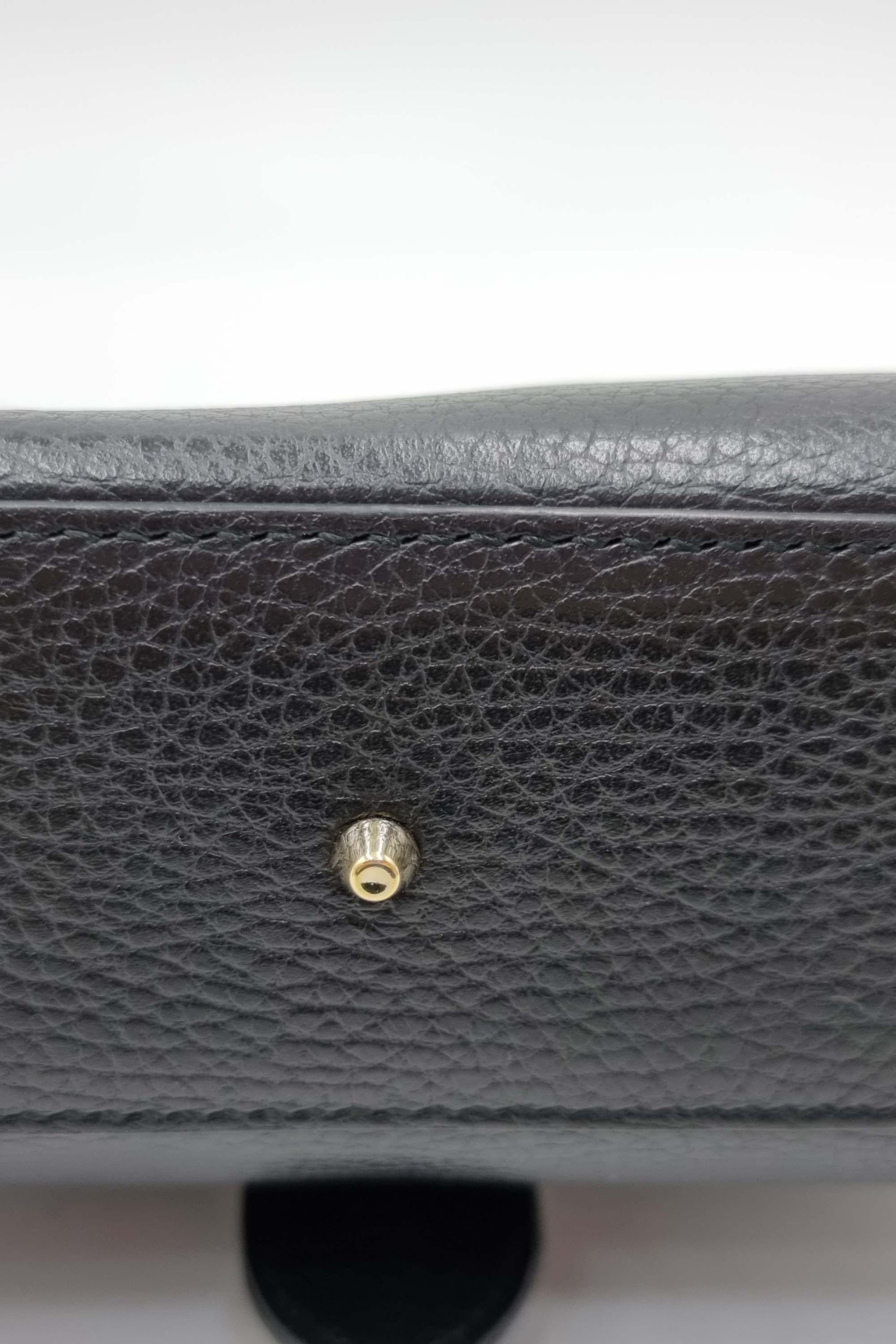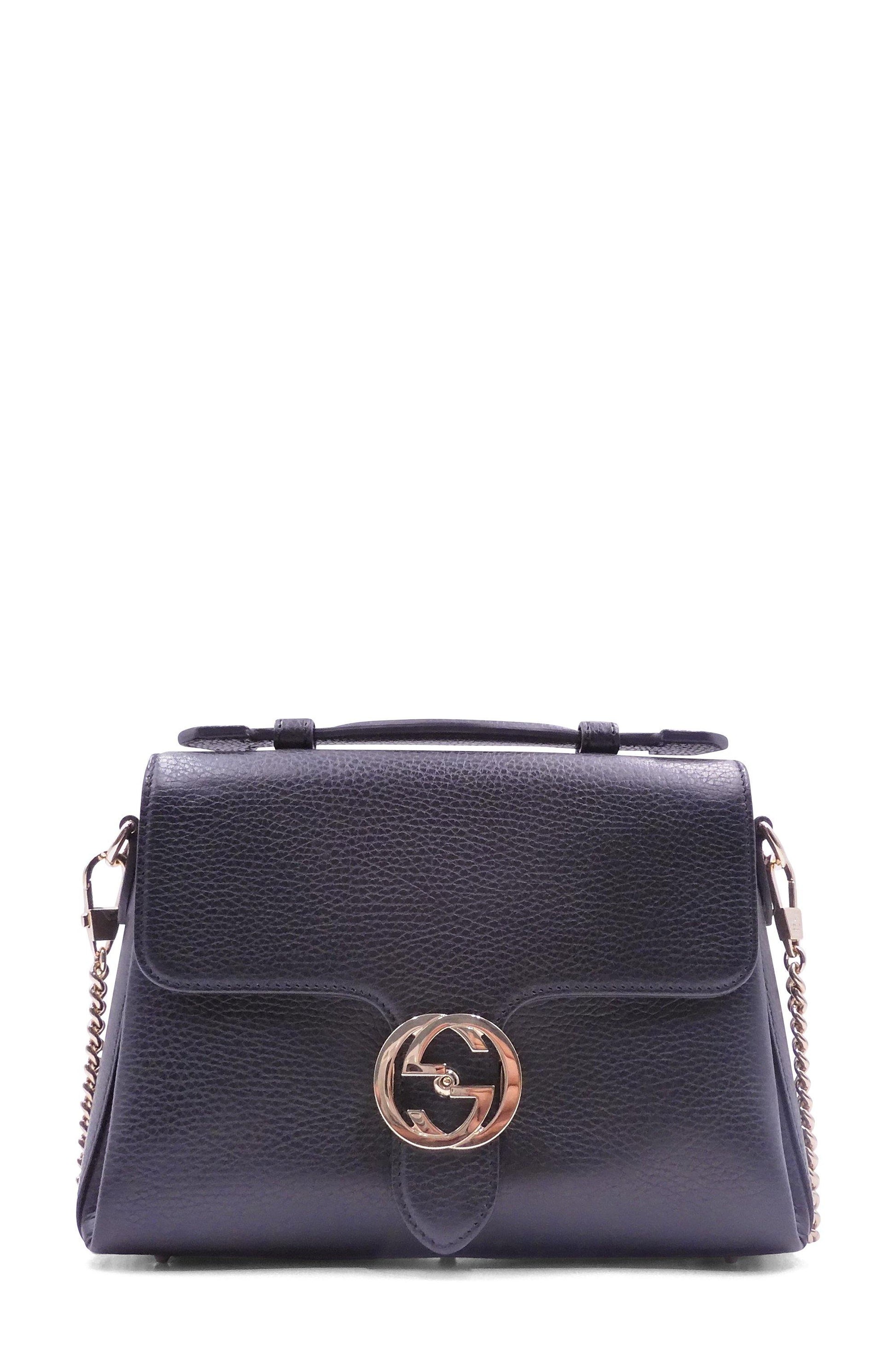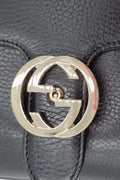 This Gucci Medium Interlocking GG Top Handle Shoulder Bag features a grained calfskin leather body in black, silver interlocking GG emblem, detachable shoulder strap and gold-toned hardware. The flap opens to a partitioned fabric interior with patch and zipper pockets.