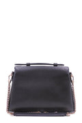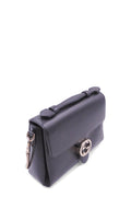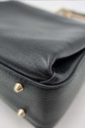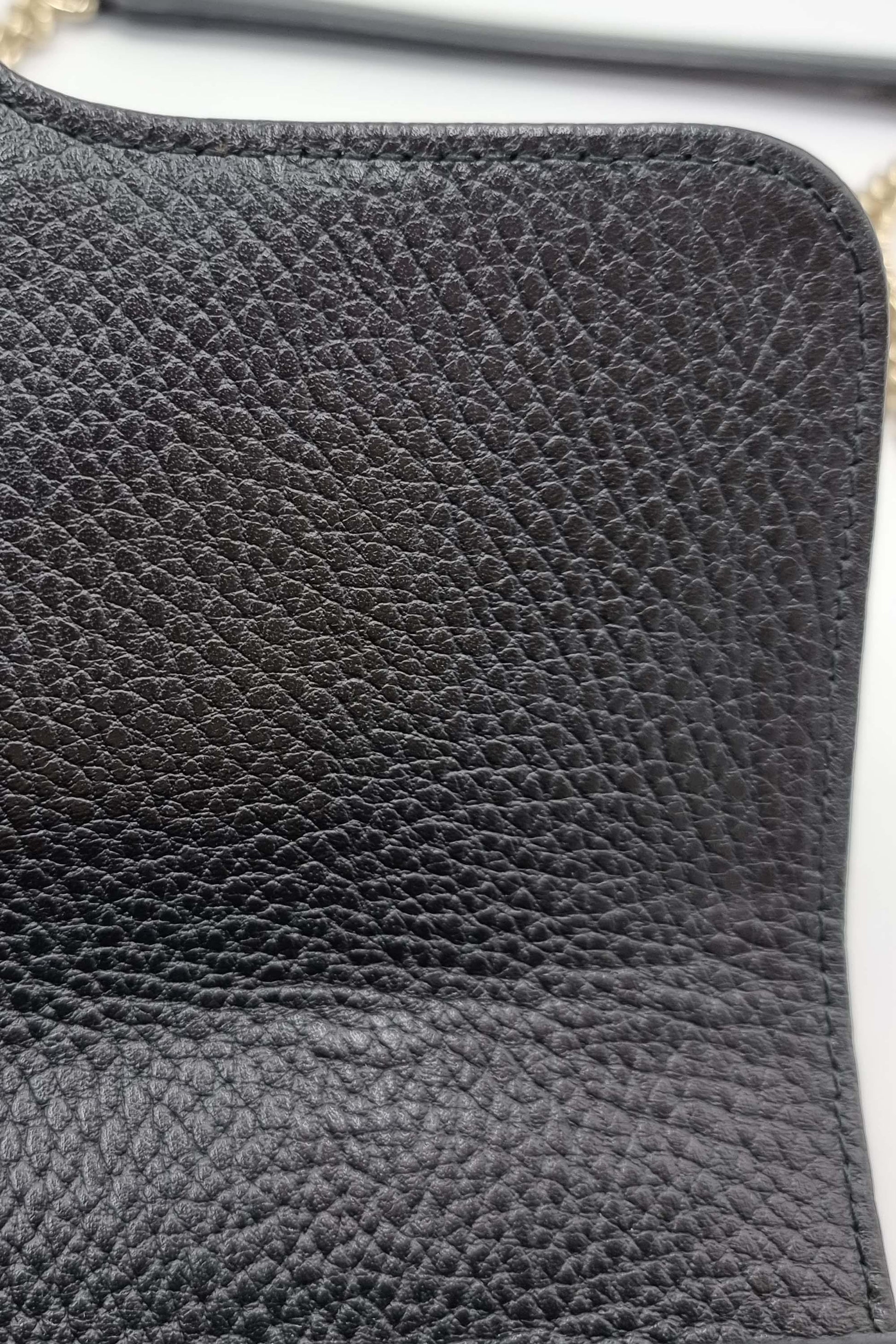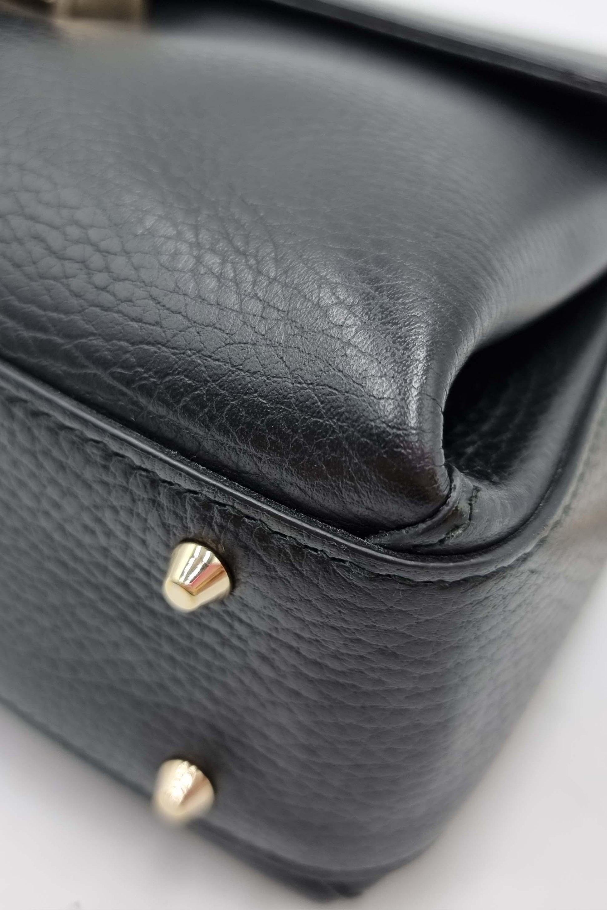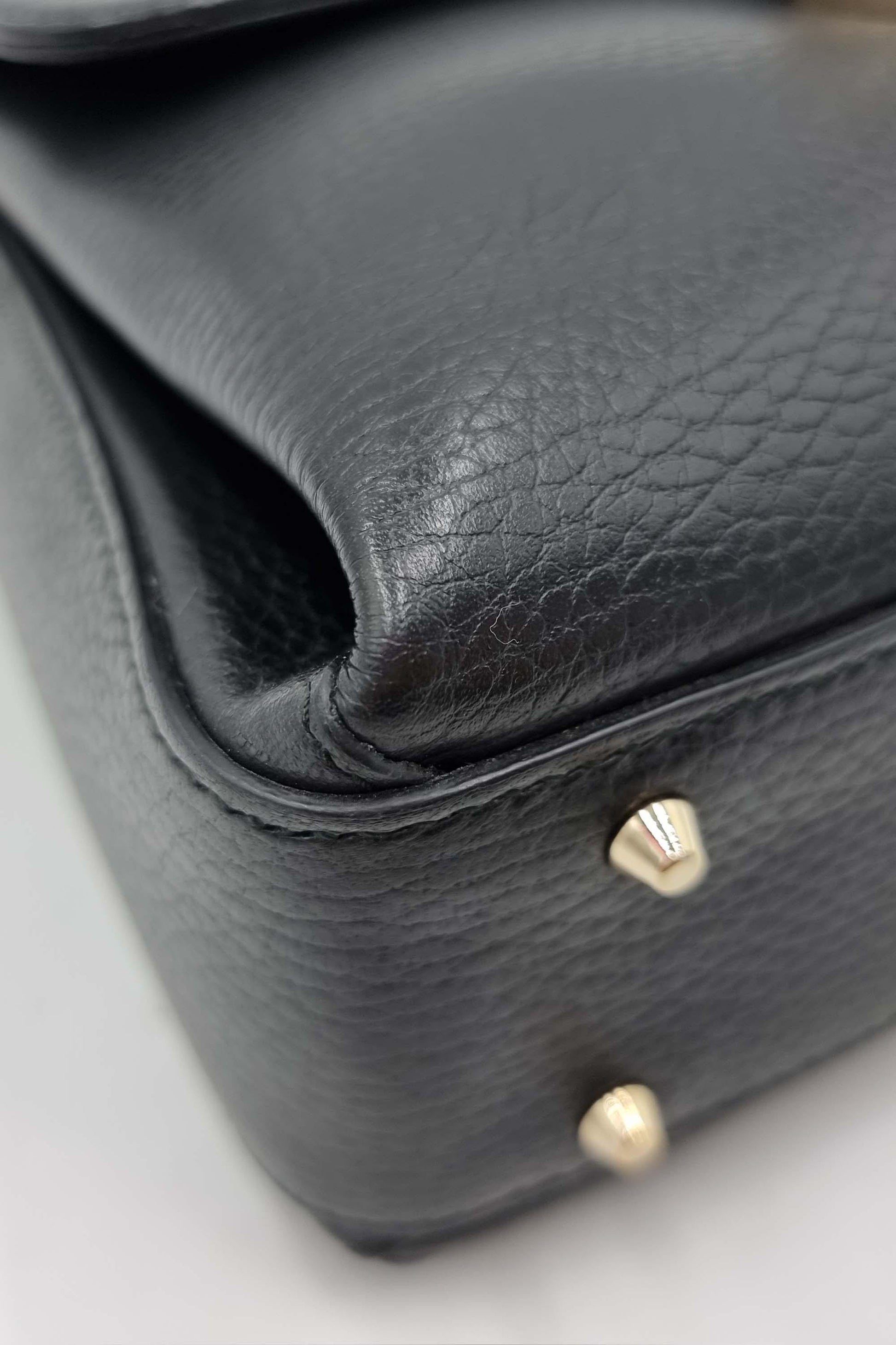 This Gucci Medium Interlocking GG Top Handle Shoulder Bag features a grained calfskin leather body in black, silver interlocking GG emblem, detachable shoulder strap and gold-toned hardware. The flap opens to a partitioned fabric interior with patch and zipper pockets.