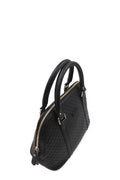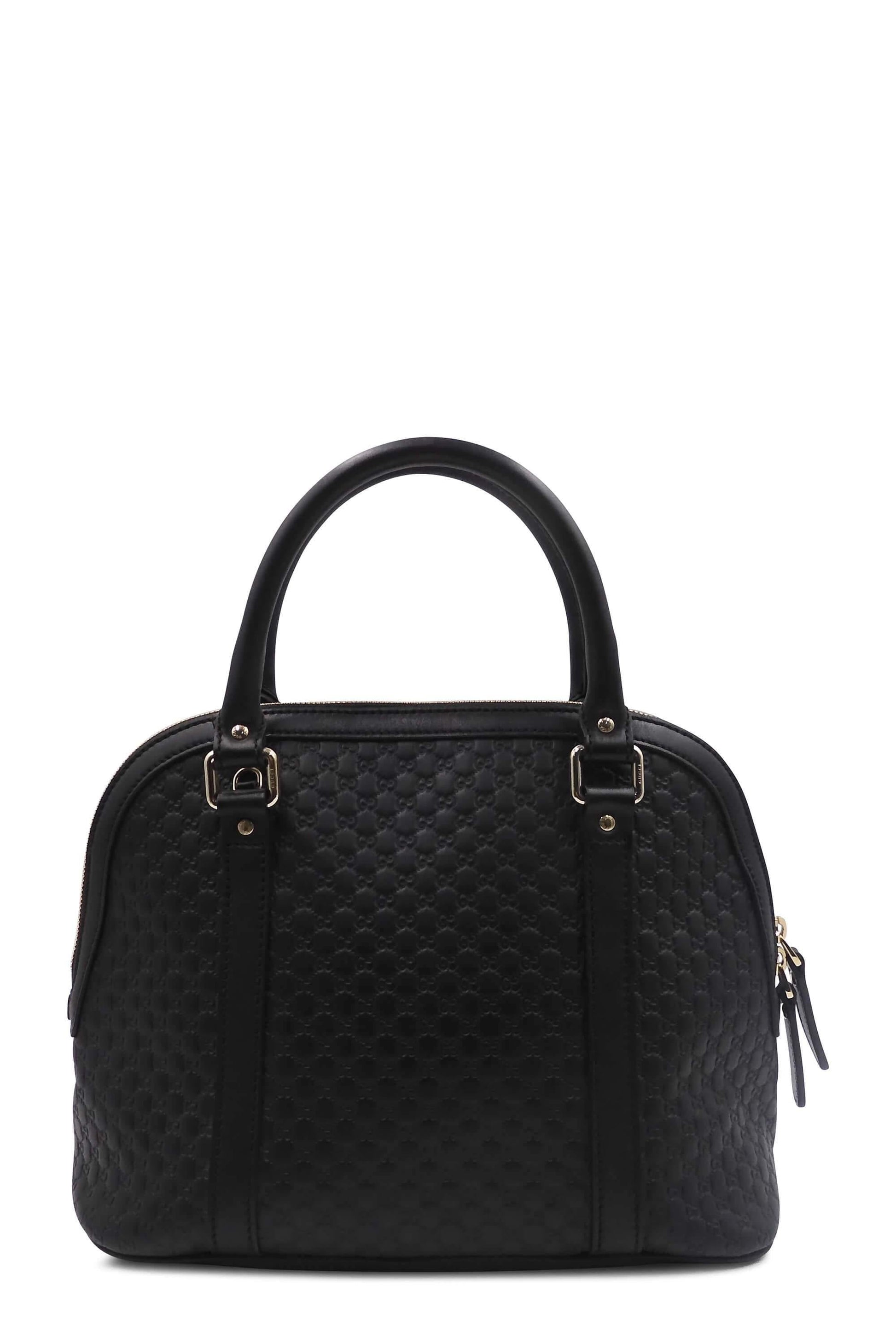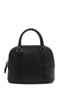 This chic tote is crafted of embossed microguccissima leather in black. The bag features leather top handles, an optional shoulder strap, and light gold hardware. The zipper opens to a spacious beige fabric interior with patch pockets.