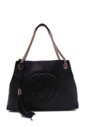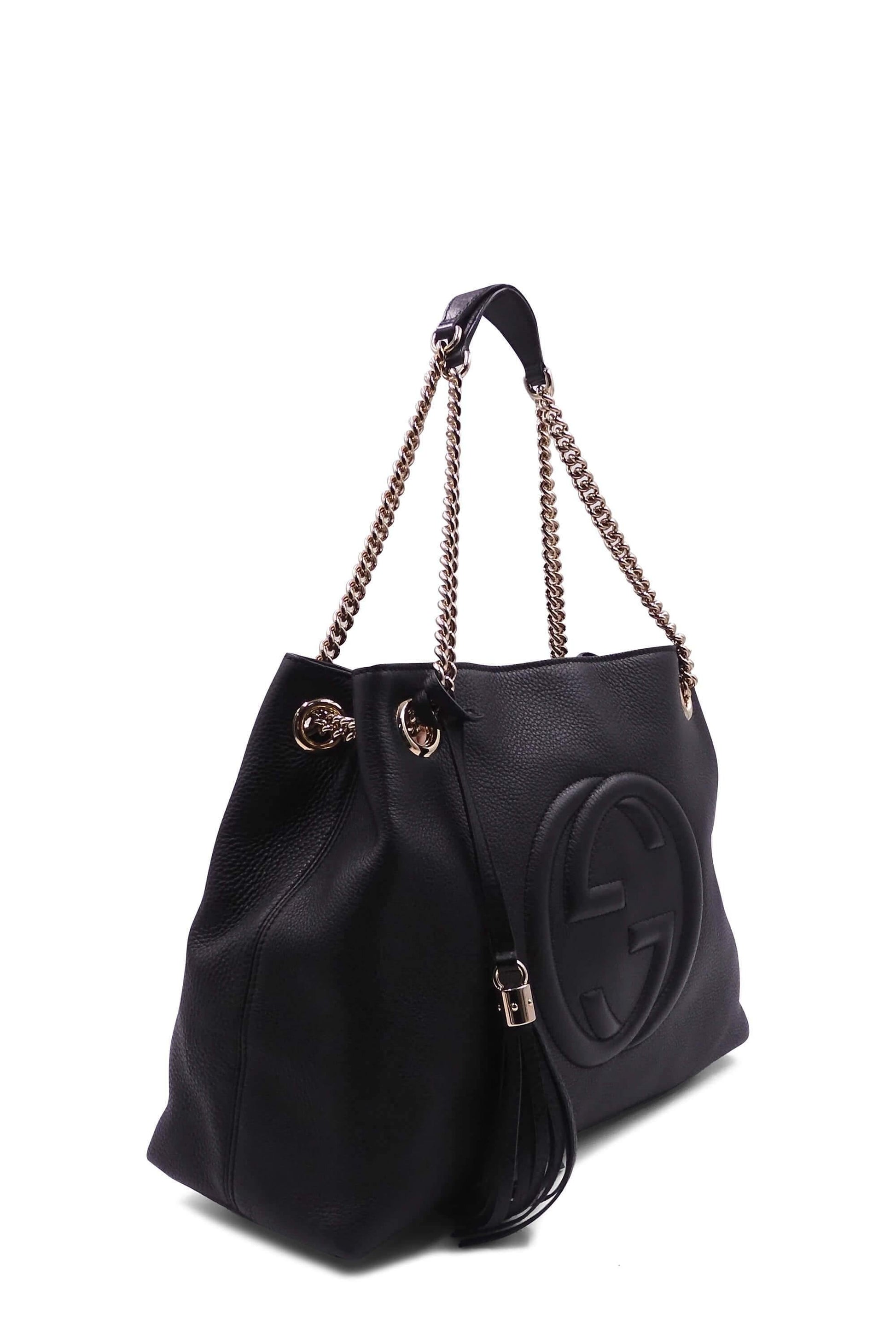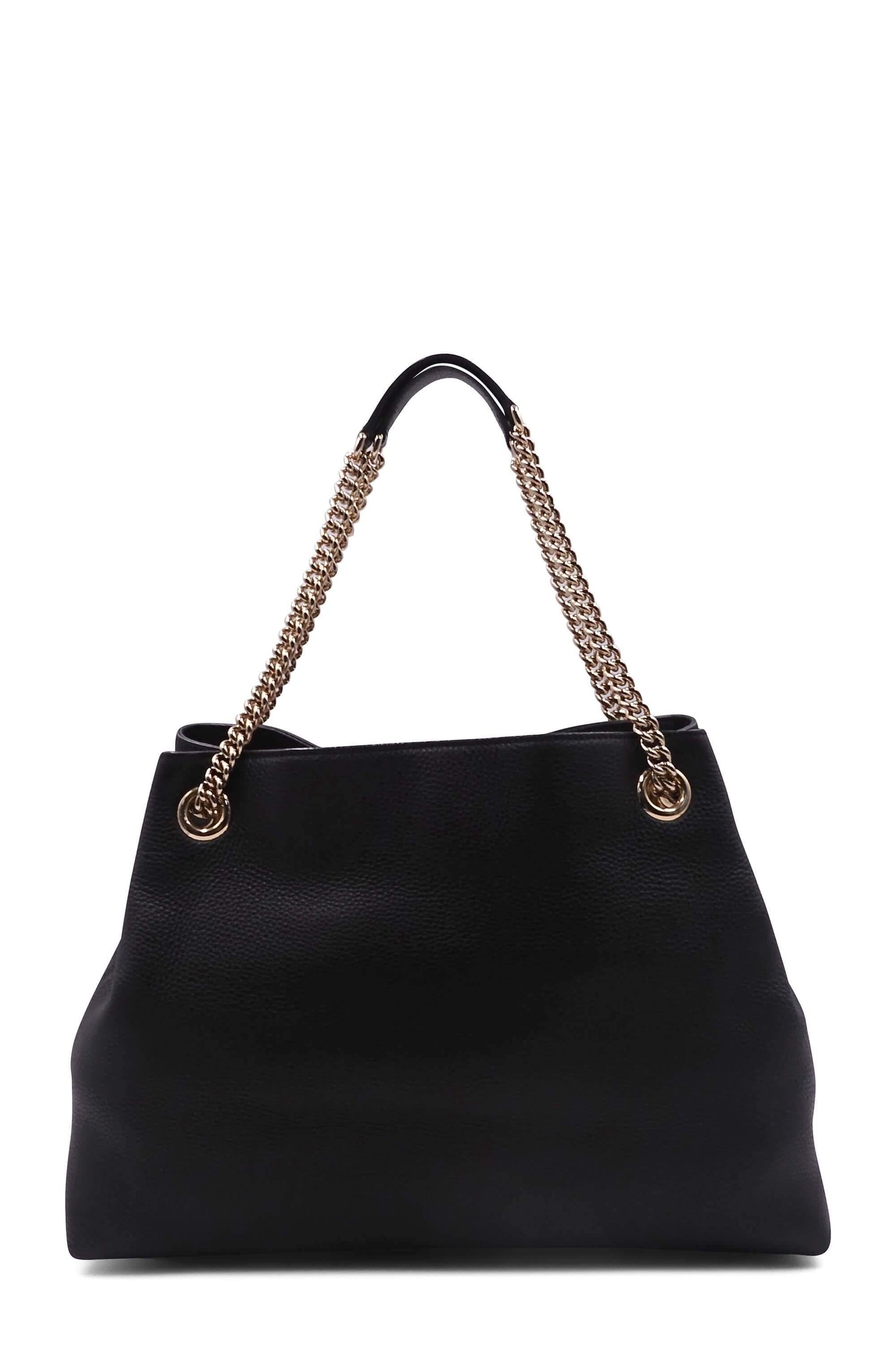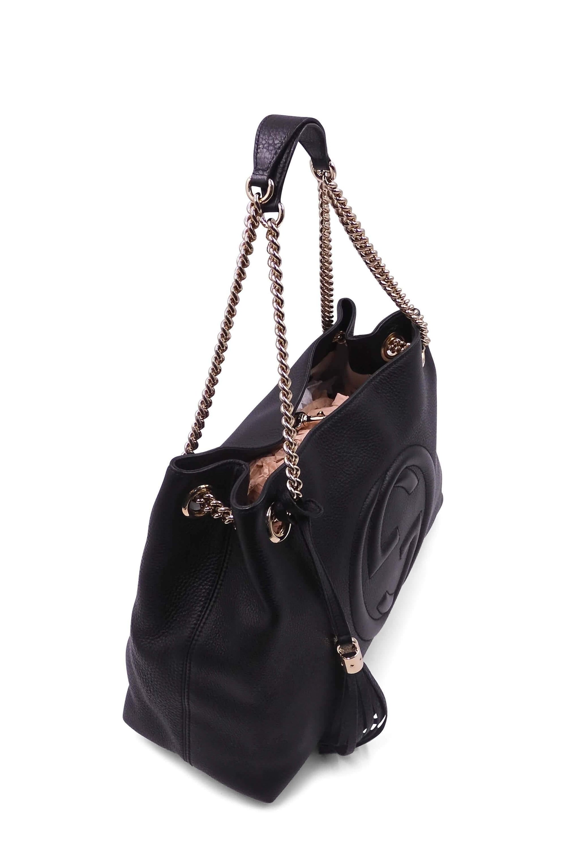 This Gucci Soho Chain Strap Shoulder Bag Leather Medium, crafted in black leather, features chain link straps with leather pads and gold-tone hardware. Its hook clasp closure opens to a beige fabric interior with side zip and slip pockets.