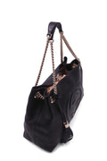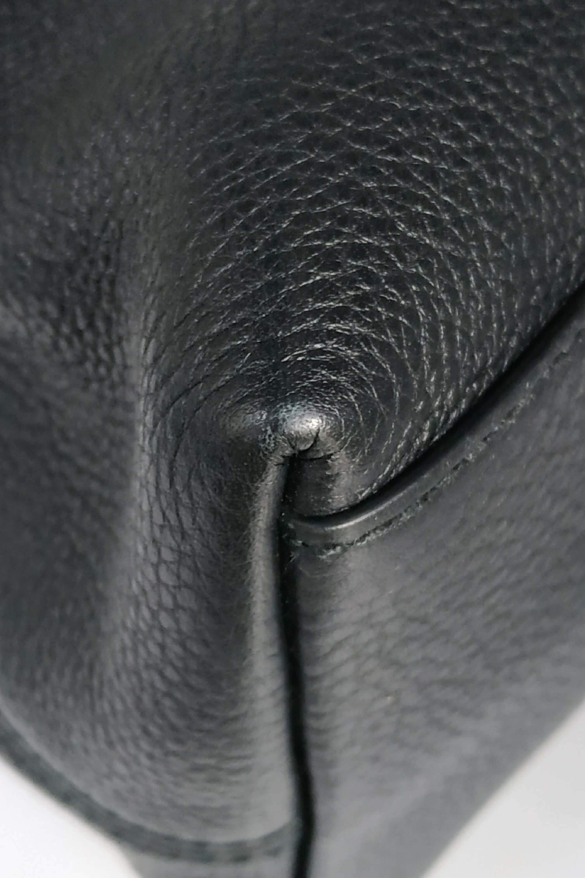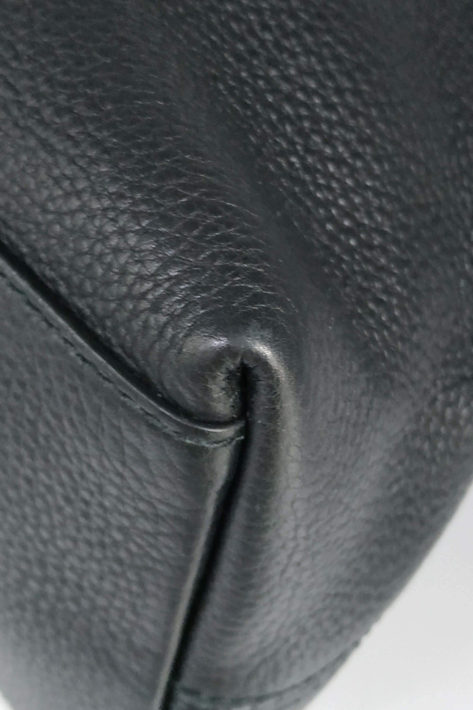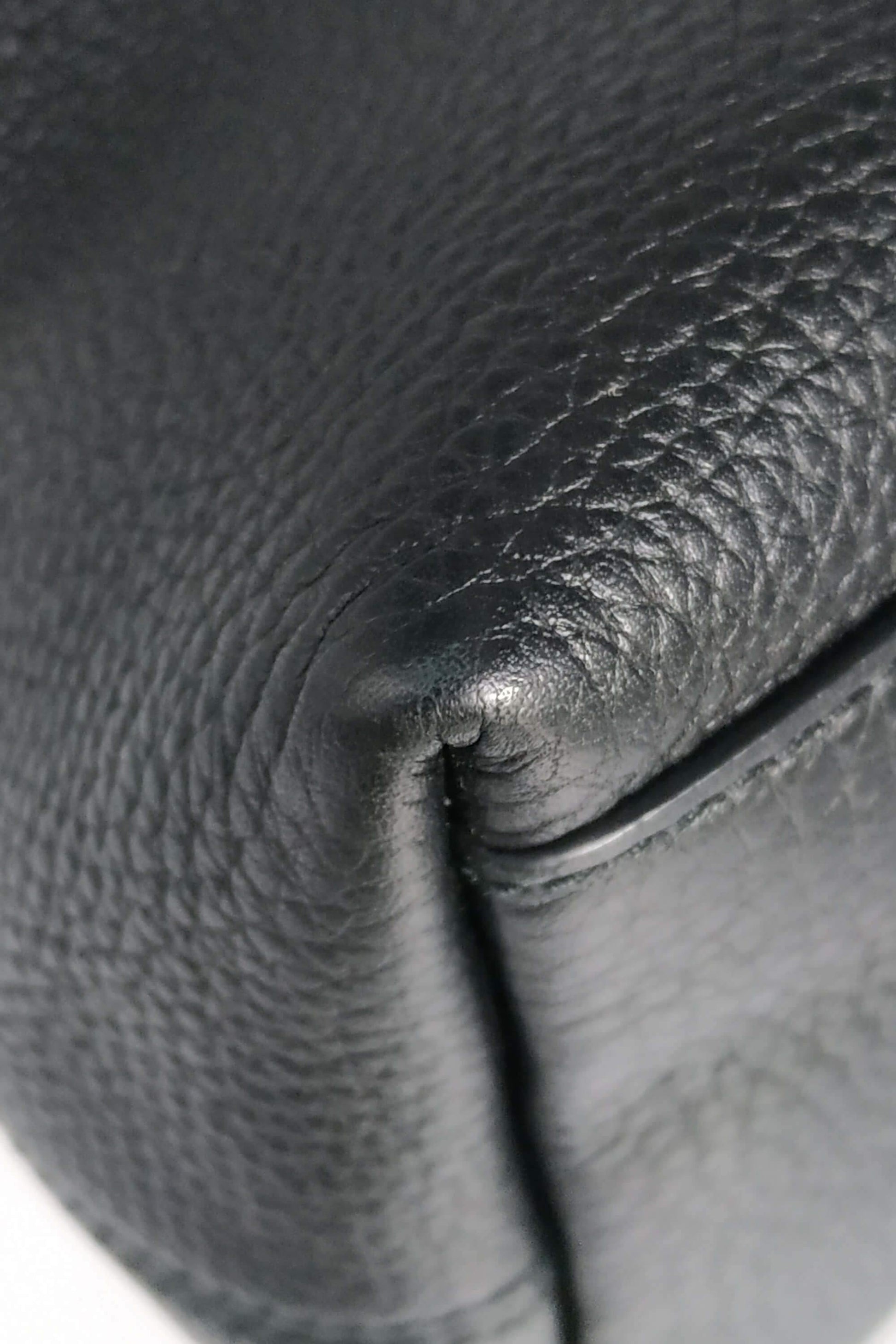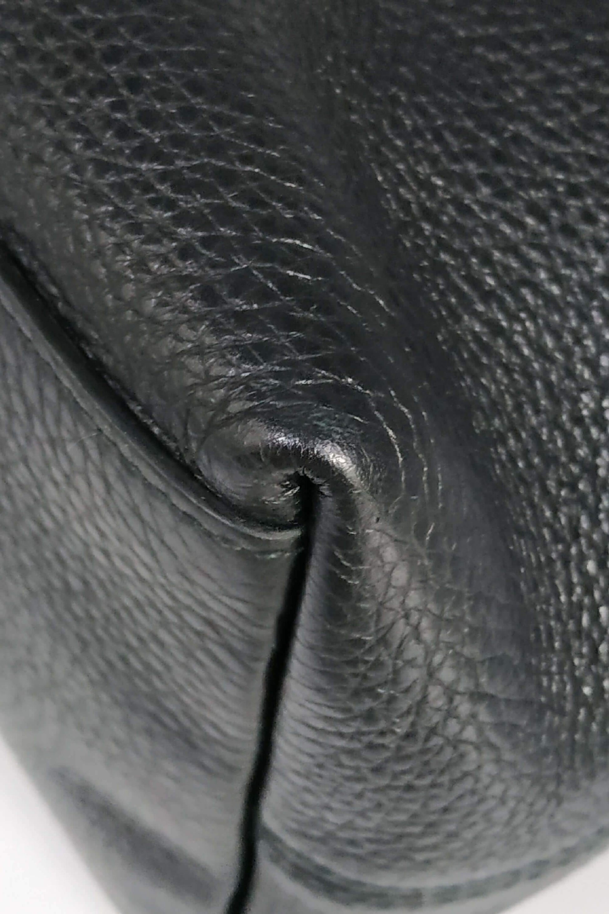 This Gucci Soho Chain Strap Shoulder Bag Leather Medium, crafted in black leather, features chain link straps with leather pads and gold-tone hardware. Its hook clasp closure opens to a beige fabric interior with side zip and slip pockets.