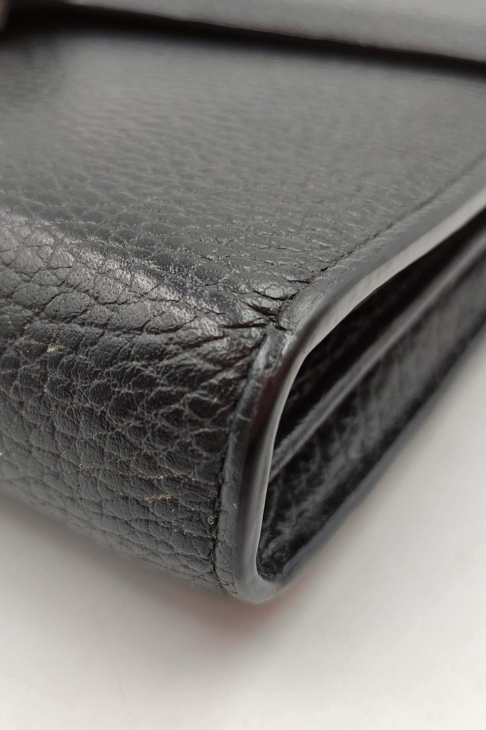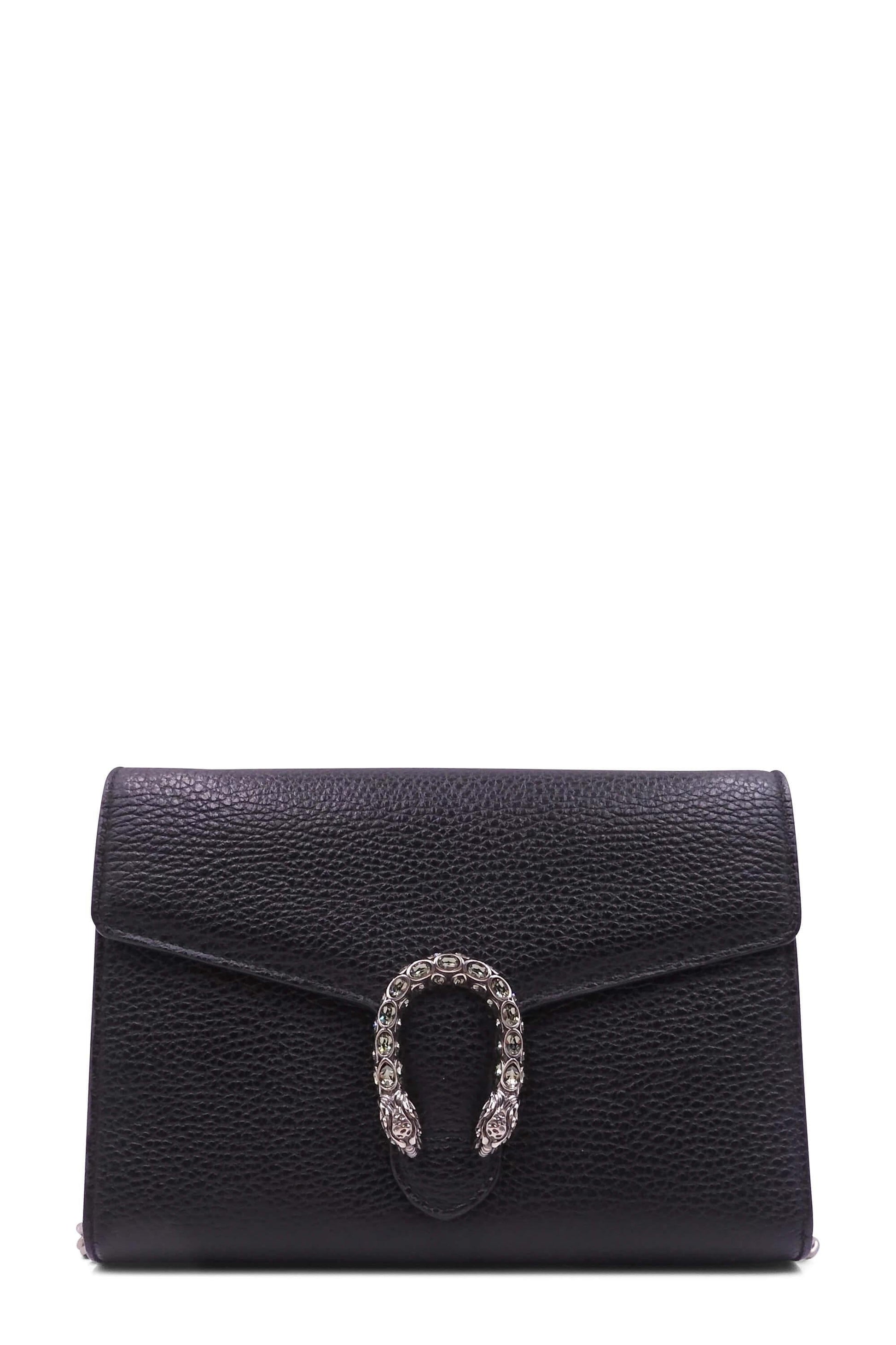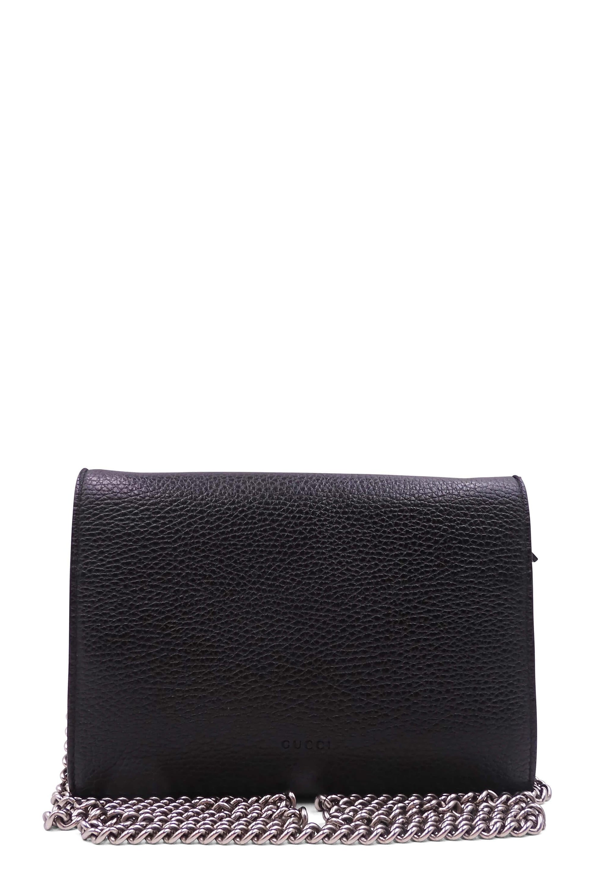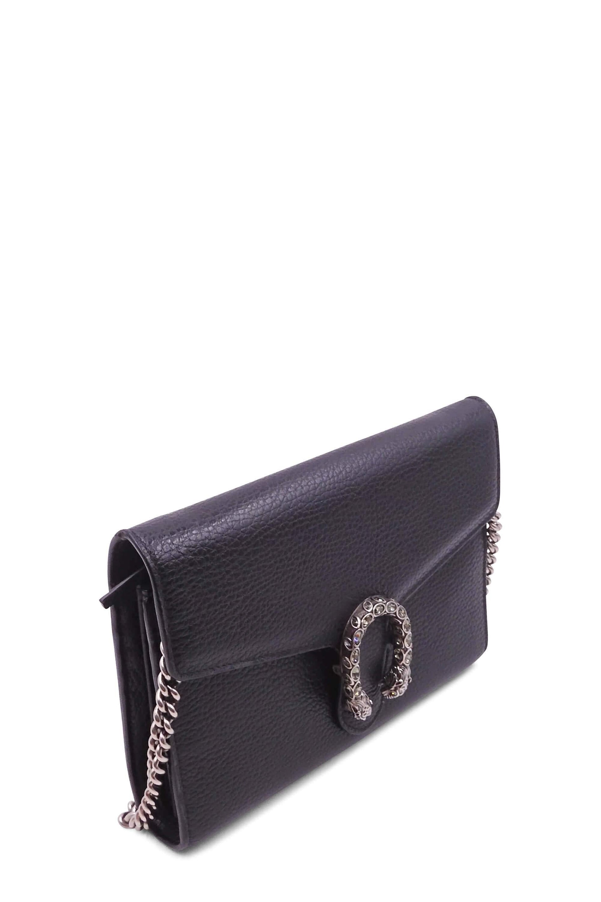 This Gucci Mini Dionysus Wallet On Chain is crafted of calfskin leather in black. The classic bag features a signature tiger head spur, detachable chain-link shoulder strap and silver-tone hardware. The press-stud fastening opens to a fabric lining with card slots and three internal compartments.