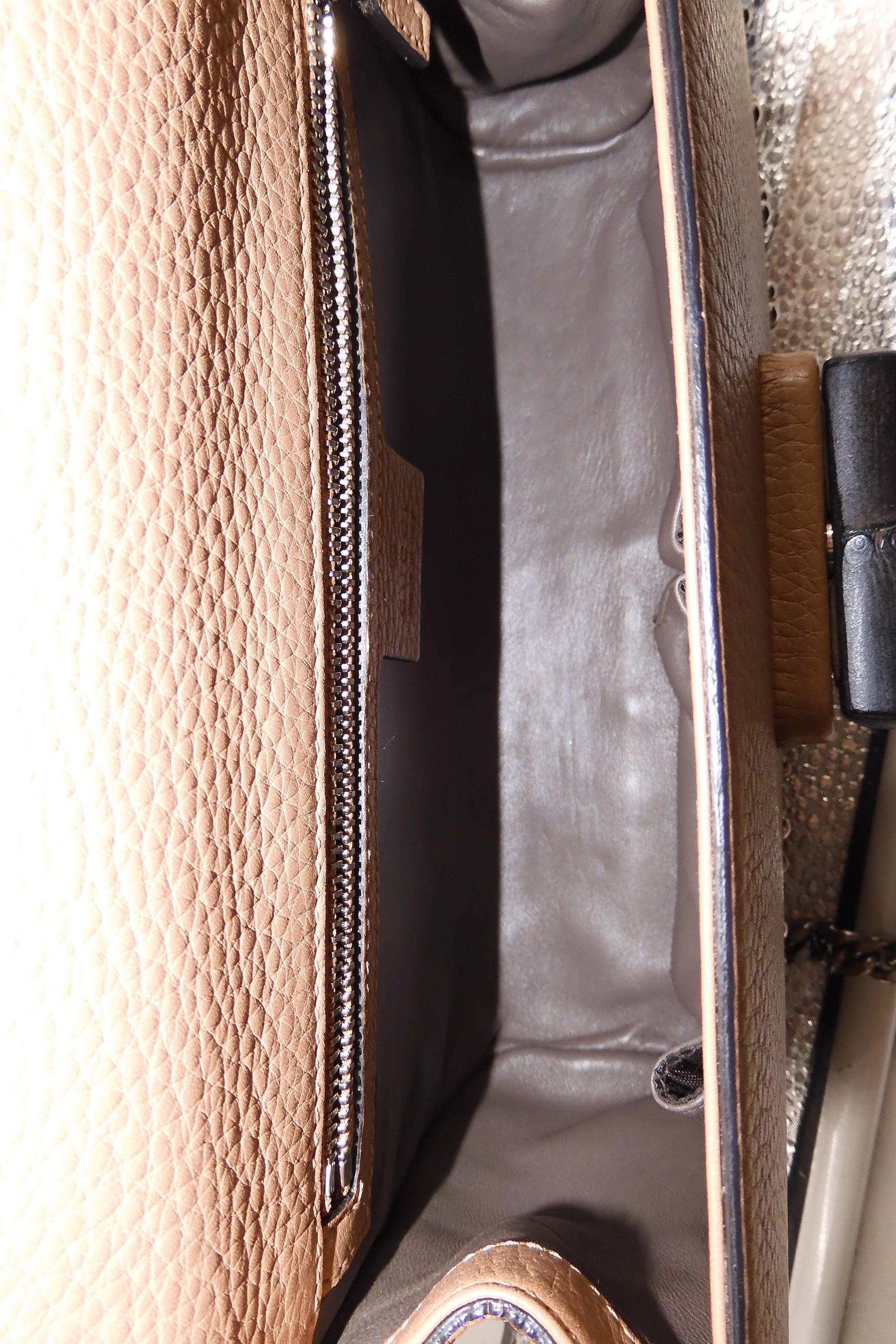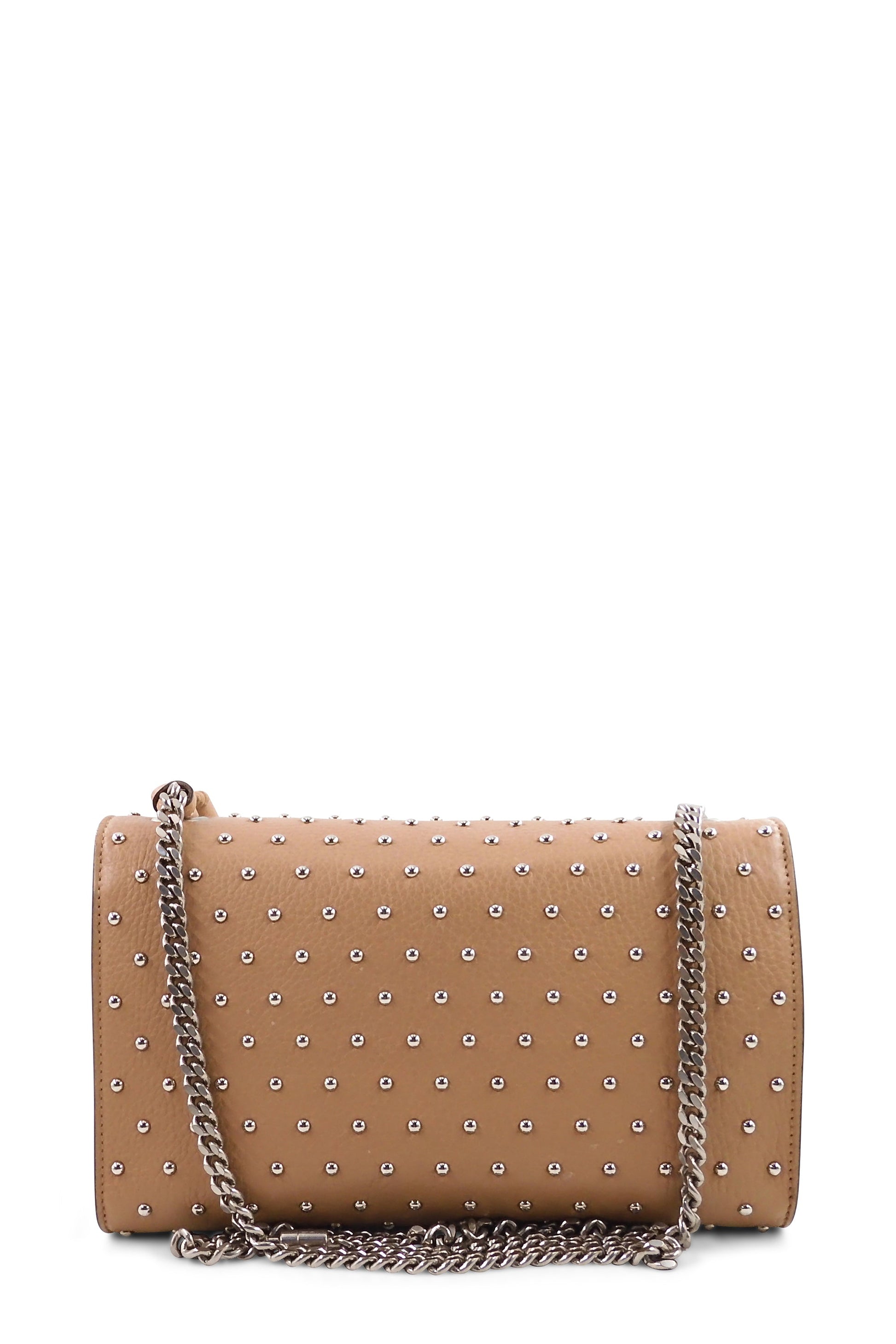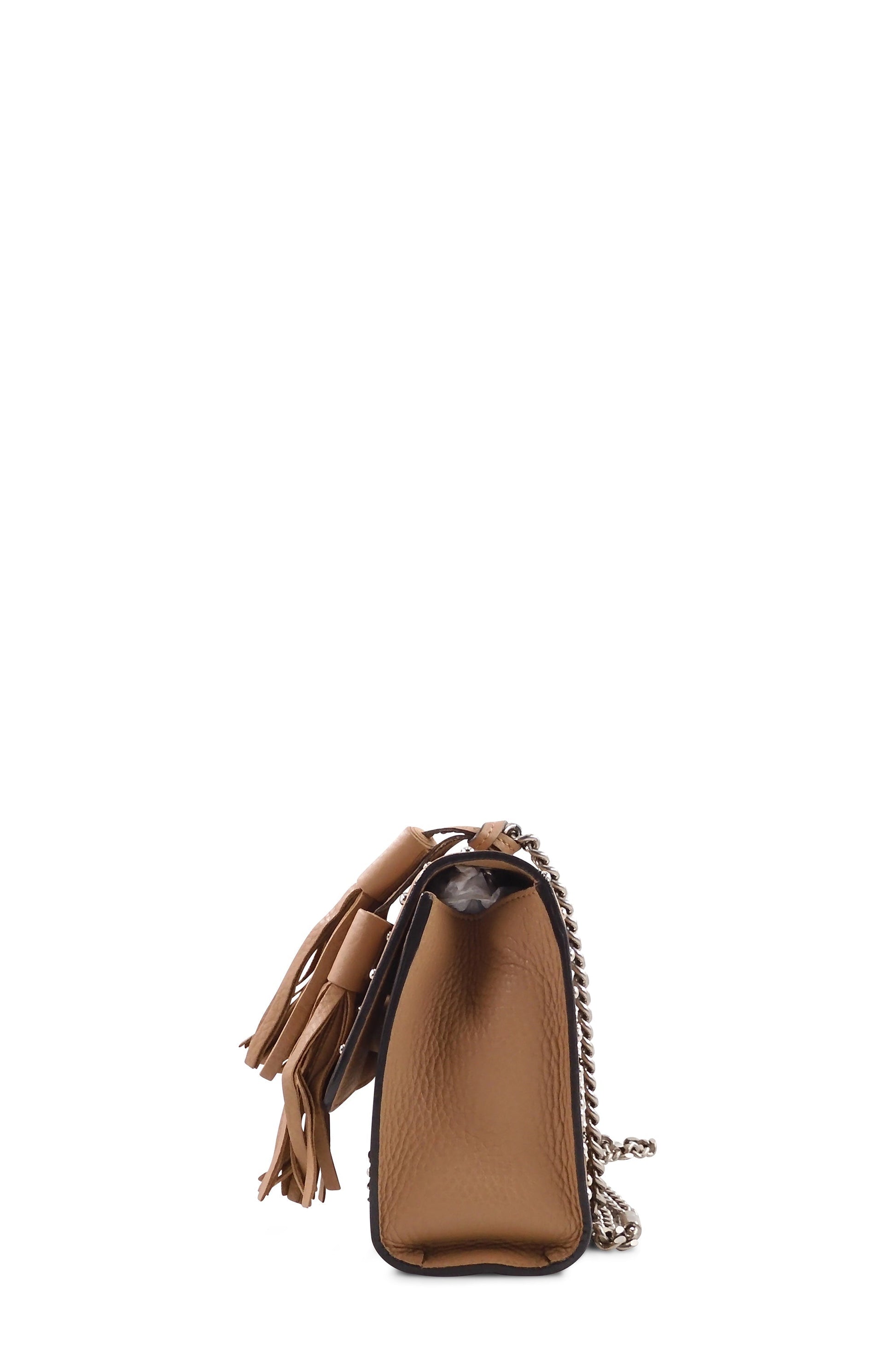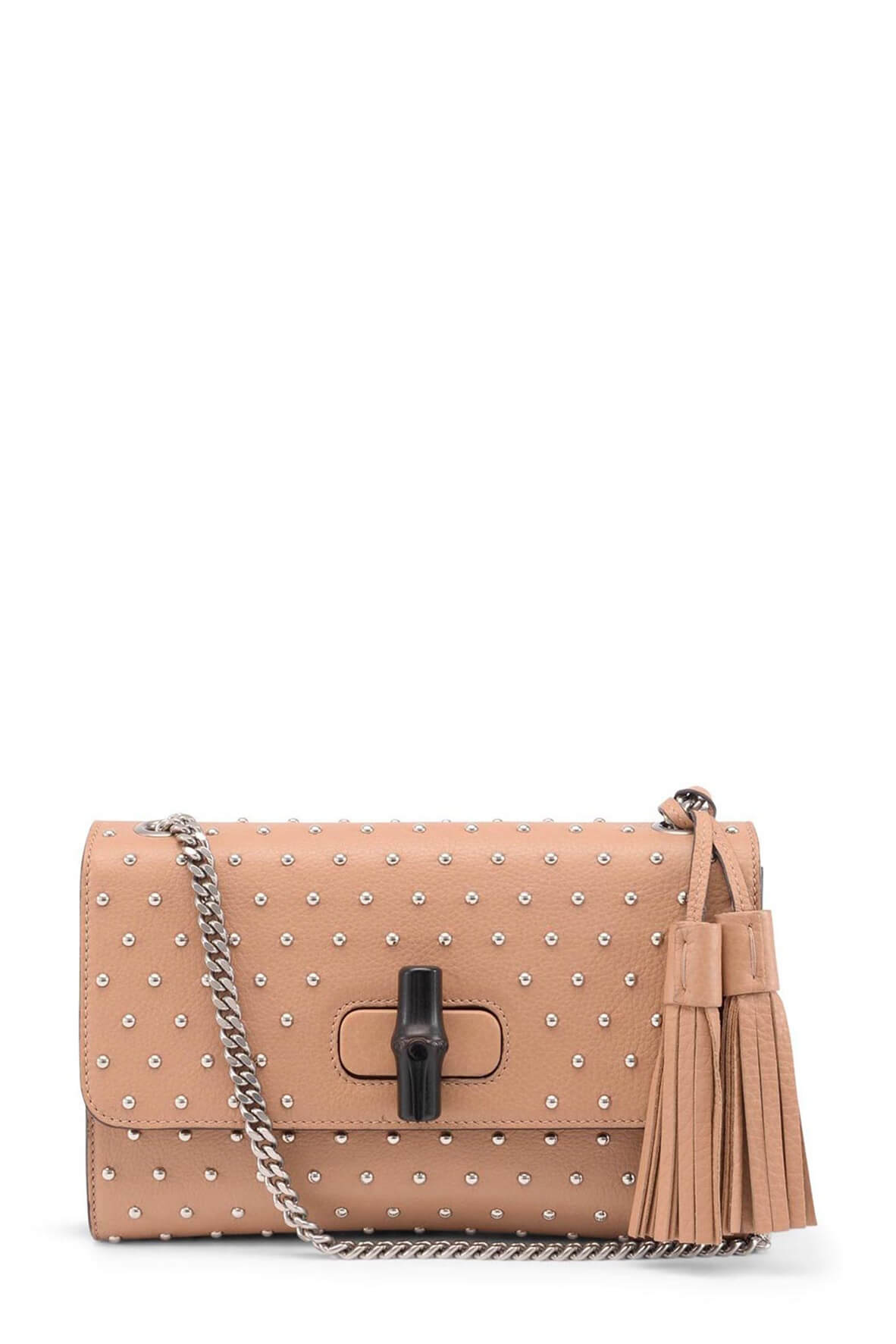 The Miss Bamboo shoulder bag is crafted from beautiful rose beige leather, this bag features silver-toned studs throughout, a long silver-toned chain link shoulder strap, and two fabulous rose beige leather tassels that hang over the front flap. The front flap is opened with the signature Gucci lacquered bamboo turn lock and lifts to reveal a sleek black interior with an inner zip pocket.