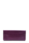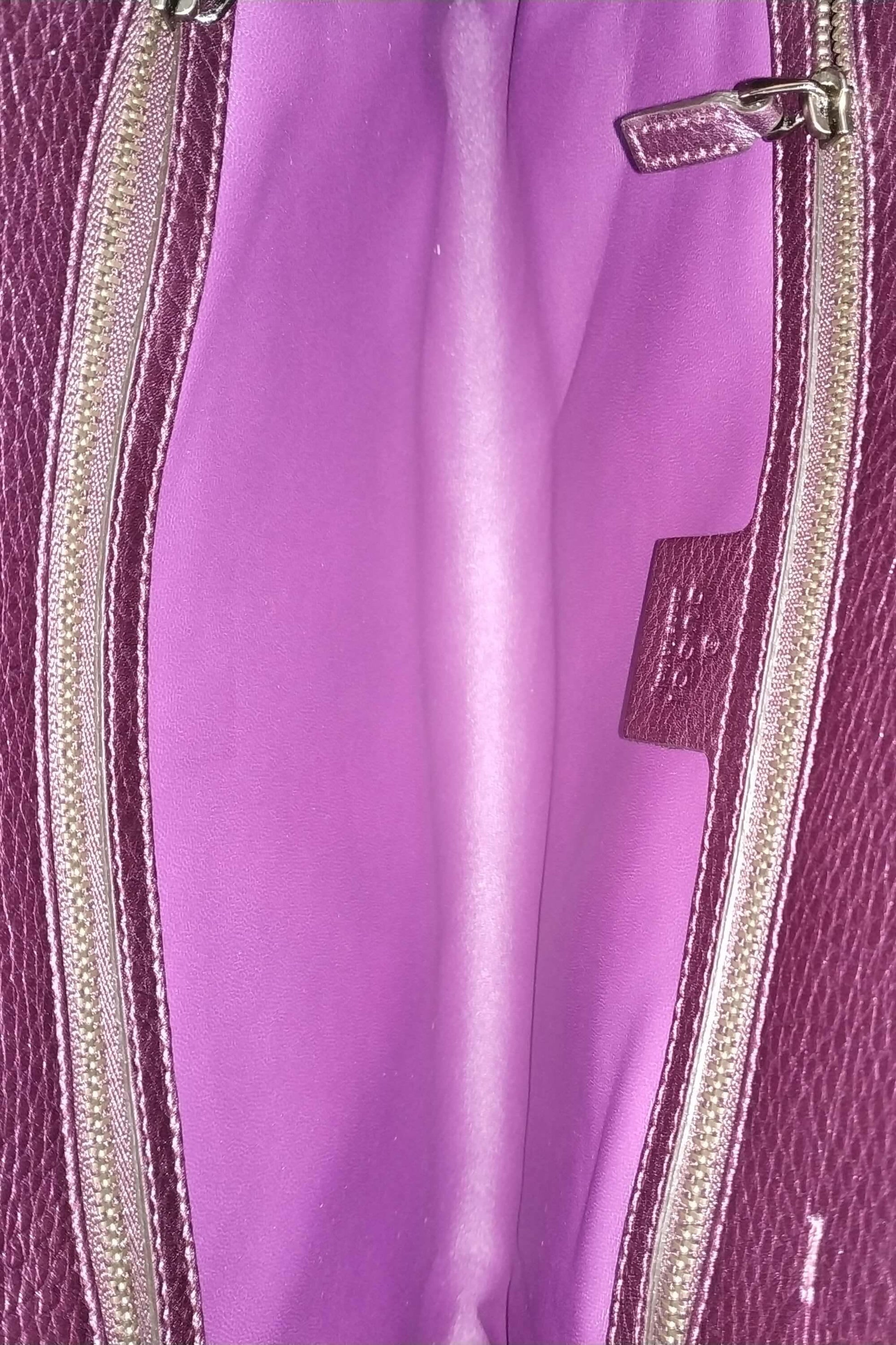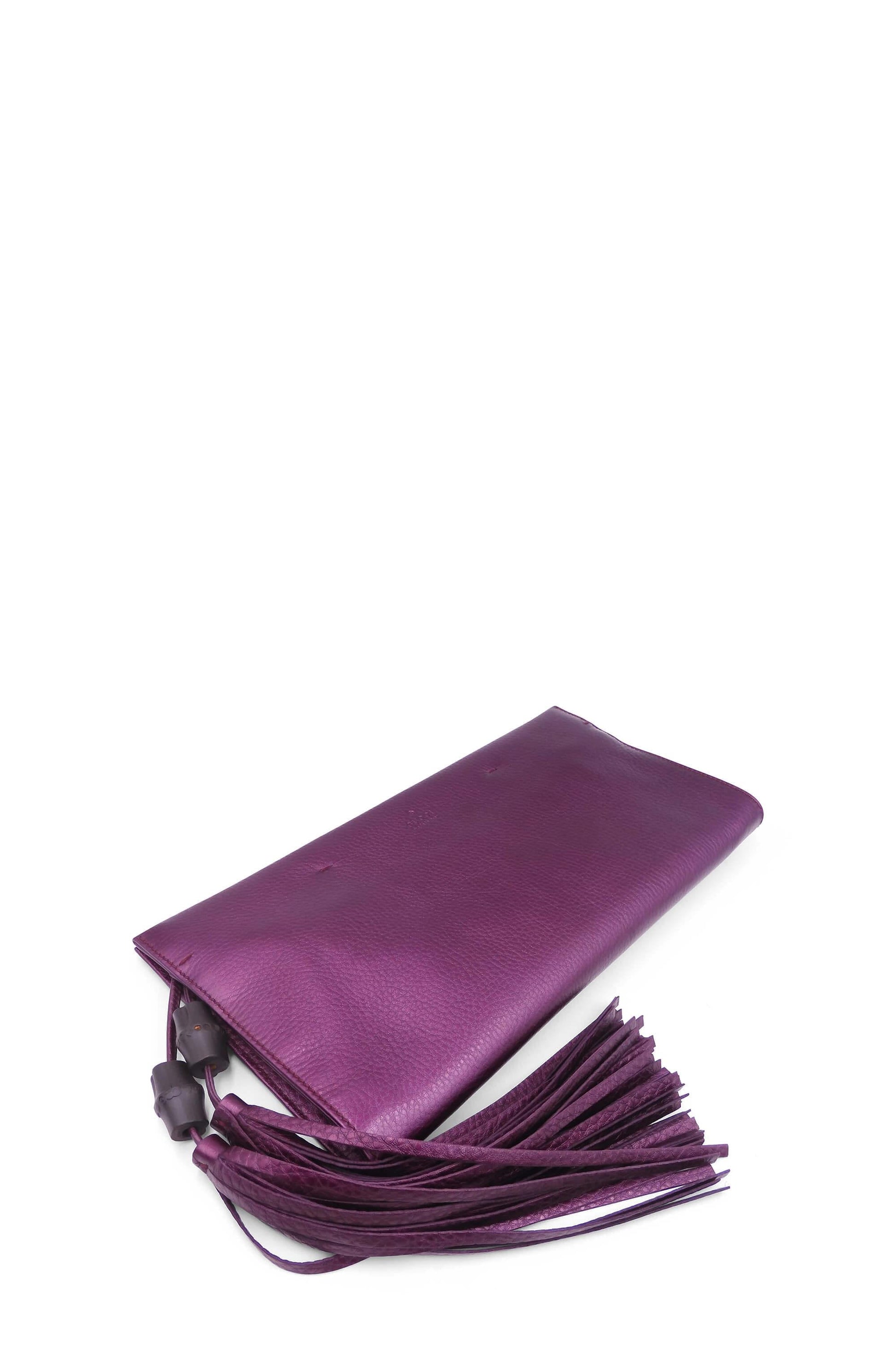 This Gucci Clutch features a purple grained leather body with bamboo tassels, interior zipper pockets, and an open top with magnetic closure.