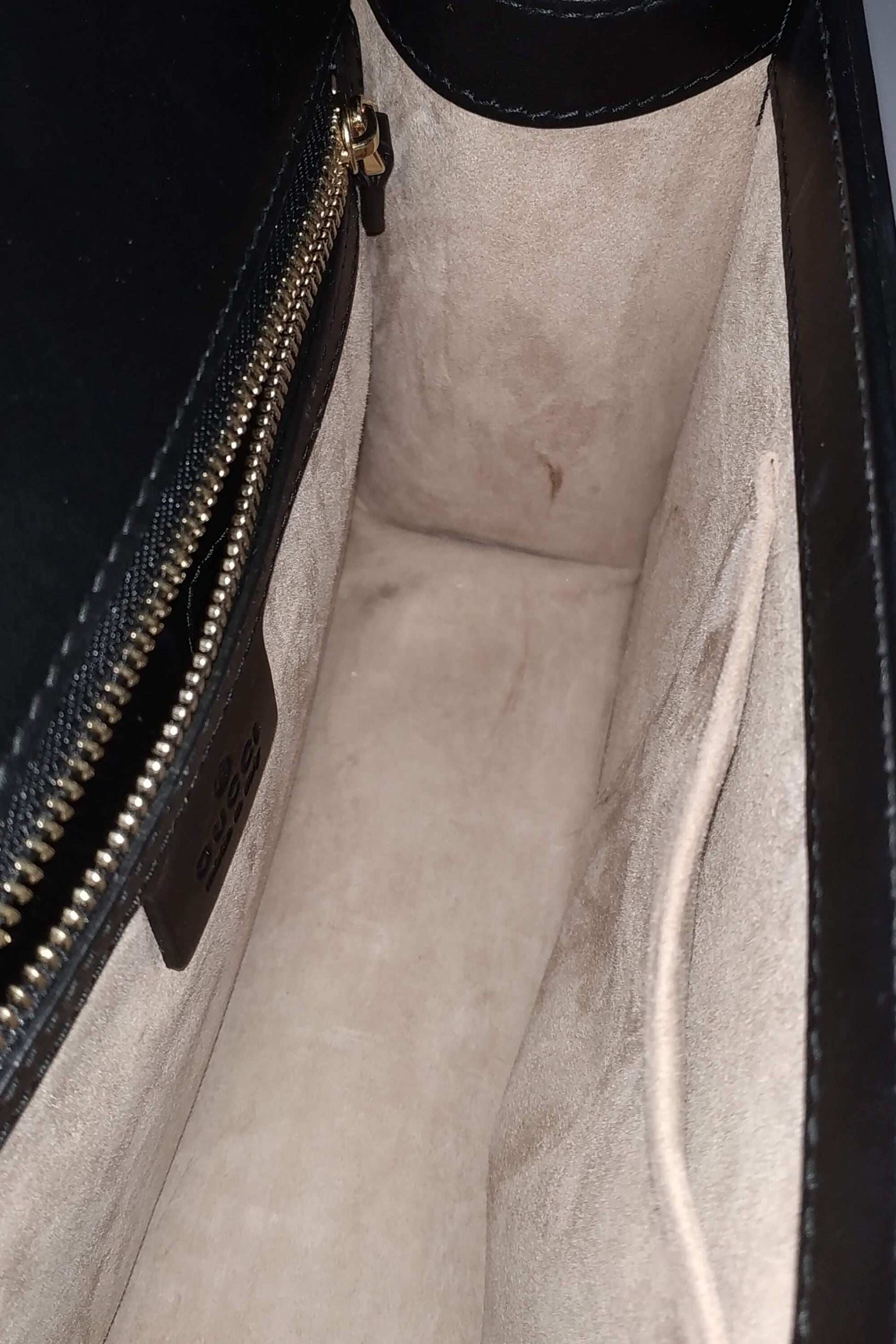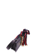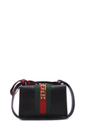 This marvelous structured shoulder bag is crafted of smooth black calfskin leather and features a prominent front flap detailed with a central nylon red and green web stripe embellished with a chain buckle lock closure. This stylish bag has two interchangeable and detachable shoulder straps; one being a classic black leather strap and the other, a red and blue webbed stripe ribbon. The top flap opens to a camel microfiber lining interior with a zipper and patch pocket. This shoulder bag is an ideal statement bag, with the sophisticated style only from Gucci!