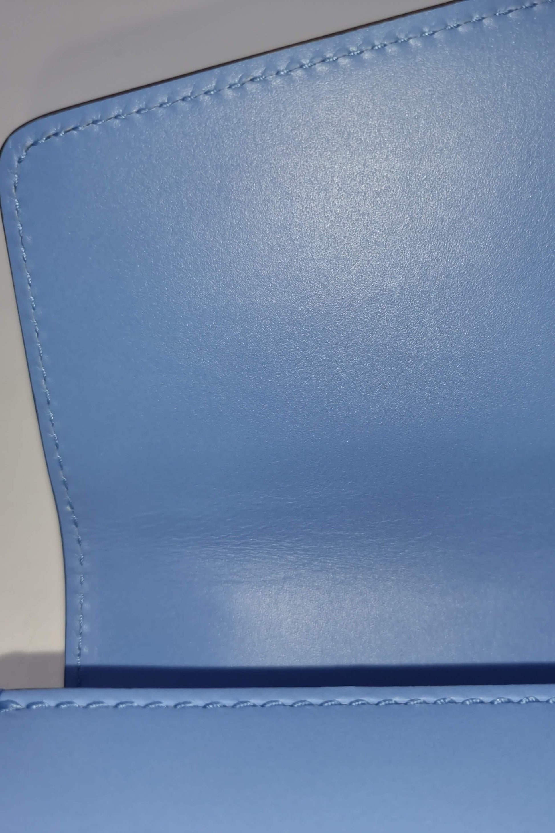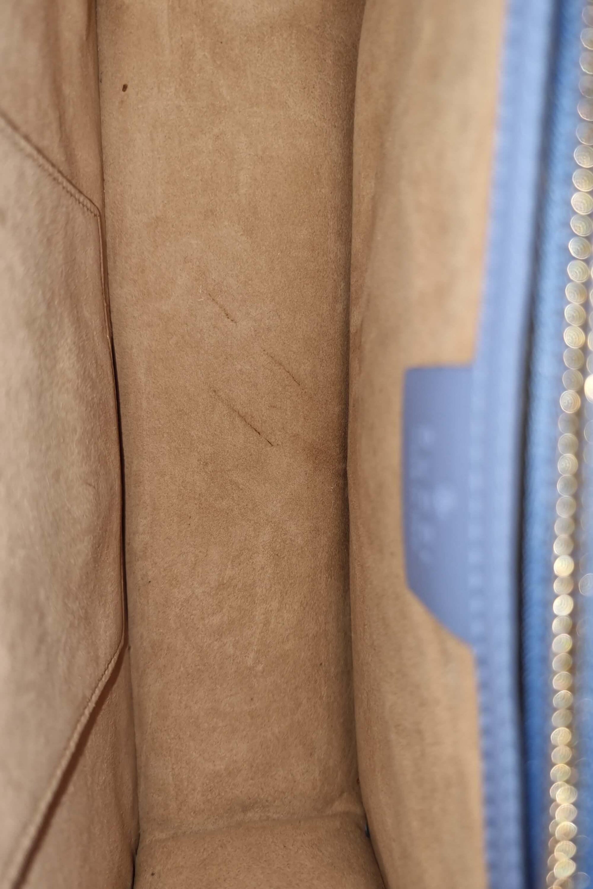 Slight scratches on the front exterior. Minor dents on front and flap area. Slight glue stain on bottom. Creases on leather. Scratches on hardware. Stains on interior.