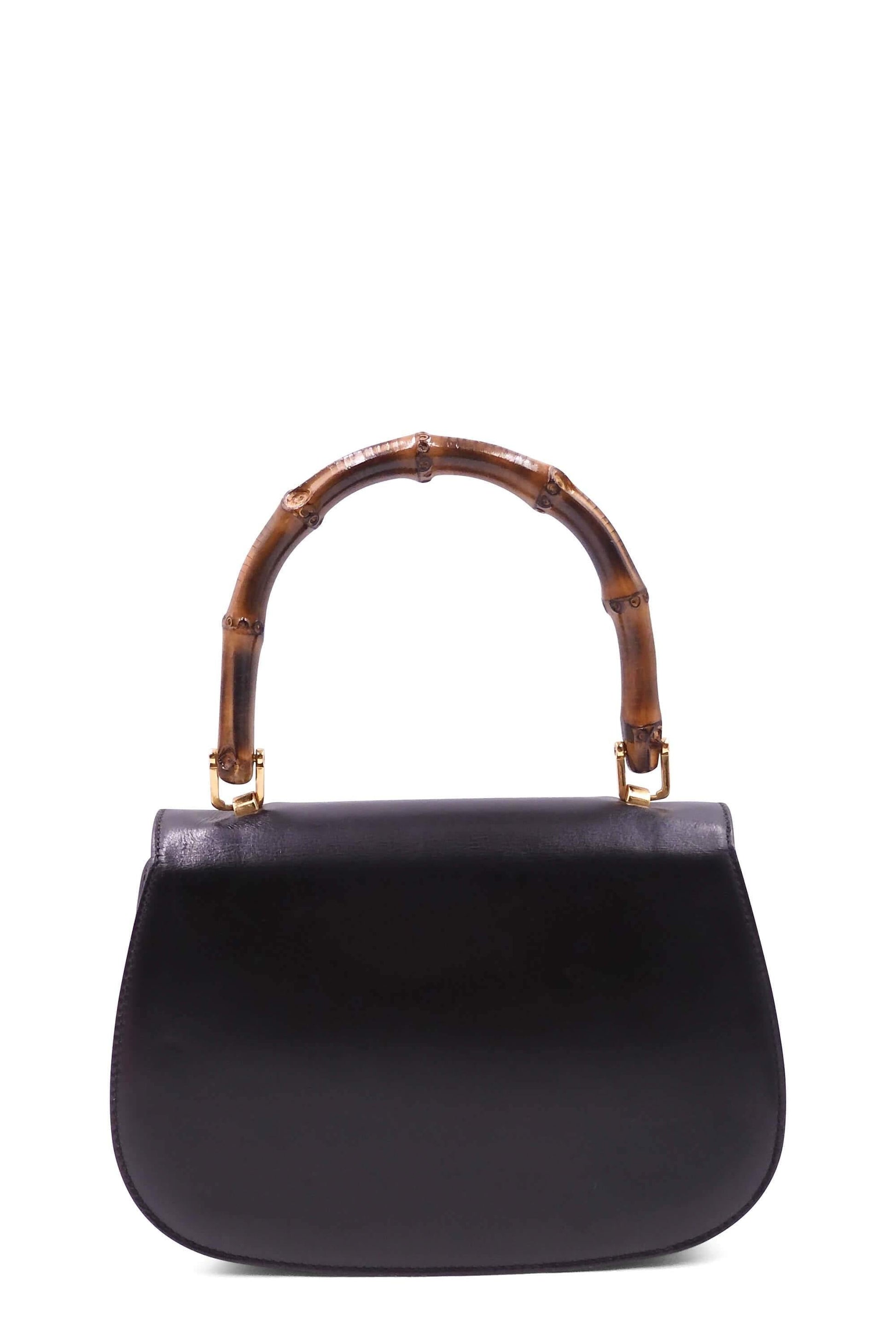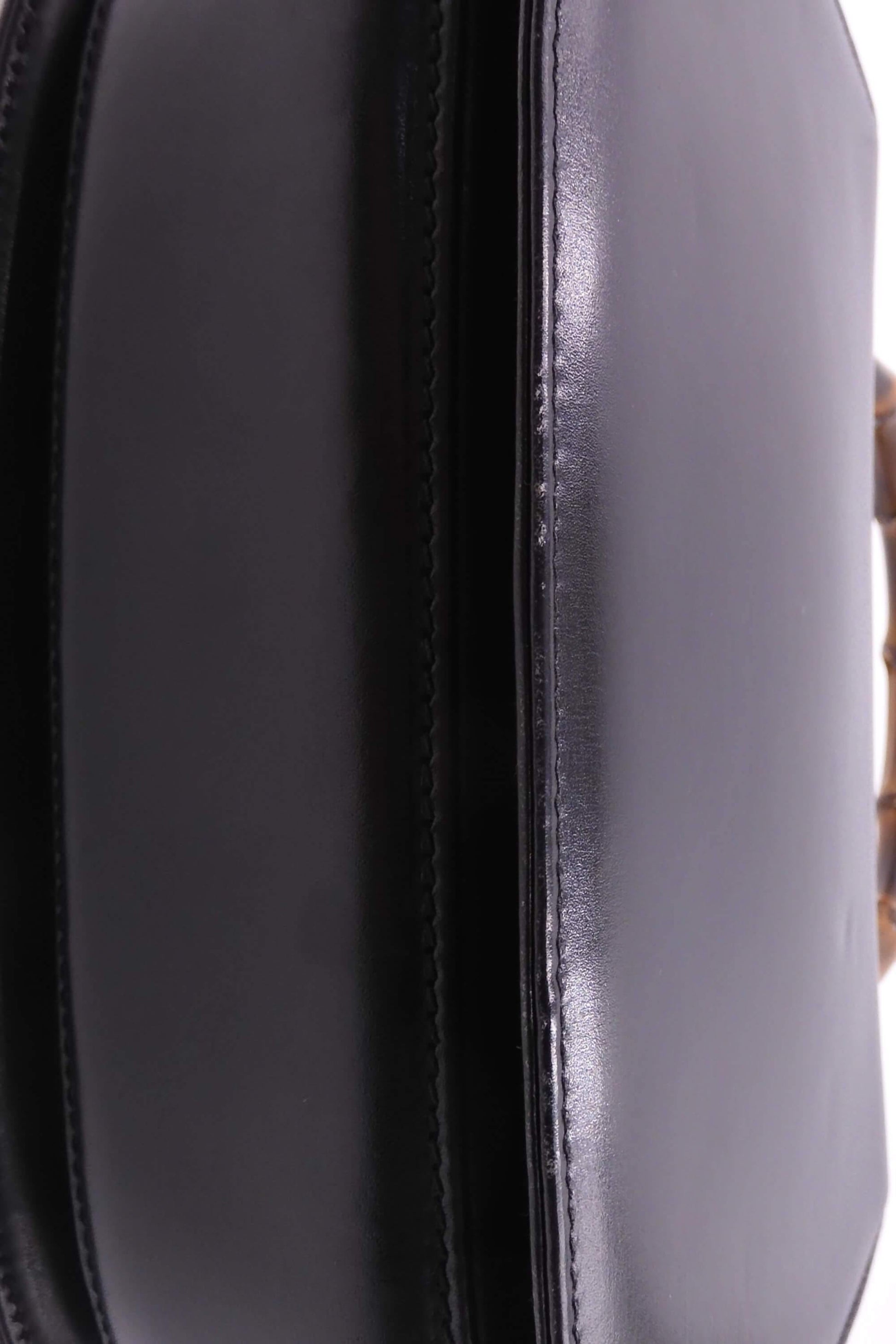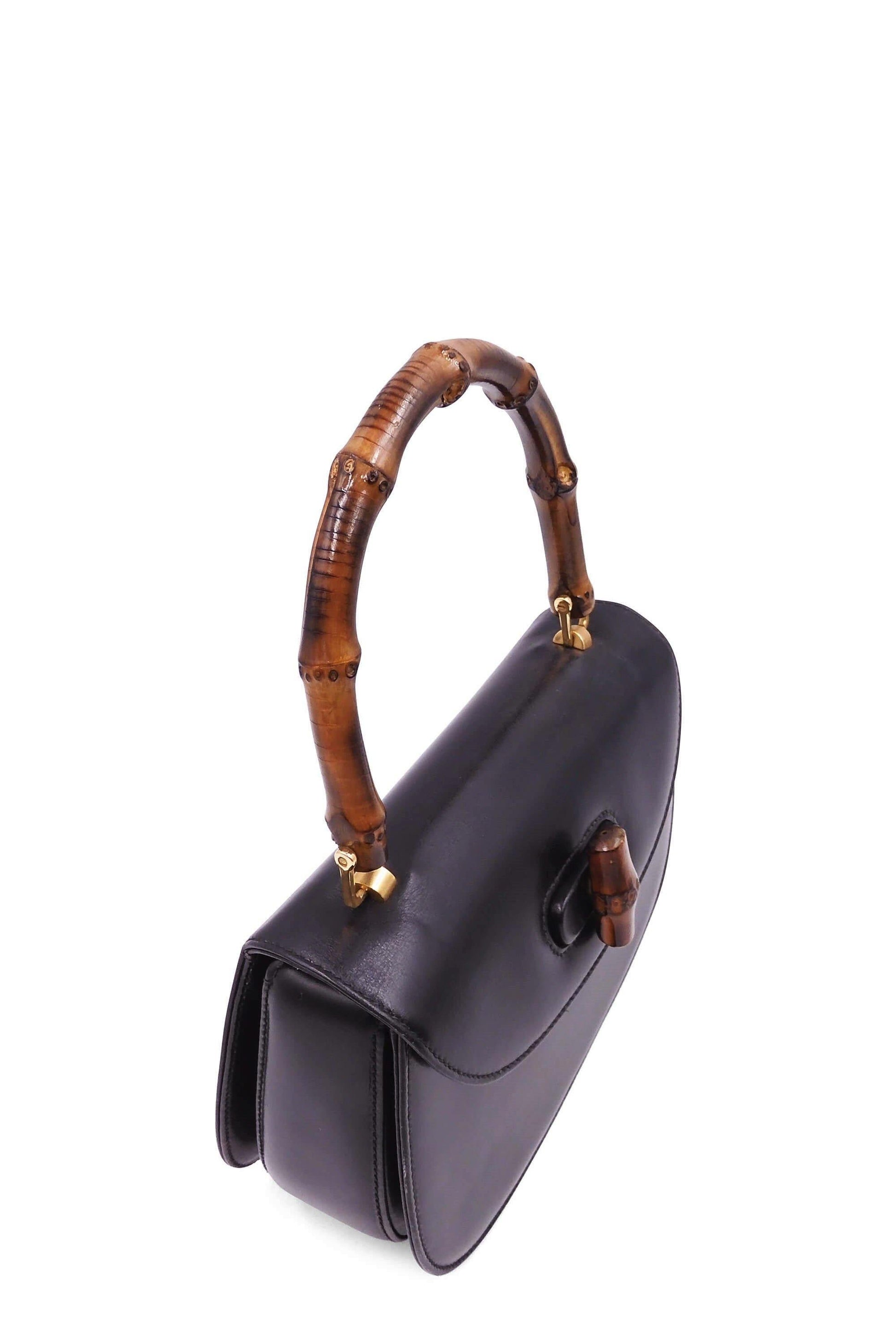 Iconic vintage 'Gucci Bamboo' handbag from the 1960s. Smooth black leather, with brown bamboo handle and twist turn lock closure. Gold tone hardware. Lined in red leather, with a zip up pocket that features the Gucci crest. This classic handbag is large enough to hold more than just the essentials. While everyone is jumping on the Gucci Bamboo trend, be the only one in the room with an original.