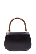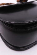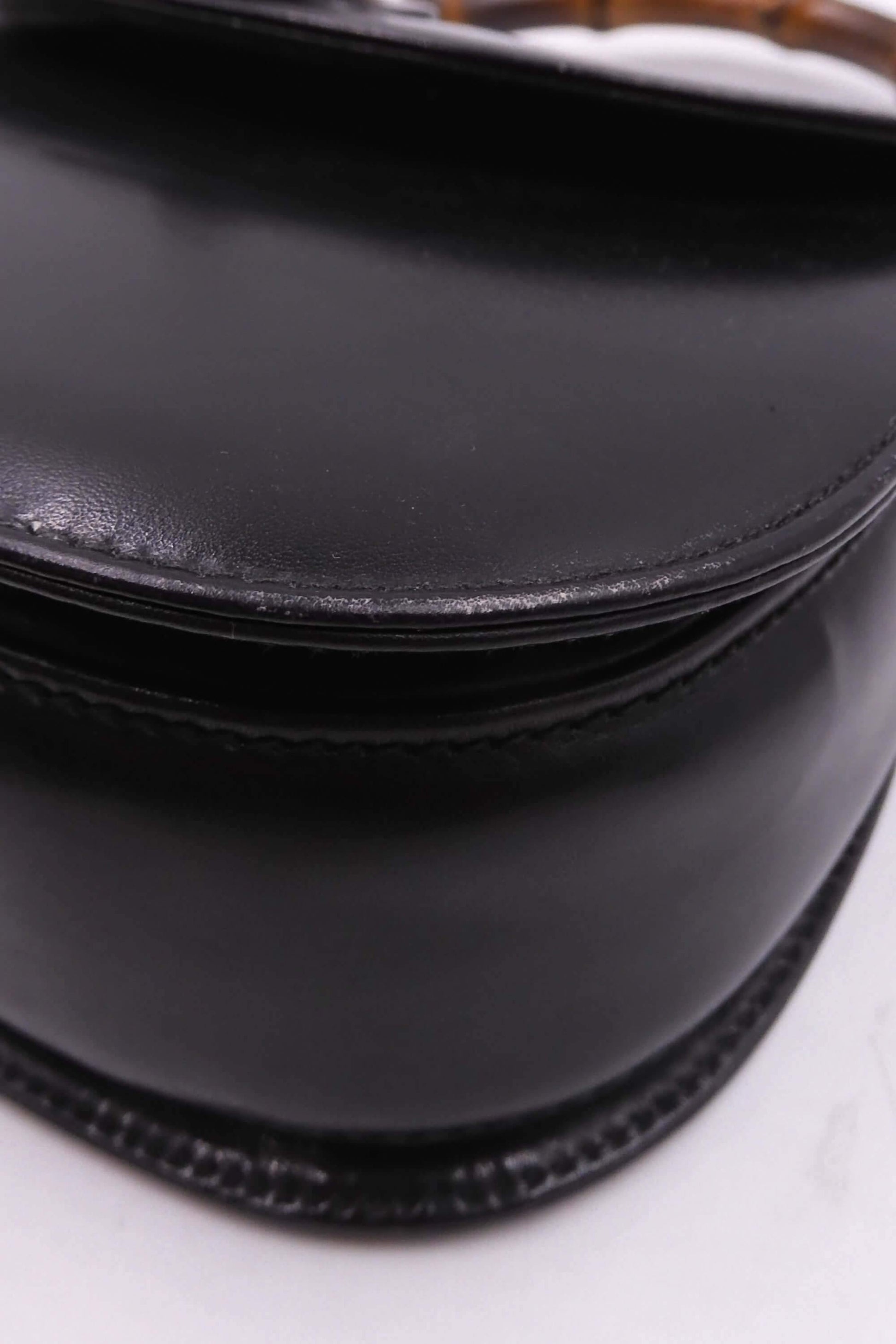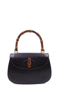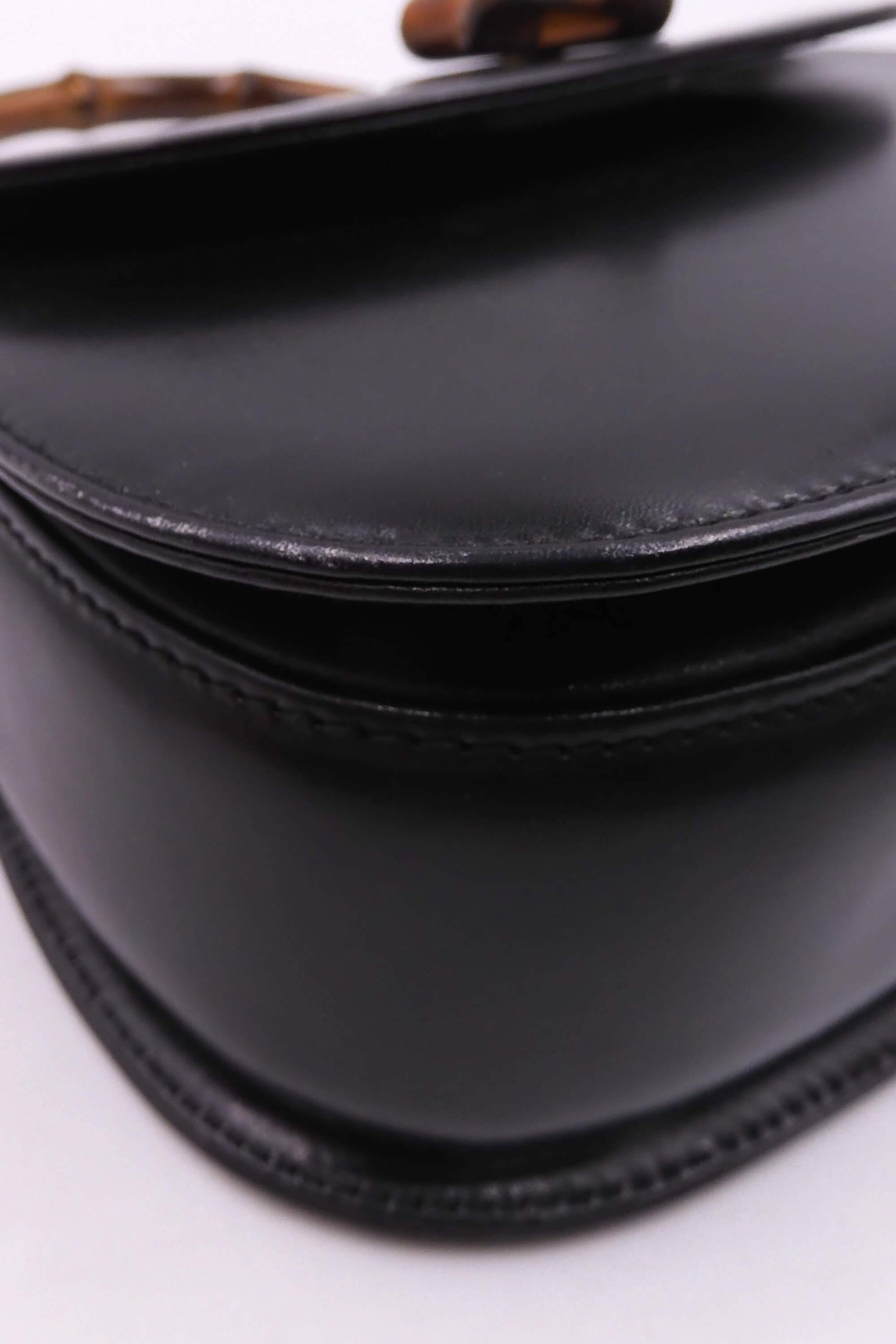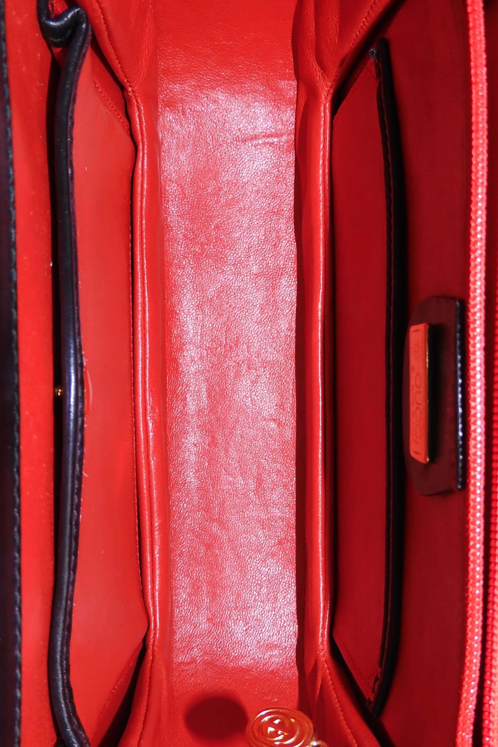 Iconic vintage 'Gucci Bamboo' handbag from the 1960s. Smooth black leather, with brown bamboo handle and twist turn lock closure. Gold tone hardware. Lined in red leather, with a zip up pocket that features the Gucci crest. This classic handbag is large enough to hold more than just the essentials. While everyone is jumping on the Gucci Bamboo trend, be the only one in the room with an original.