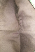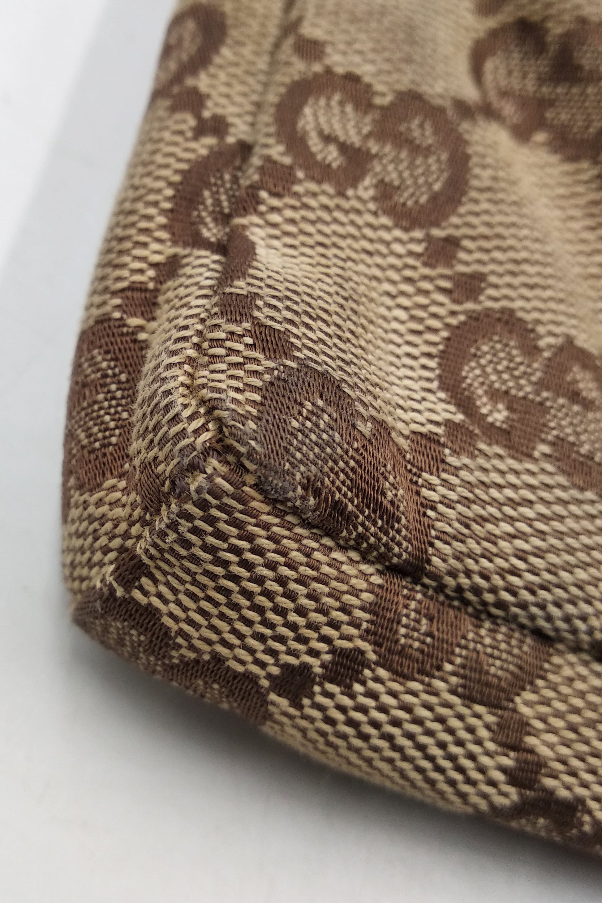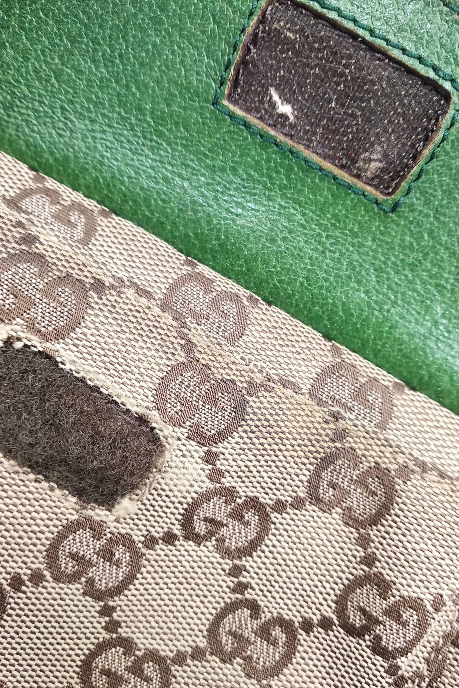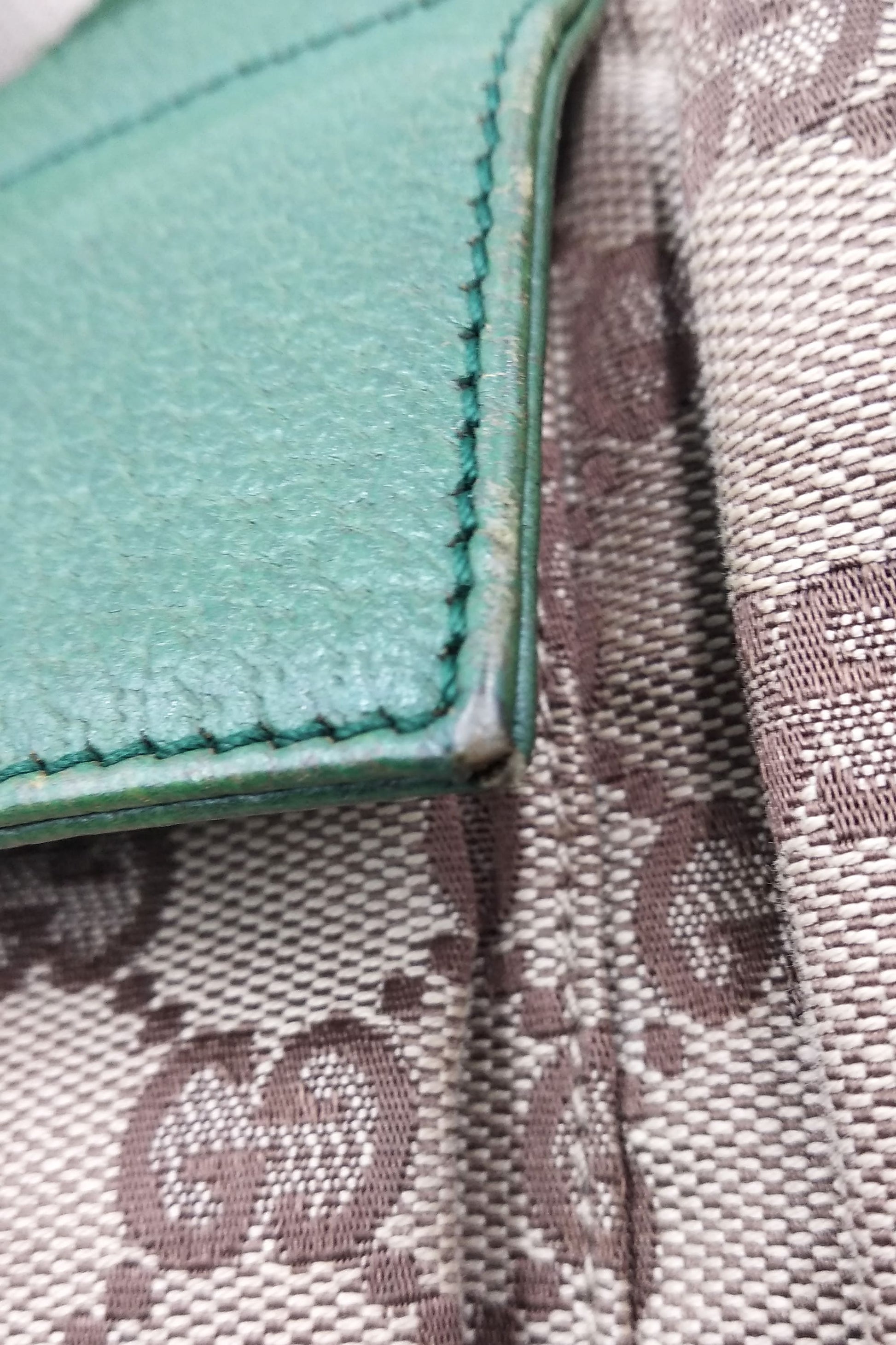 Exterior bag and strap overall have discoloration. Exterior piping on pockets have scuffing, cracking and peeling. Exterior hardware metal overall have scratches. Interior storage have stains and pen mark.