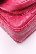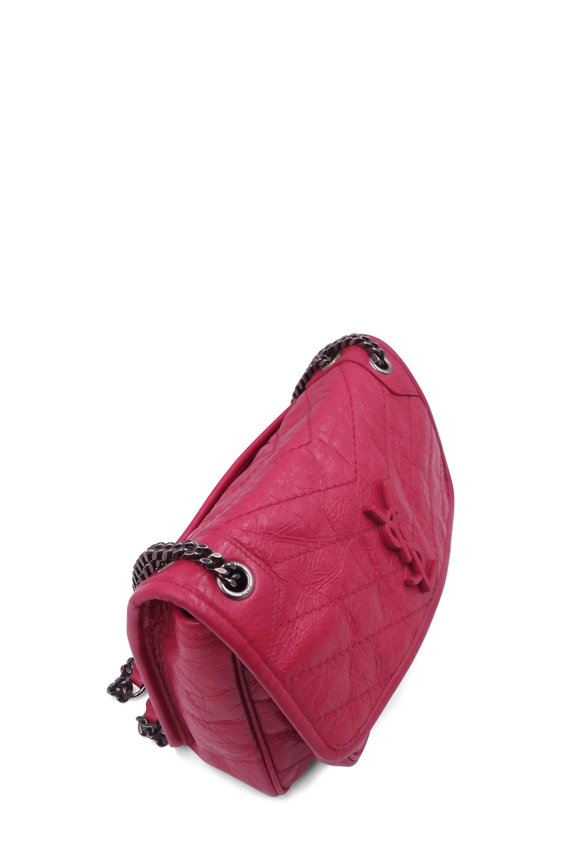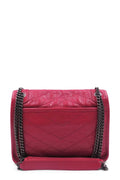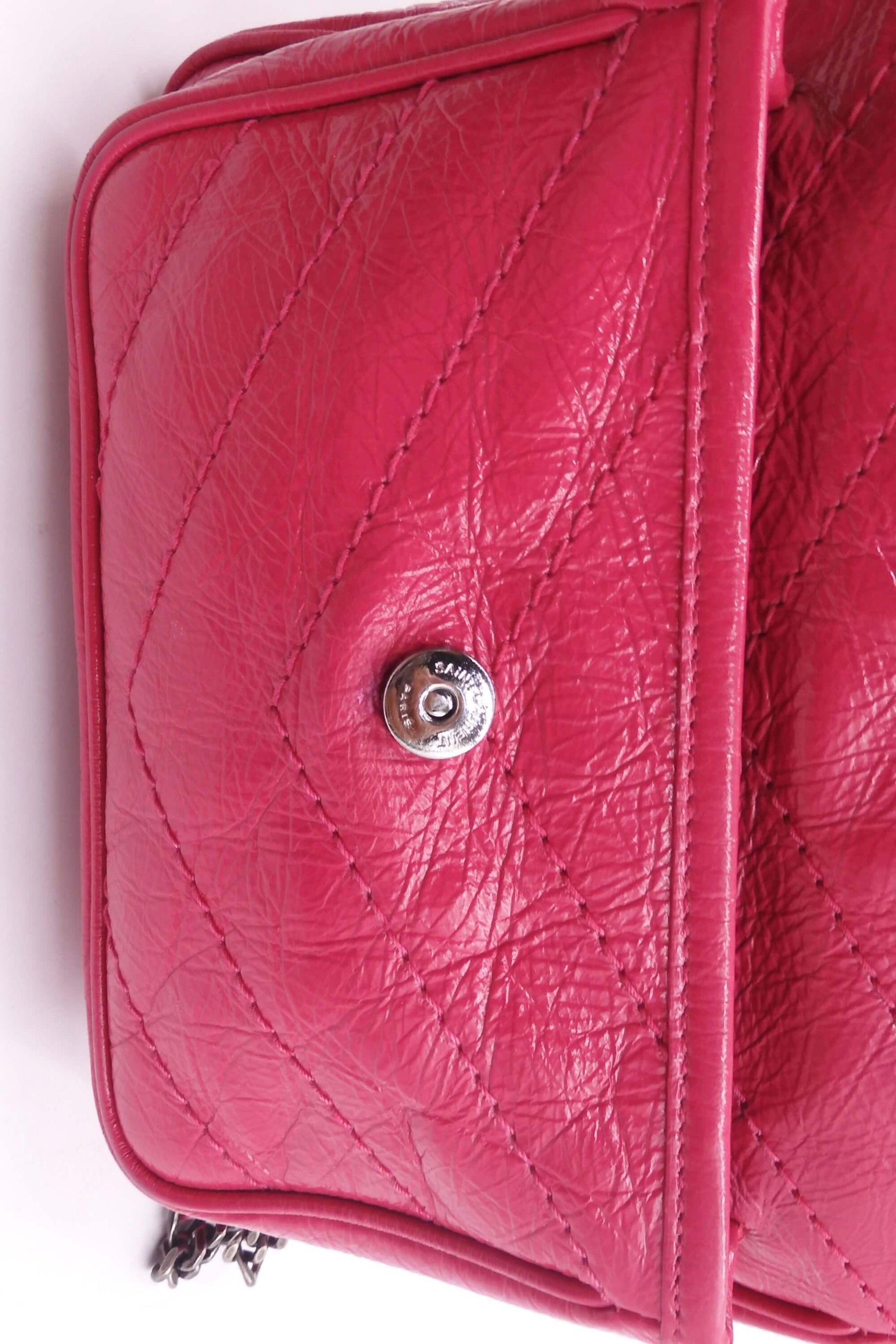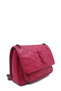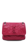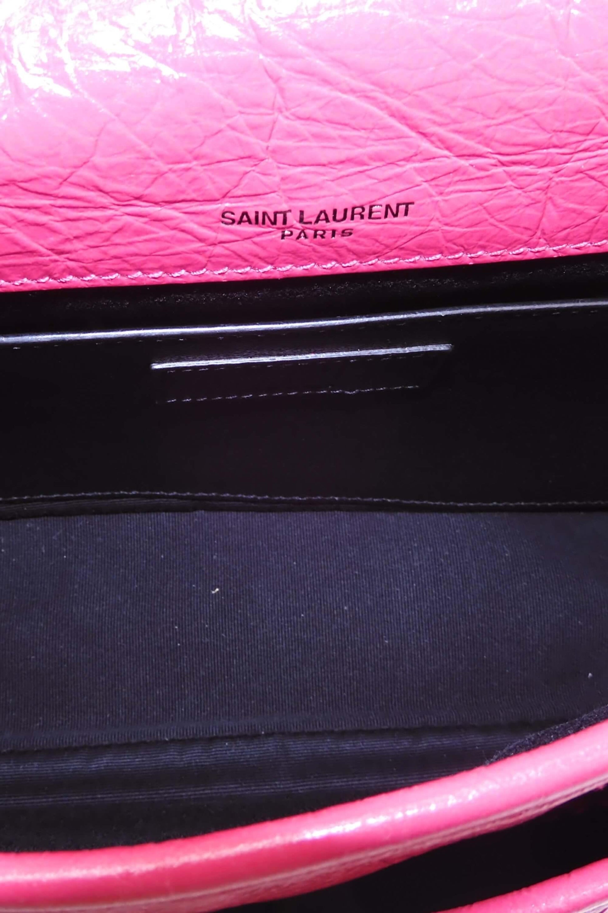 Saint laurent monogram bag with front flap, leather-encased ysl monogram, chain and leather convertible shoulder strap, central compartment, and open back pocket.